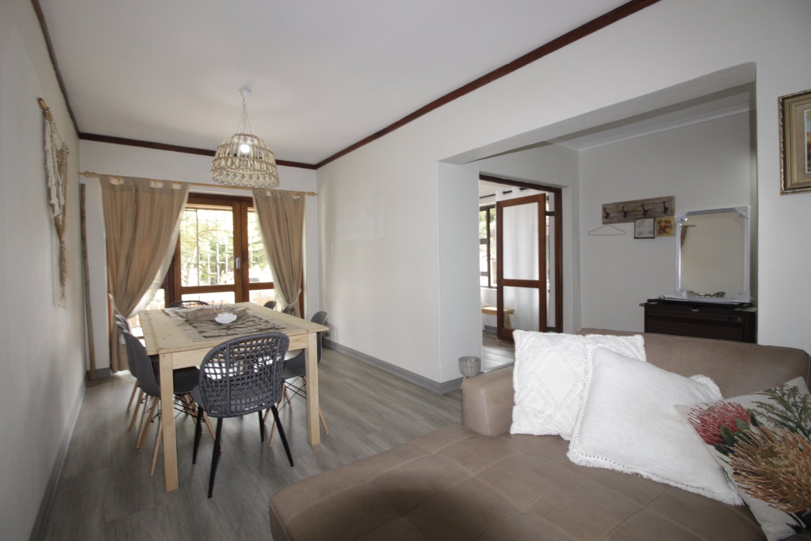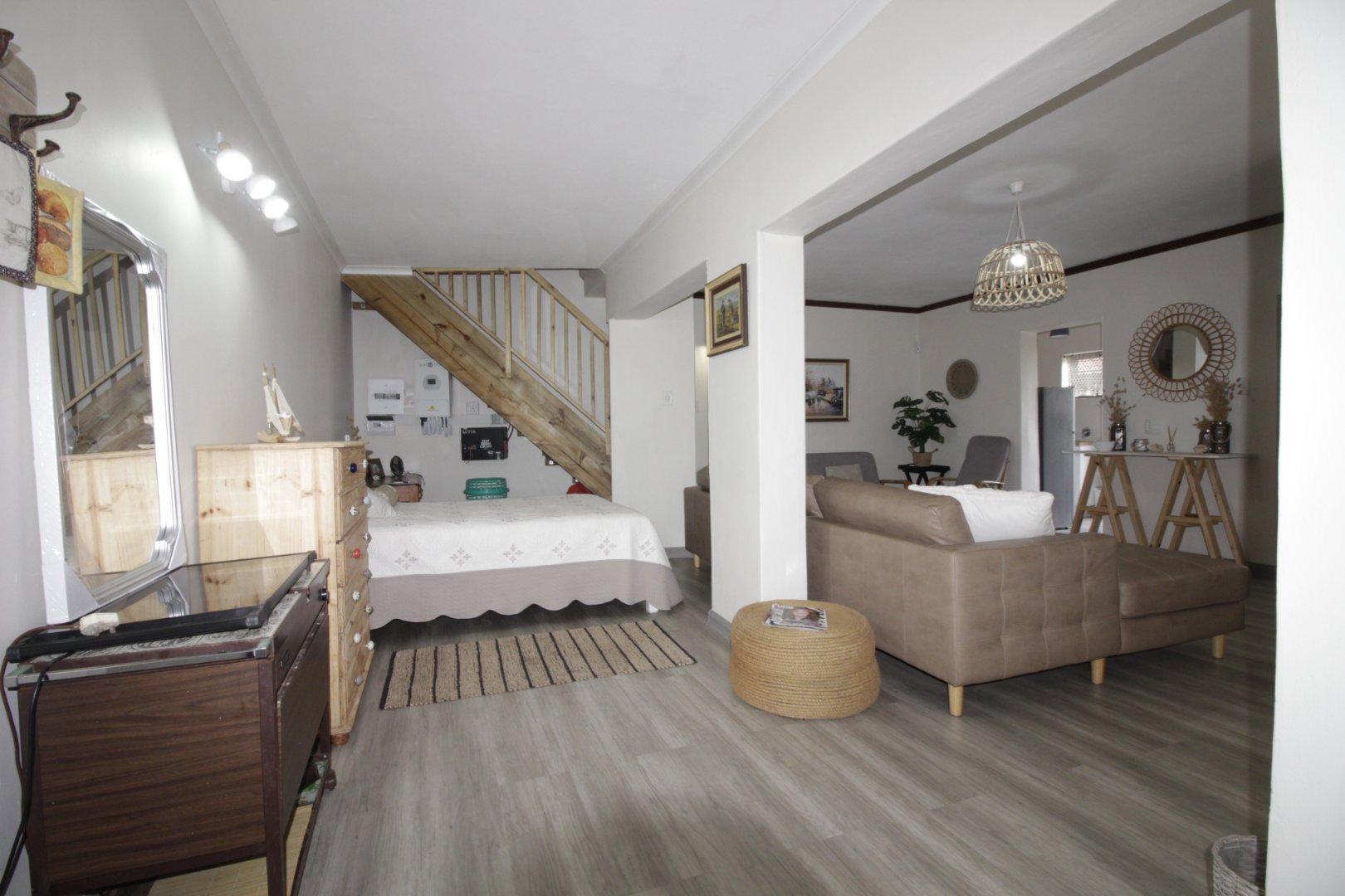 Downstairs features a self-contained flatlet with private entrance, open-plan living, kitchenette, and flexible sleeping space.