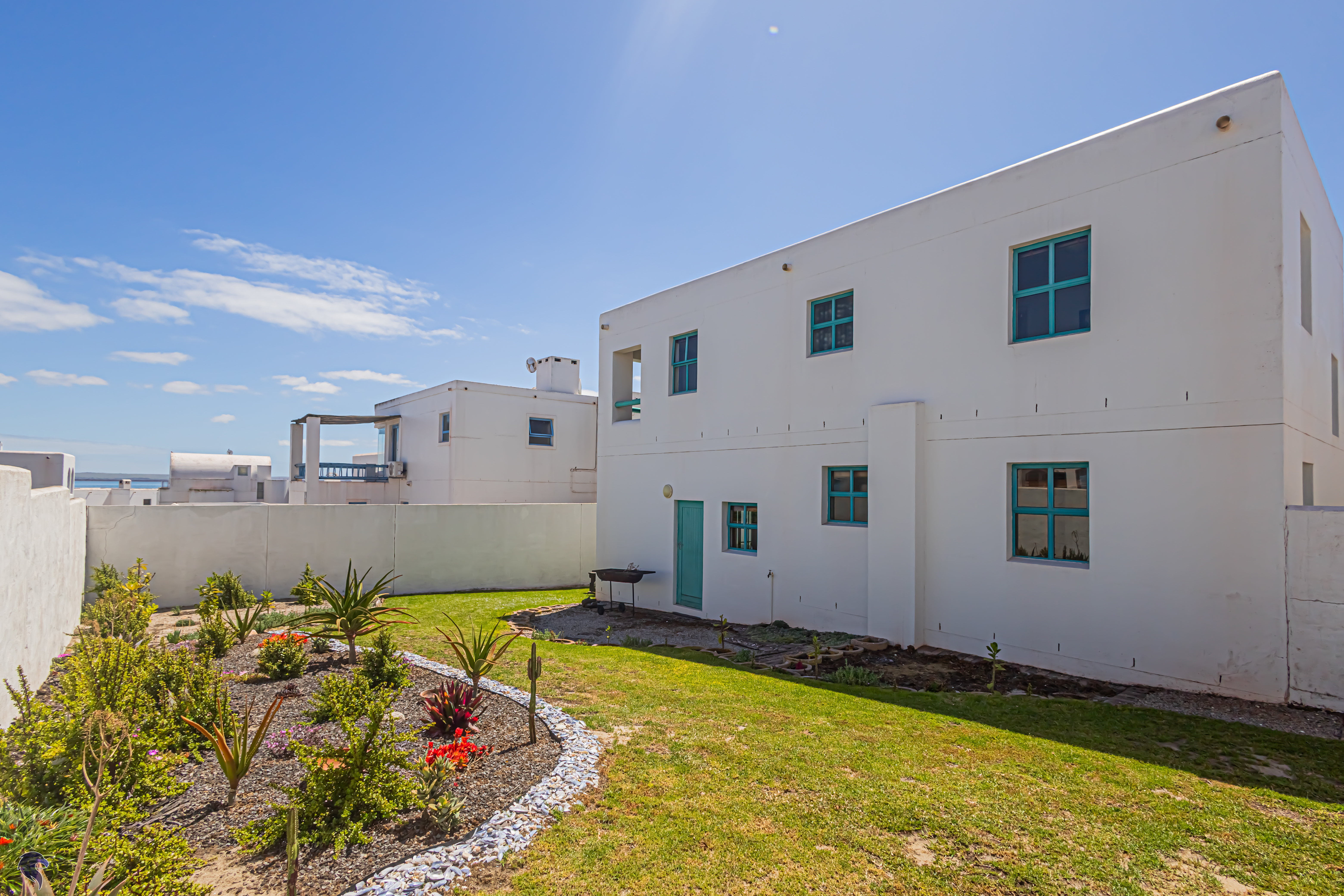 Step inside and you’ll love the natural flow – a bright, open-plan kitchen and living area downstairs (all tiled). There is also an indoor braai. With just a few steps up to a cosy study that could easily double as a fifth bedroom. There is also a bathroom on this level. Upstairs, there are four comfy, carpeted bedrooms and two bathrooms, with the main bedroom offering a sneak peek of those beautiful ocean views.