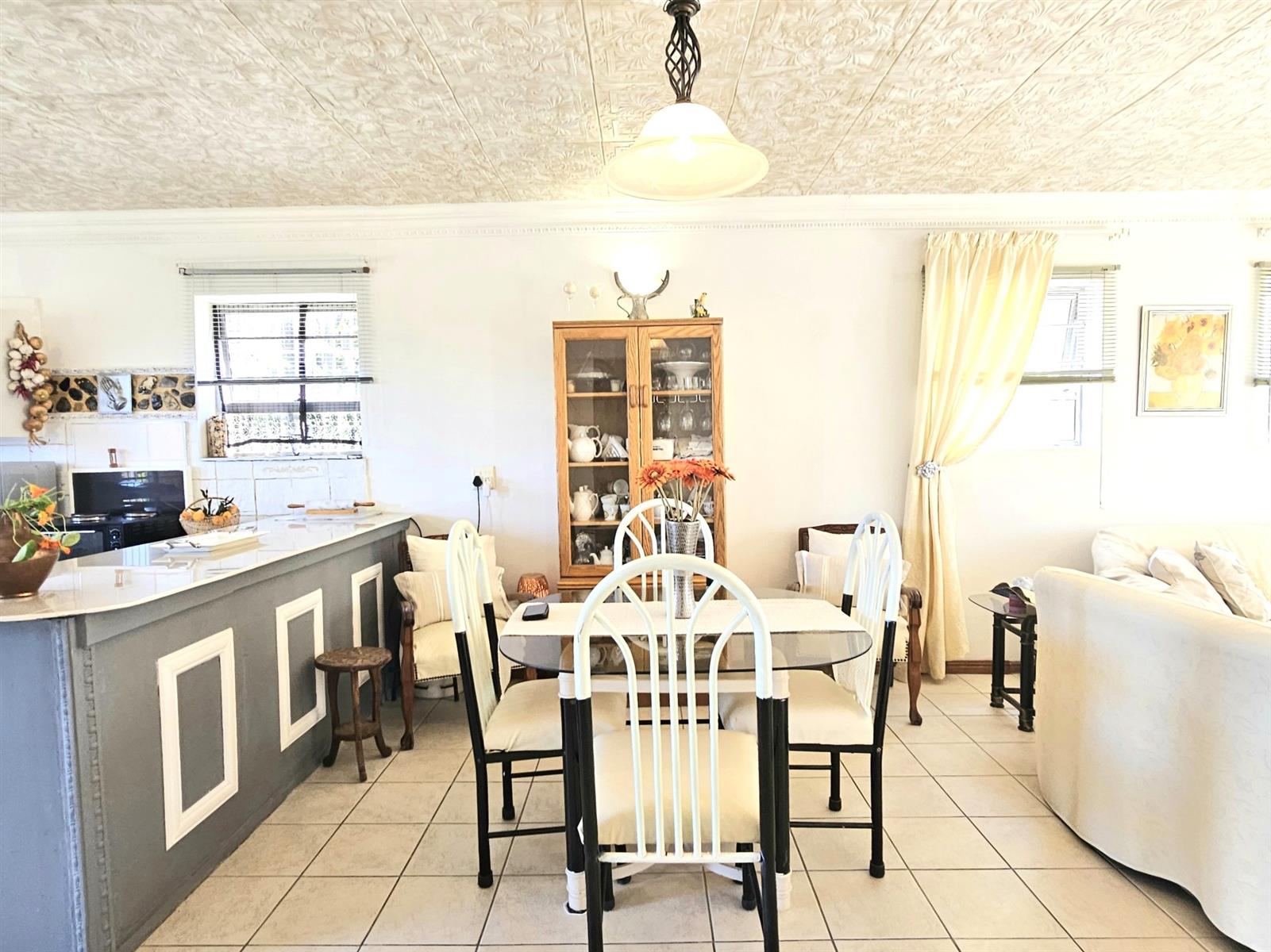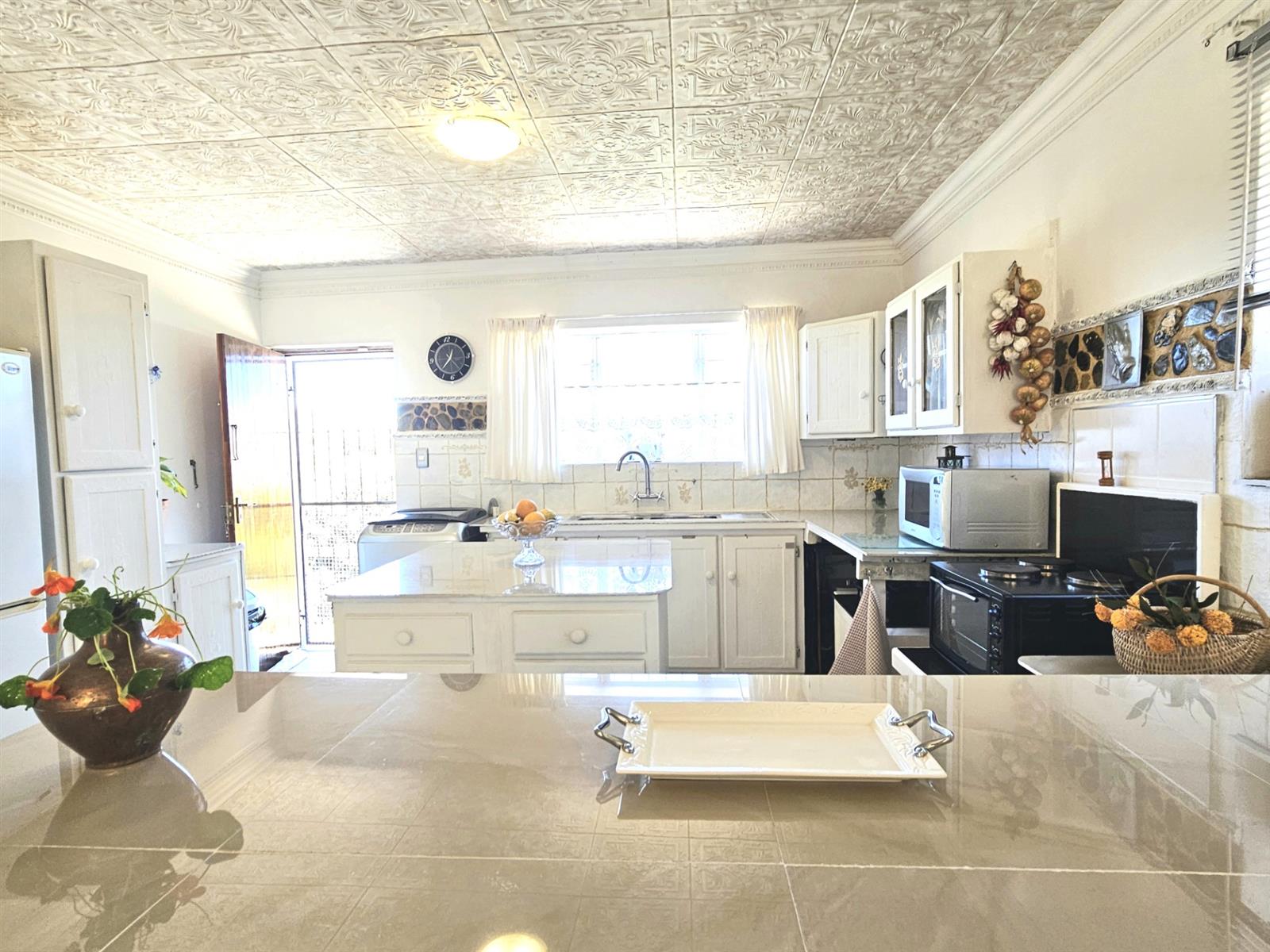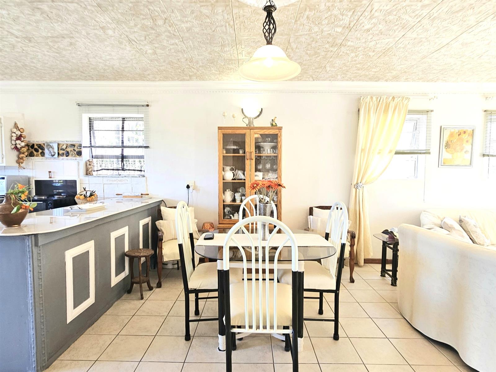 Inside, the spacious lounge, dining area, and kitchen flow seamlessly together, enhanced by large windows that flood the home with natural light. Soft draping, decorative ceilings, and neutral finishes create an inviting and timeless atmosphere. The kitchen provides ample cupboard space, generous countertops, pantry storage, a freestanding stove, and a convenient breakfast counter — perfect for relaxed family living.