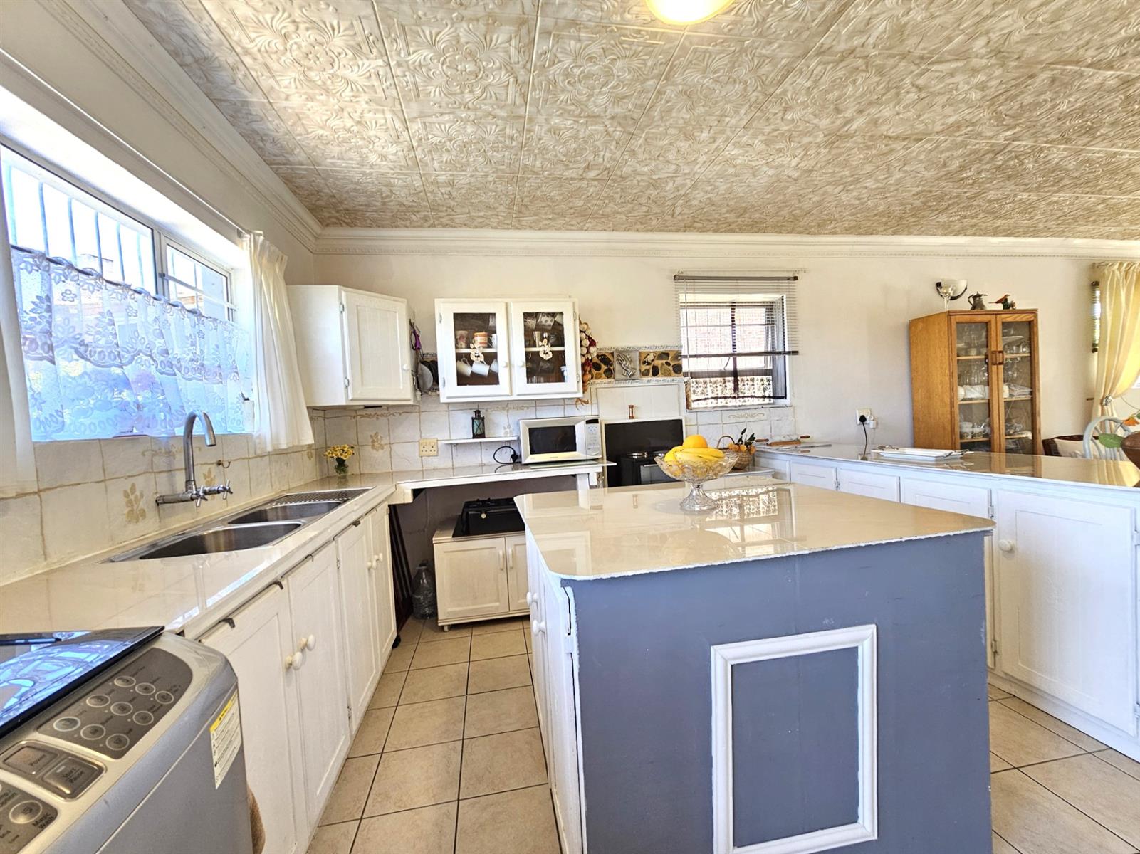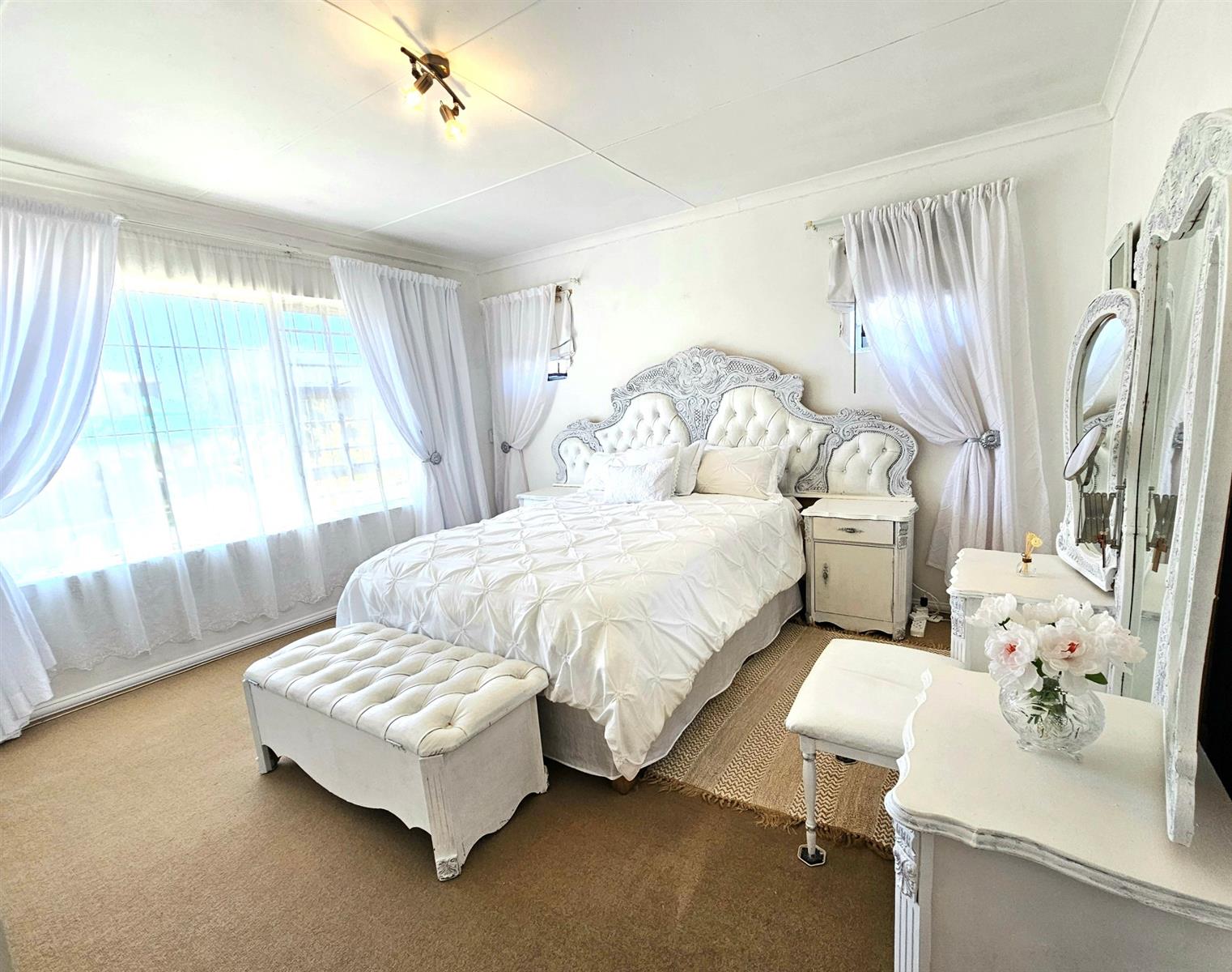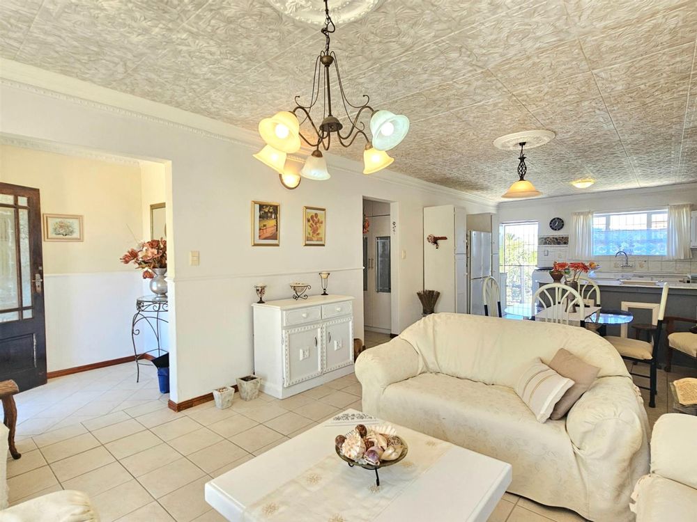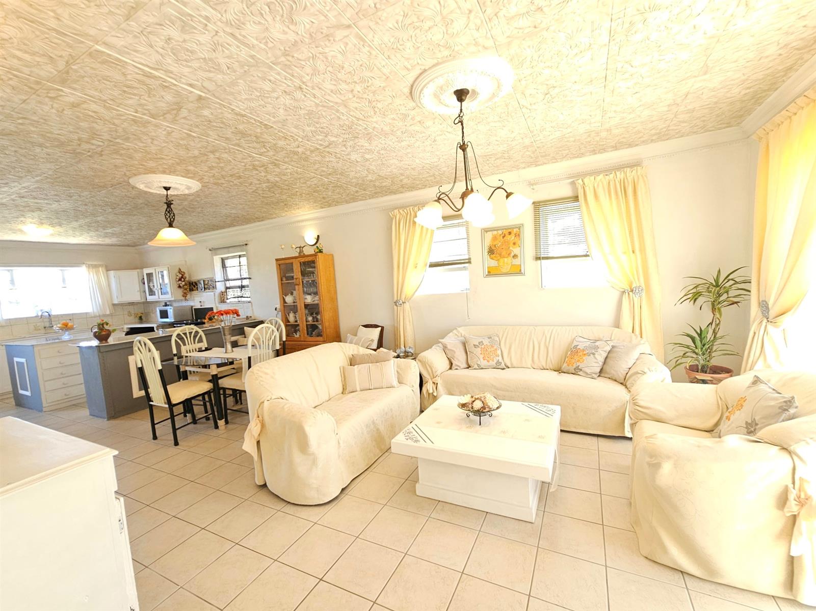 Inside, the spacious lounge, dining area, and kitchen flow seamlessly together, enhanced by large windows that flood the home with natural light. Soft draping, decorative ceilings, and neutral finishes create an inviting and timeless atmosphere. The kitchen provides ample cupboard space, generous countertops, pantry storage, a freestanding stove, and a convenient breakfast counter — perfect for relaxed family living.
