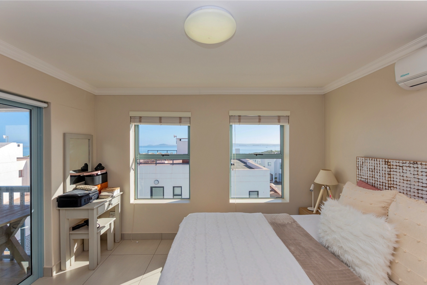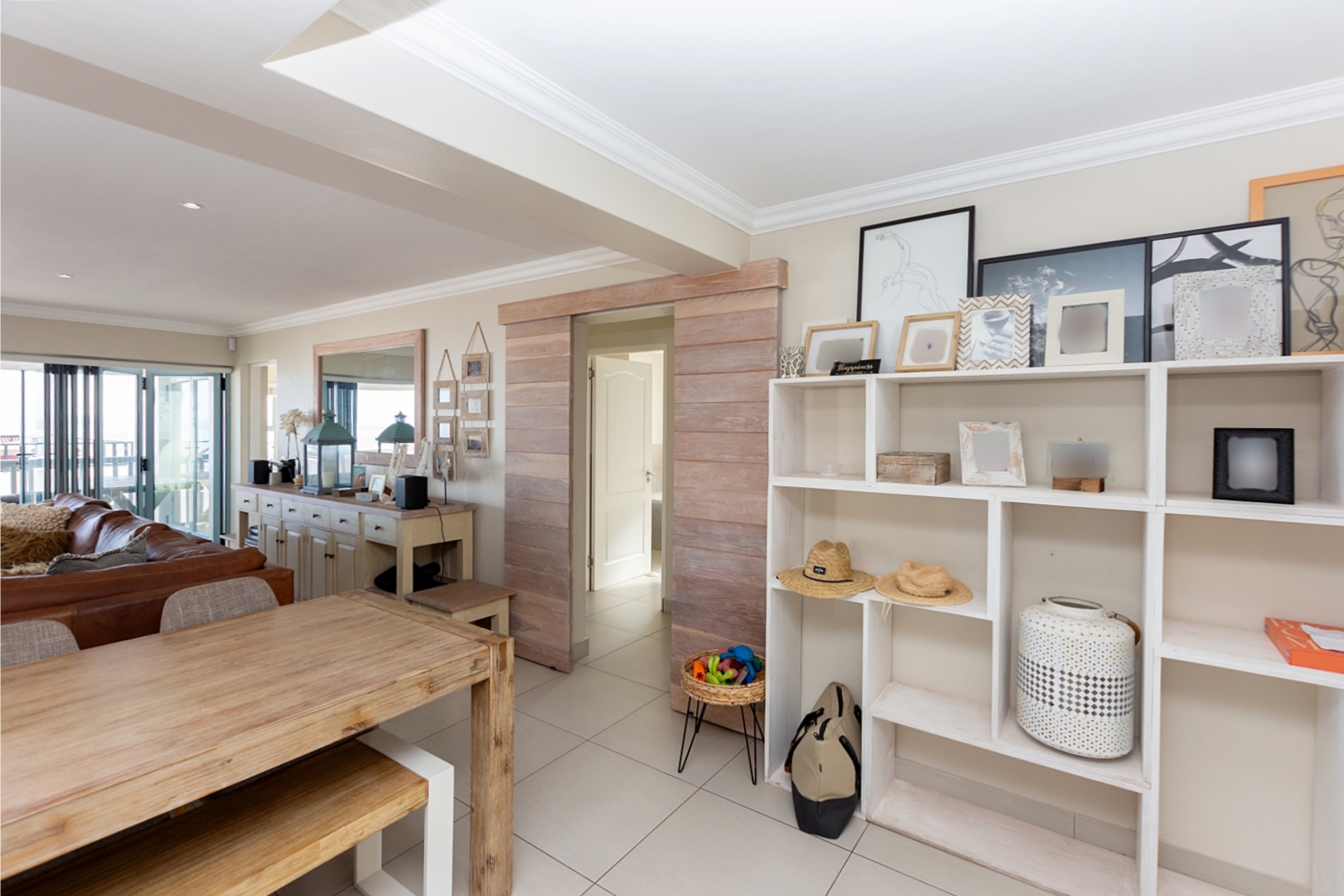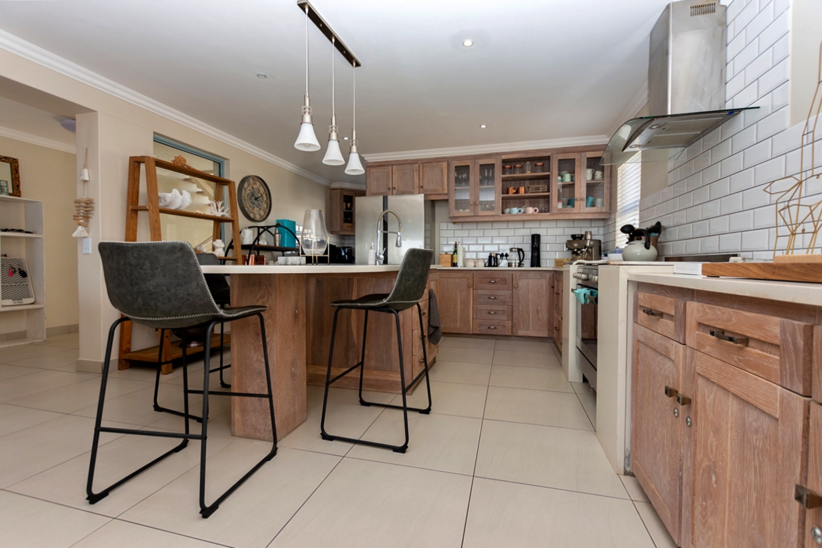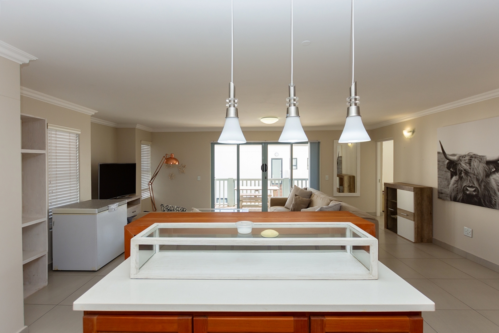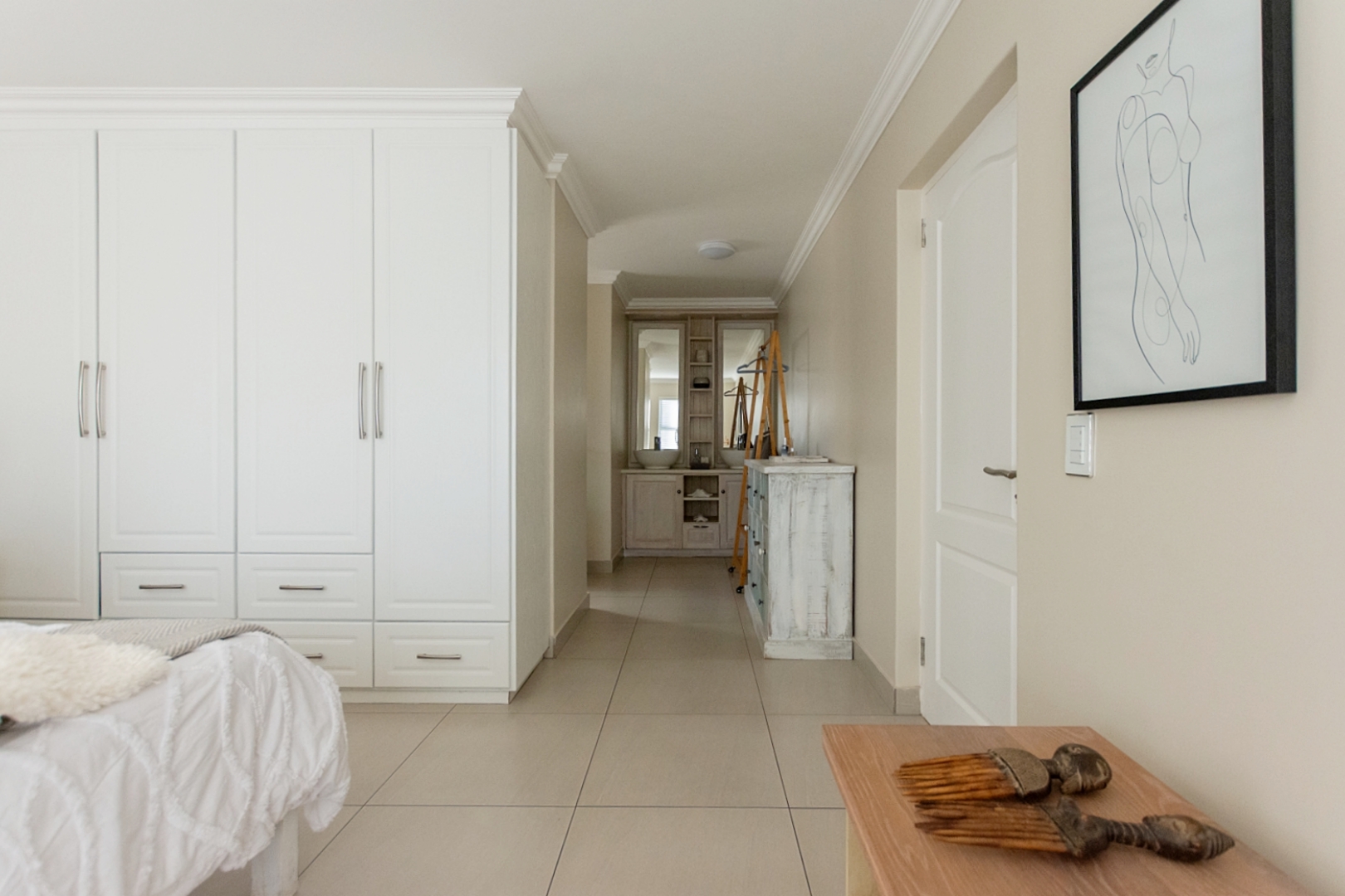 The middle floor is the heart of the home—where open-plan living, dining, and entertainment converge. The kitchen is a standout feature, designed with a unique freestanding island, stone countertops, and a generous scullery tucked discreetly out of sight. Natural wood cabinetry adds texture and character, tying in beautifully with the light, coastal palette throughout the home. The living space flows effortlessly out to a covered balcony, complete with built-in braai and captivating sea views—perfect for entertaining.