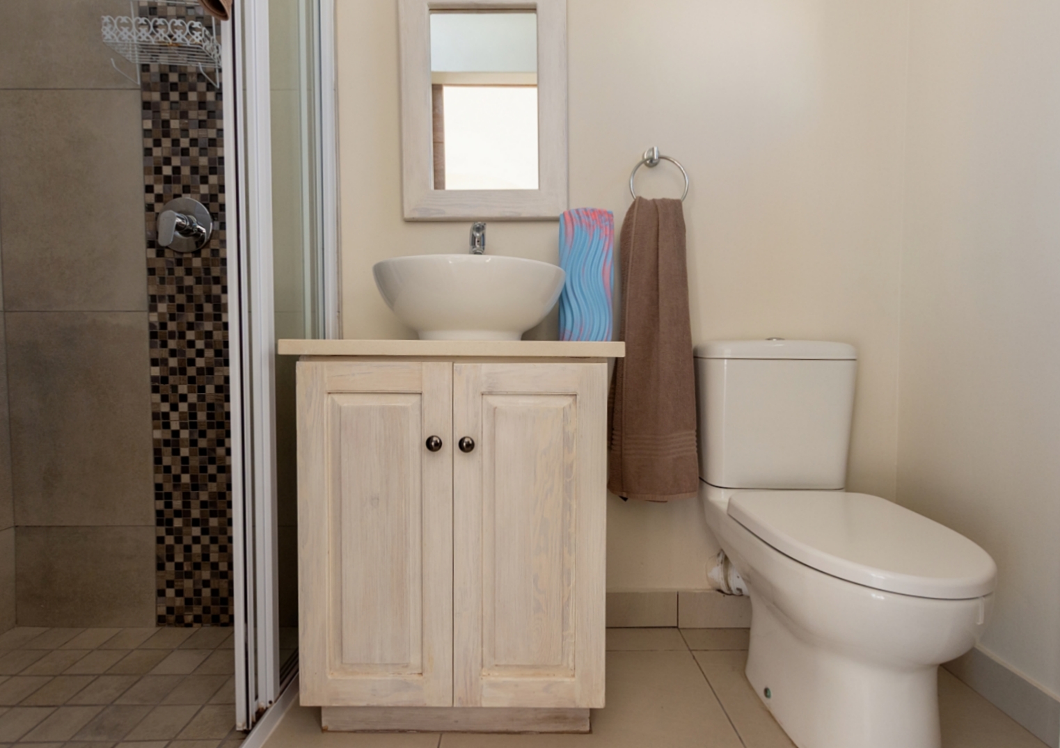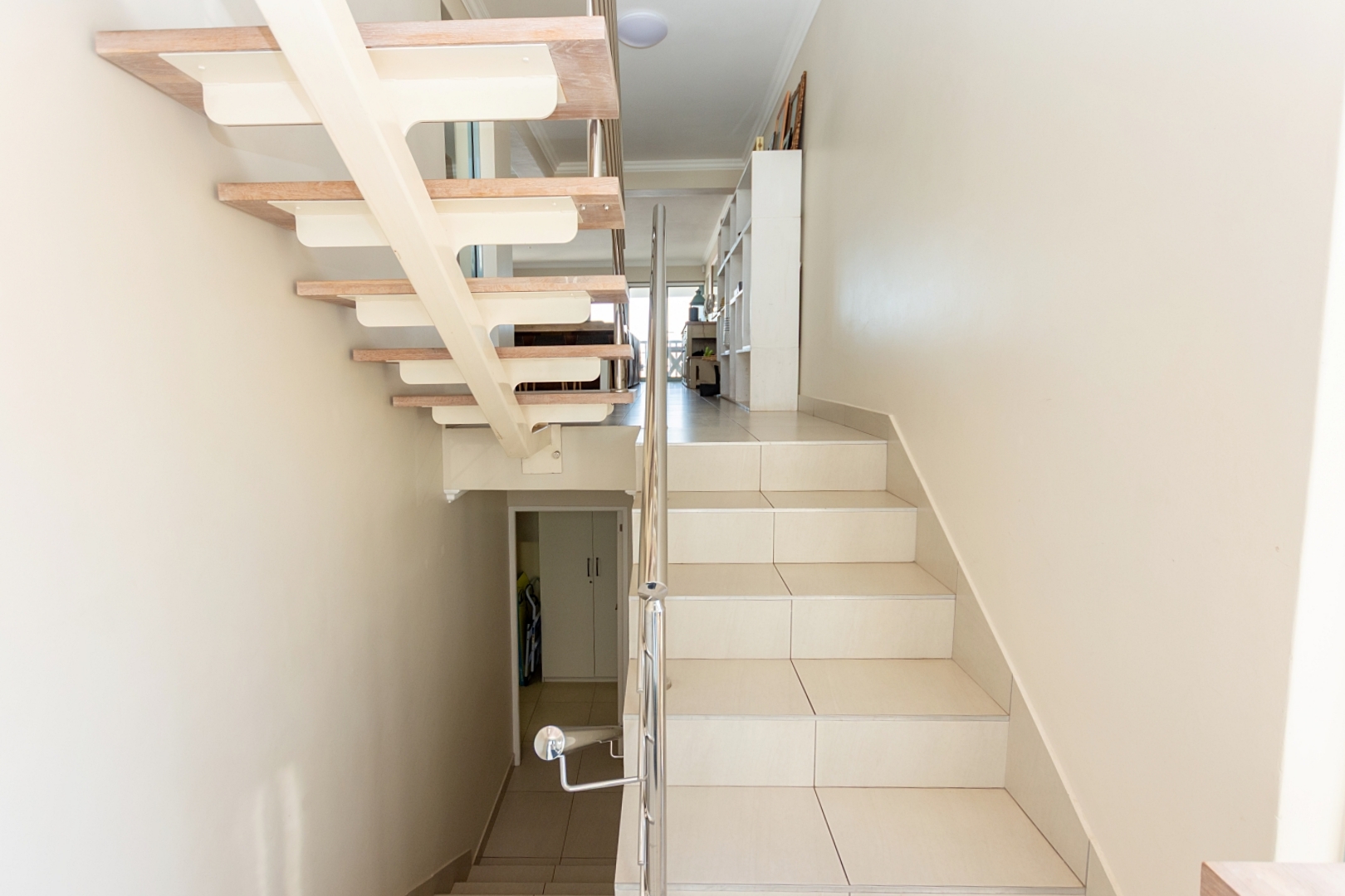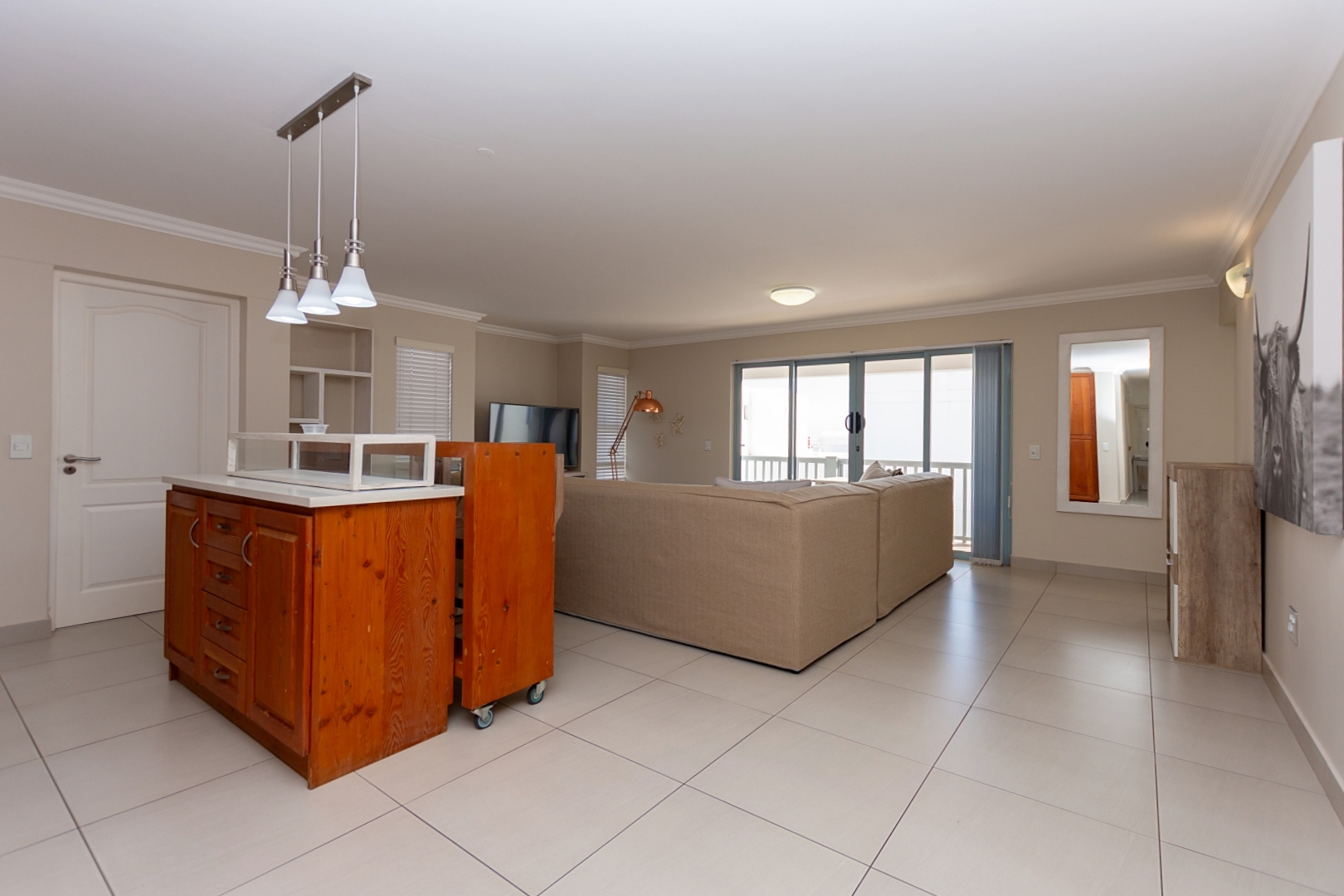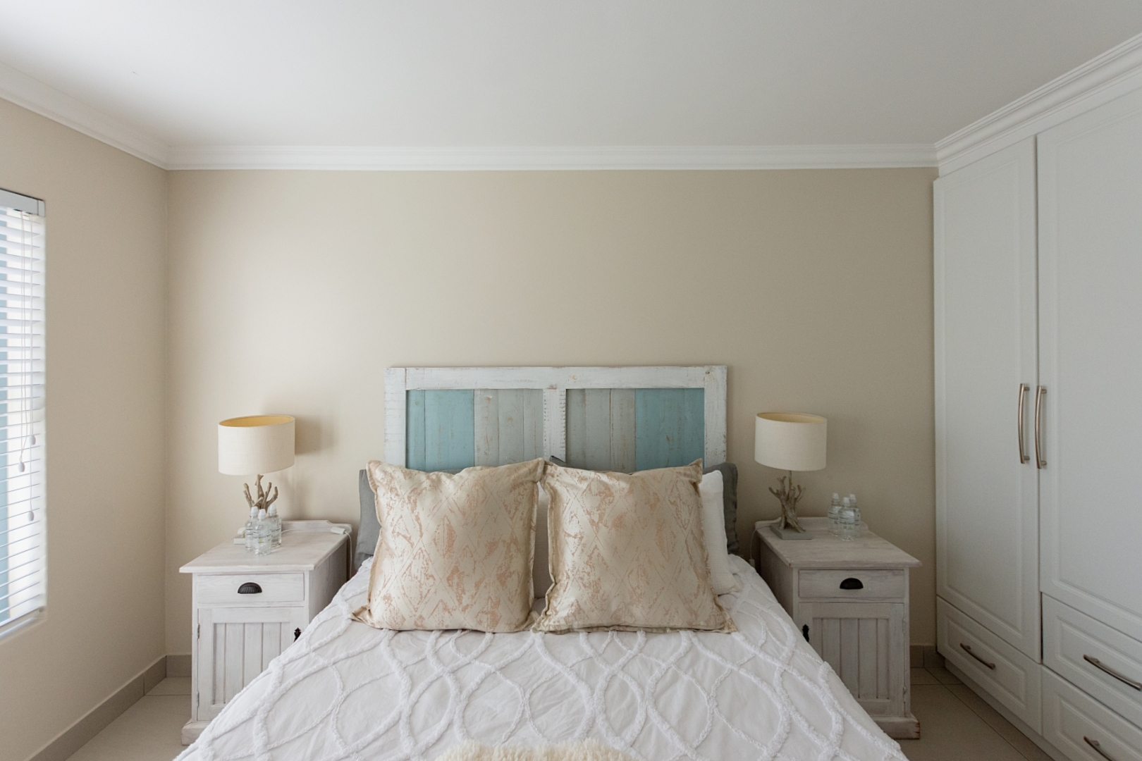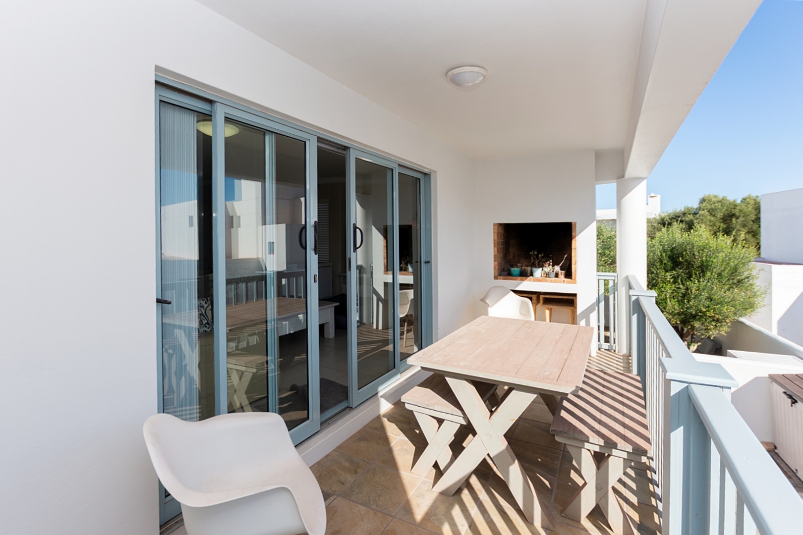 The middle floor is the heart of the home—where open-plan living, dining, and entertainment converge. The kitchen is a standout feature, designed with a unique freestanding island, stone countertops, and a generous scullery tucked discreetly out of sight. Natural wood cabinetry adds texture and character, tying in beautifully with the light, coastal palette throughout the home. The living space flows effortlessly out to a covered balcony, complete with built-in braai and captivating sea views—perfect for entertaining.