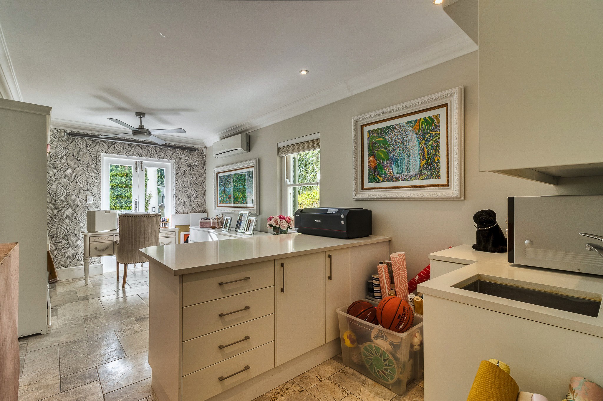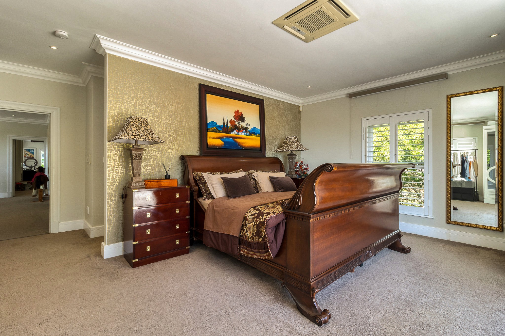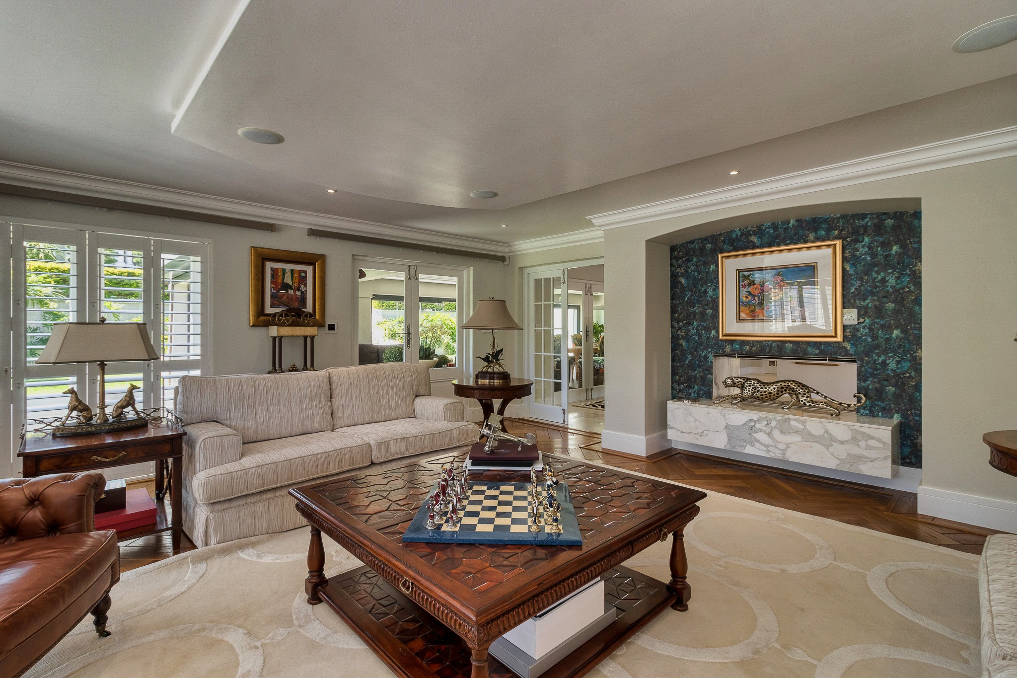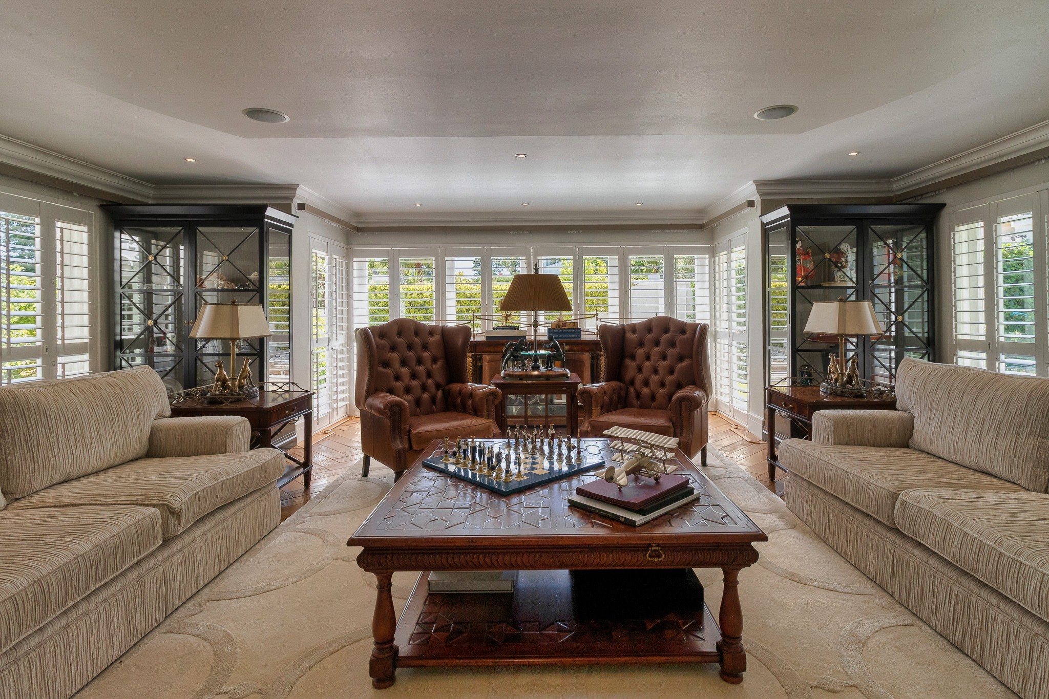 The main residence showcases timeless architecture and meticulous attention to detail throughout. It offers five spacious en suite bedrooms, ensuring comfort and privacy for family and guests alike. Living areas are generous and elegant, including a beautiful study, a second lounge for relaxed living or entertaining, and seamless indoor–outdoor flow to an undercover patio that overlooks the immaculately manicured garden, with views stretching towards the mountains and sea. The home is further enhanced by triple garaging and exquisite finishes that reflect understated luxury.