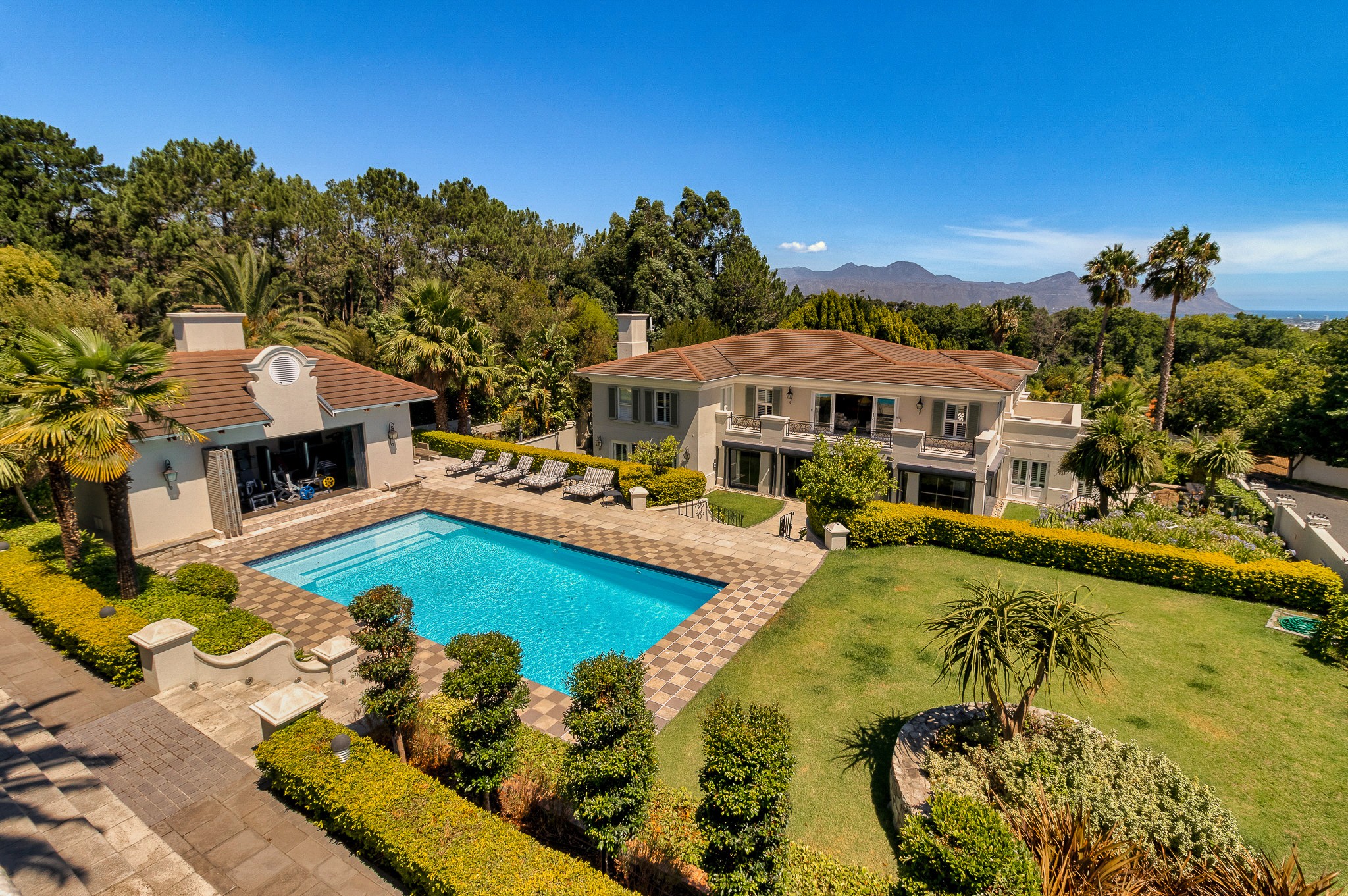 The estate comprises two substantial, independent homes, thoughtfully arranged around a central swimming pool and dedicated gym room, creating a tranquil, resort-style environment. From various vantage points across the property, one is treated to beautiful sea and mountain views, adding a rare sense of elevation and serenity to the setting. Huge potential for subdivision if required.