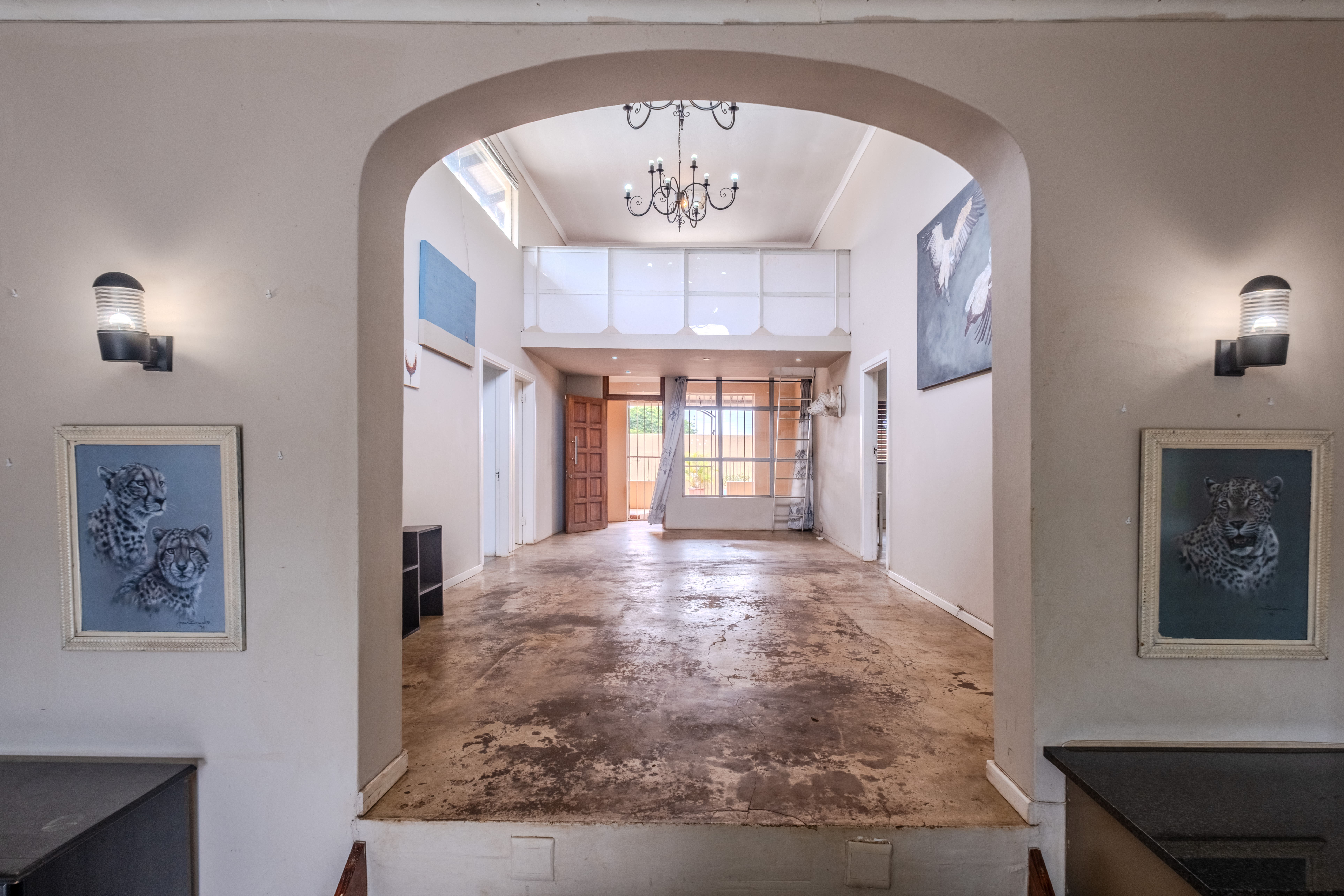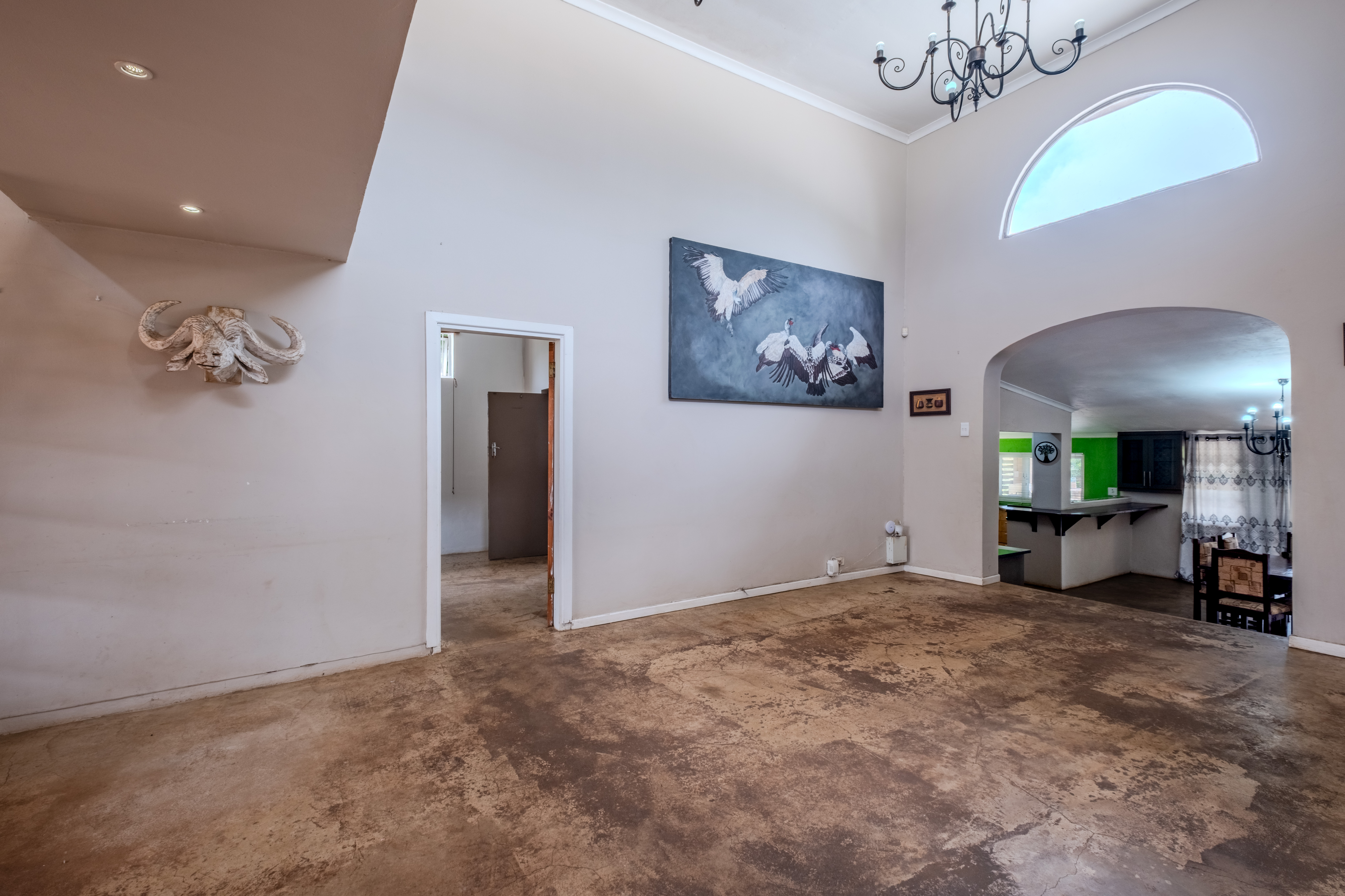 Outdoor living is equally impressive. A covered entertainment patio overlooks a shimmering swimming pool framed by established greenery, creating a private oasis for summer braais, family gatherings, and lazy afternoons in the sun.
