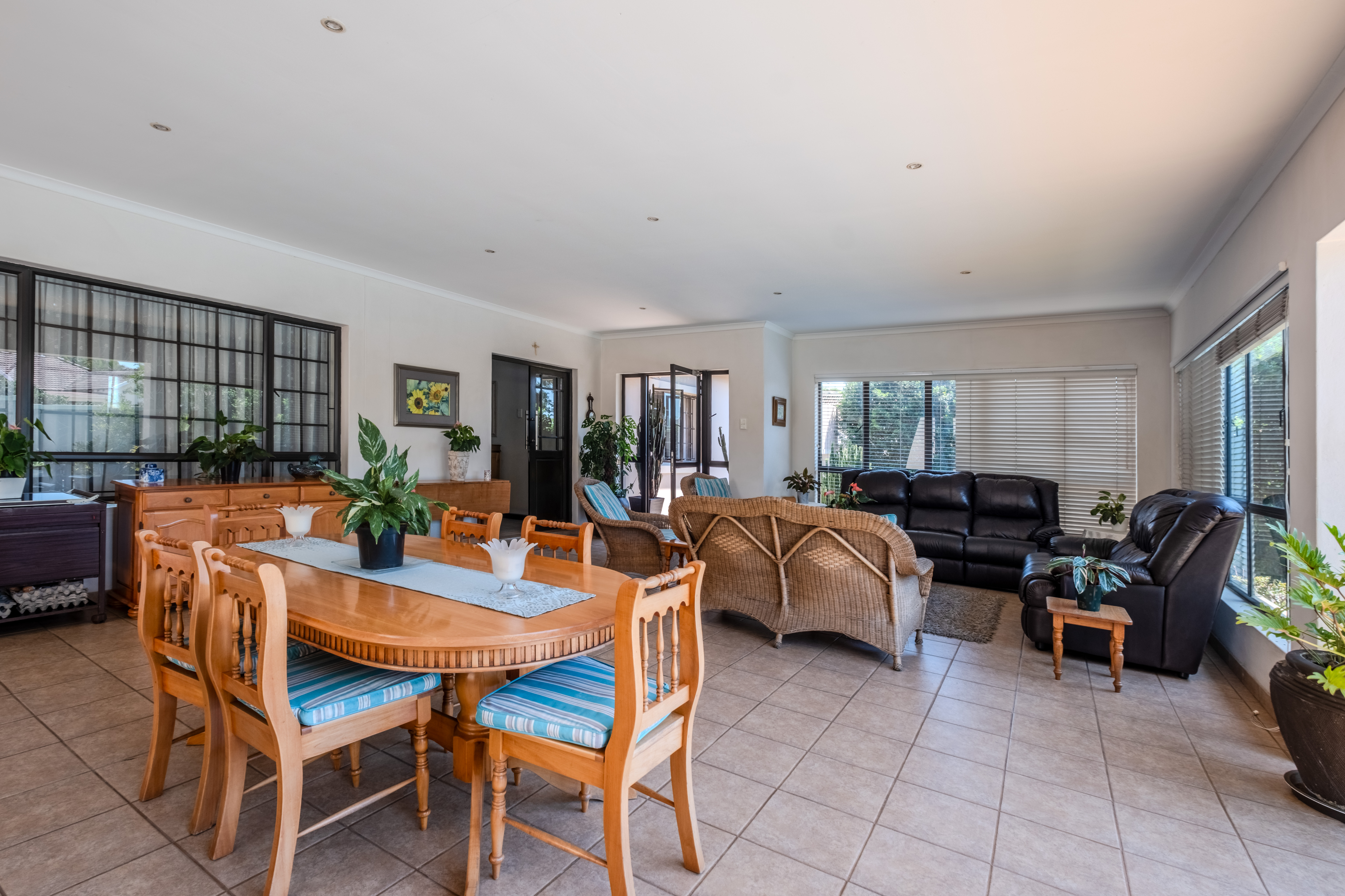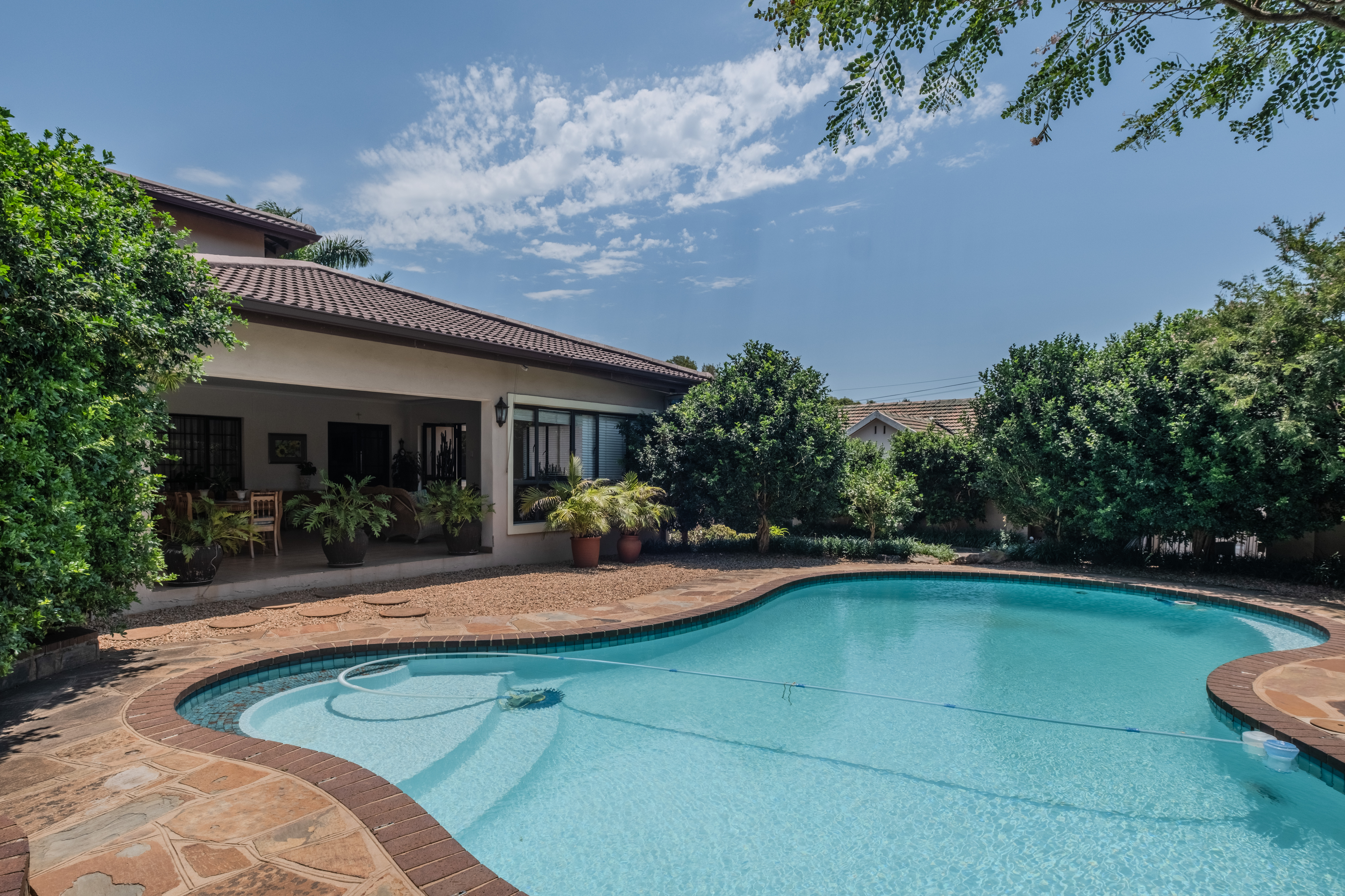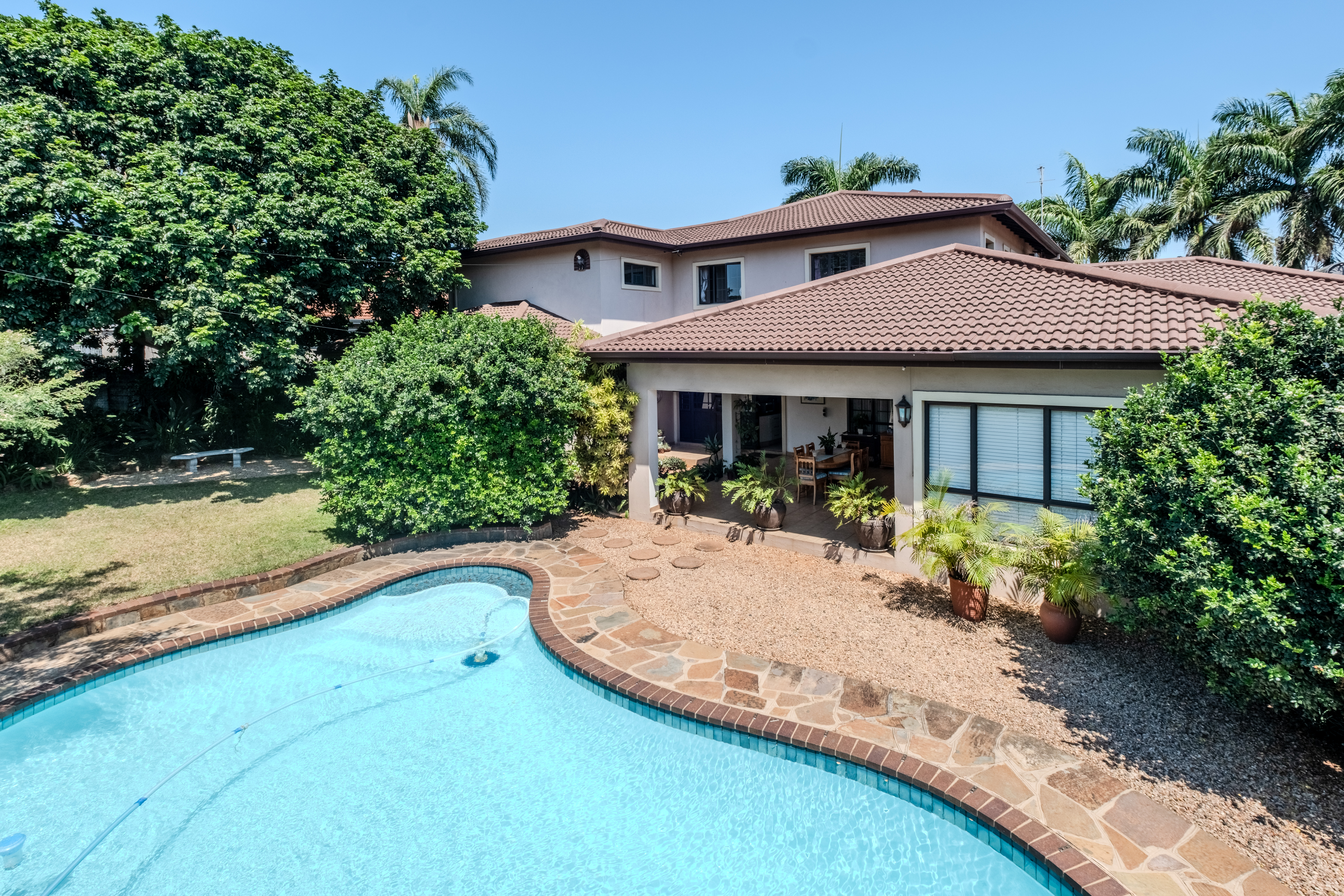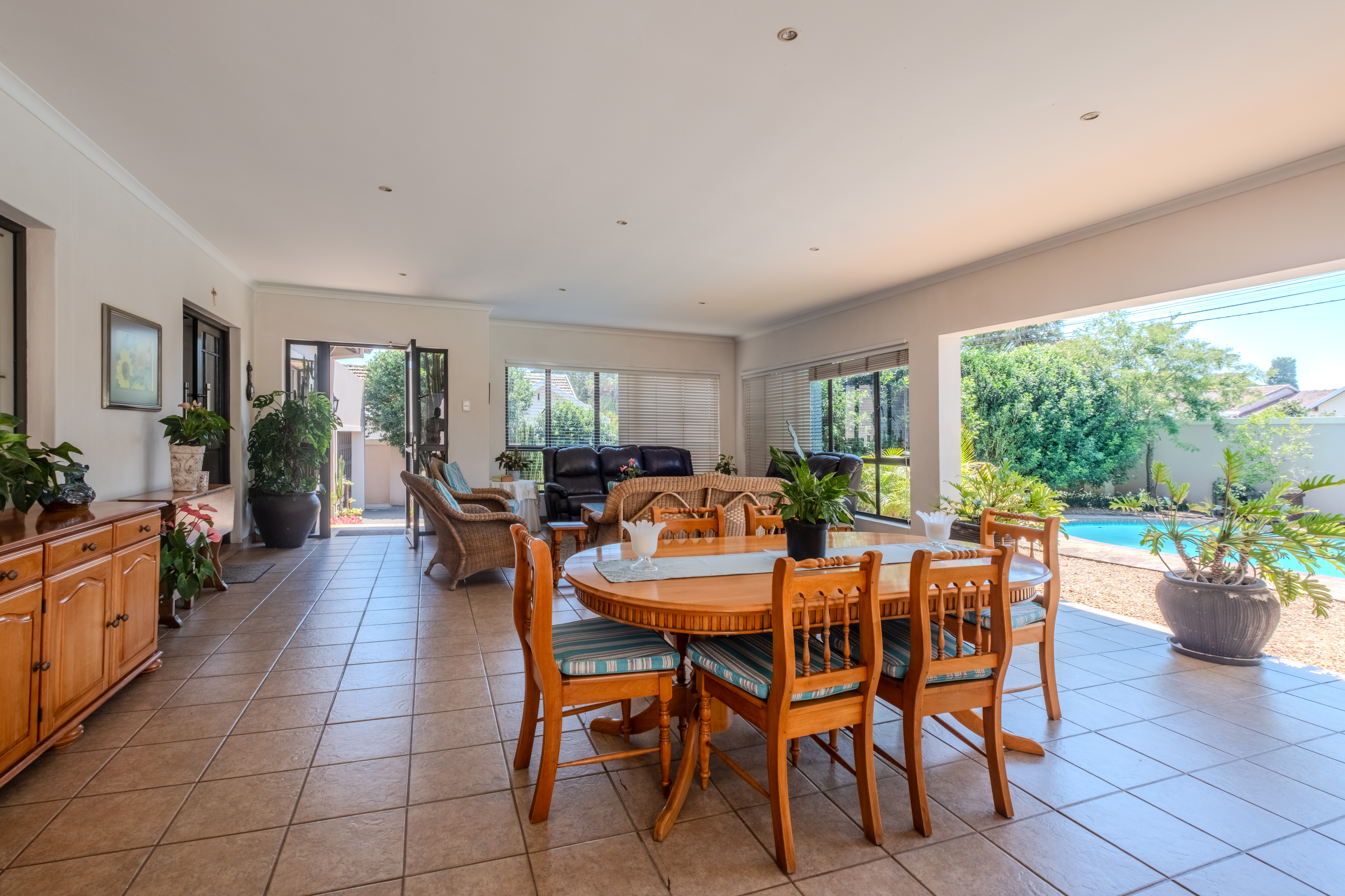 The front of the home is where family life and entertaining truly come alive. A large covered patio overlooks a sparkling swimming pool and lush gardens that create a tranquil, tropical atmosphere — the perfect setting for weekend braais, children’s parties, or simply relaxing outdoors. The open-plan living areas flow effortlessly, offering generous space for both lounge and dining, filled with natural light and warmth.