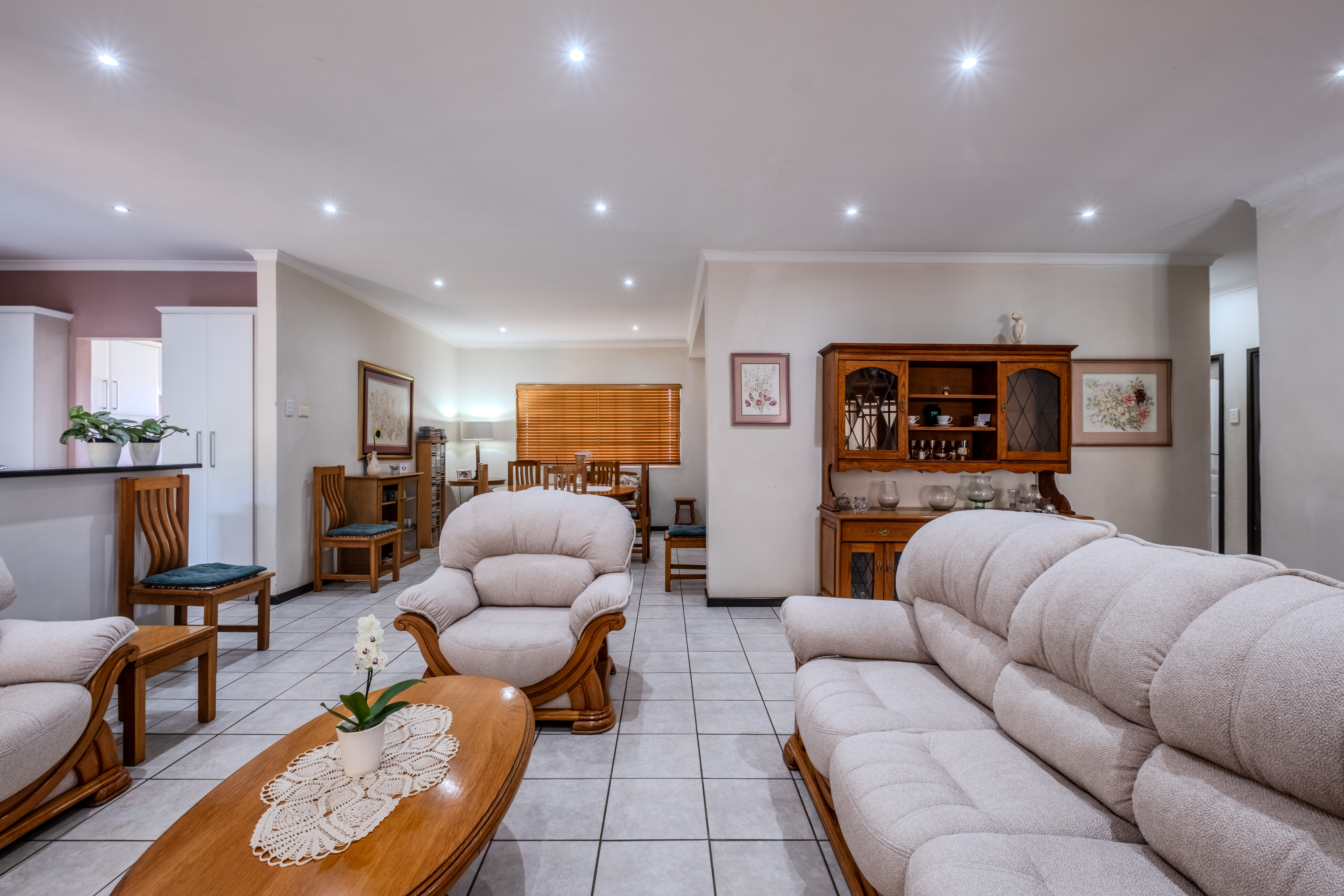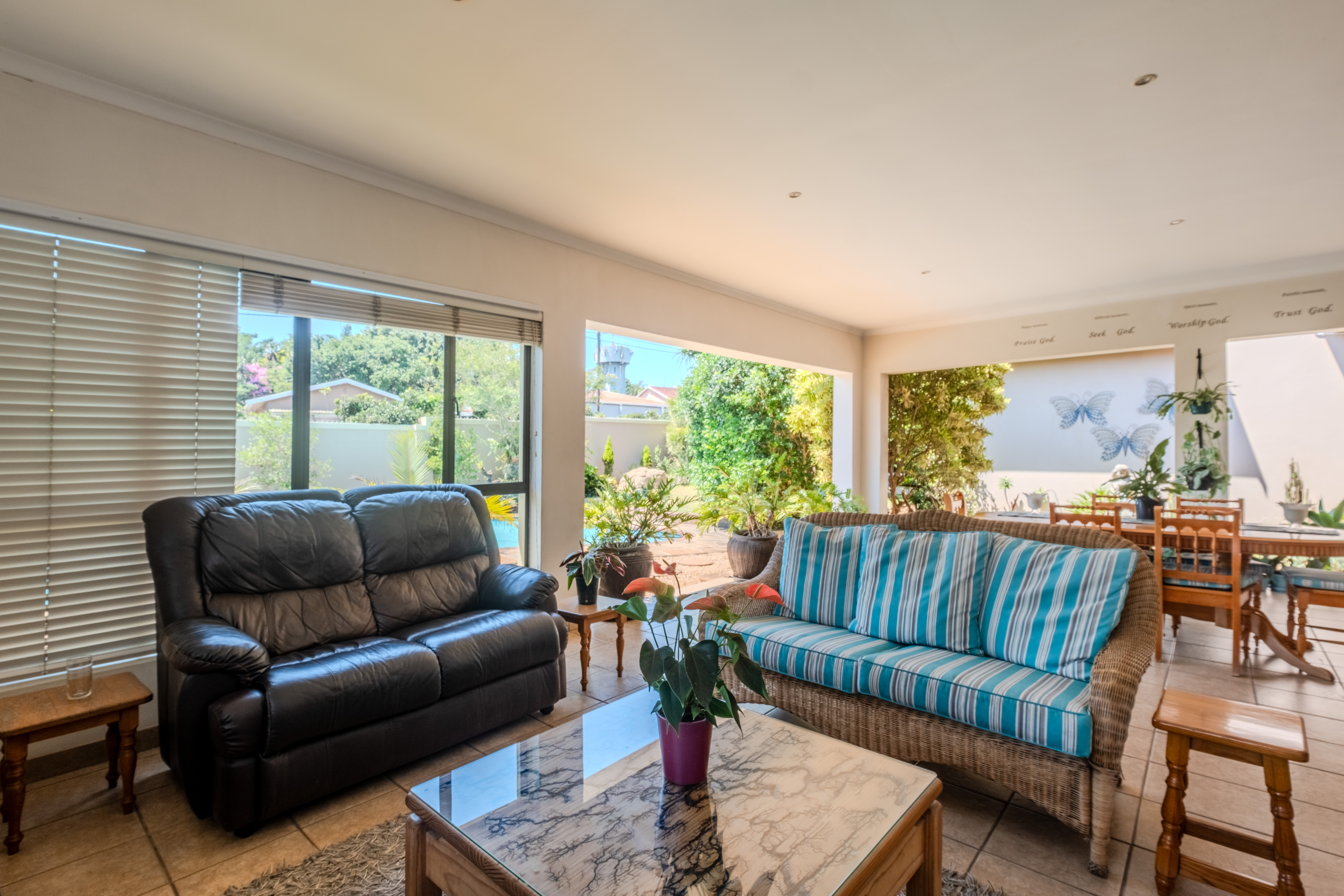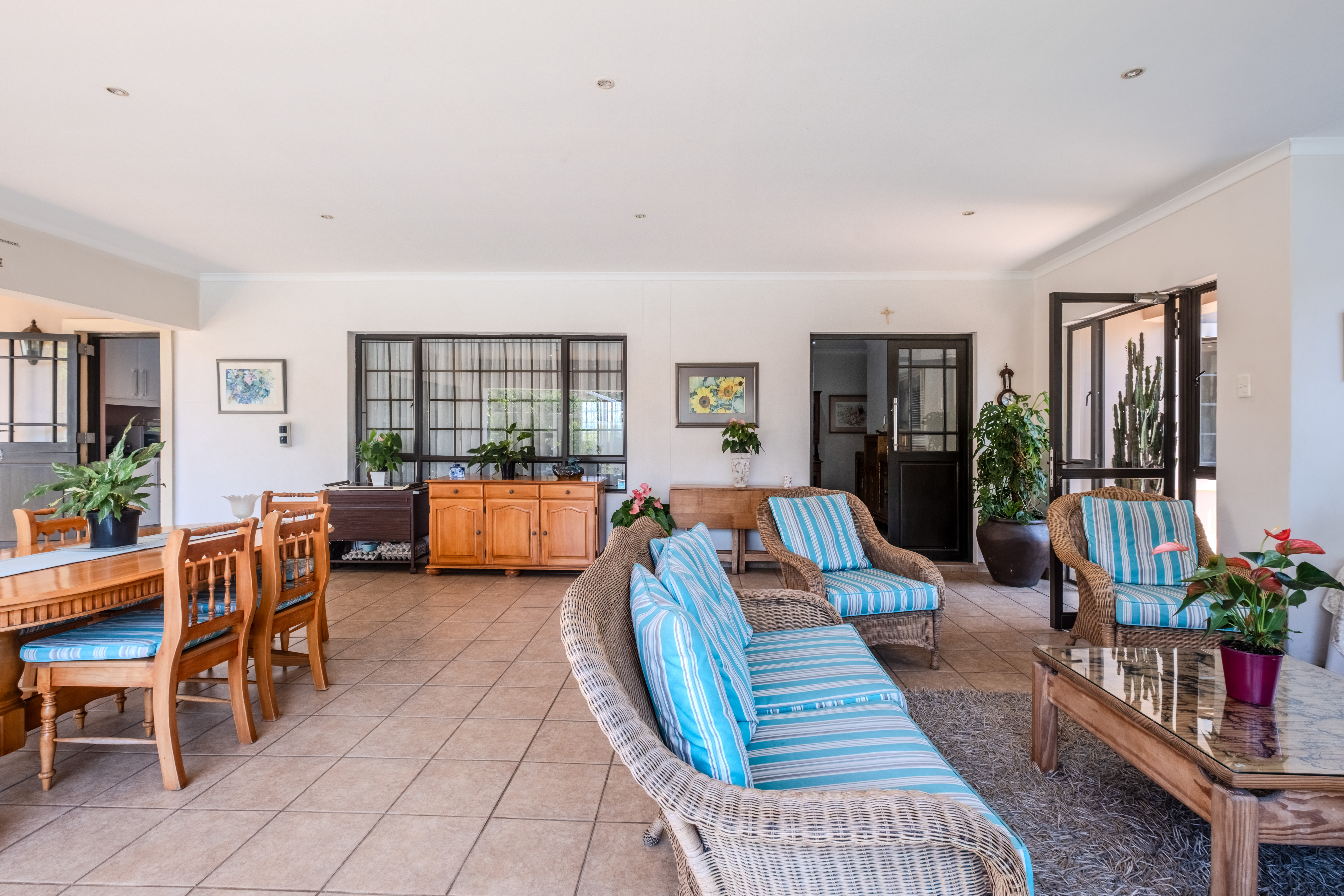 The front of the home is where family life and entertaining truly come alive. A large covered patio overlooks a sparkling swimming pool and lush gardens that create a tranquil, tropical atmosphere — the perfect setting for weekend braais, children’s parties, or simply relaxing outdoors. The open-plan living areas flow effortlessly, offering generous space for both lounge and dining, filled with natural light and warmth.