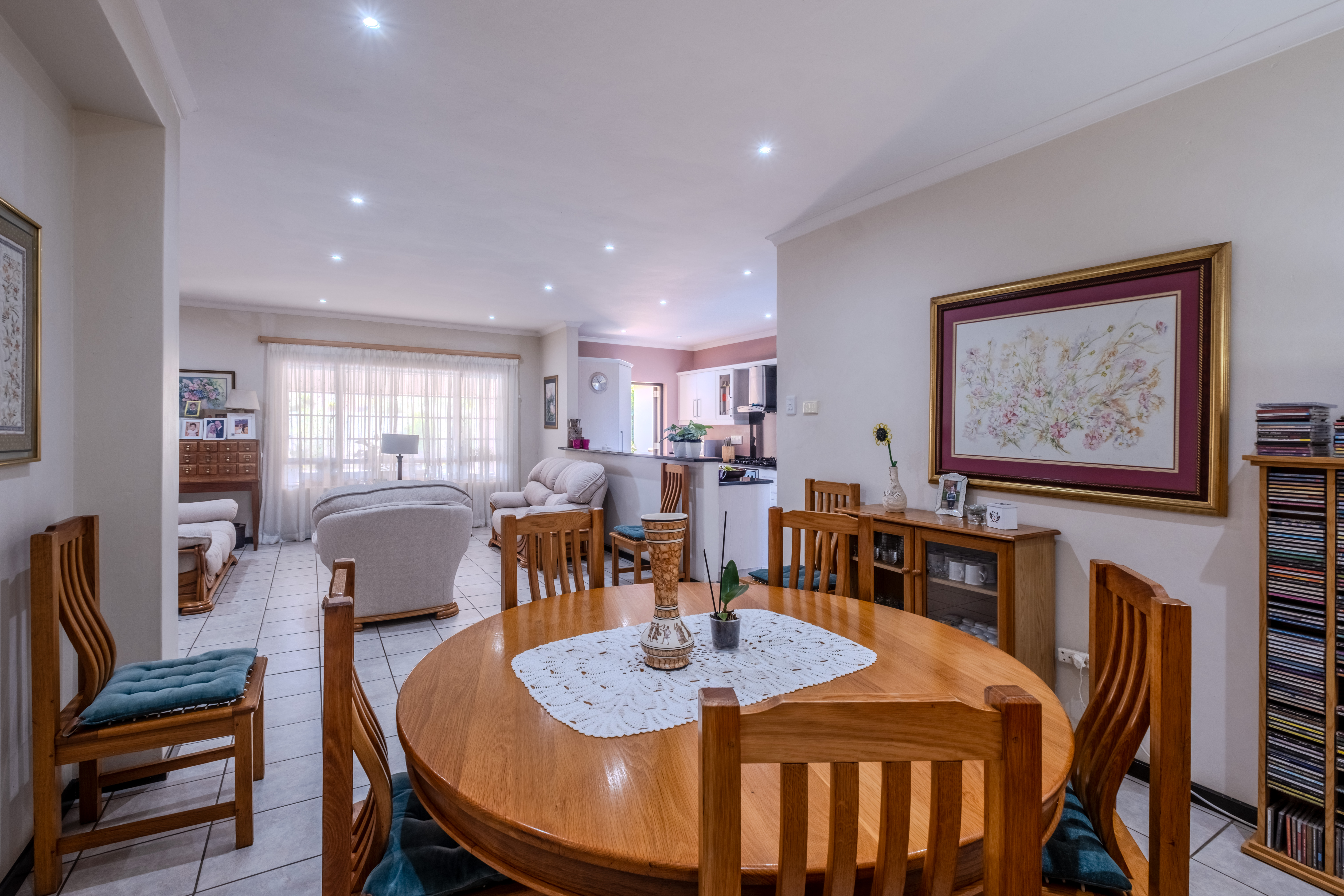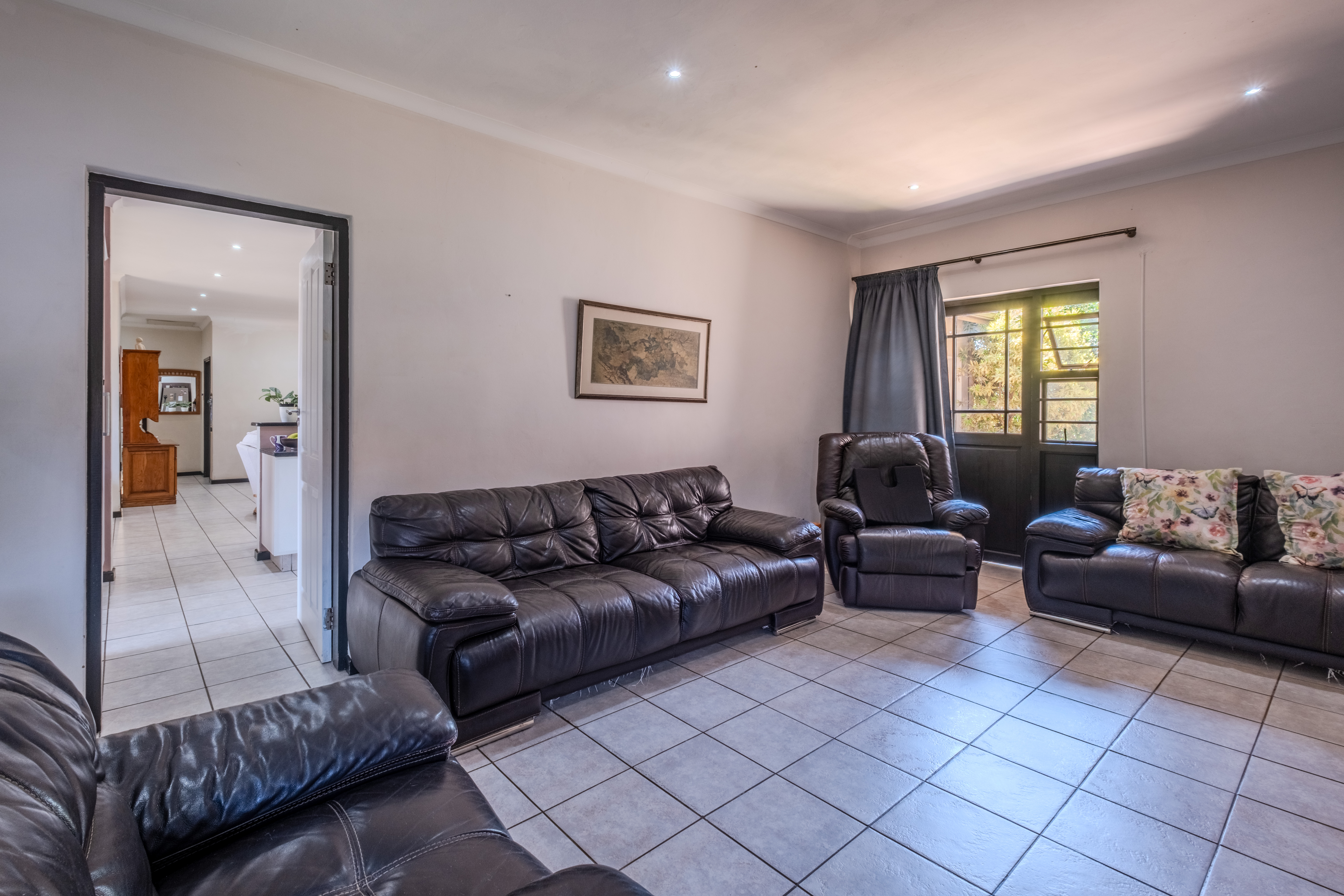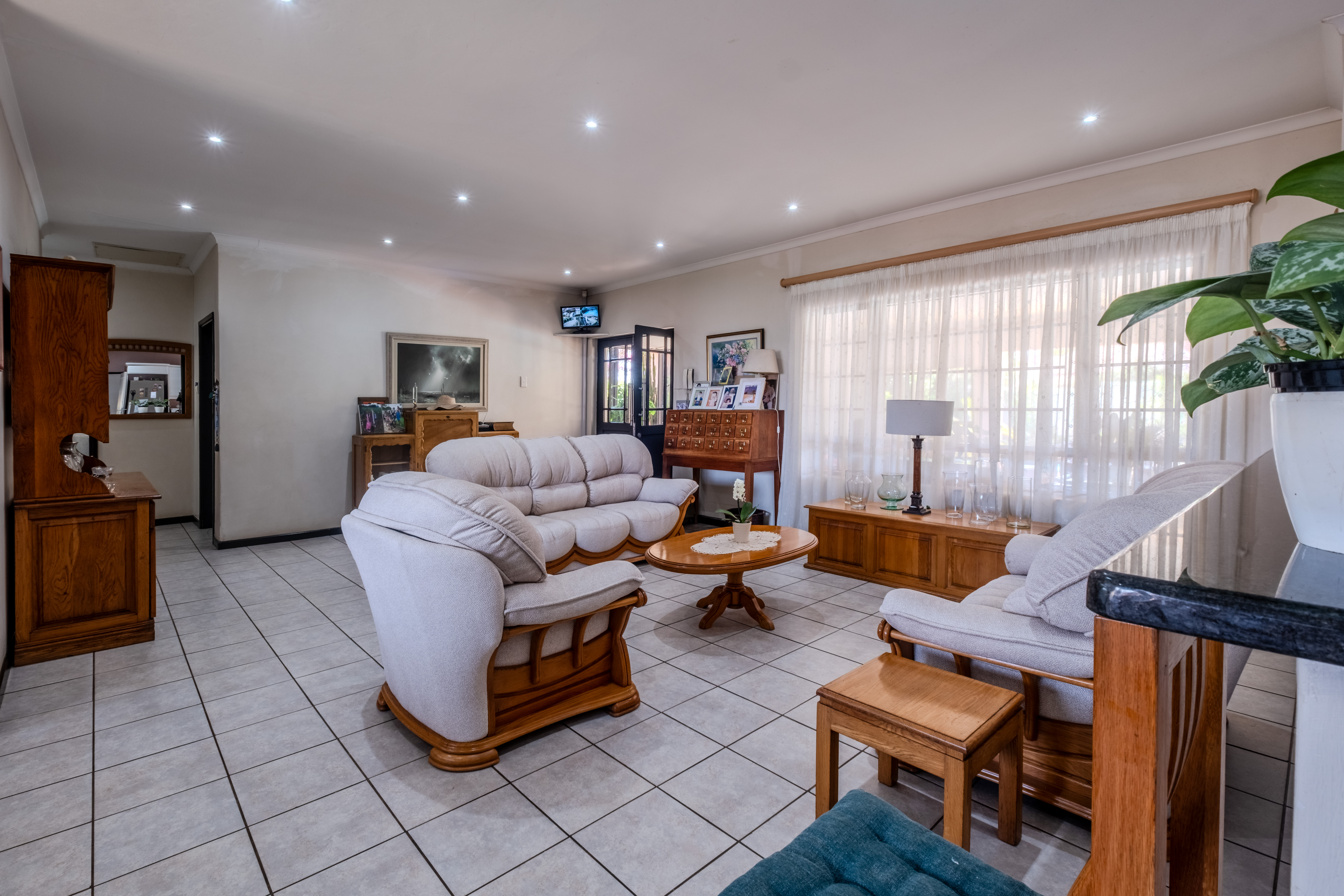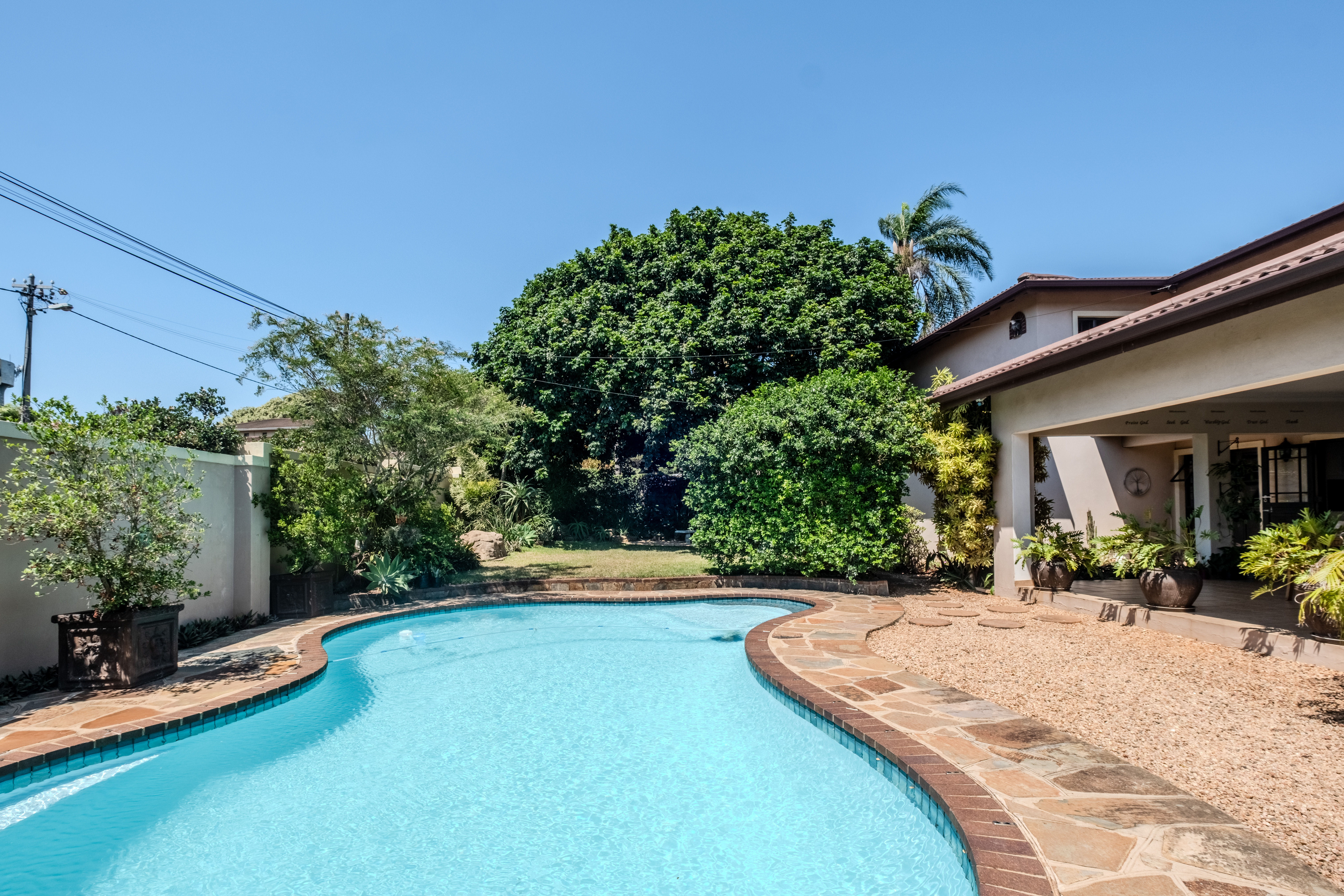 The front of the home is where family life and entertaining truly come alive. A large covered patio overlooks a sparkling swimming pool and lush gardens that create a tranquil, tropical atmosphere — the perfect setting for weekend braais, children’s parties, or simply relaxing outdoors. The open-plan living areas flow effortlessly, offering generous space for both lounge and dining, filled with natural light and warmth.