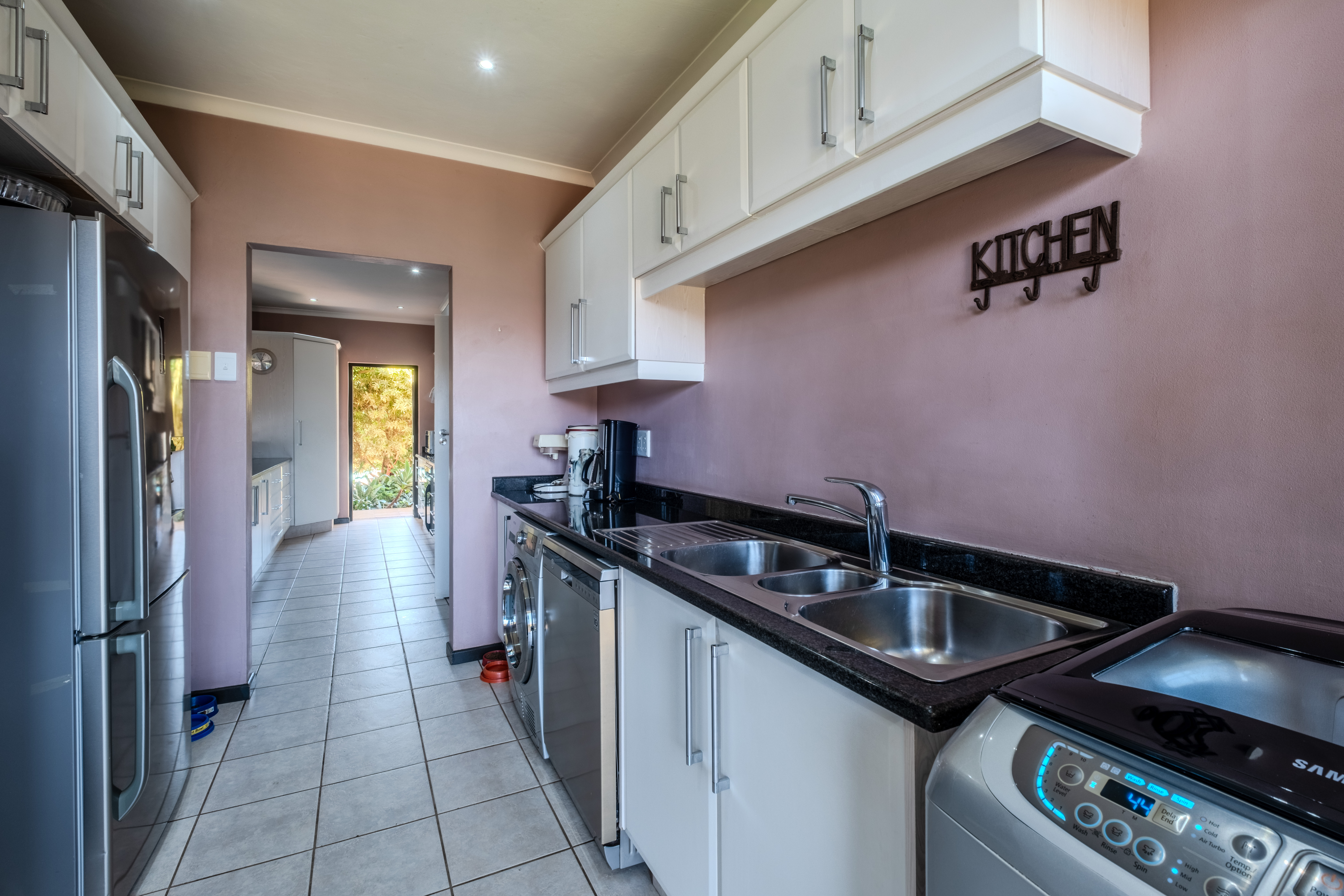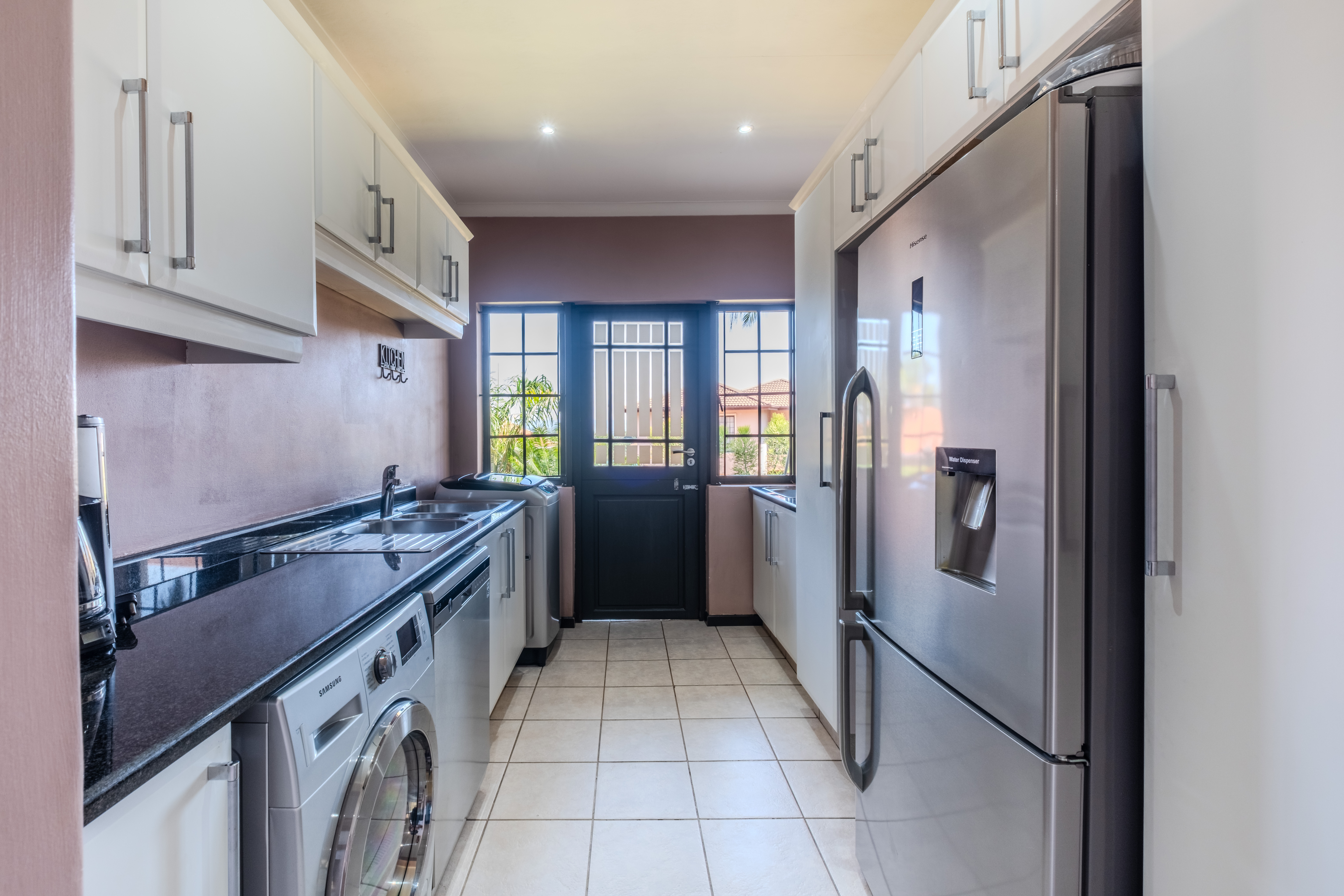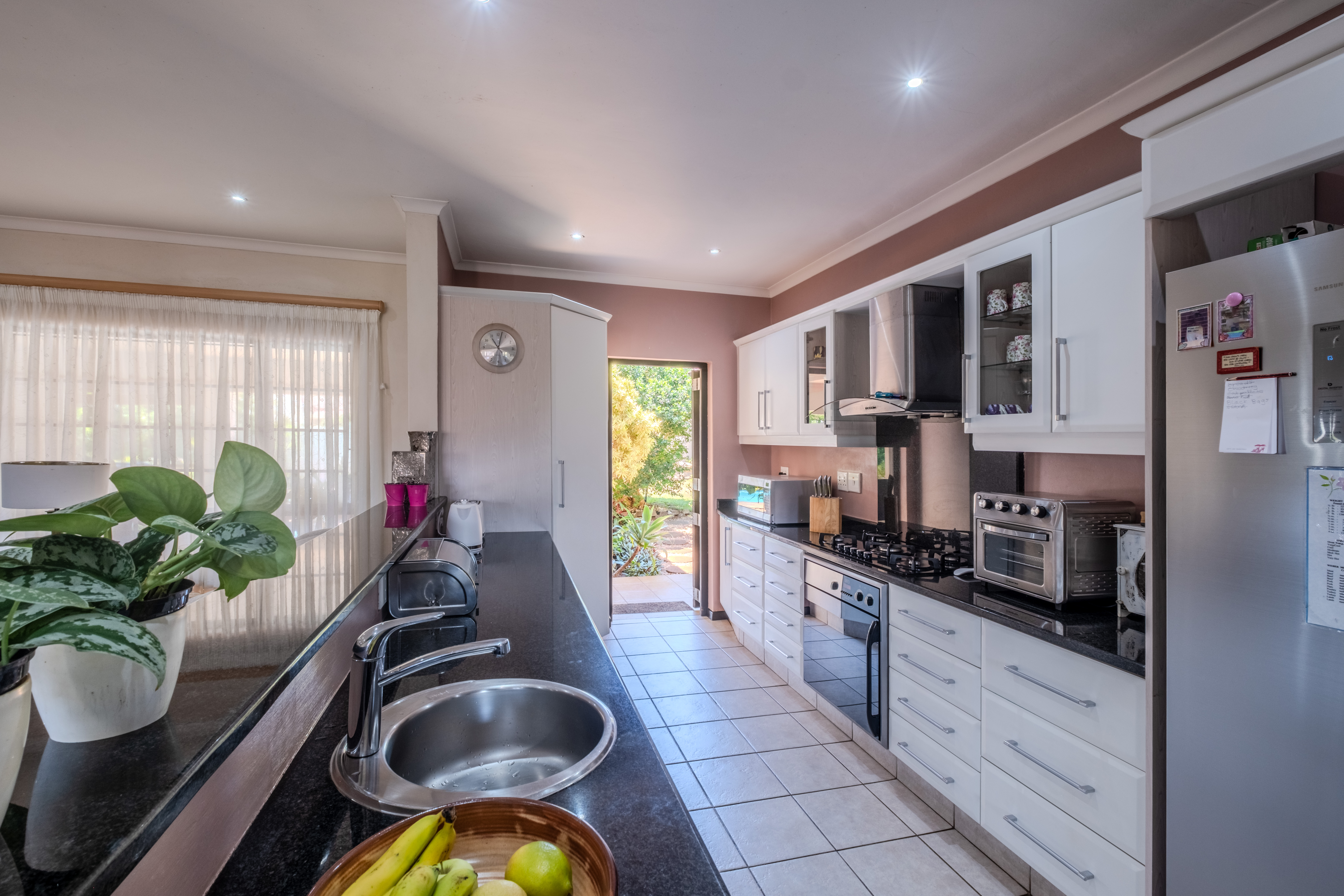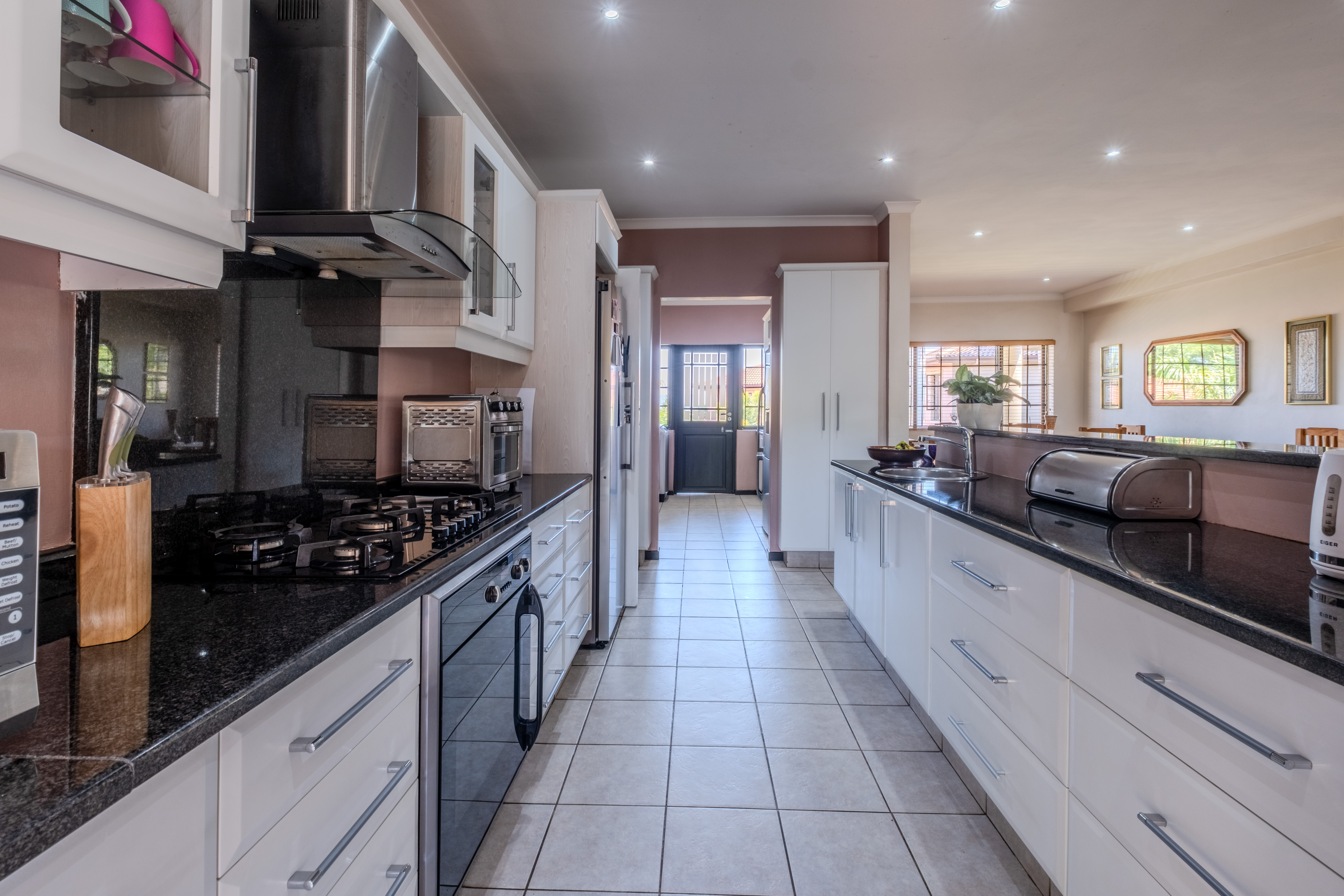 The kitchen is thoughtfully designed with functionality in mind, featuring ample cupboard space, granite countertops, a gas oven with electric stove, a corner pantry, and a separate scullery to keep everyday clutter out of sight.