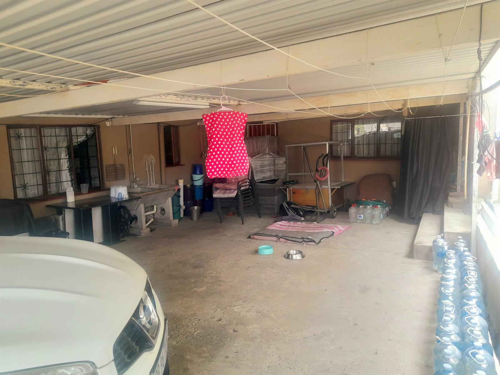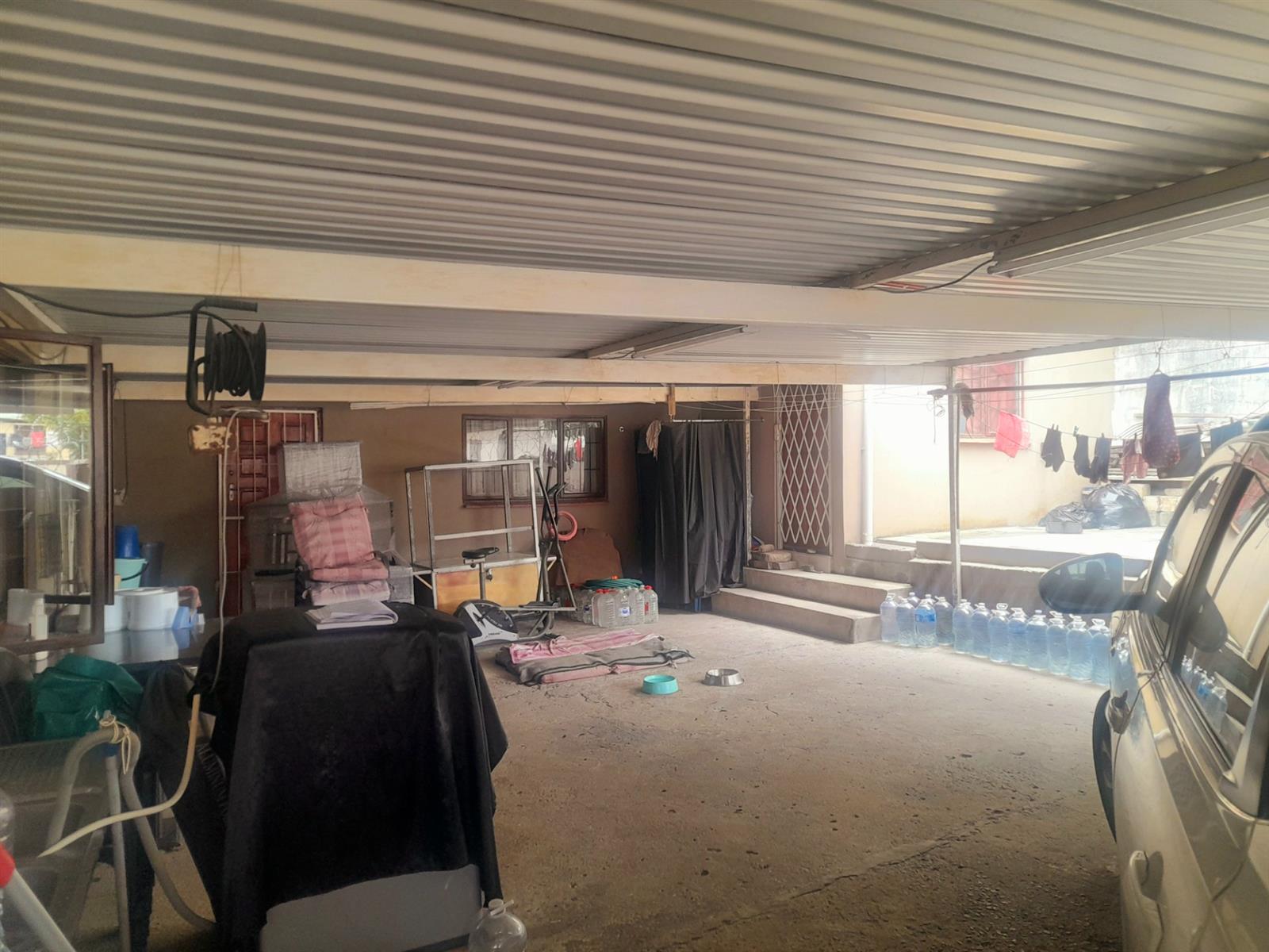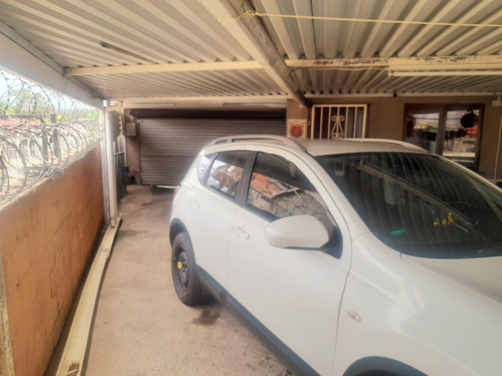 Electronically operated garage door leading to a vast backyard with a massive carport for five vehicles. Additional secure parking for four more vehicles in the front yard, accessed via an electronically controlled sliding gate.