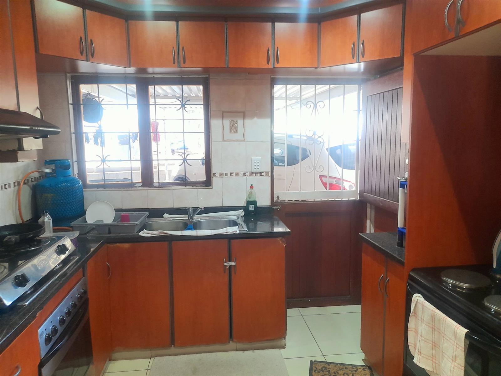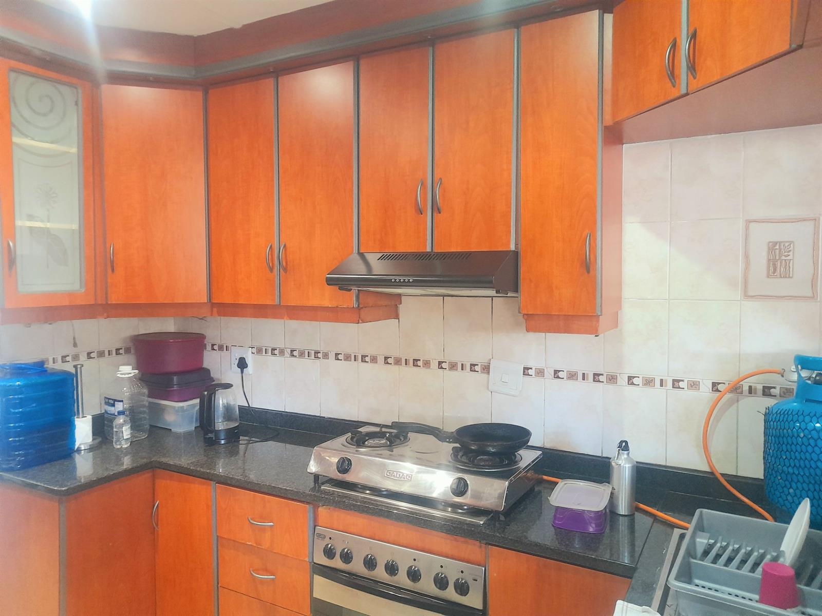 Fully equipped with ample cupboards, oven, hob, portable gas hob, extractor fan, and granite countertops.