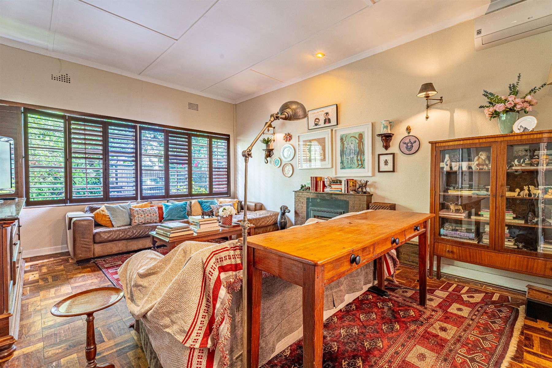 Large lounge with a wood burning fireplace and aircon