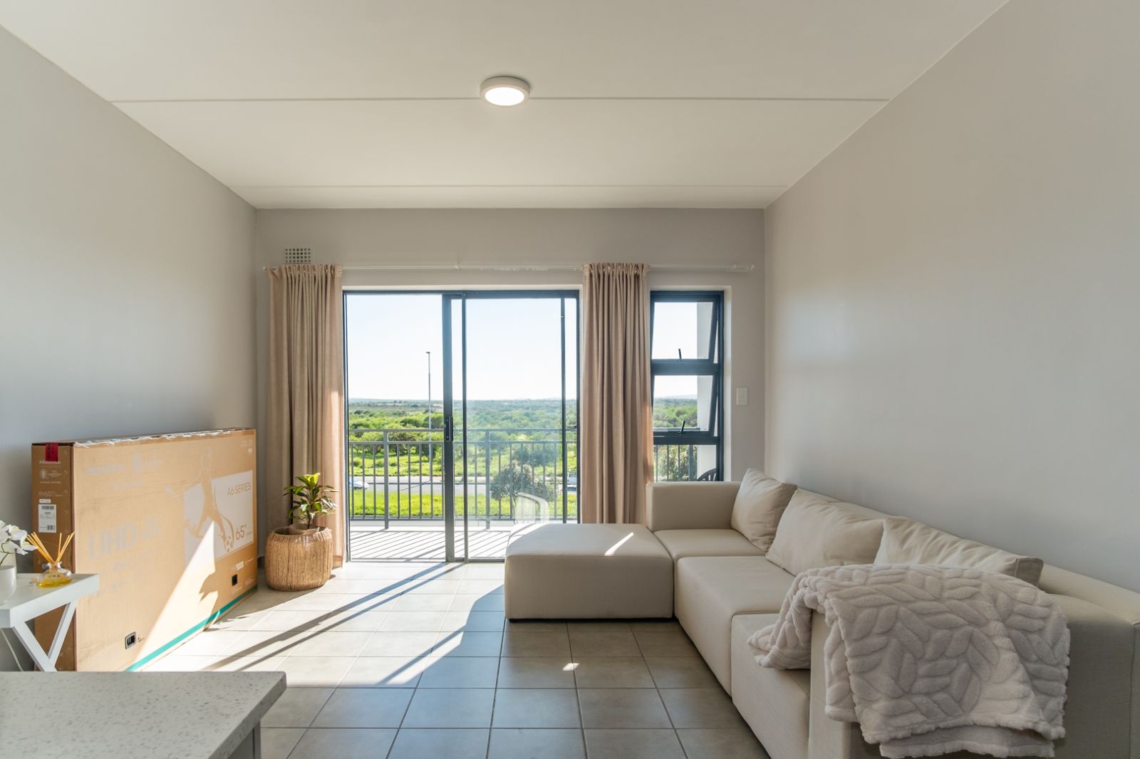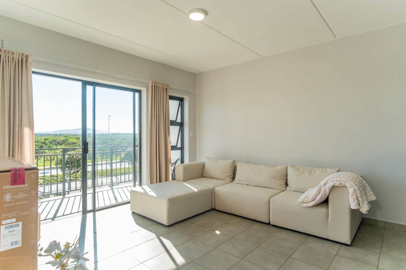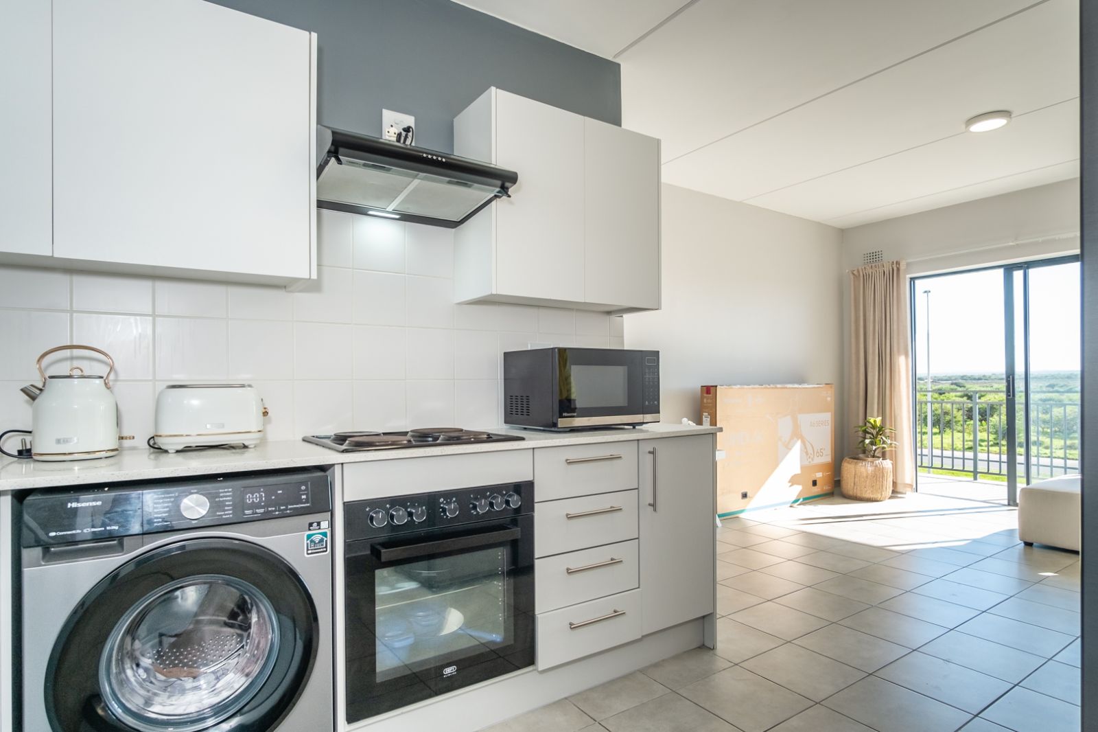 The spacious living area flows seamlessly into a sleek, functional kitchen, while both bedrooms offer built-in cupboards and natural light.