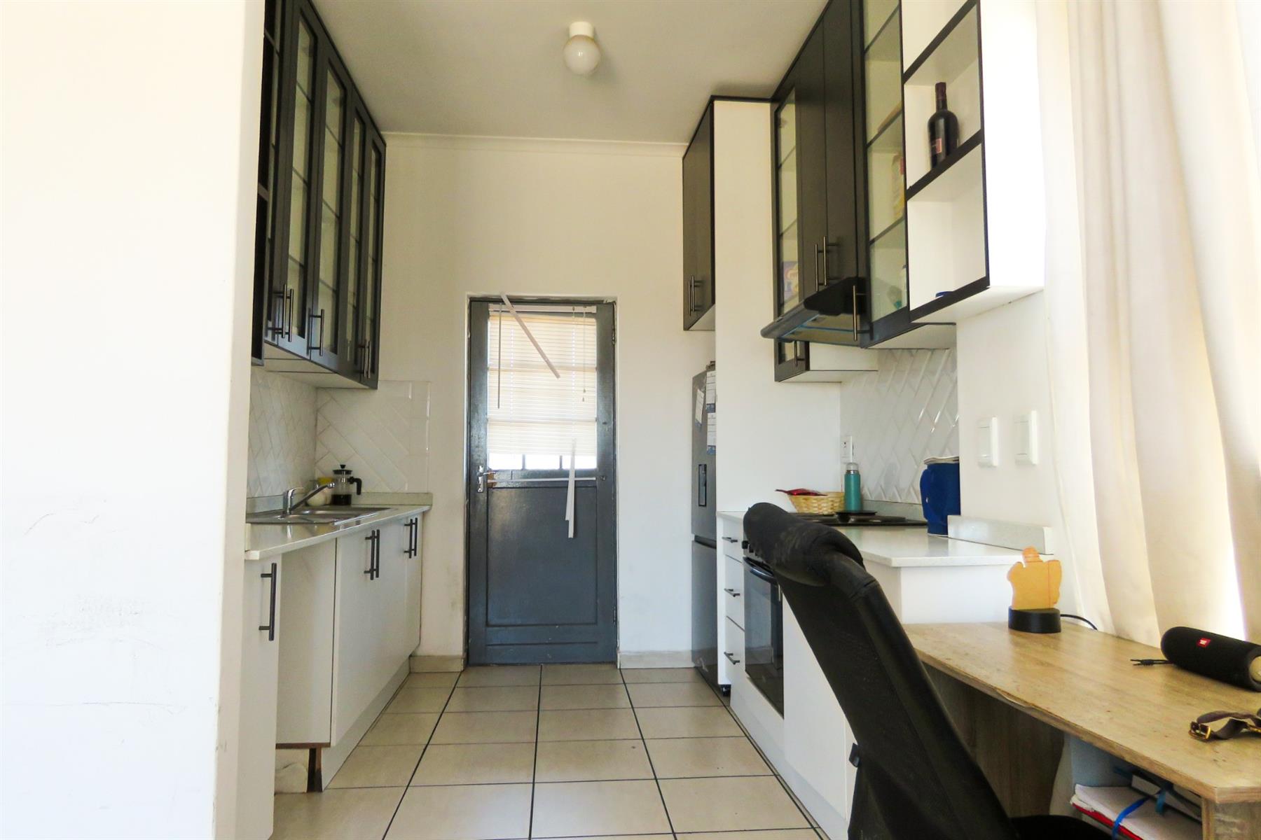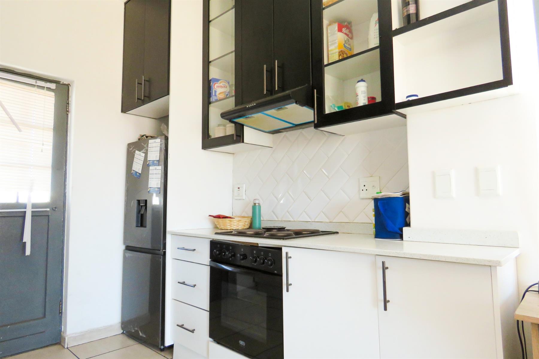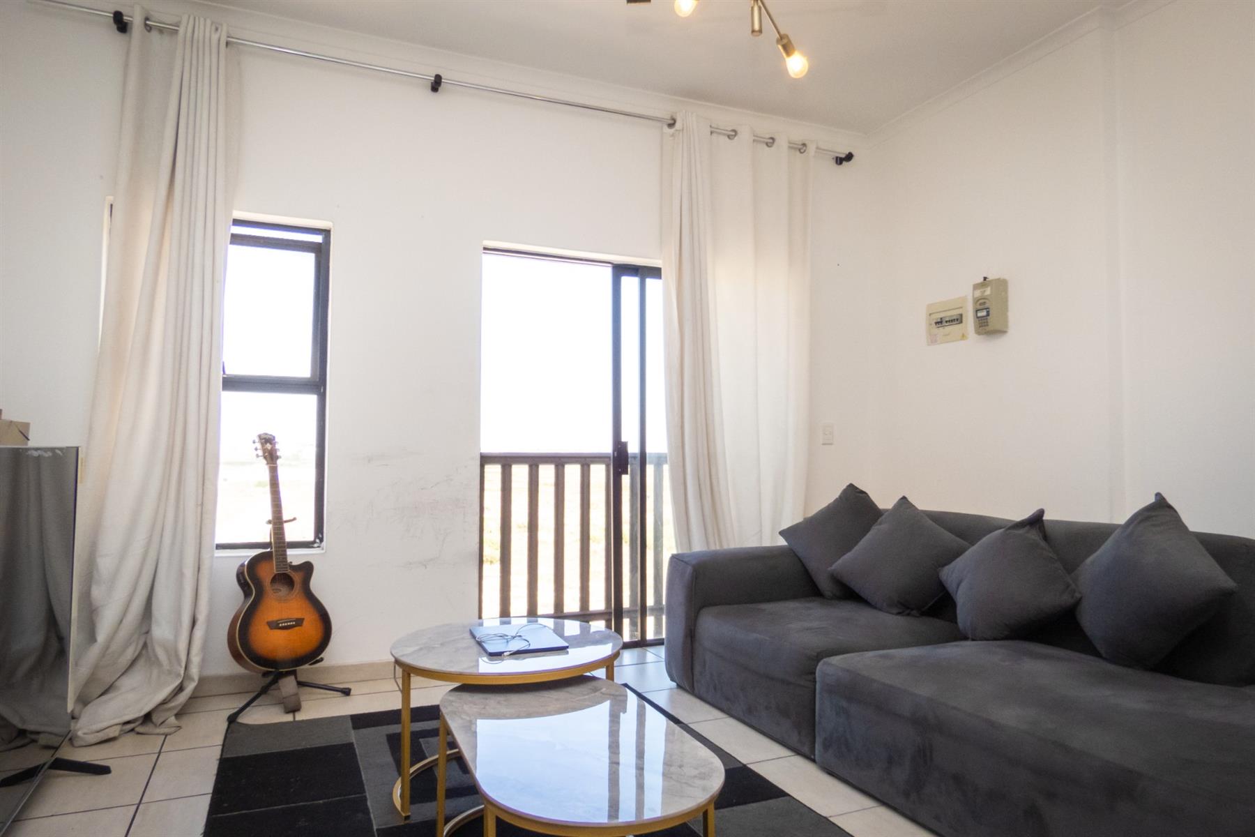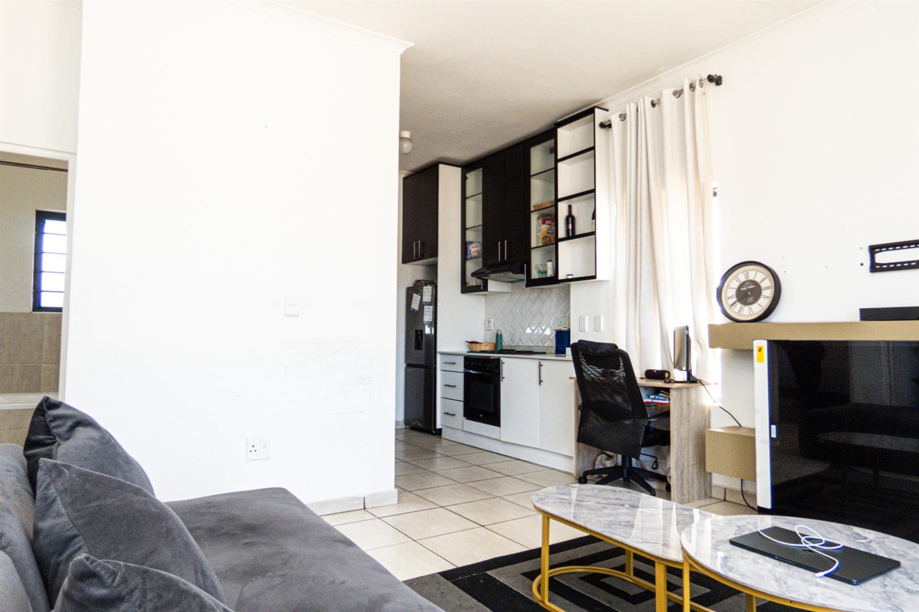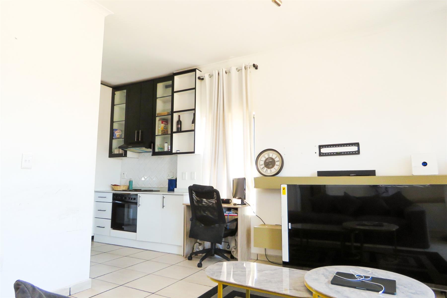The open-plan kitchen flows seamlessly into the lounge area, creating a functional and inviting living space. The kitchen offers ample cupboard and counter space, making meal preparation easy while staying connected to the living area — perfect for modern apartment living.