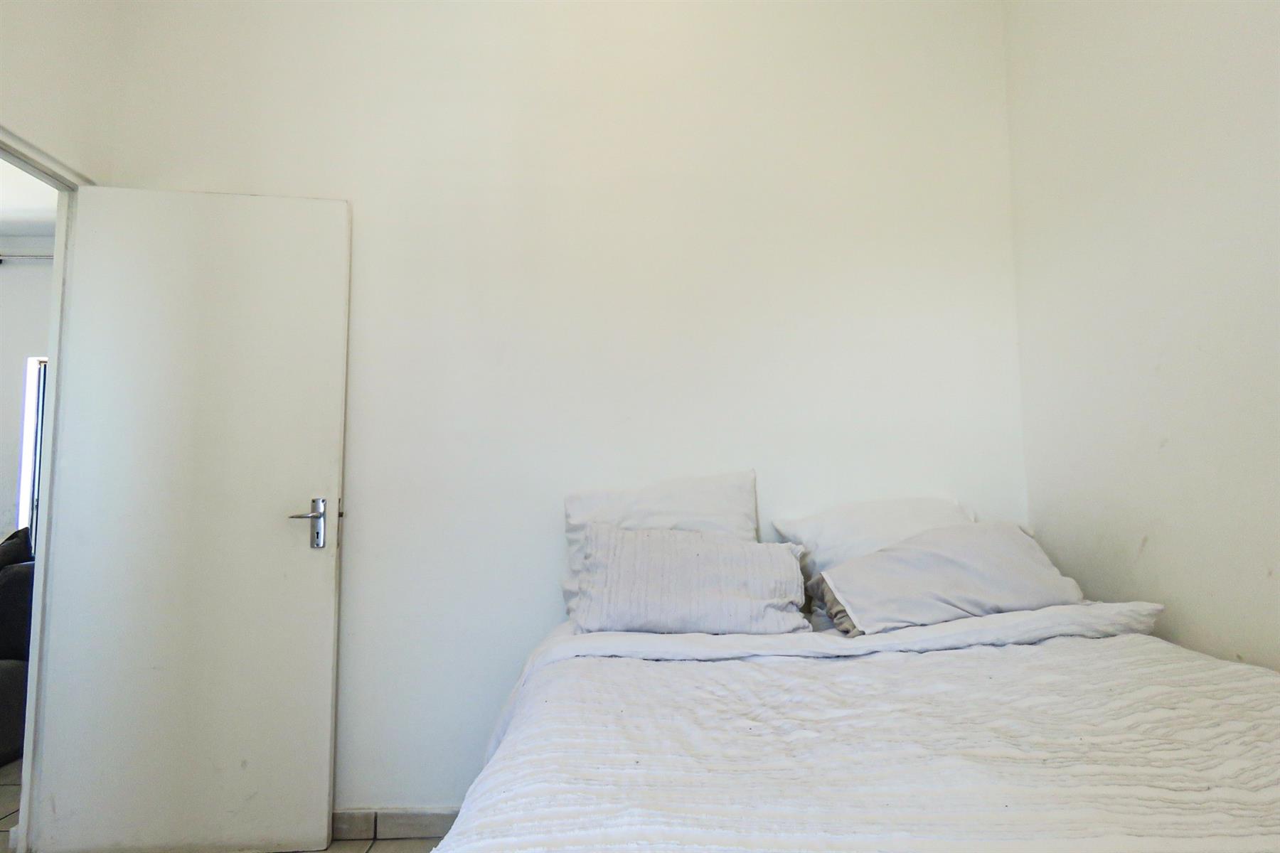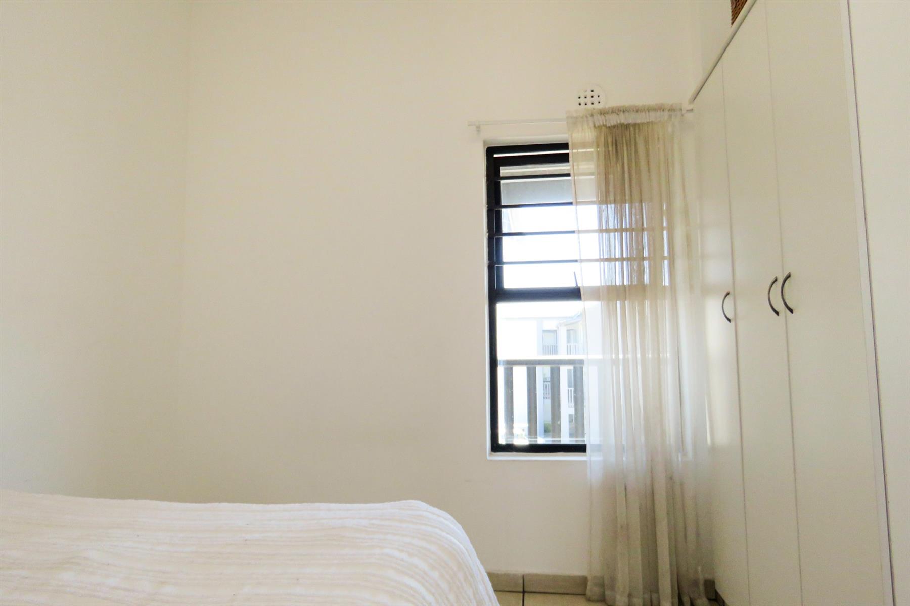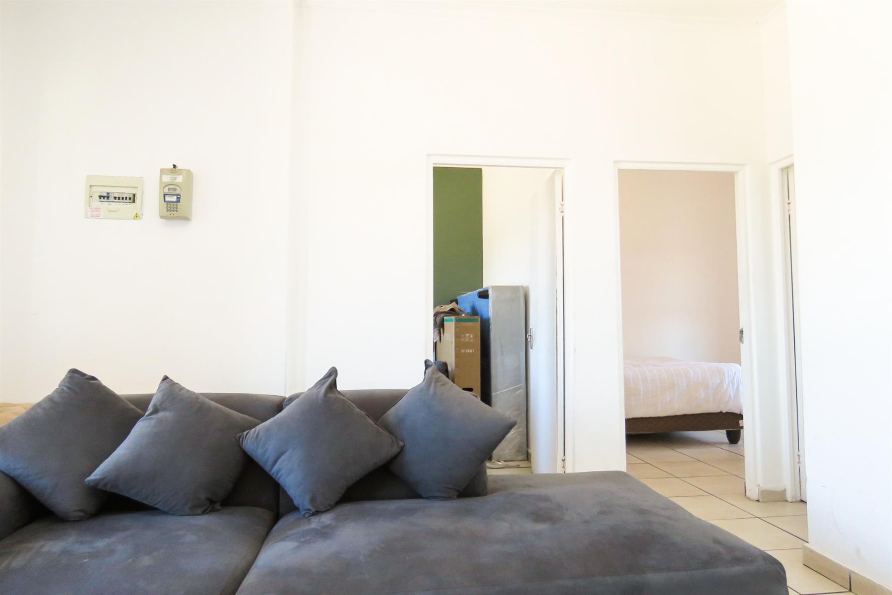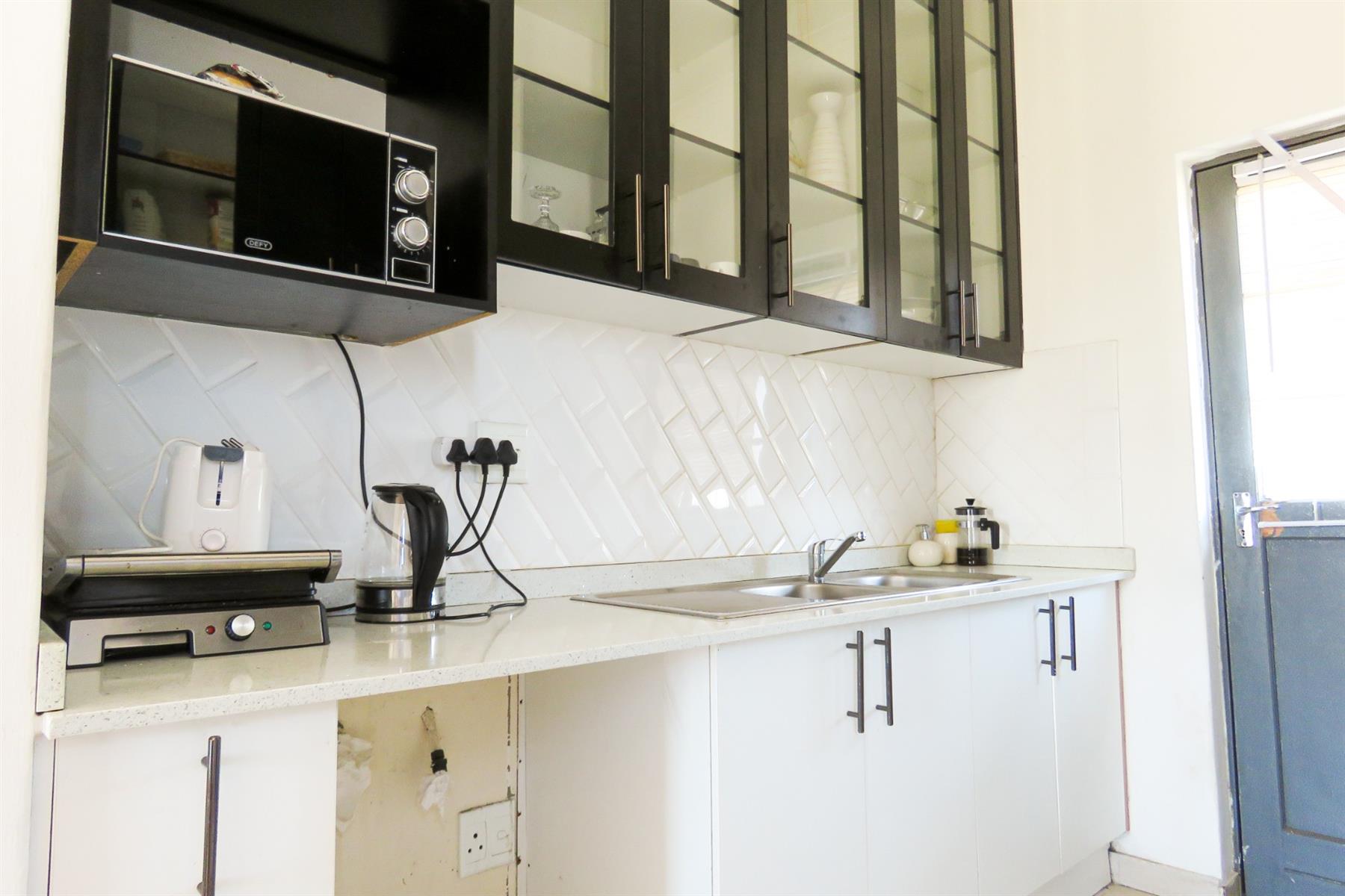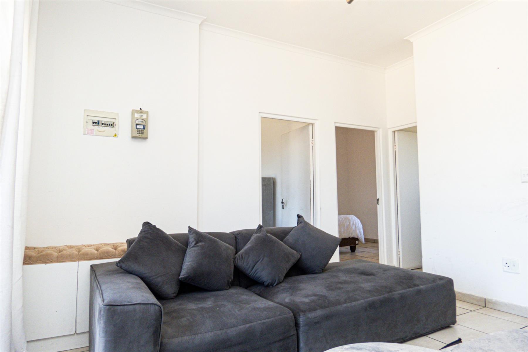 The open-plan kitchen flows seamlessly into the lounge area, creating a functional and inviting living space. The kitchen offers ample cupboard and counter space, making meal preparation easy while staying connected to the living area — perfect for modern apartment living.