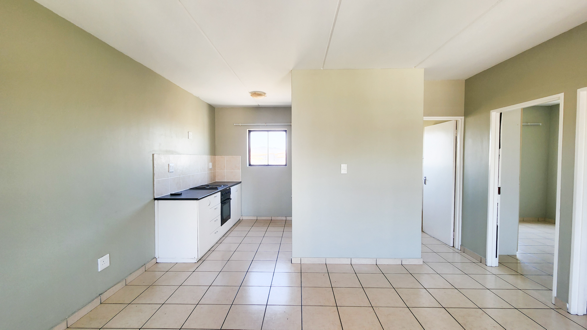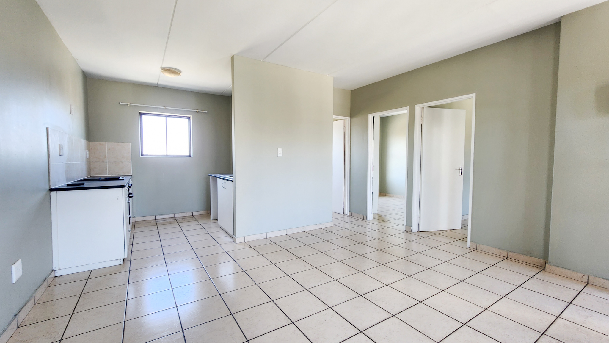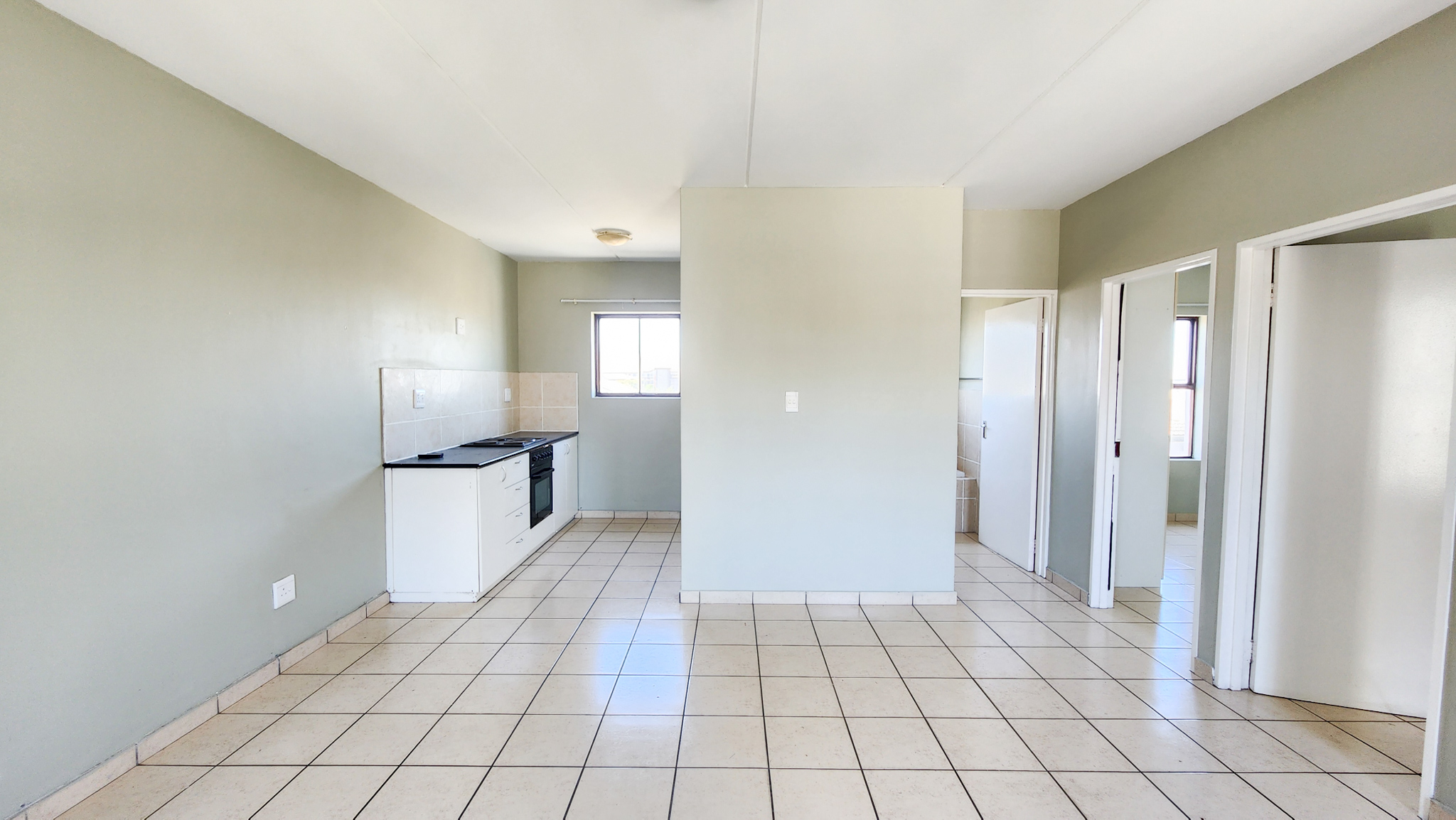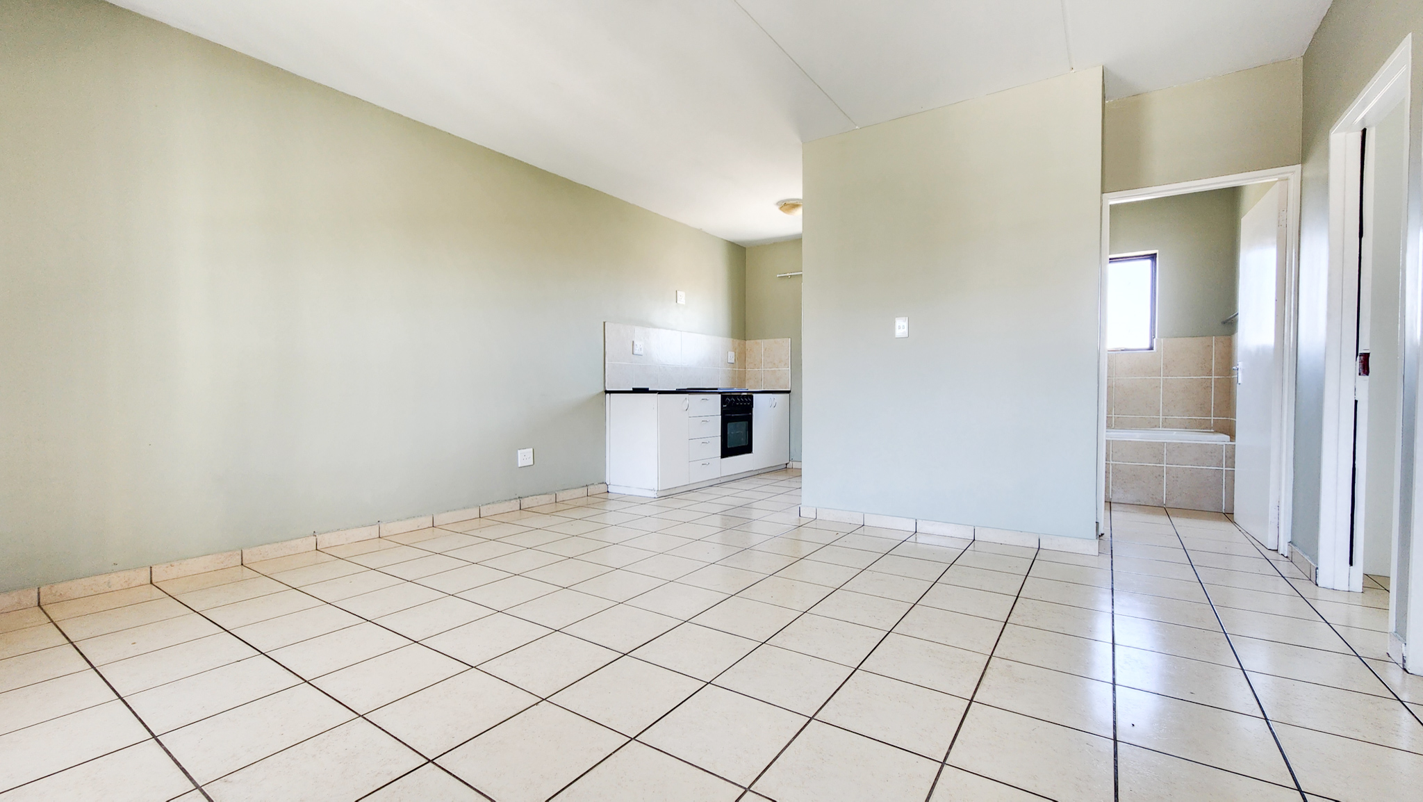 Open tiled living room. Kitchen with one plumbing point. Two sizable bedrooms and one bathroom with shower over bath.