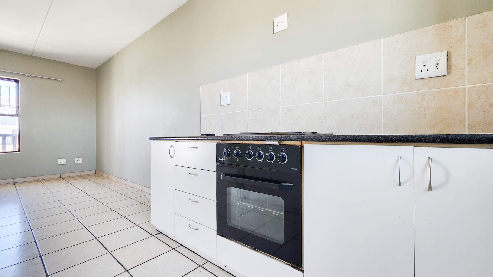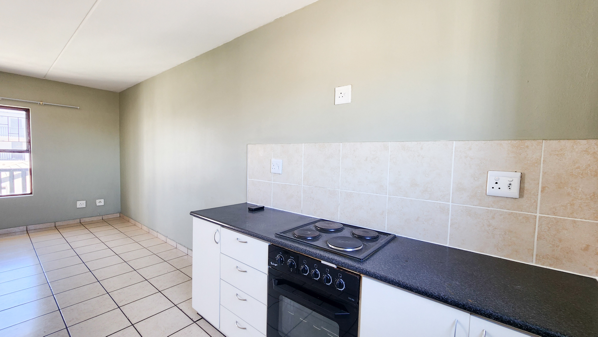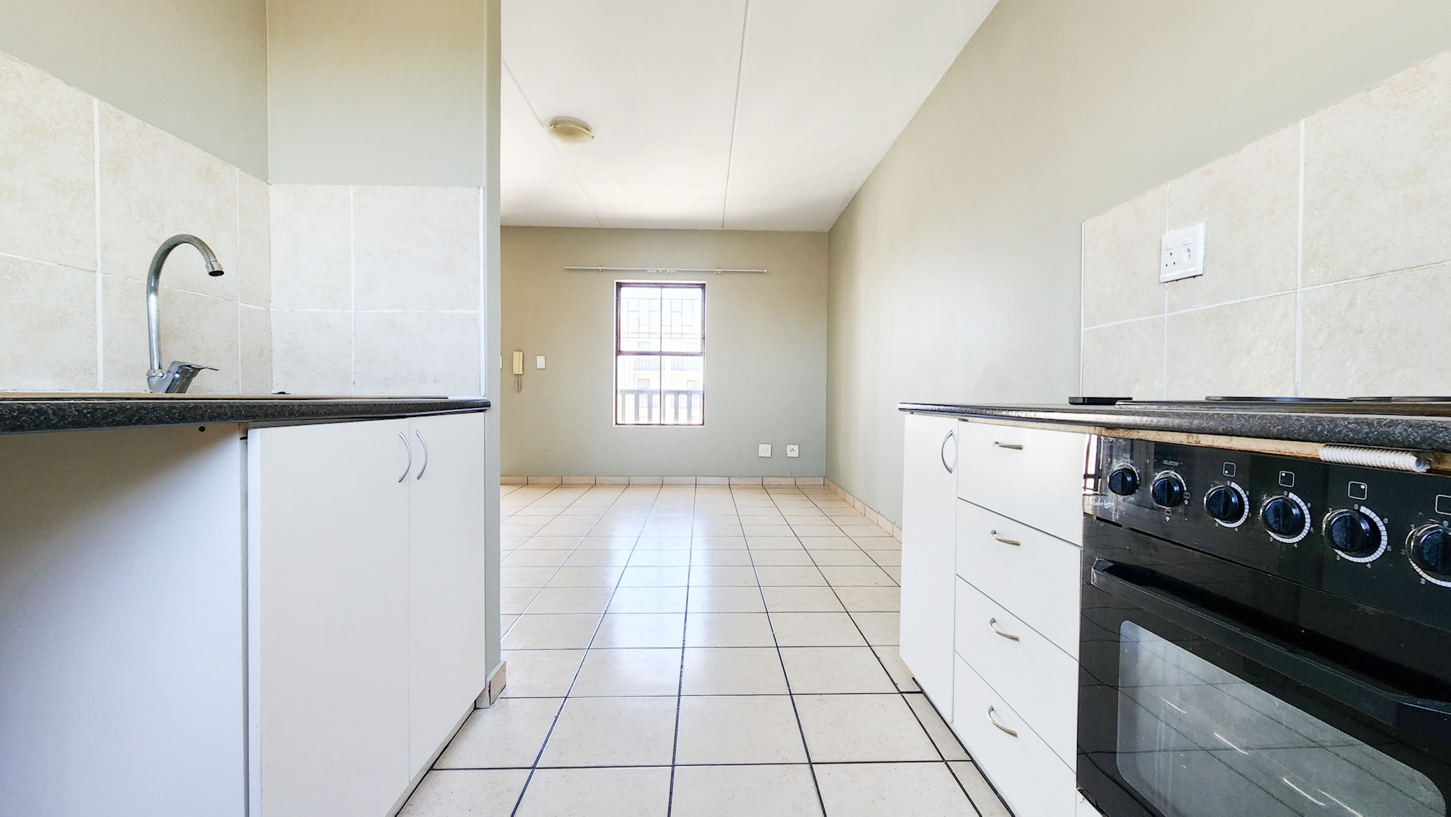 Open tiled living room. Kitchen with one plumbing point. Two sizable bedrooms and one bathroom with shower over bath.