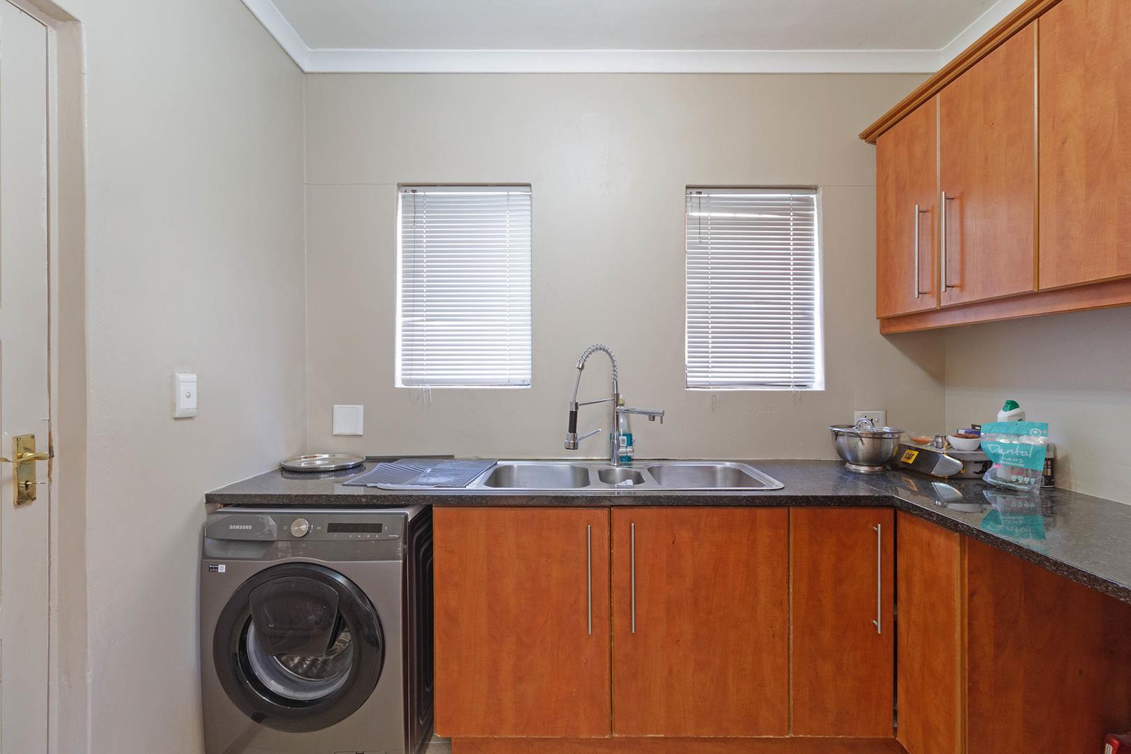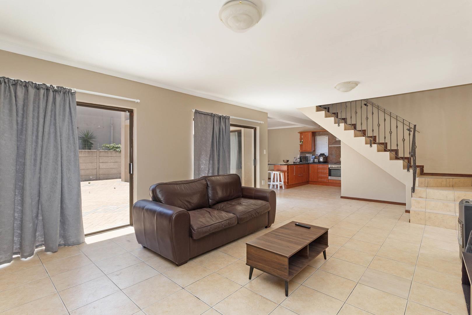 Sliding doors from the lounge and dining room steps onto a covered patio and braai area with large paved open back area for convenience and low maintenance.