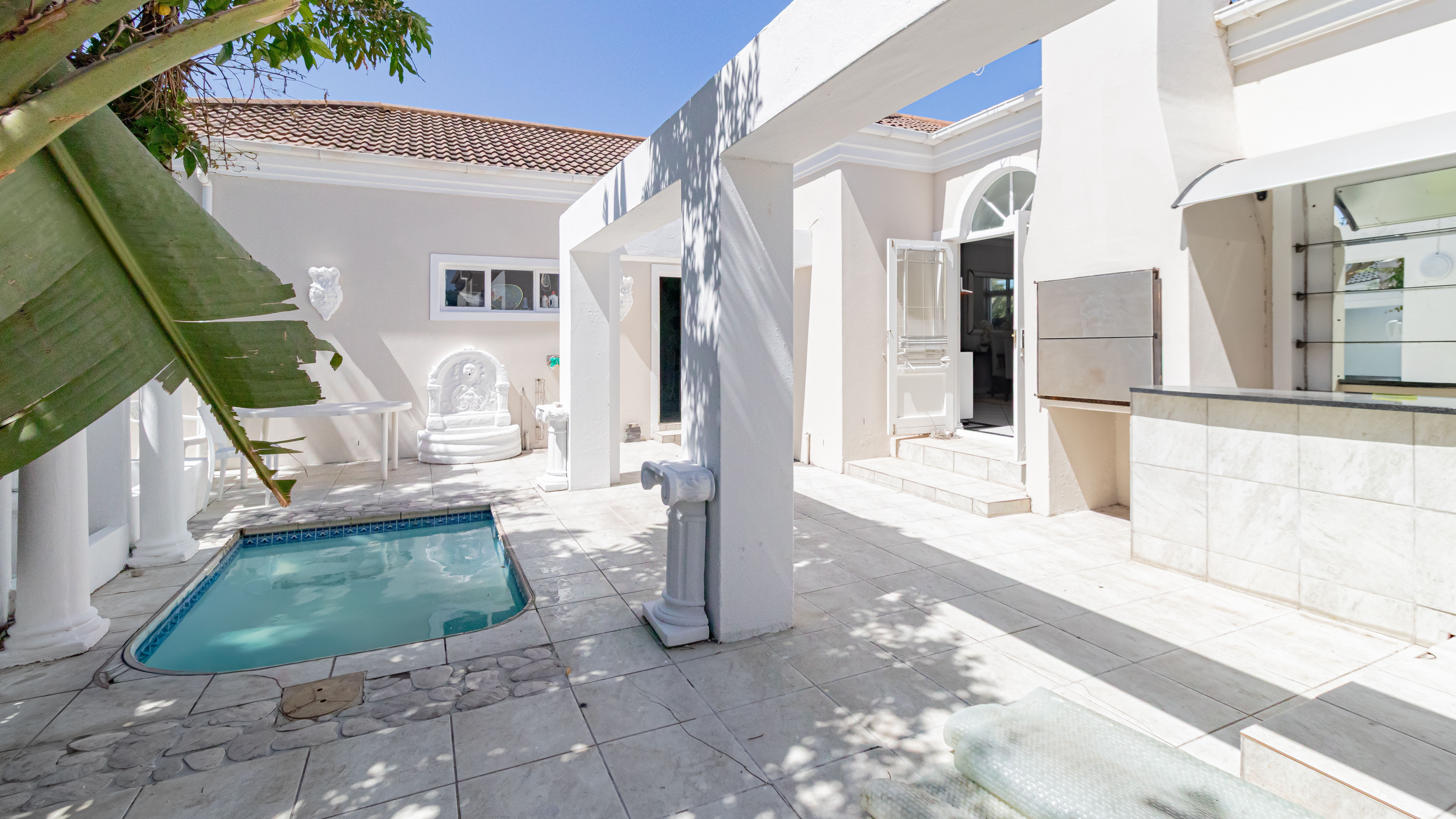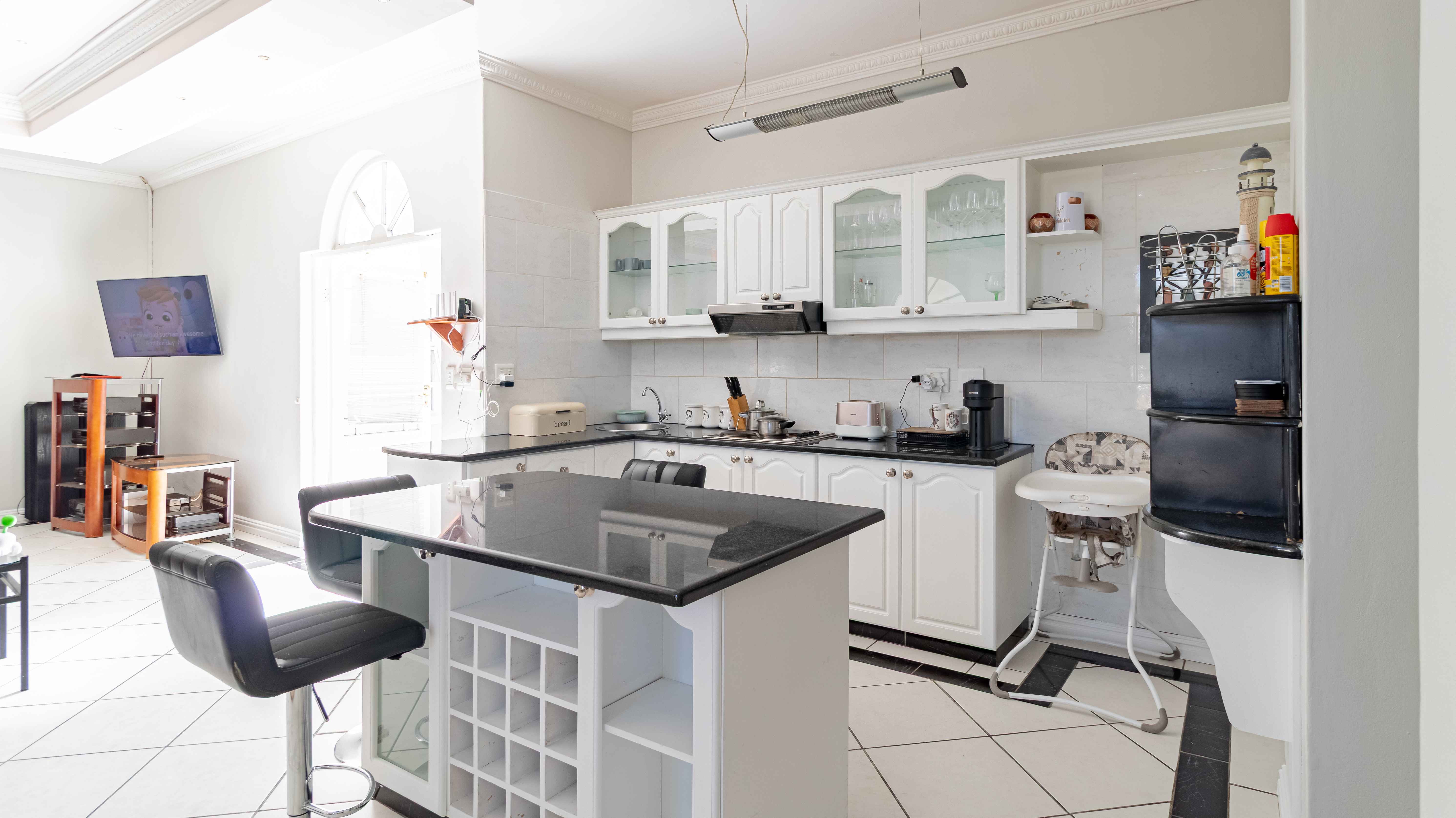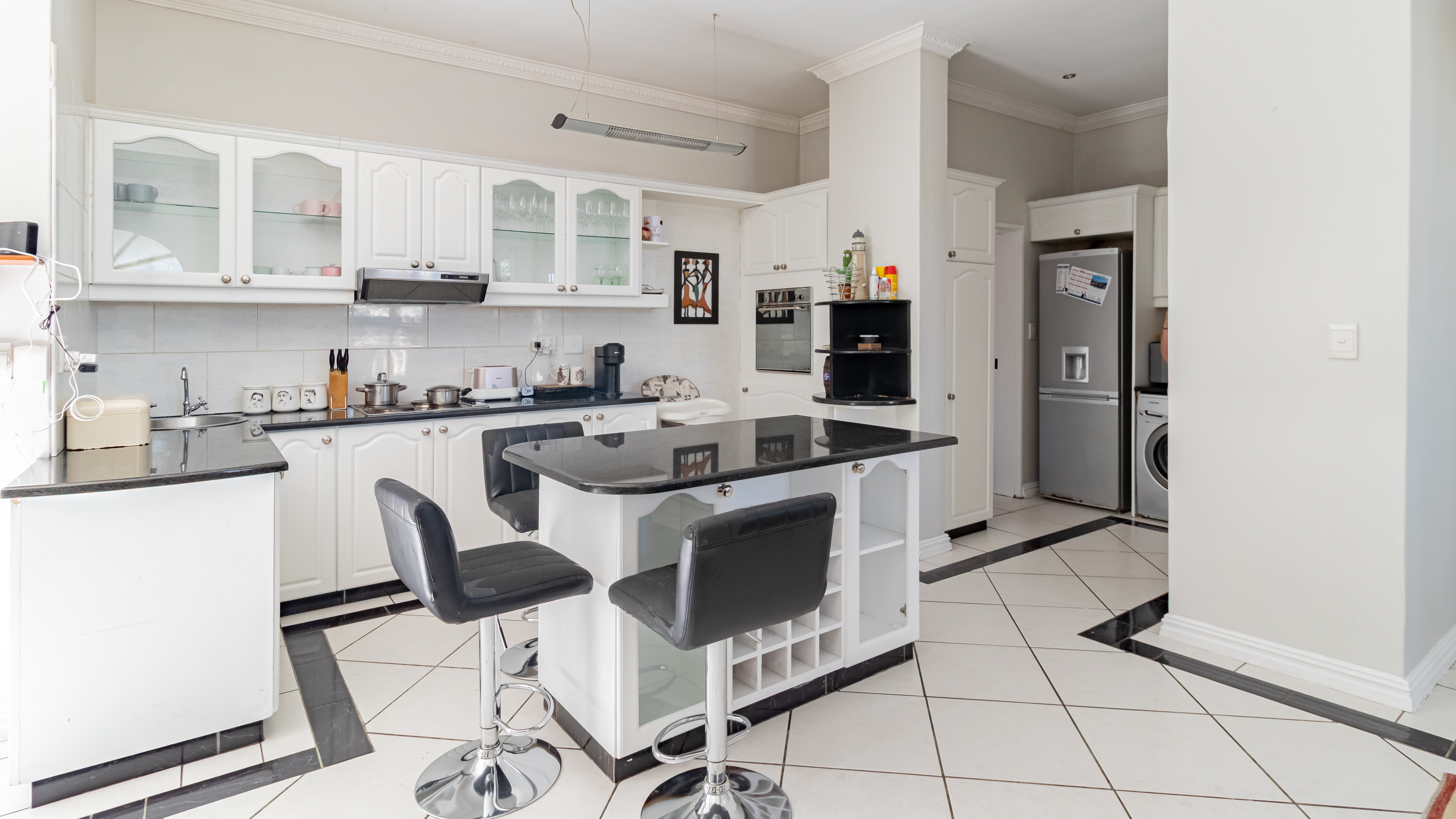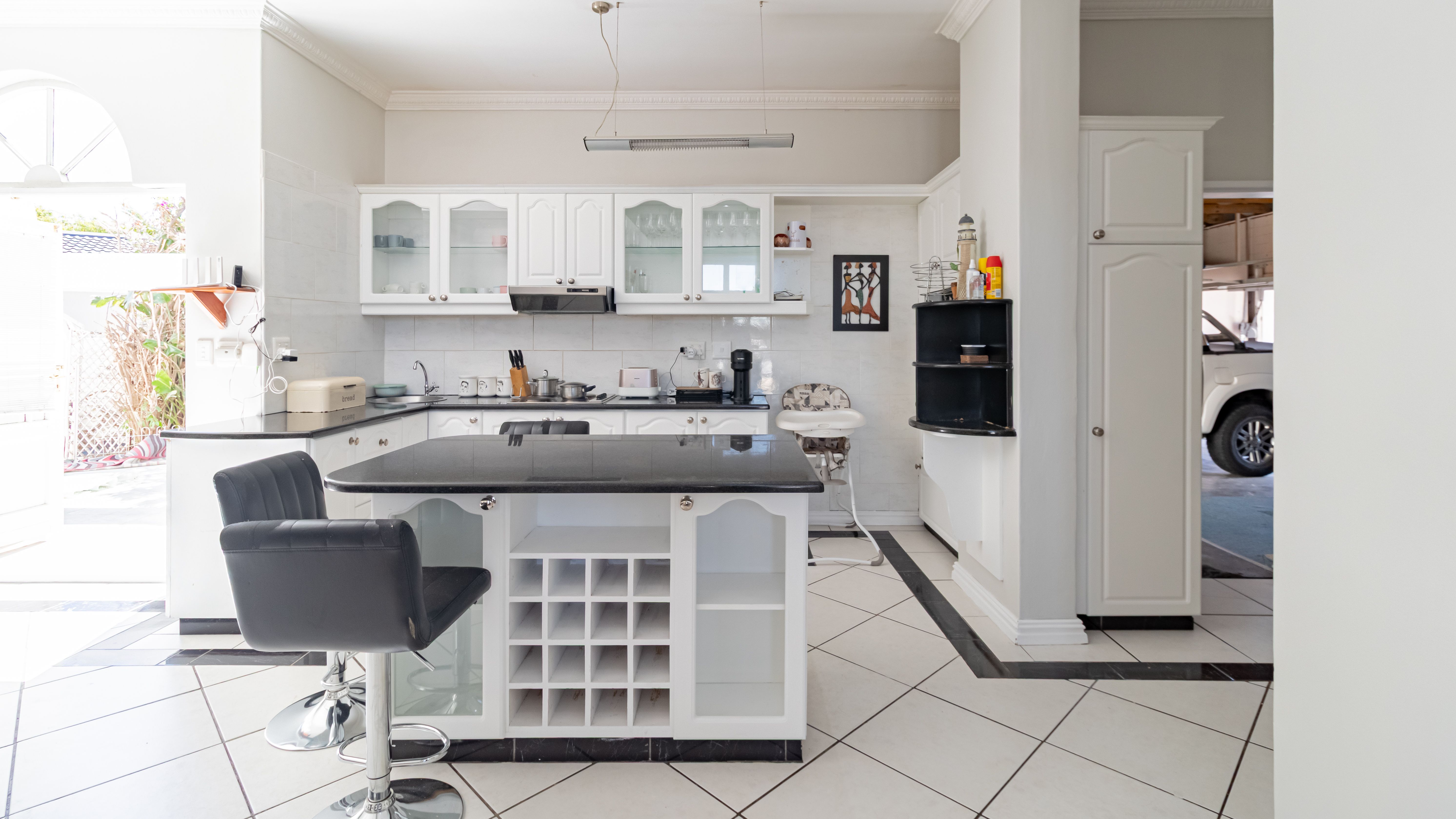 The spacious open-plan living area flows effortlessly to a private outdoor entertainment space featuring a built-in braai, bar area, and splash pool — ideal for relaxed weekends and gatherings with friends. The kitchen is neat and well-designed, complete with a centre island and separate scullery.