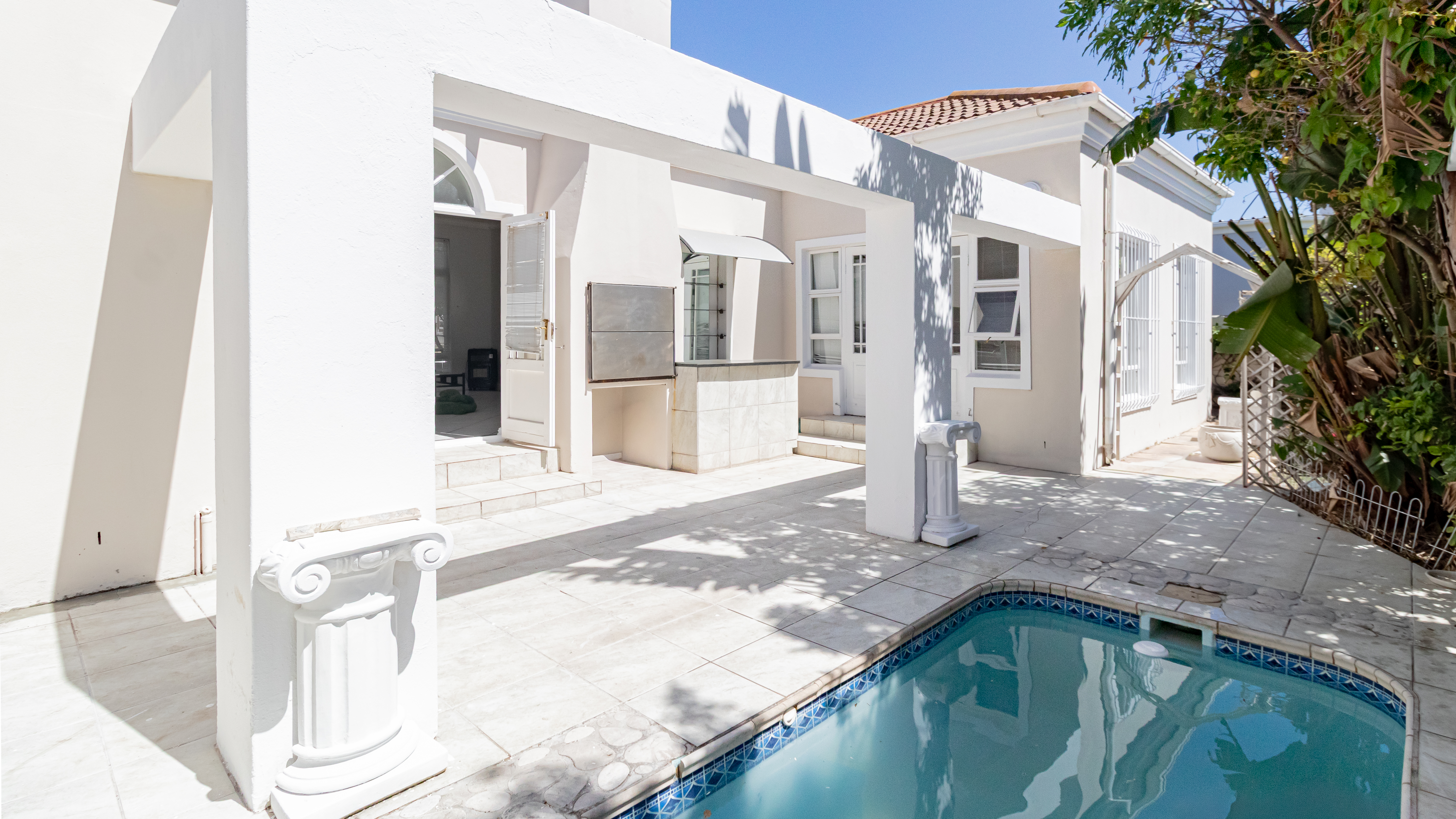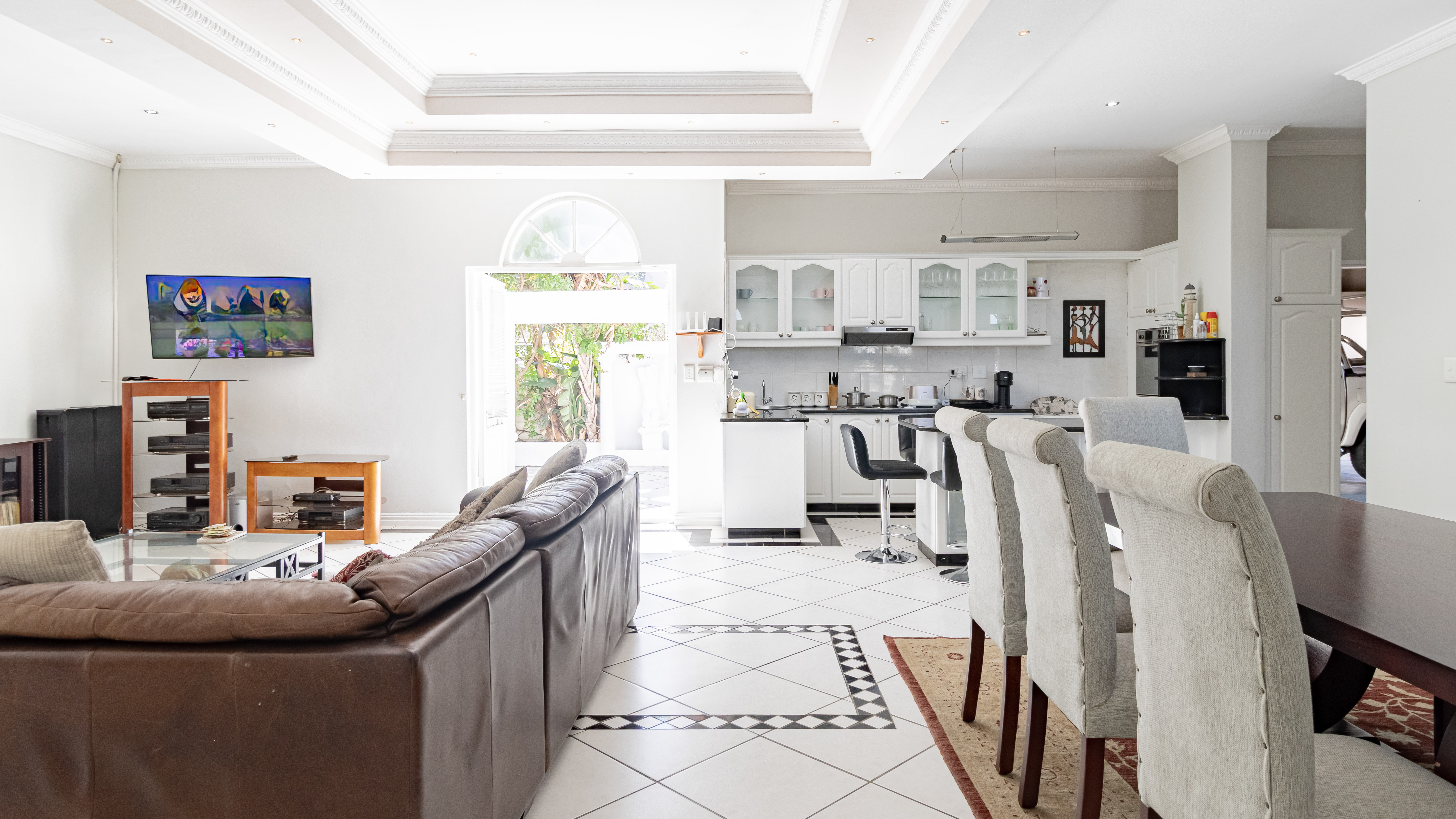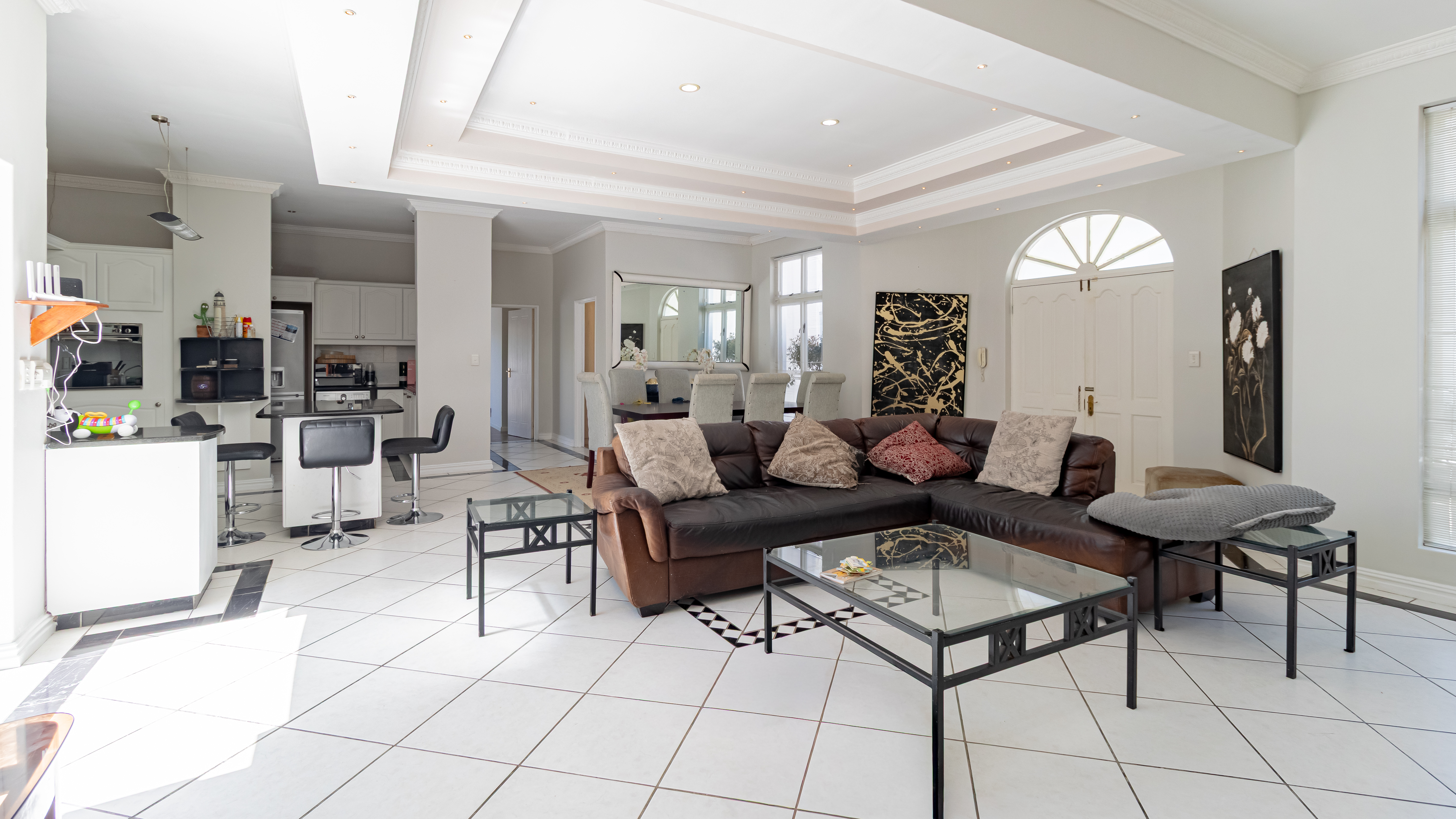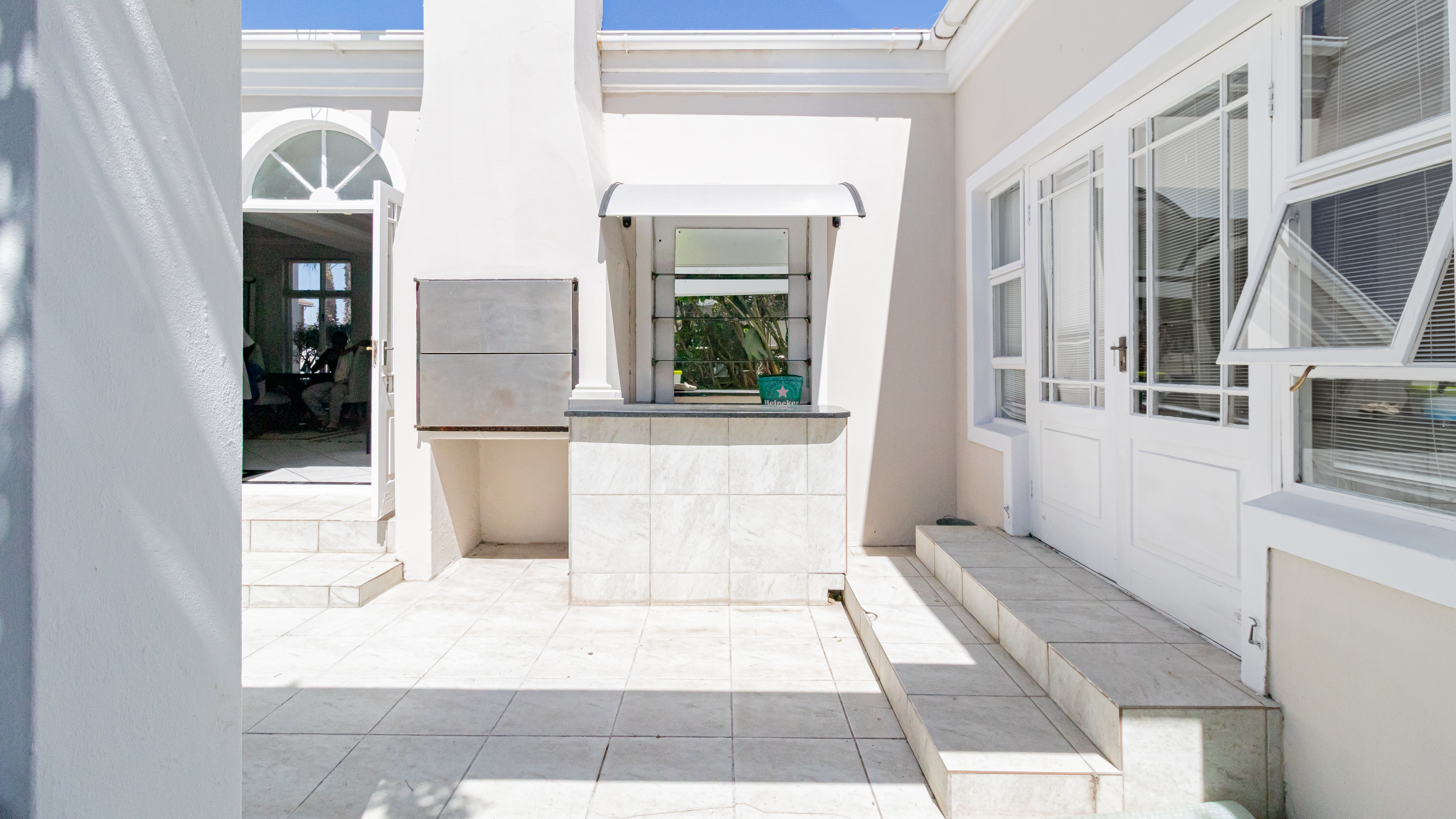 The spacious open-plan living area flows effortlessly to a private outdoor entertainment space featuring a built-in braai, bar area, and splash pool — ideal for relaxed weekends and gatherings with friends. The kitchen is neat and well-designed, complete with a centre island and separate scullery.