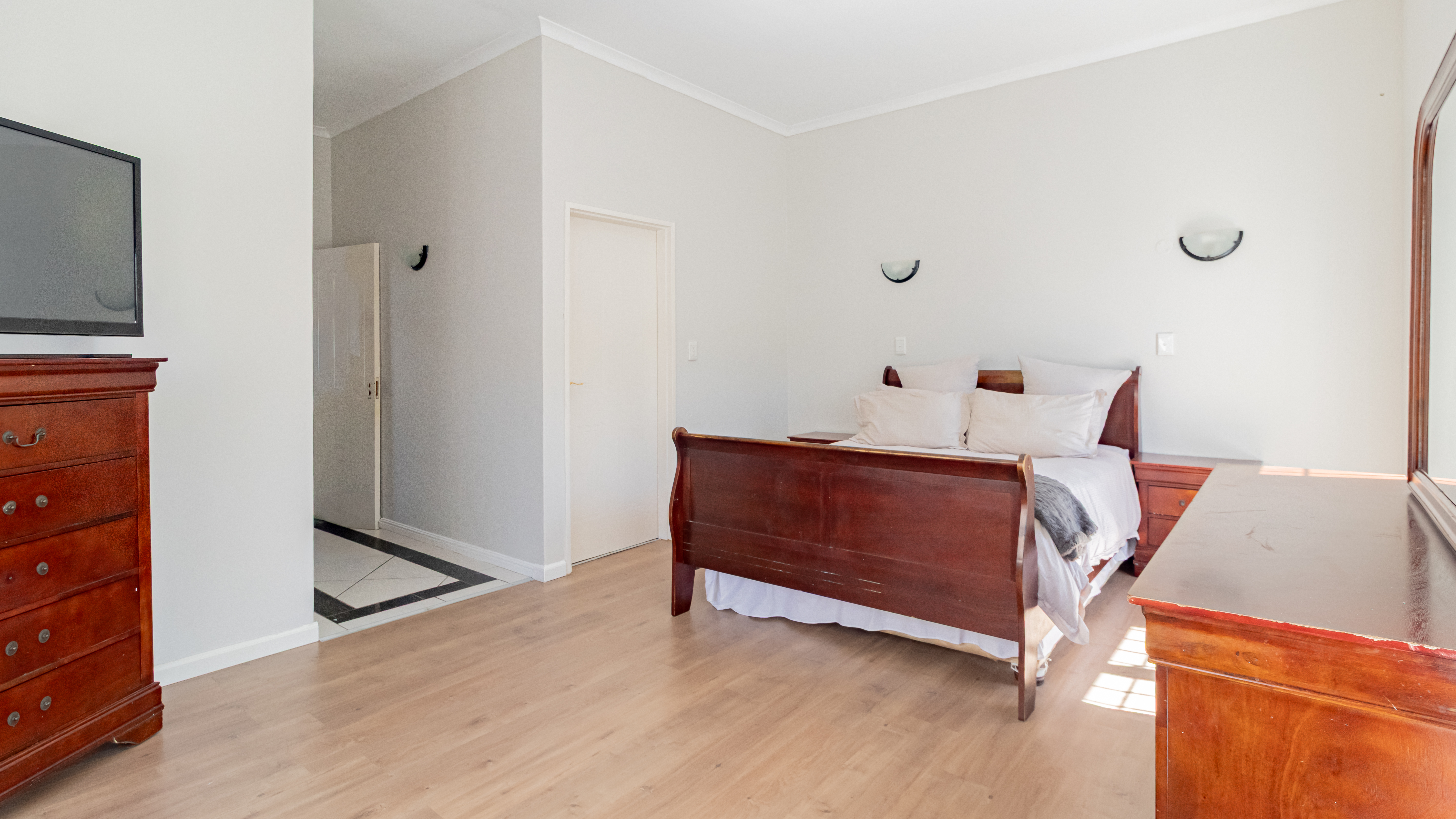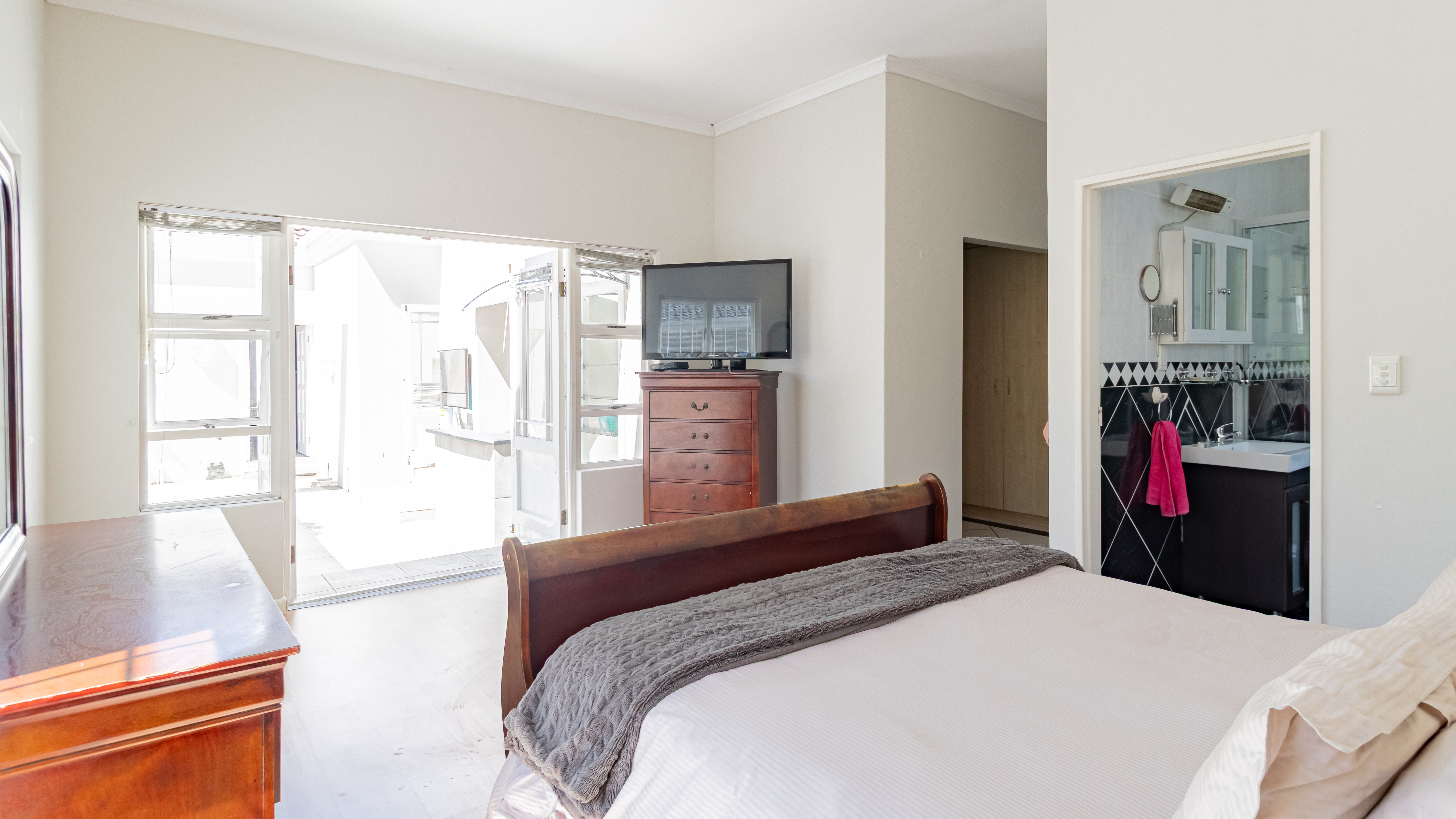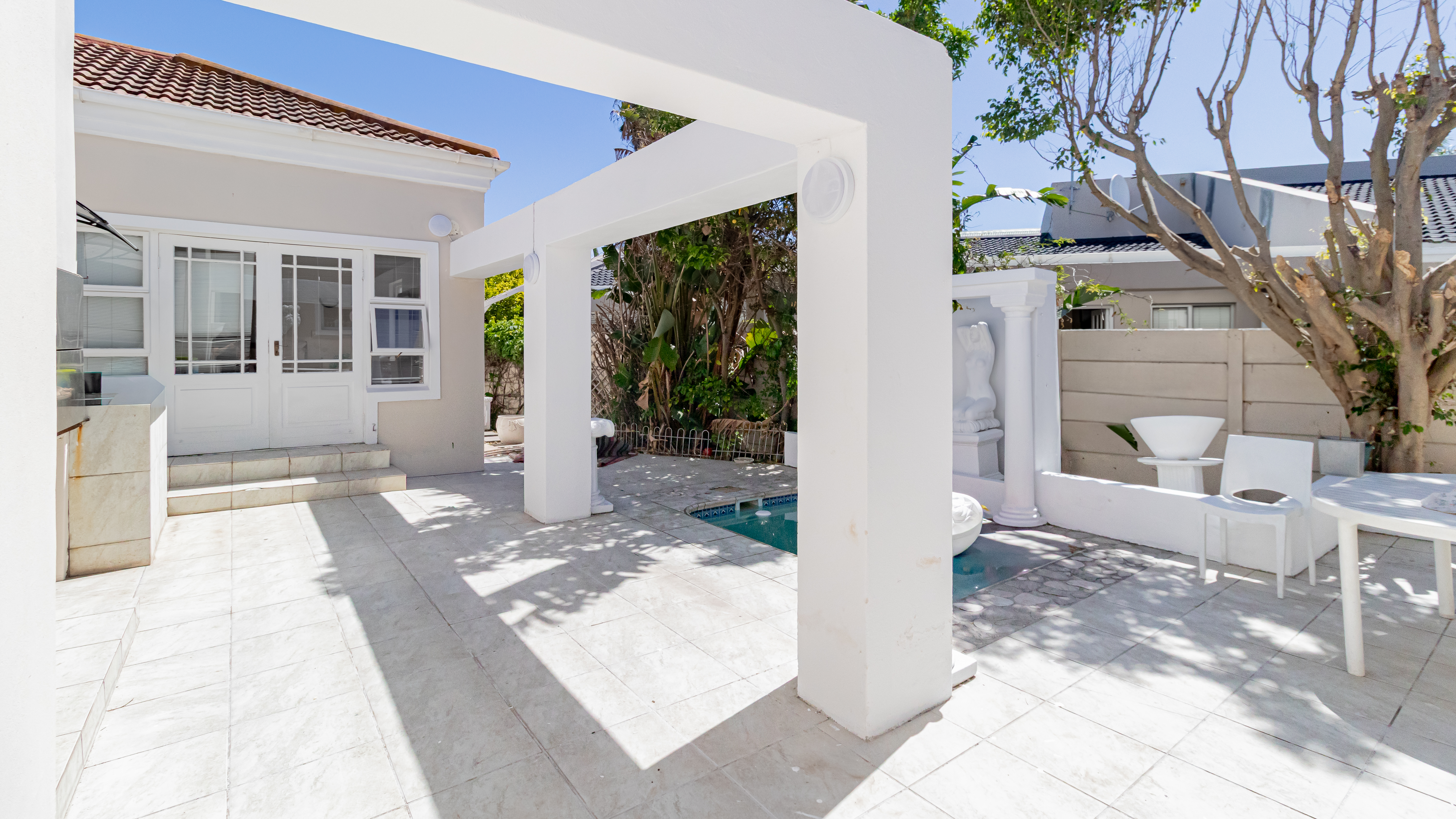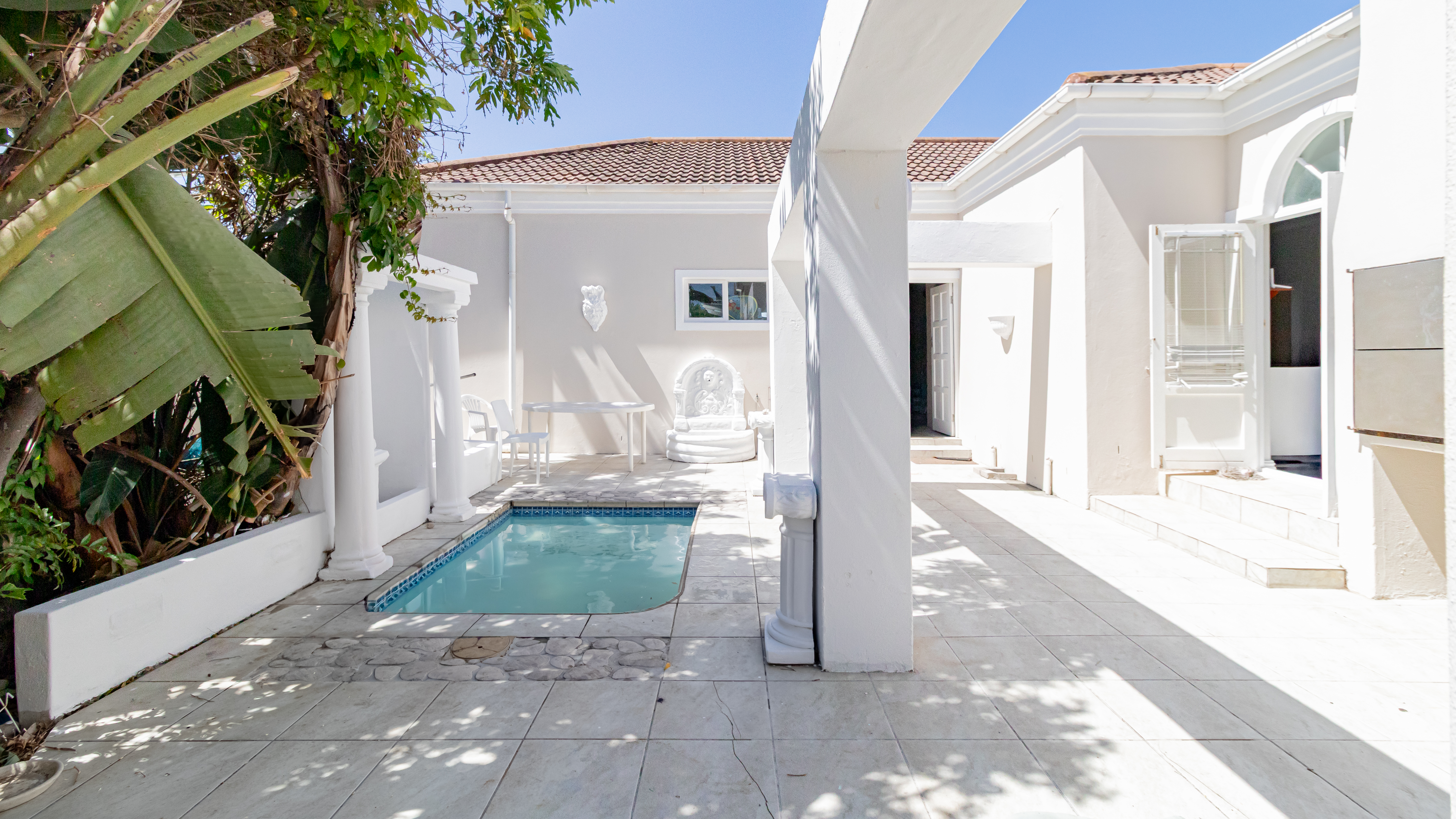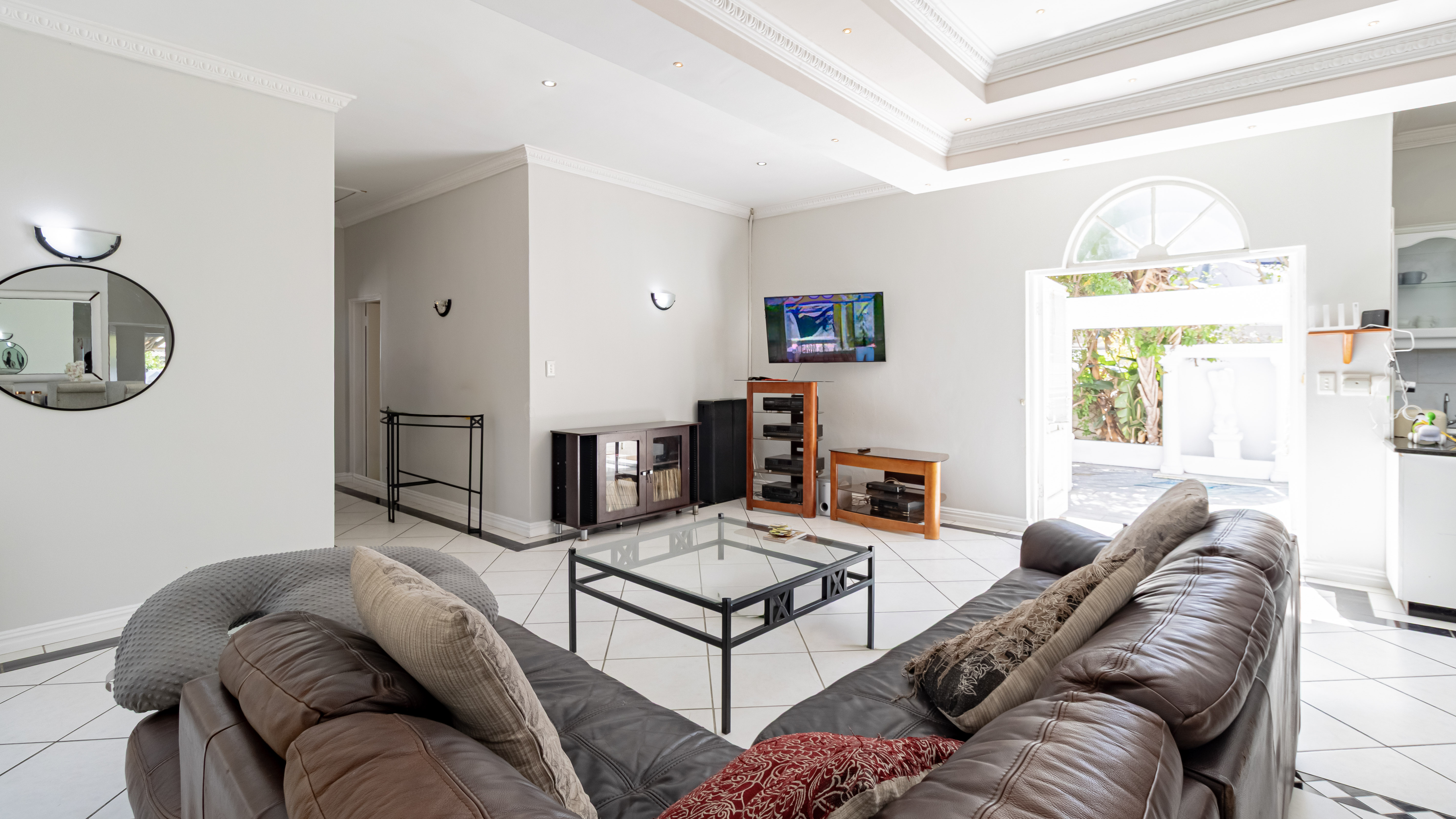 The spacious open-plan living area flows effortlessly to a private outdoor entertainment space featuring a built-in braai, bar area, and splash pool — ideal for relaxed weekends and gatherings with friends. The kitchen is neat and well-designed, complete with a centre island and separate scullery.