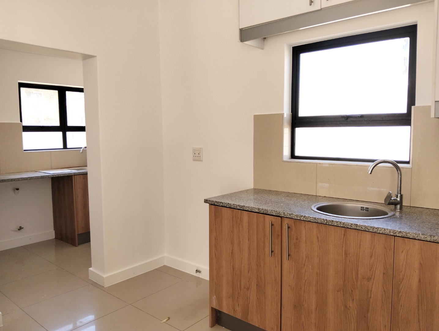 The modern kitchen features a two-tone design with warm wood-look base cabinets, crisp white upper units, and granite countertops. Enjoy a gas hob, integrated appliances, and designer pendant lighting in the open-plan layout. The indoor entertainment area includes a built-in braai with custom shelving and direct garden access via sliding doors.