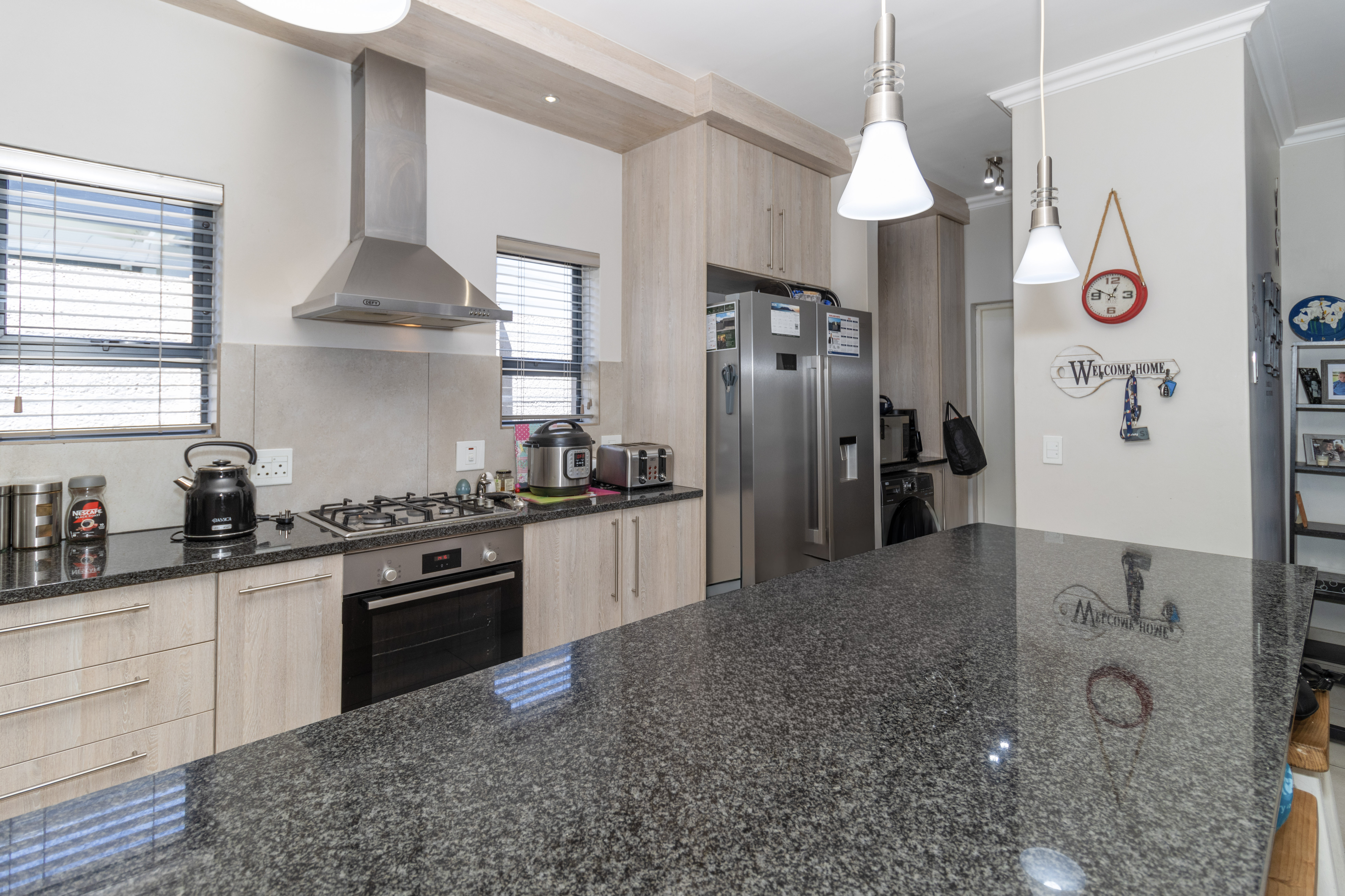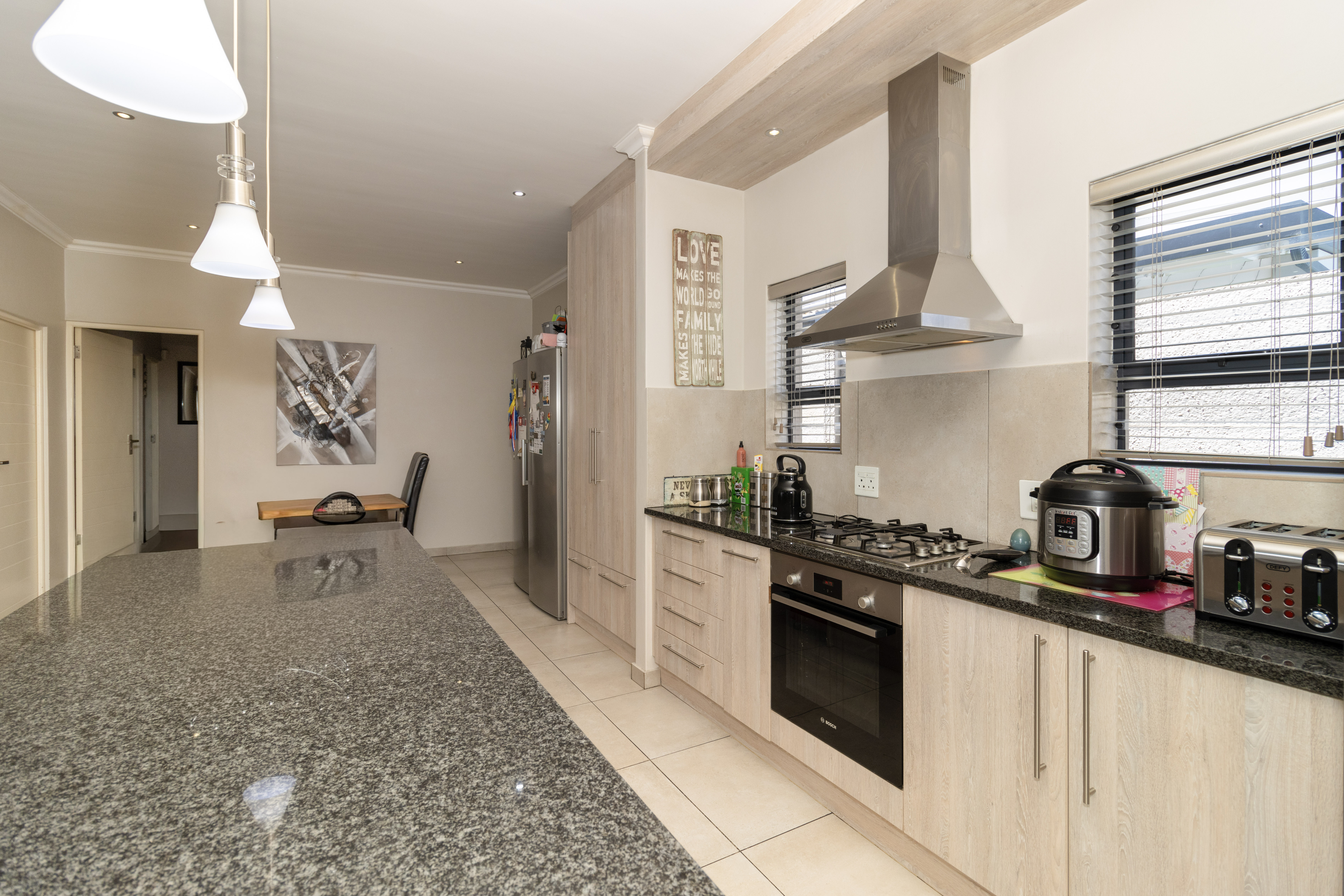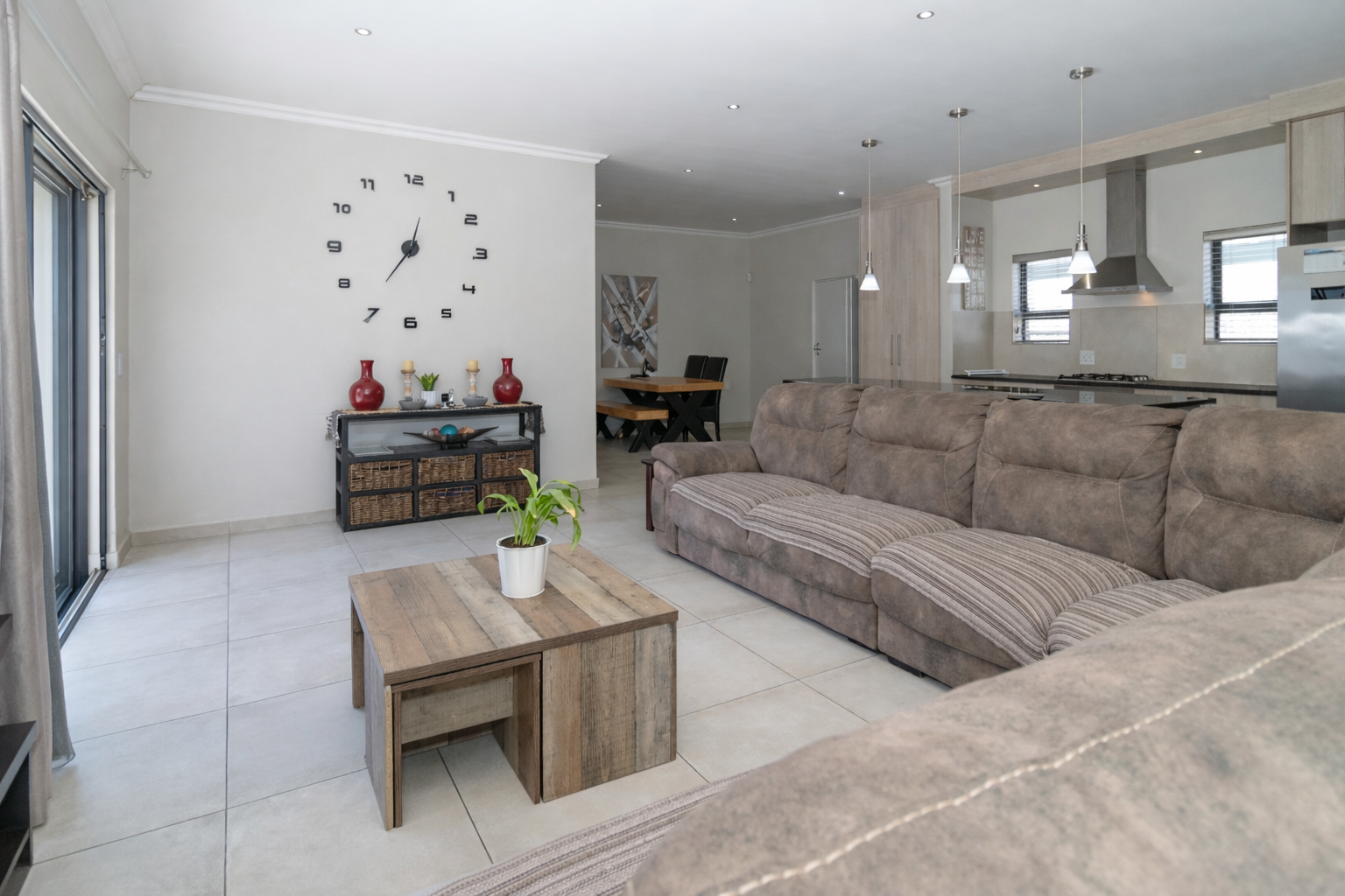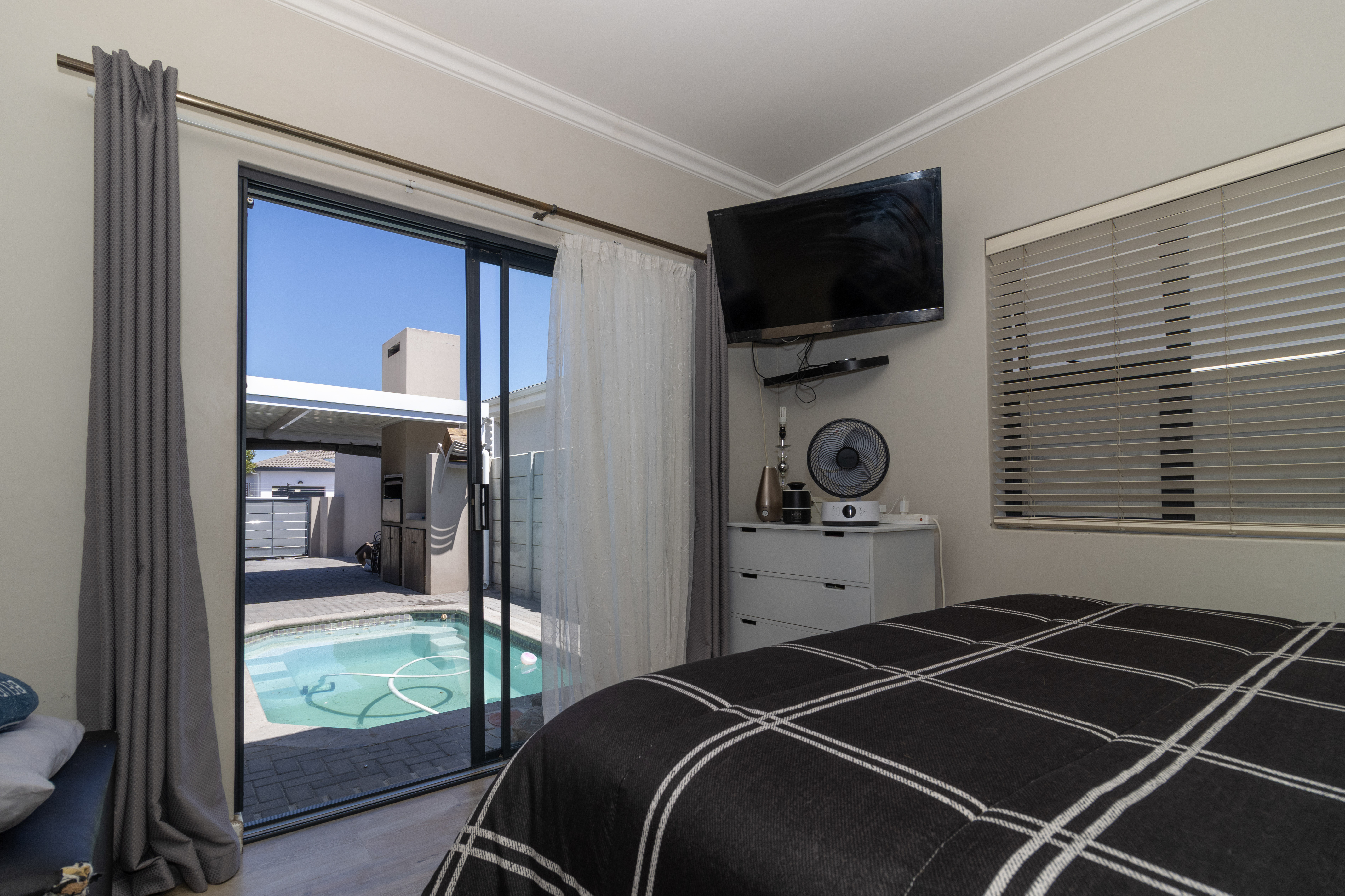 The home welcomes you with generous open-plan living designed for easy flow and everyday living. The spacious kitchen is the heart of the home, fitted with ample cupboards, a large centre island perfect for gathering around, and a separate scullery to keep things neat and organised. It opens seamlessly into the lounge and dining area, where sliding doors lead out to a covered braai patio and sparkling swimming pool — ideal for entertaining or relaxed weekends at home.