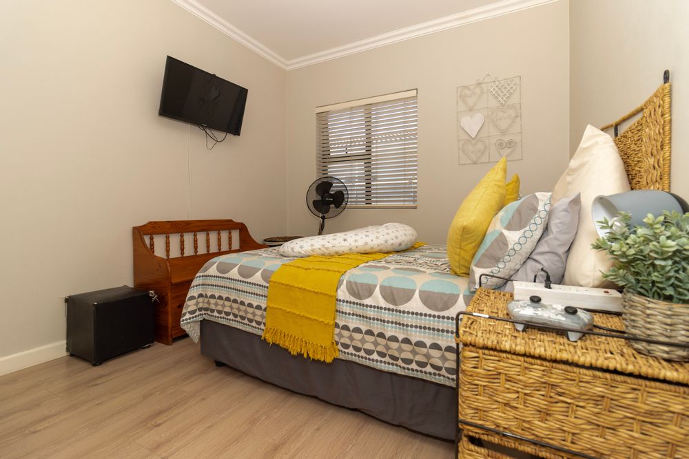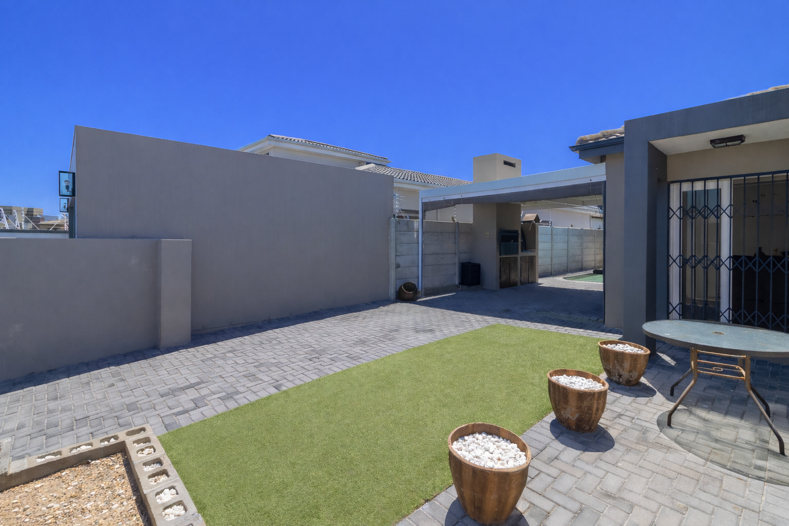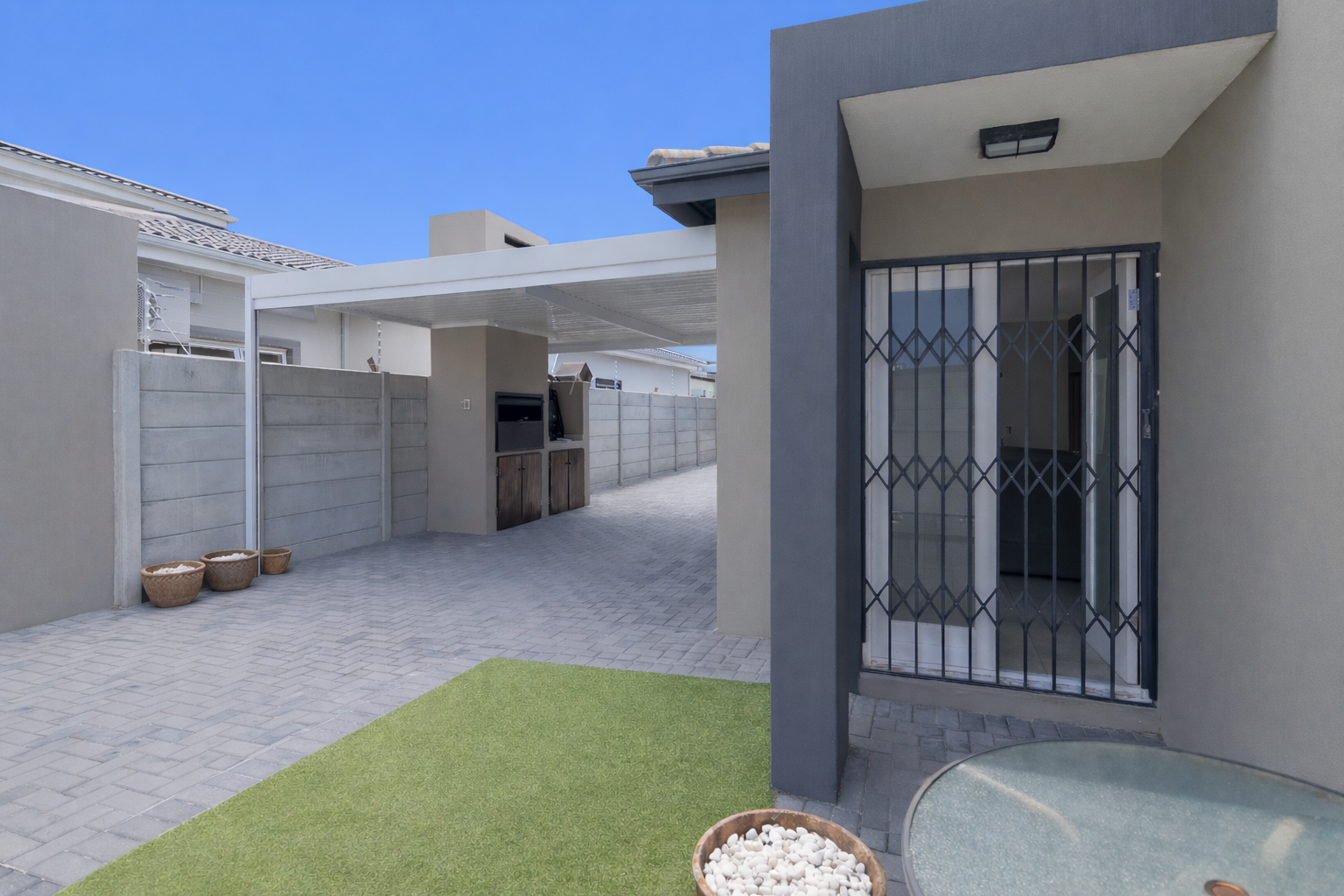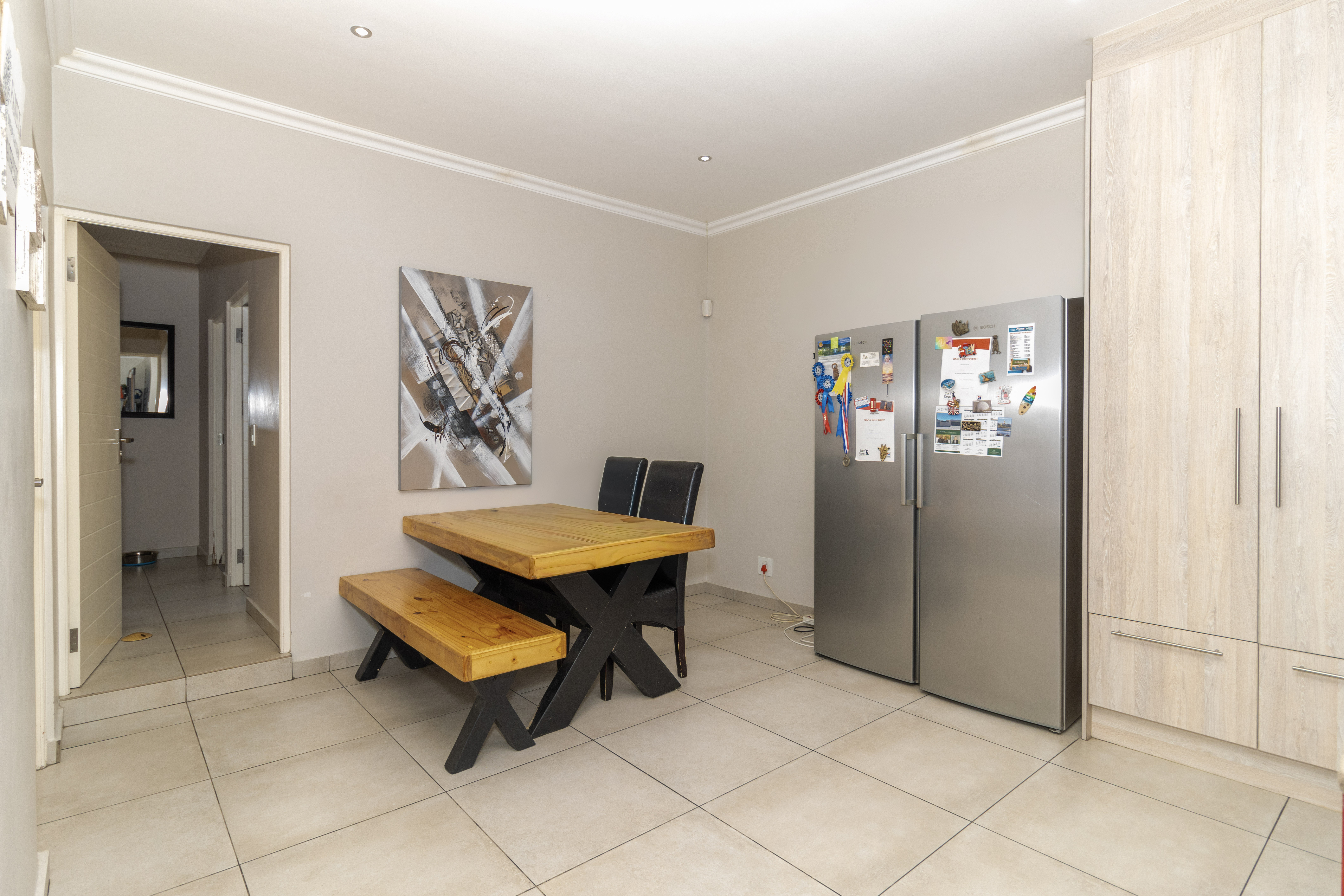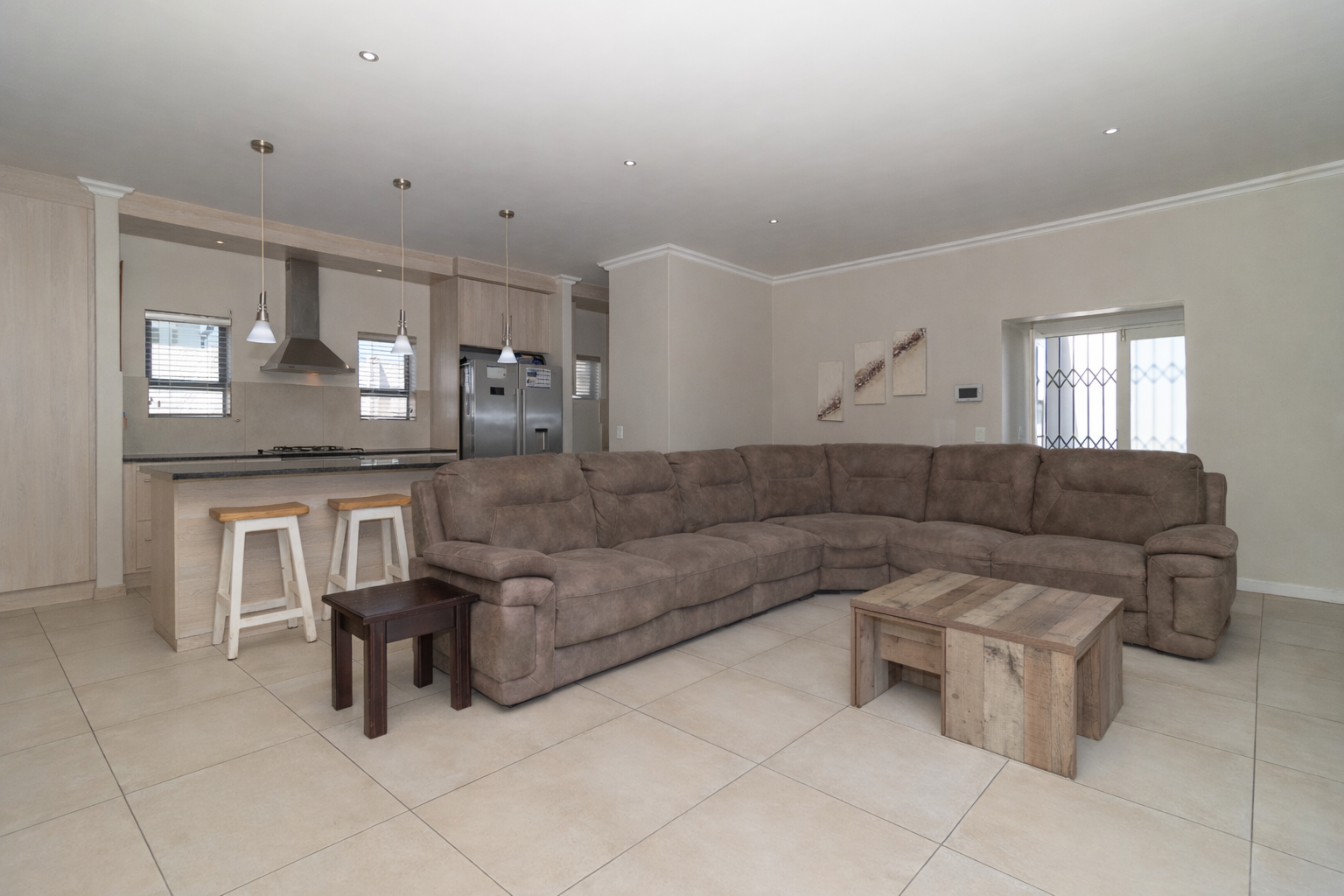 The home welcomes you with generous open-plan living designed for easy flow and everyday living. The spacious kitchen is the heart of the home, fitted with ample cupboards, a large centre island perfect for gathering around, and a separate scullery to keep things neat and organised. It opens seamlessly into the lounge and dining area, where sliding doors lead out to a covered braai patio and sparkling swimming pool — ideal for entertaining or relaxed weekends at home.