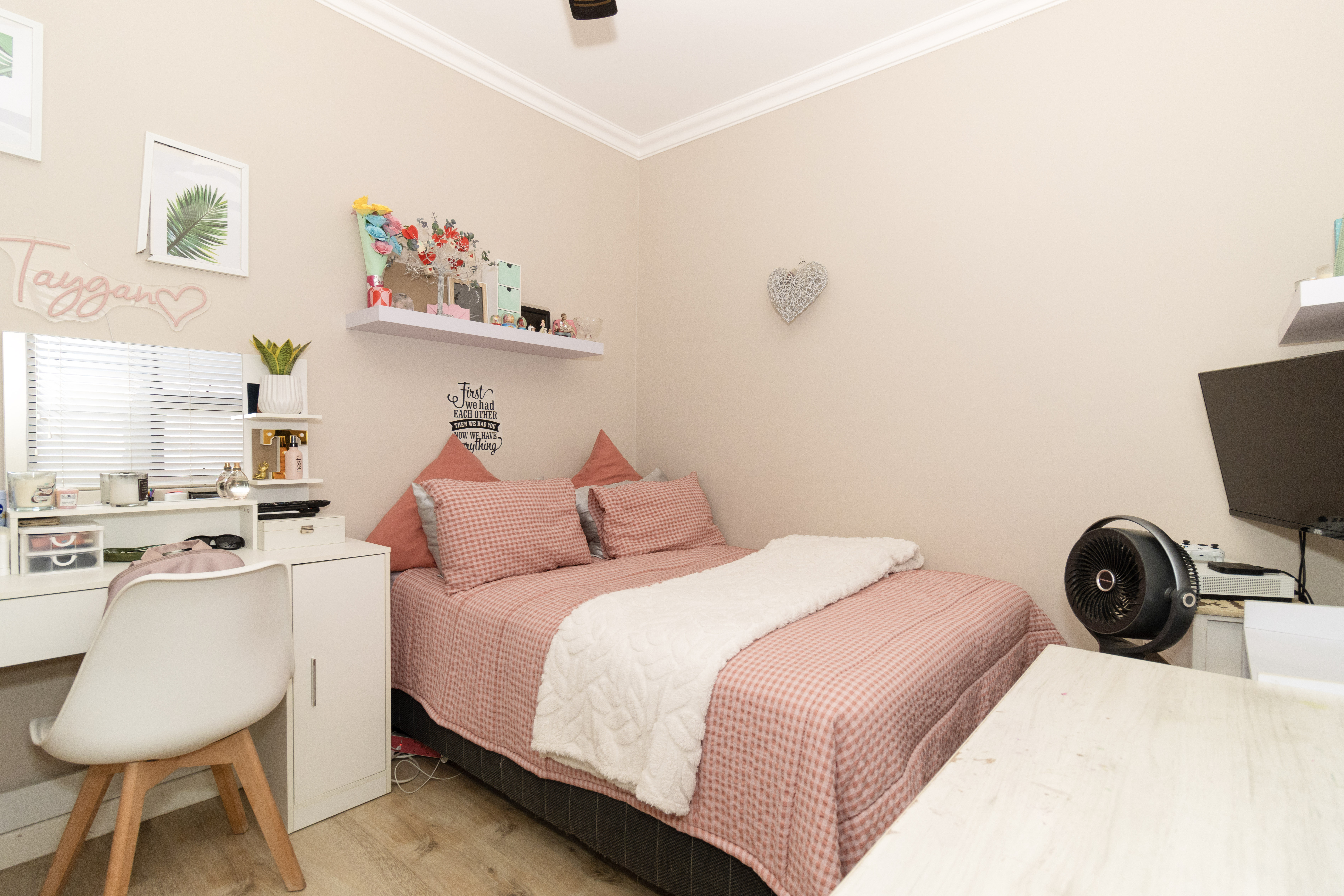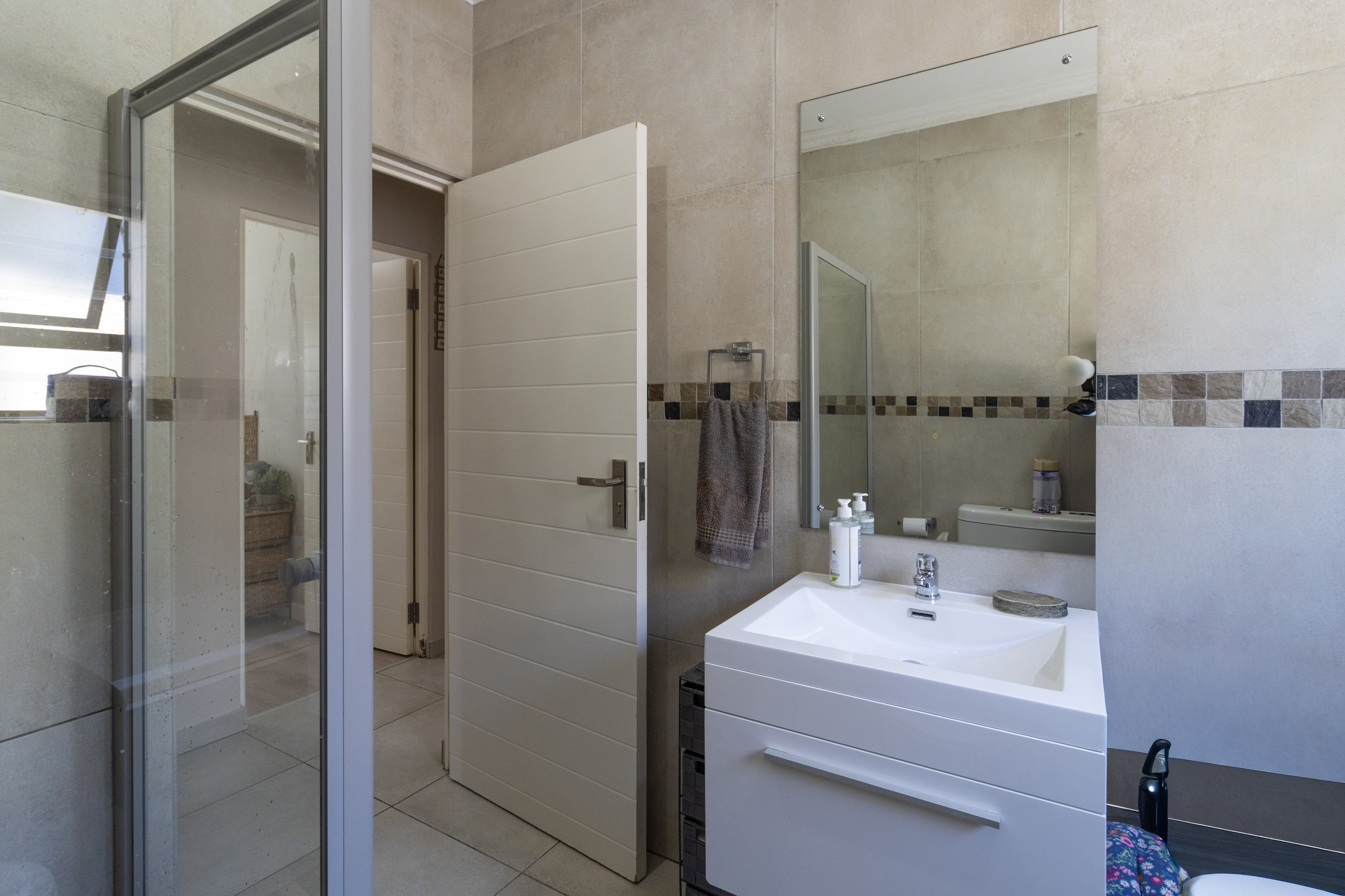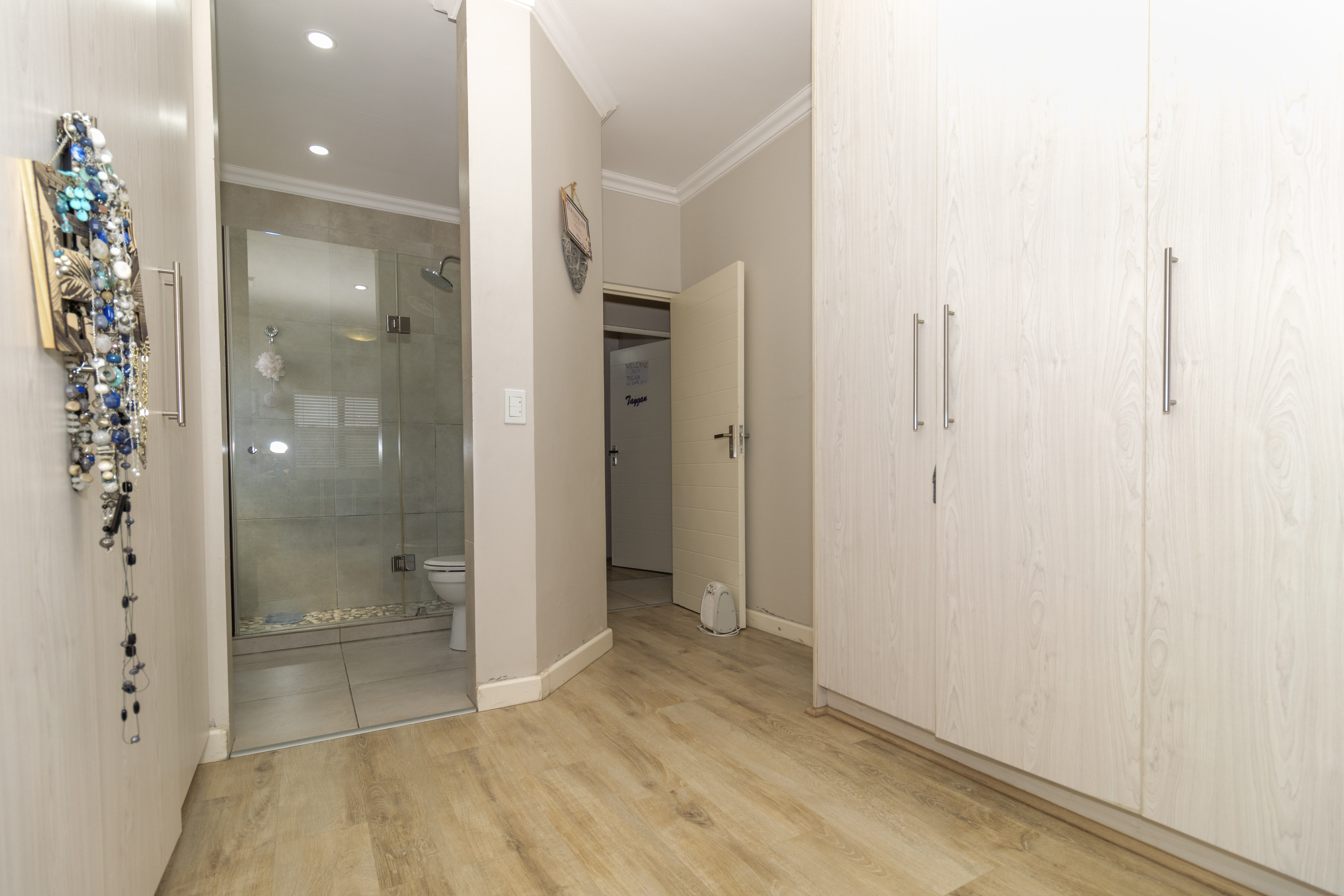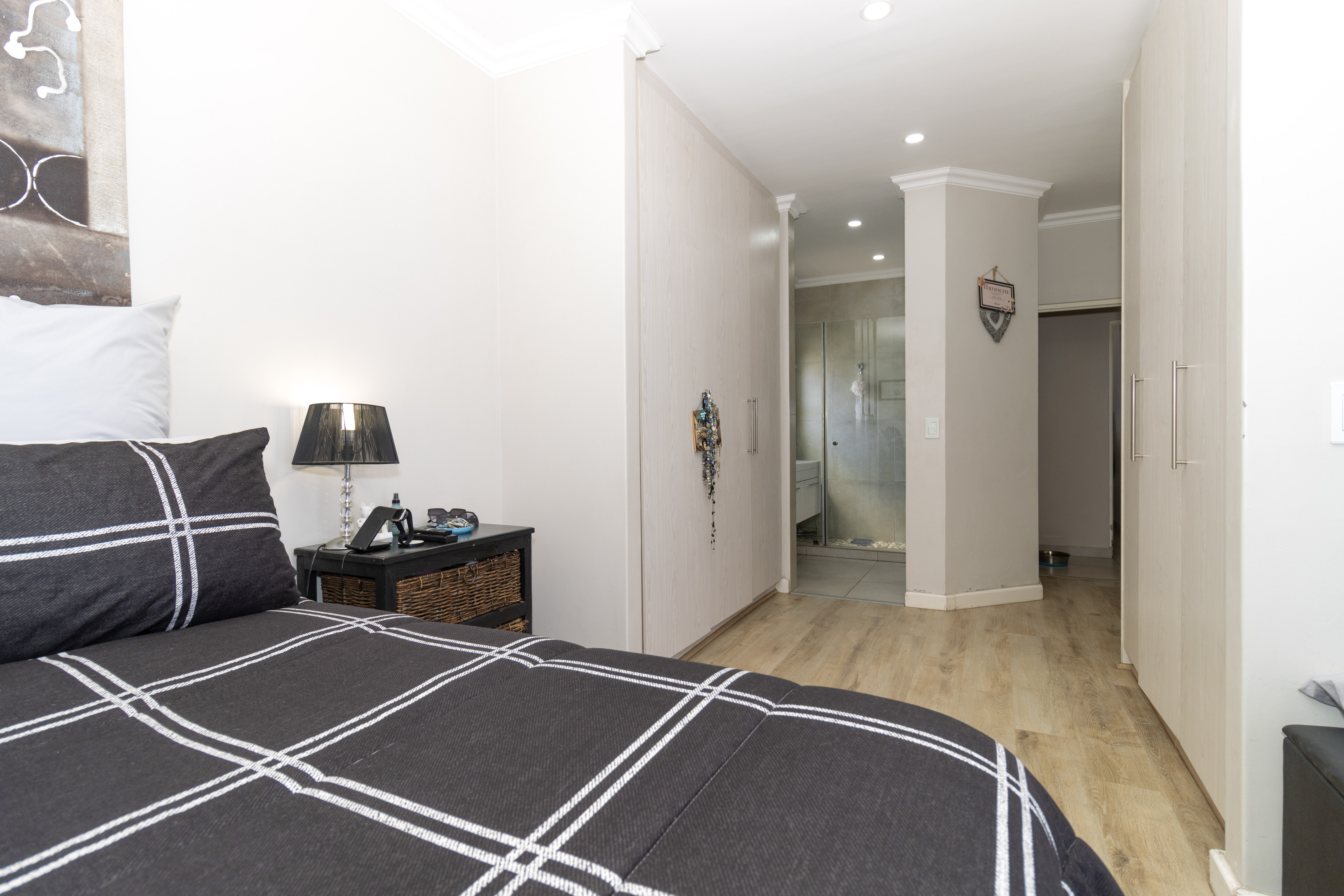 There are four well-sized bedrooms. Three include built-in cupboards, while the fourth bedroom offers flexibility as a study, guest room or work-from-home space. The main bedroom features a modern en-suite bathroom with a wall-to-wall shower, and a second full family bathroom includes both a bath and shower.
