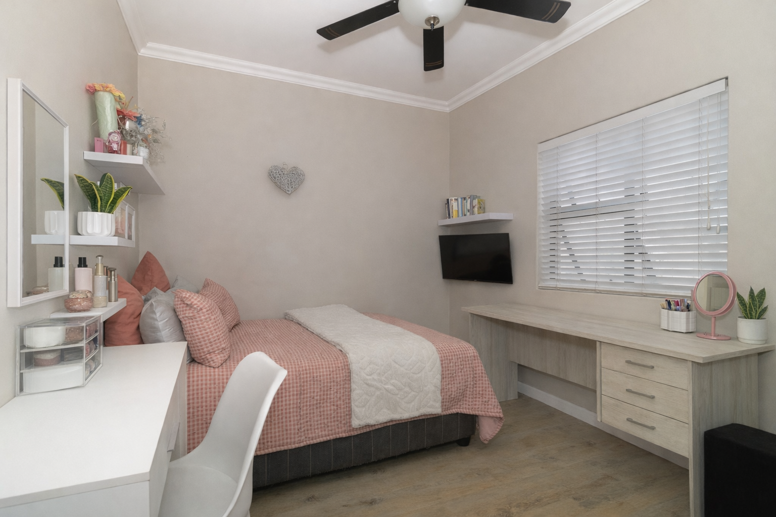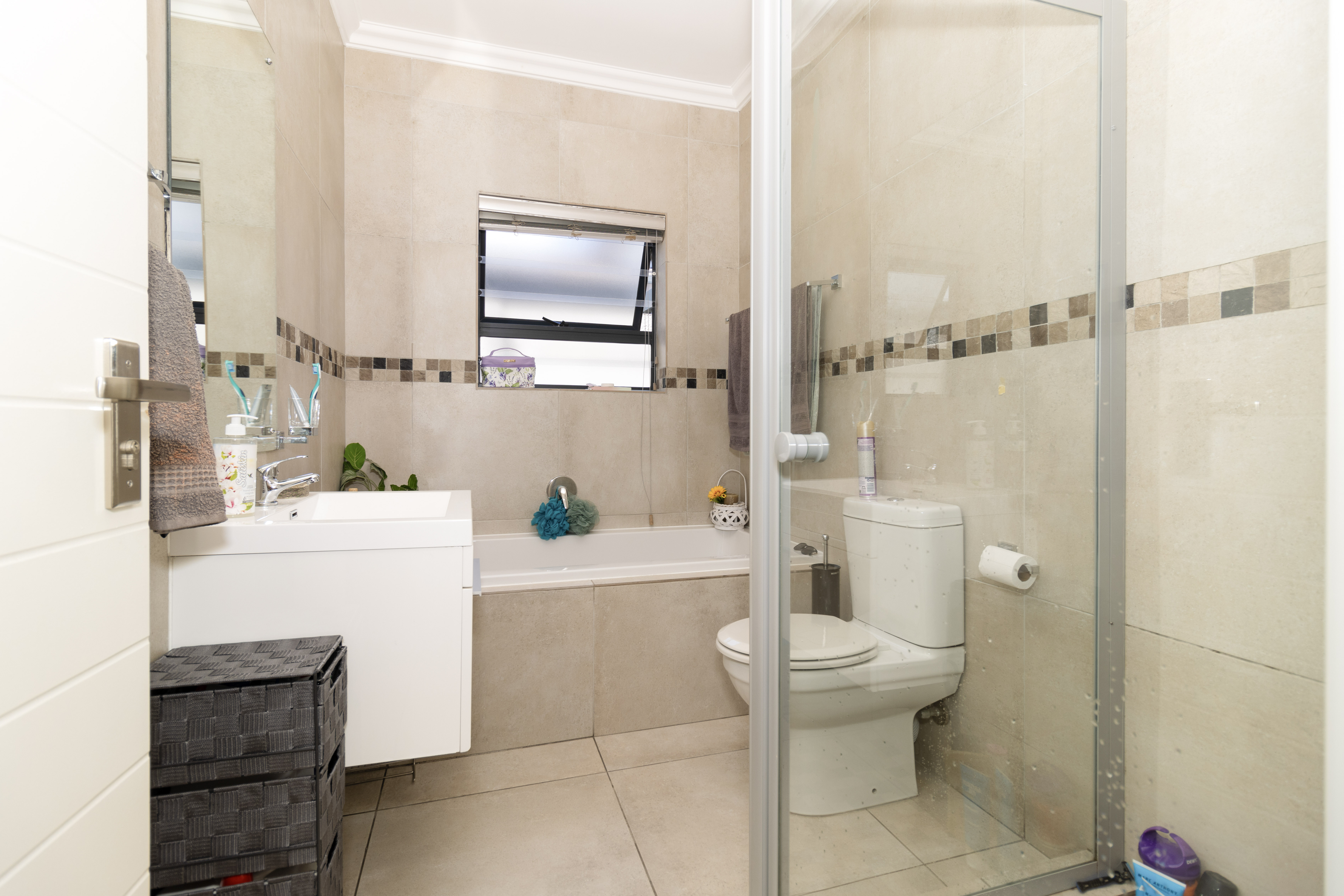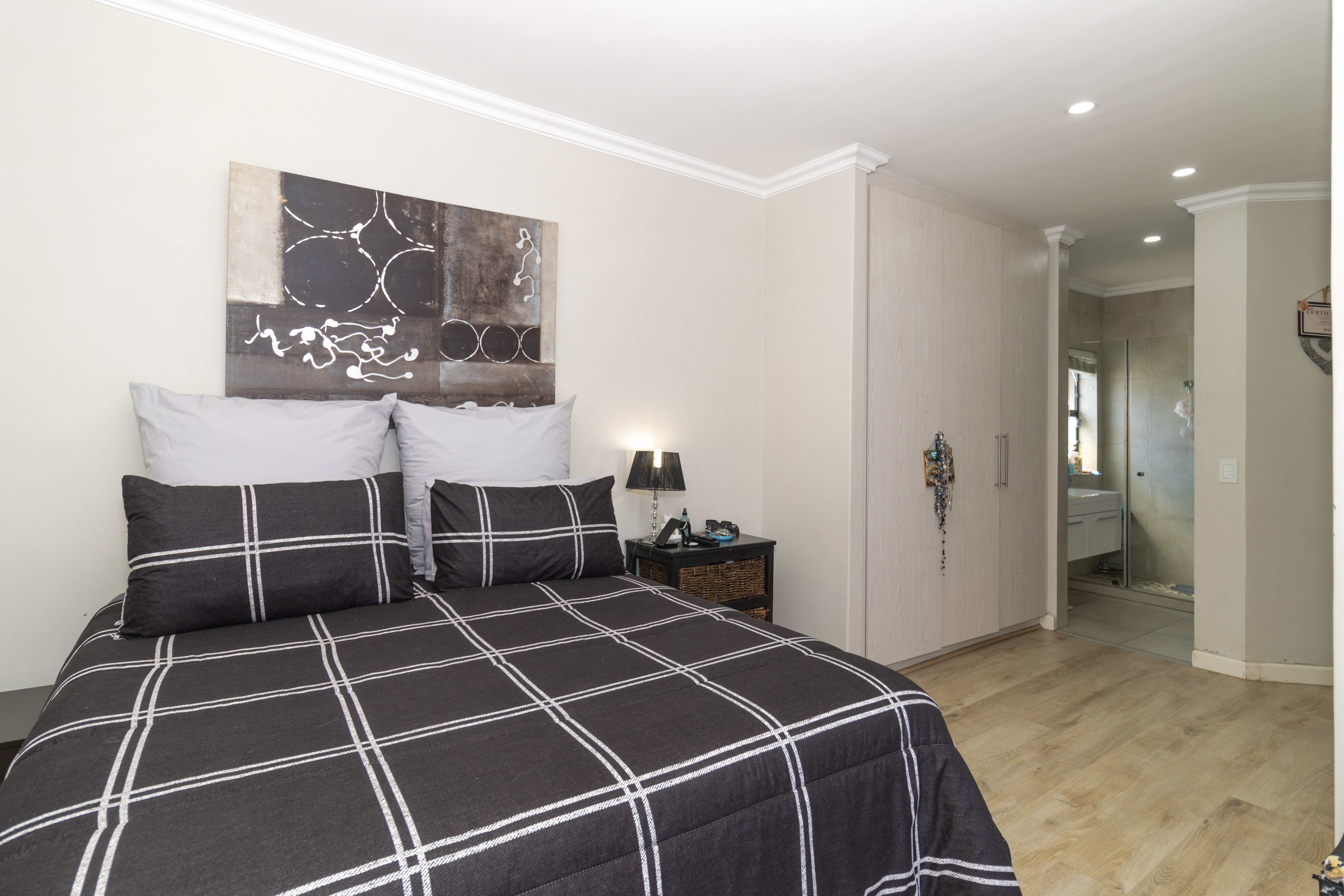 There are four well-sized bedrooms. Three include built-in cupboards, while the fourth bedroom offers flexibility as a study, guest room or work-from-home space. The main bedroom features a modern en-suite bathroom with a wall-to-wall shower, and a second full family bathroom includes both a bath and shower.