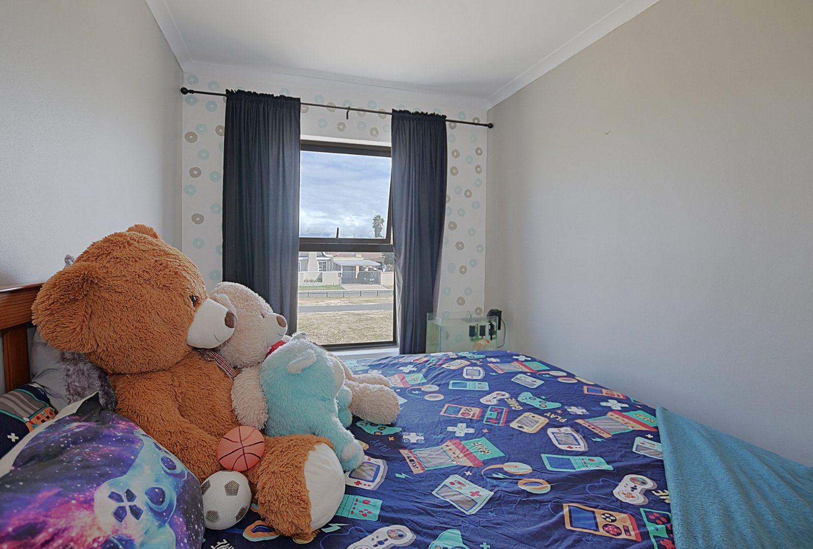 Upstairs features two comfortable bedrooms, each with built-in cupboards. A full bathroom complete with a bathtub and a separate walk-in shower, combining style and functionality.