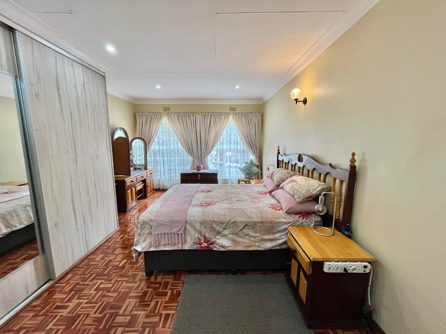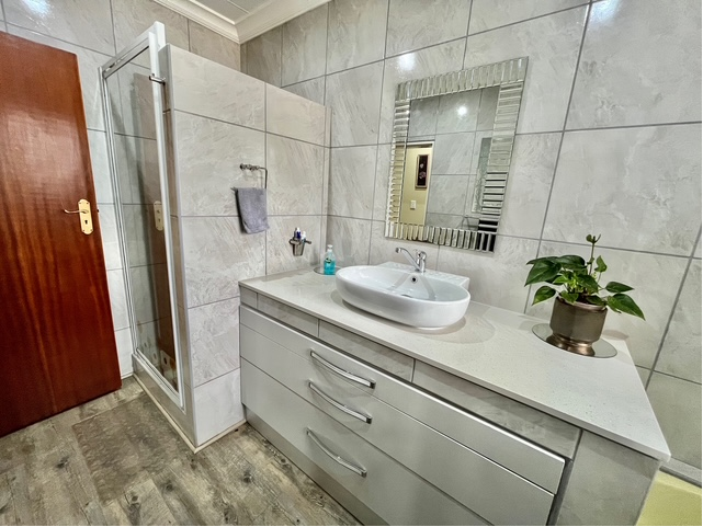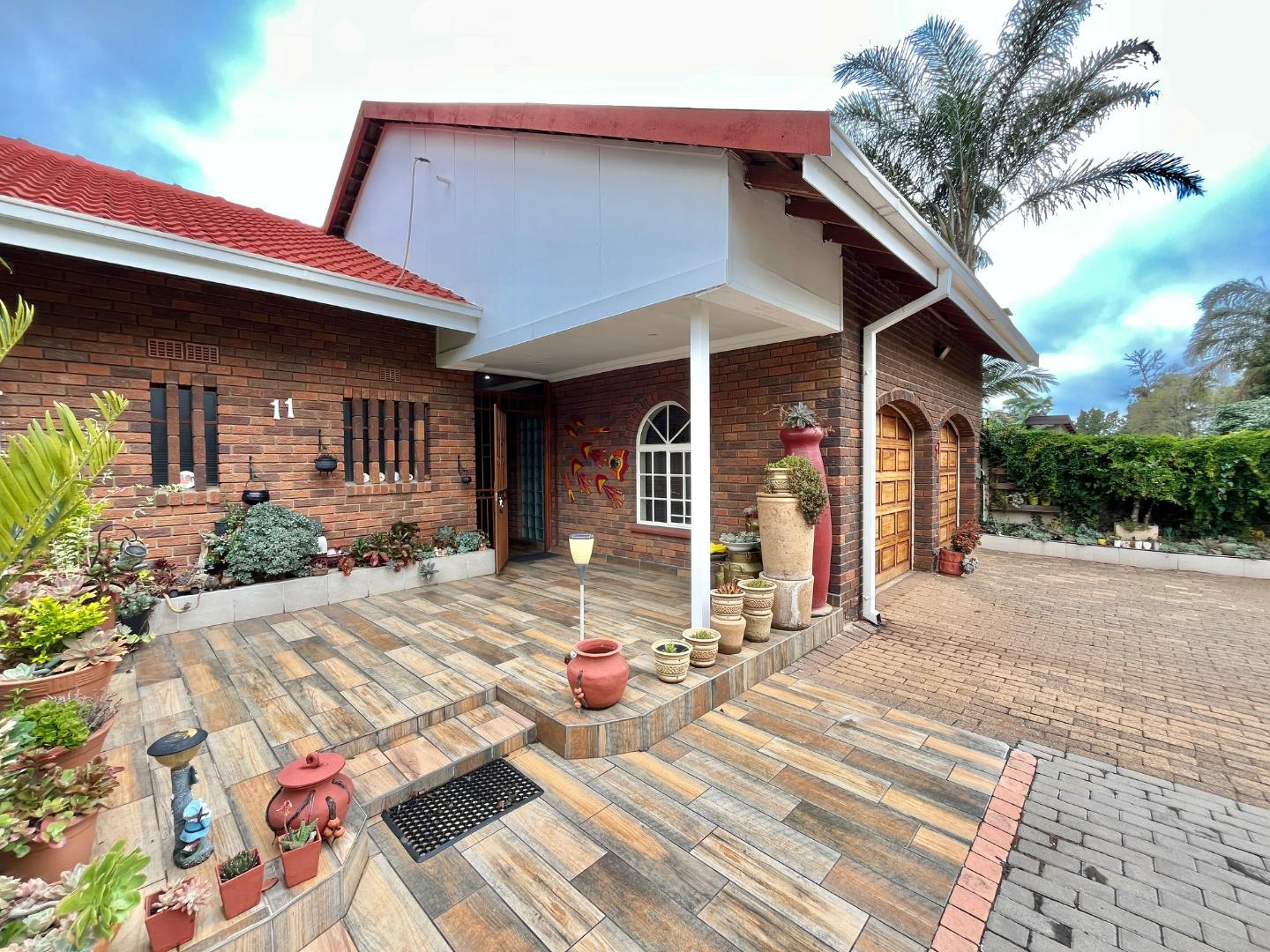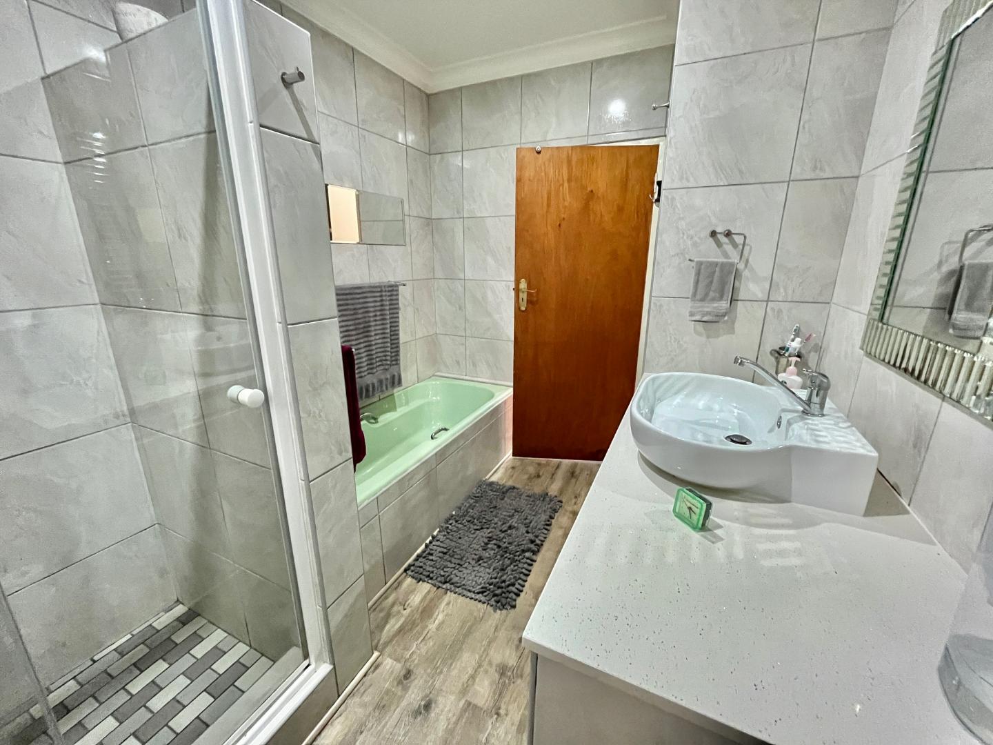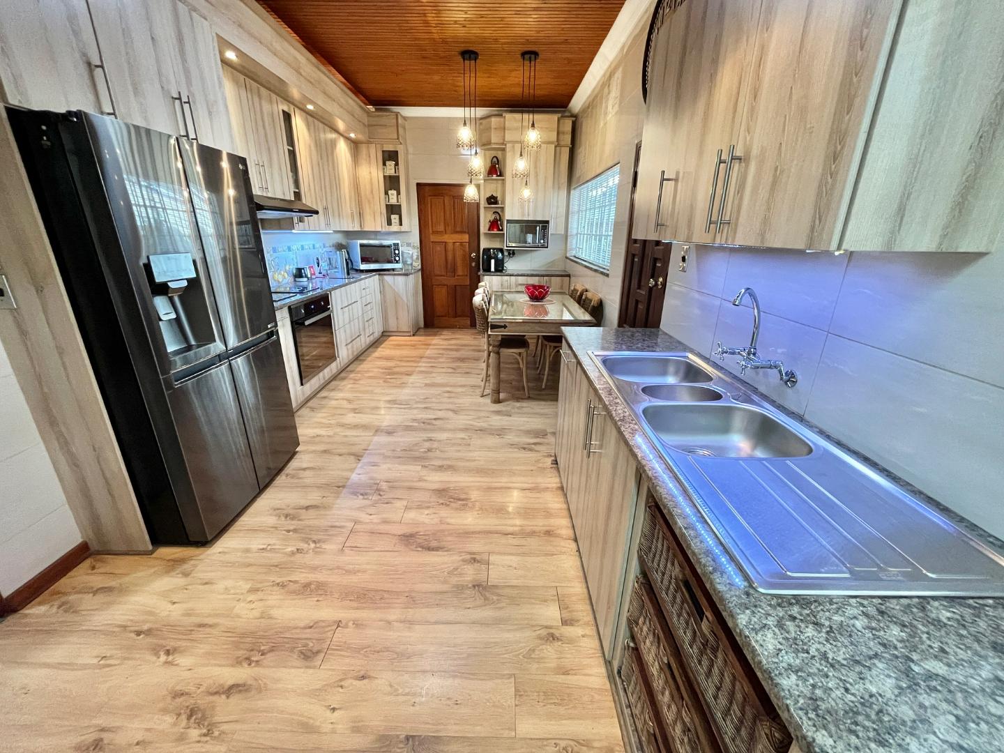 Outside, you'll find a pitched tiled roof covering exterior walls of face brick, ensuring durability and timeless appeal. Steel windows add to the home's security and aesthetic. The brick-paved driveway leads to a double garage with automated roll-up doors, offering drive-through access to the back of the property.