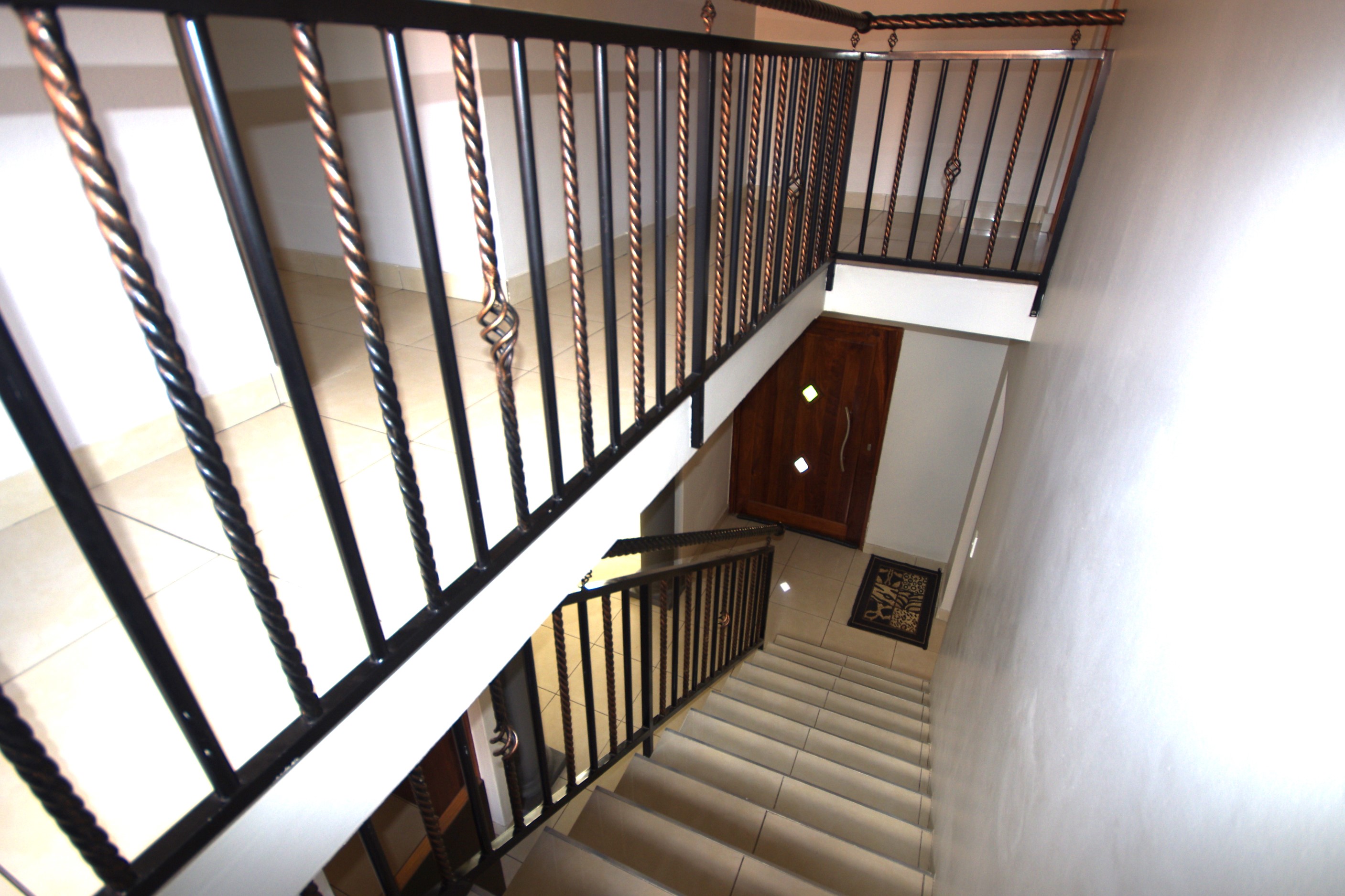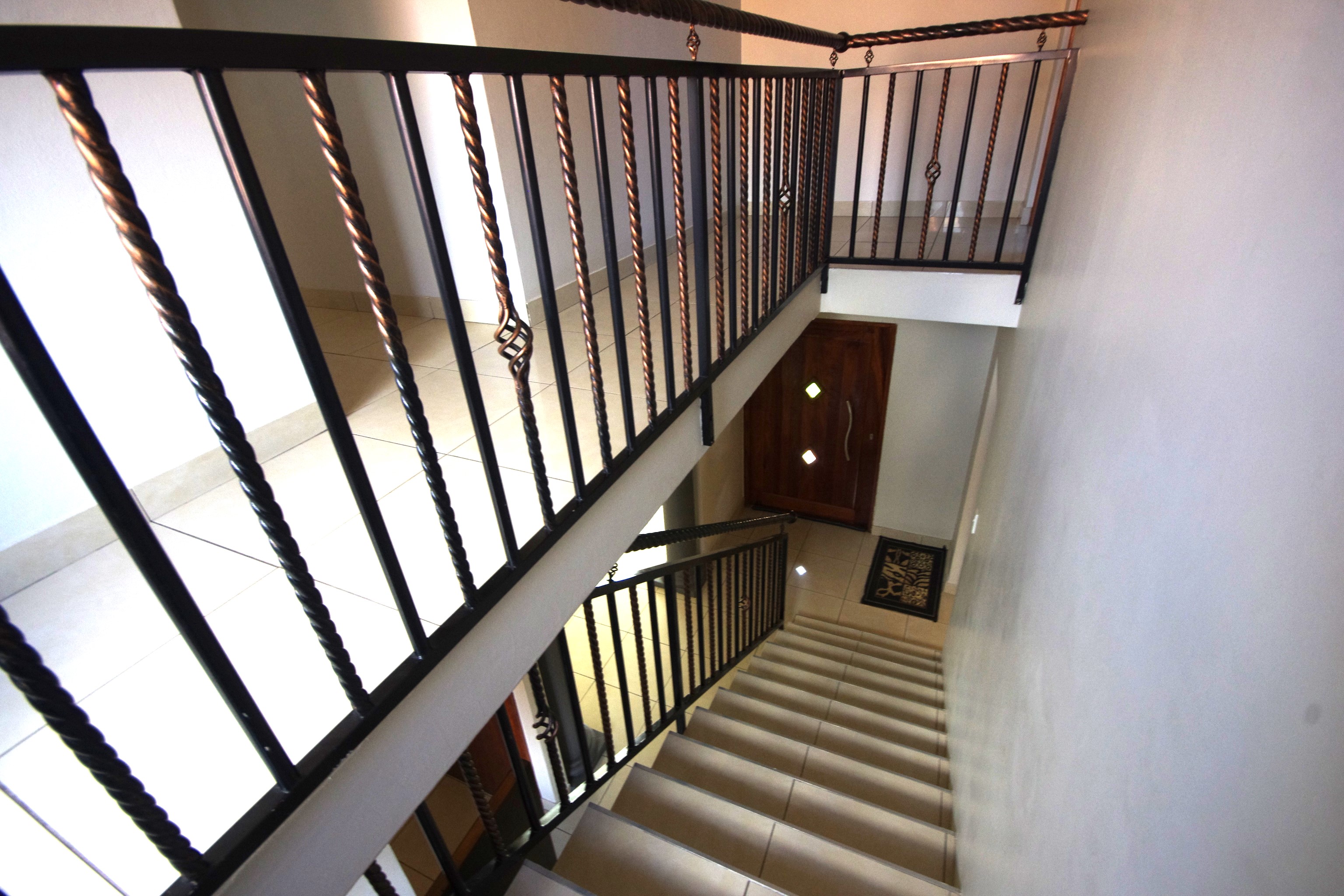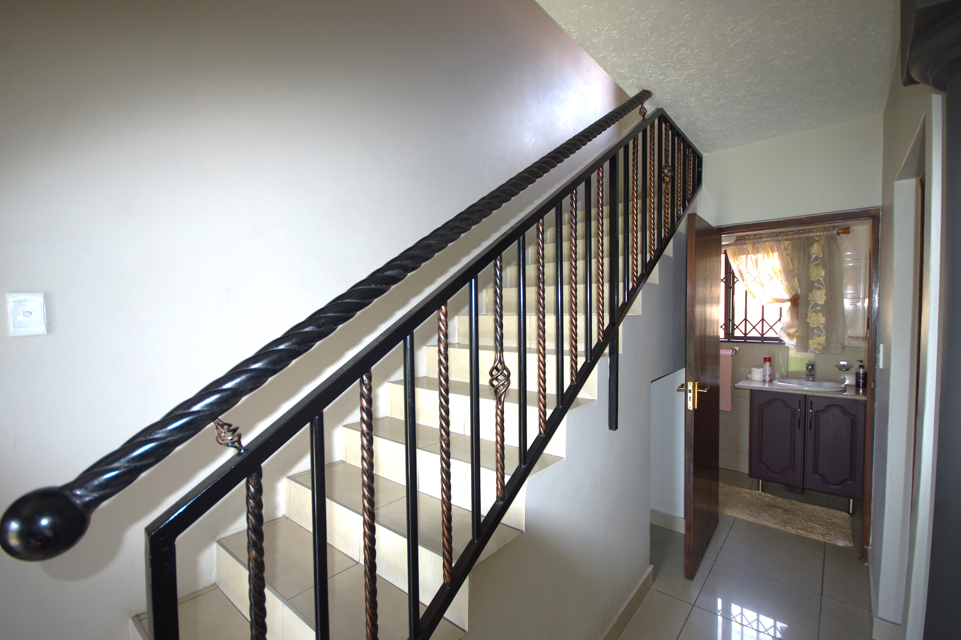 A broad stairway with stunning banisters leads upstairs to 4 stunning bedrooms with 2 full bathrooms. The main bedroom is volumous, with ample cupboards and a full ensuite bathroom with extra-large shower. There are a further 3 bedrooms with built-in cupboards.