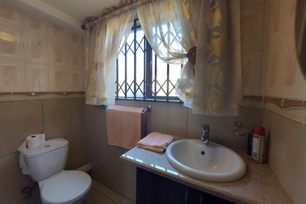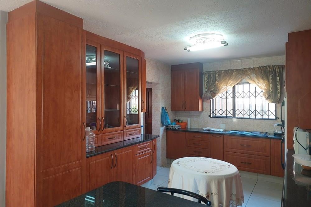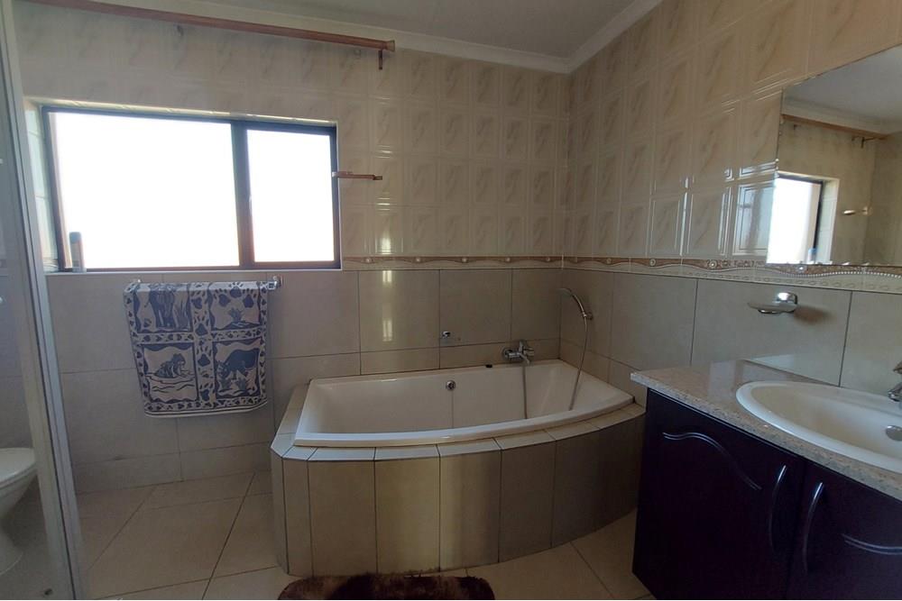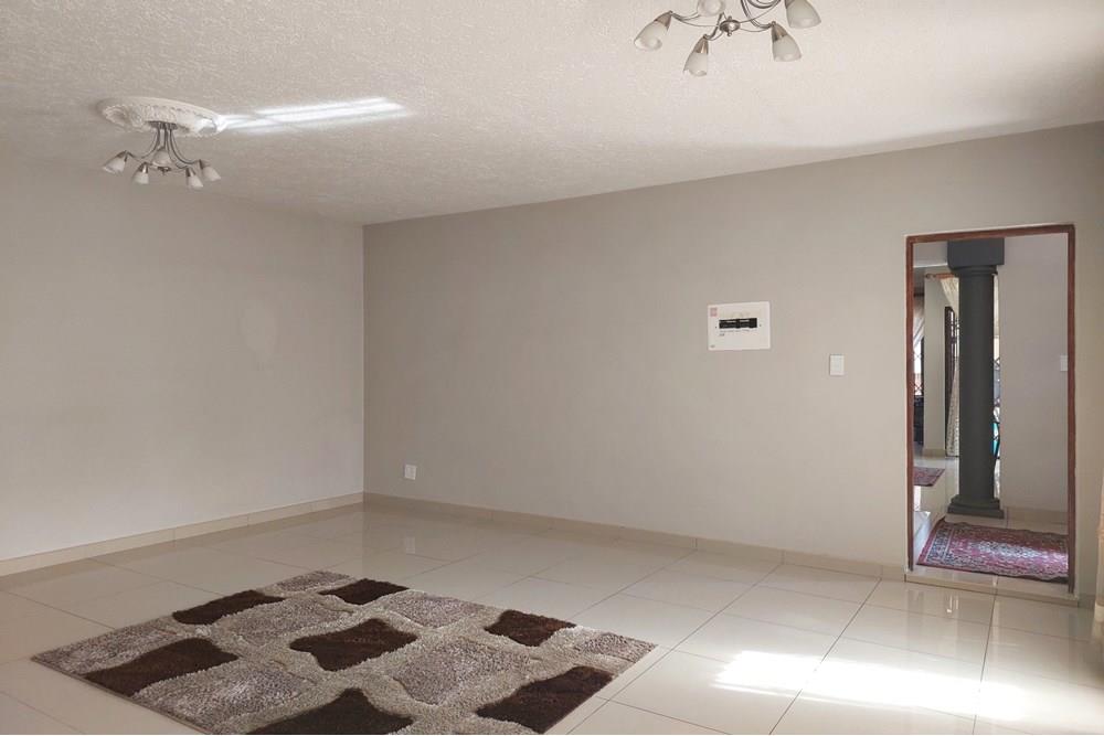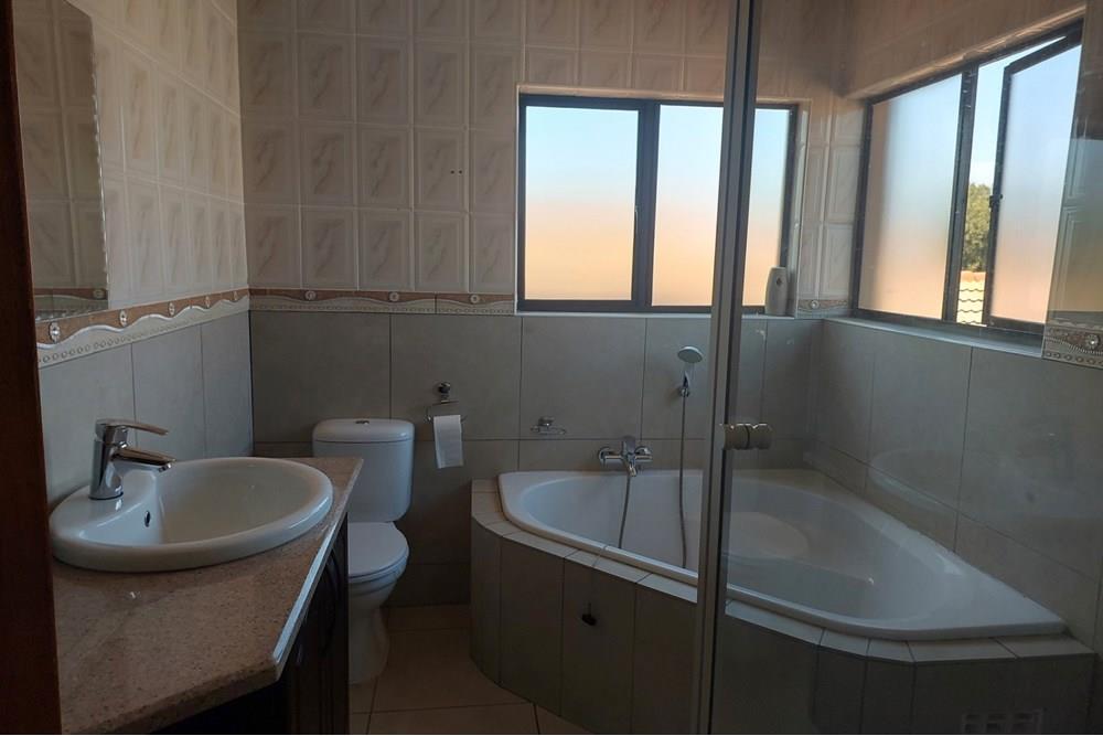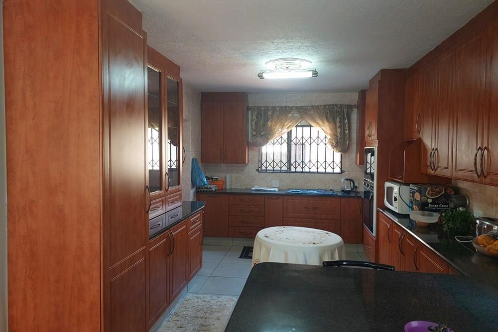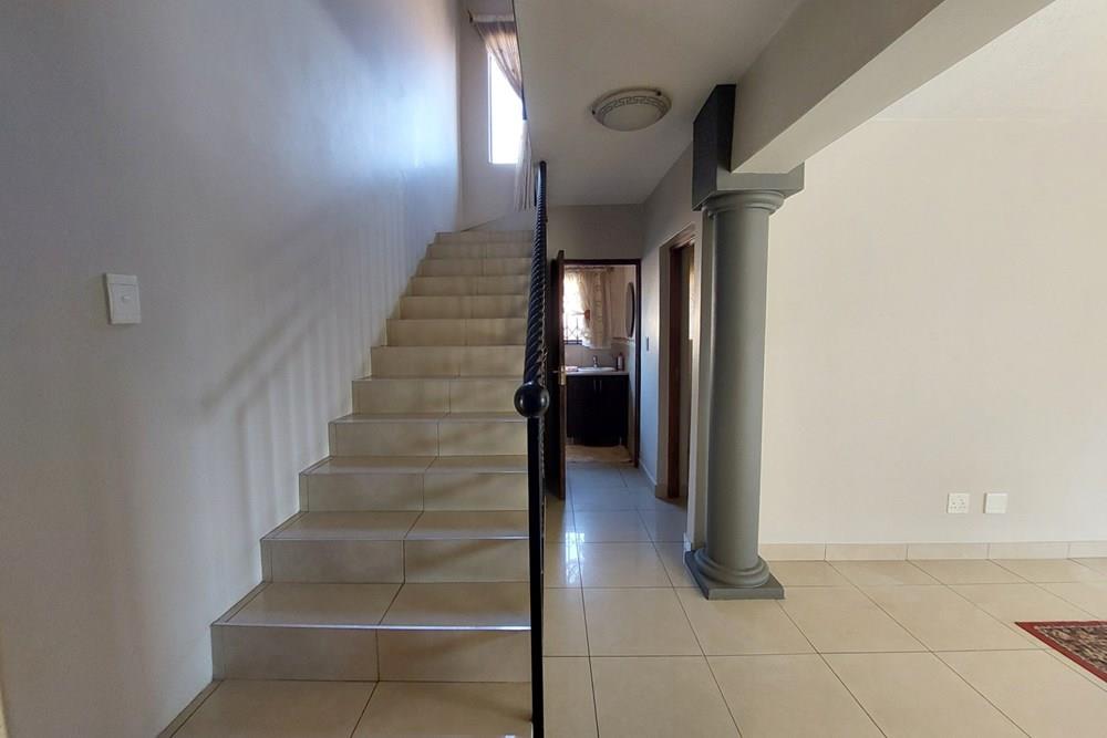 Downstairs: A grand lounge welcomes you, complemented by a foyer featuring a staircase with ample storage underneath, a tiled study, and a guest toilet for added convenience. Enjoy gatherings in the open plan dining room where a tiled sun room awaits with a new built-in braai and expansive windows overlooking the garden, perfect for relaxation. The open plan kitchen is a chef`s dream with abundant cupboards, double eye level oven, granite tops, breakfast counter, and a separate scullery. All downstairs ceilings are adorned with gamazine finishes, adding a touch of elegance.