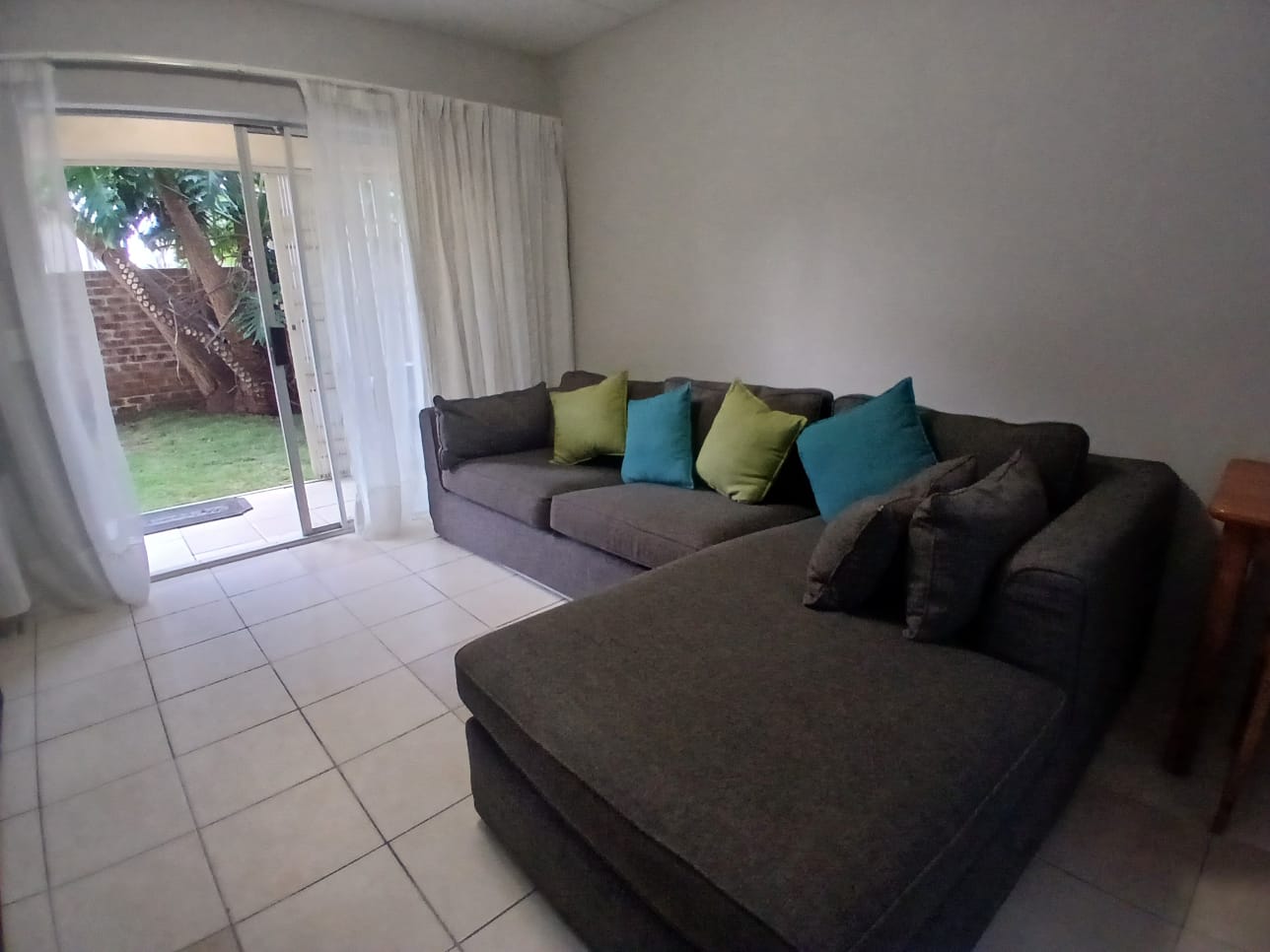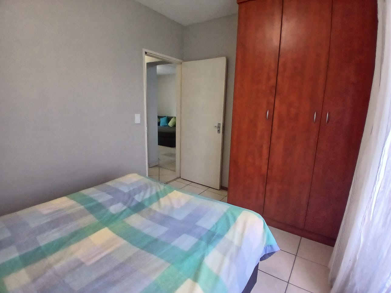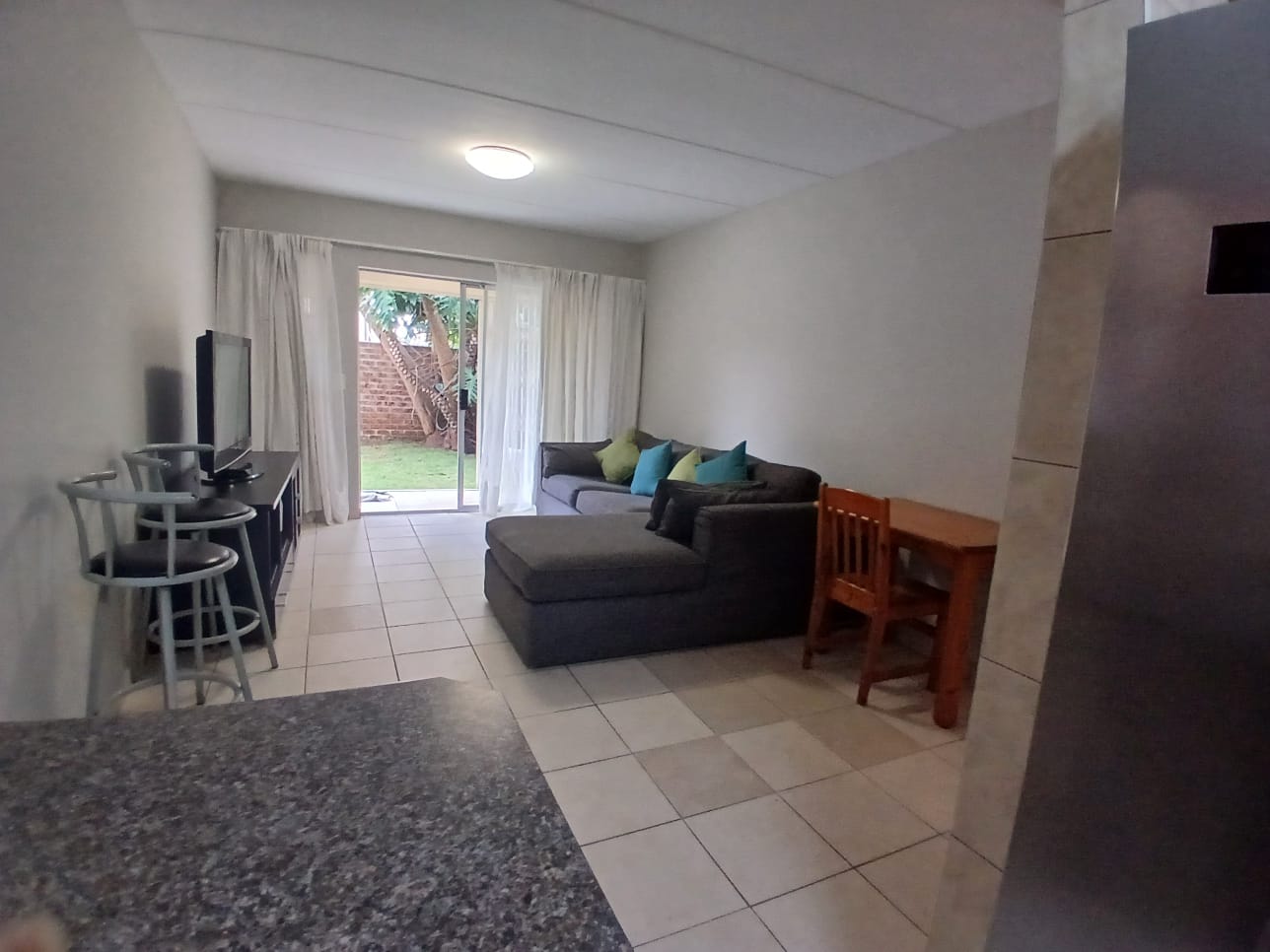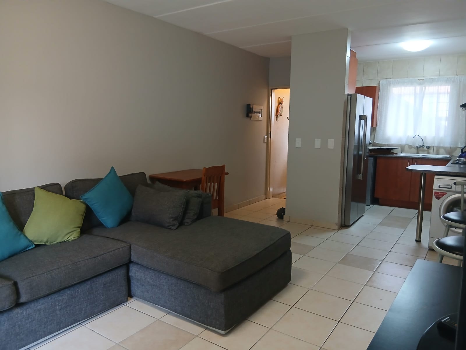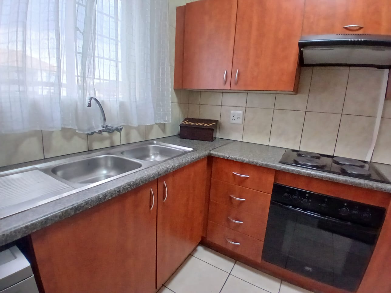 The modern kitchen features rich cherry wood cabinetry and sleek melamine countertops, blending style with practicality. From the open-plan living area, step out onto a large, sunny enclosed patio that can house your braai and a couple of comfortable patio chairs, perfect for relaxing or entertaining.