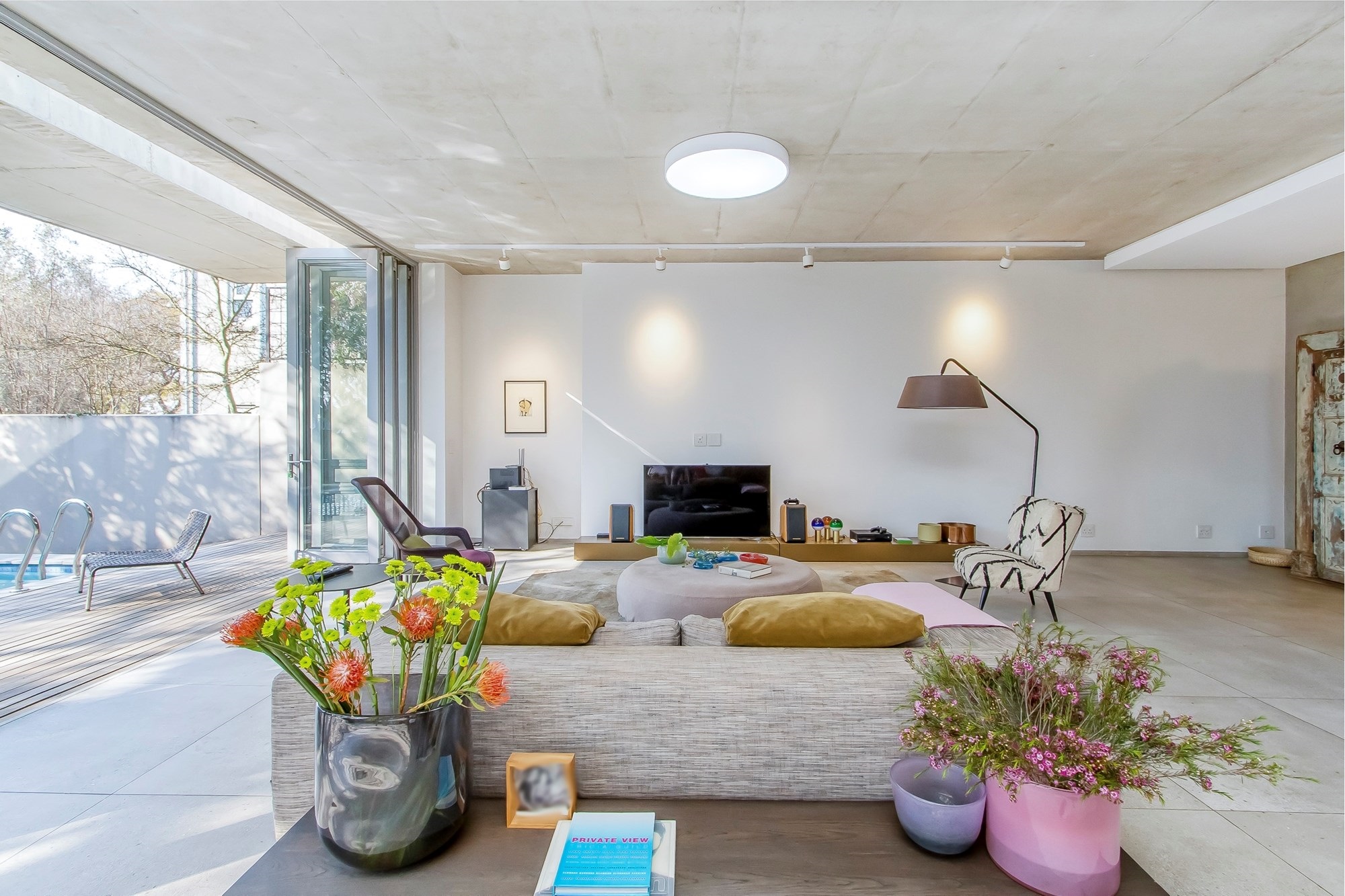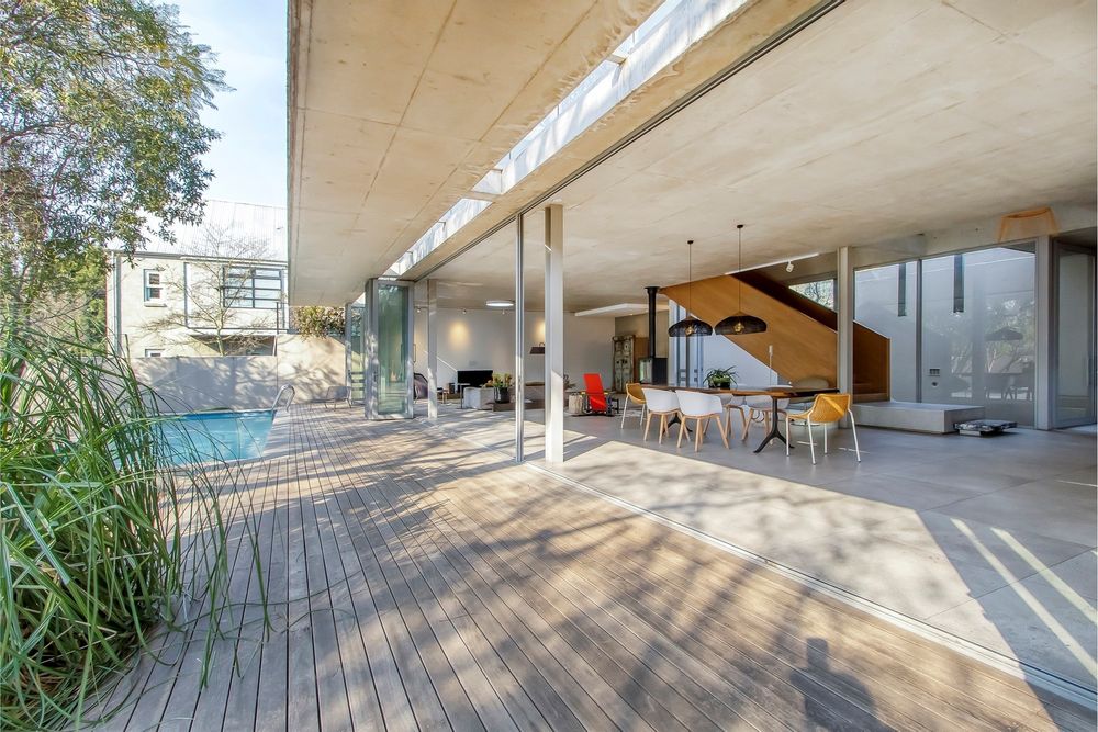 The ground floor offers seamless, free-flowing spaces, from the bespoke SMEG-fitted kitchen with Caesarstone counters, and stacking doors, to open-plan living and dining areas that spill onto a wooden deck, a firepit with built in seating, and a raised pool set among sculpted gardens and illuminated feature trees. Double-volume spaces, skylights, and designer finishes, including large-format tiles and feature stone walls, create a modern yet warm ambiance.