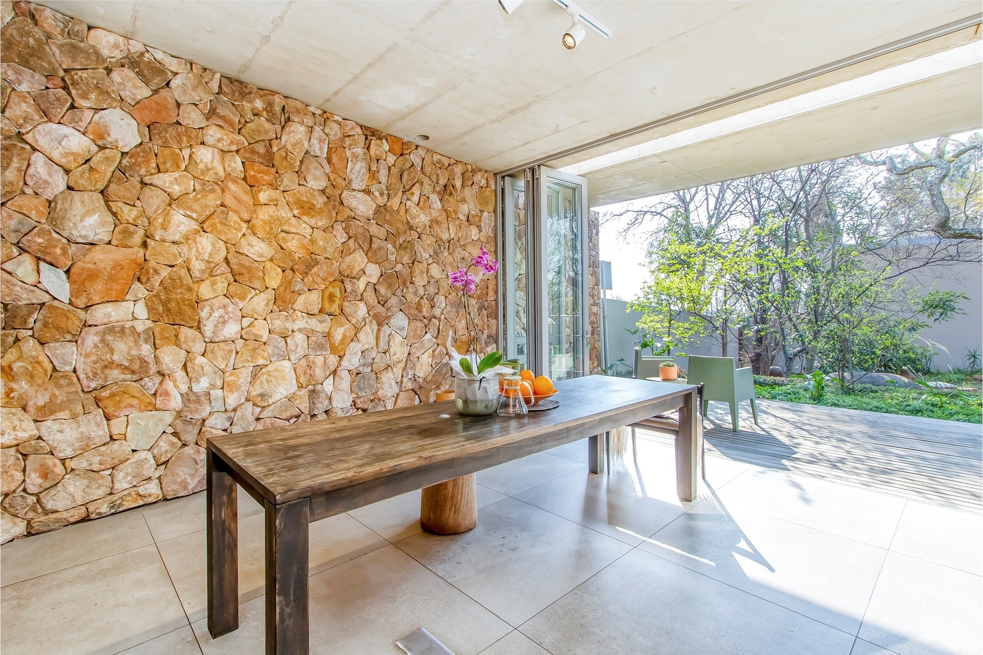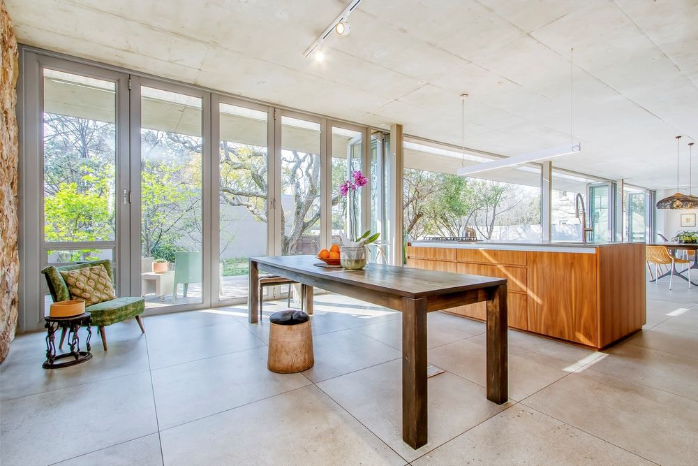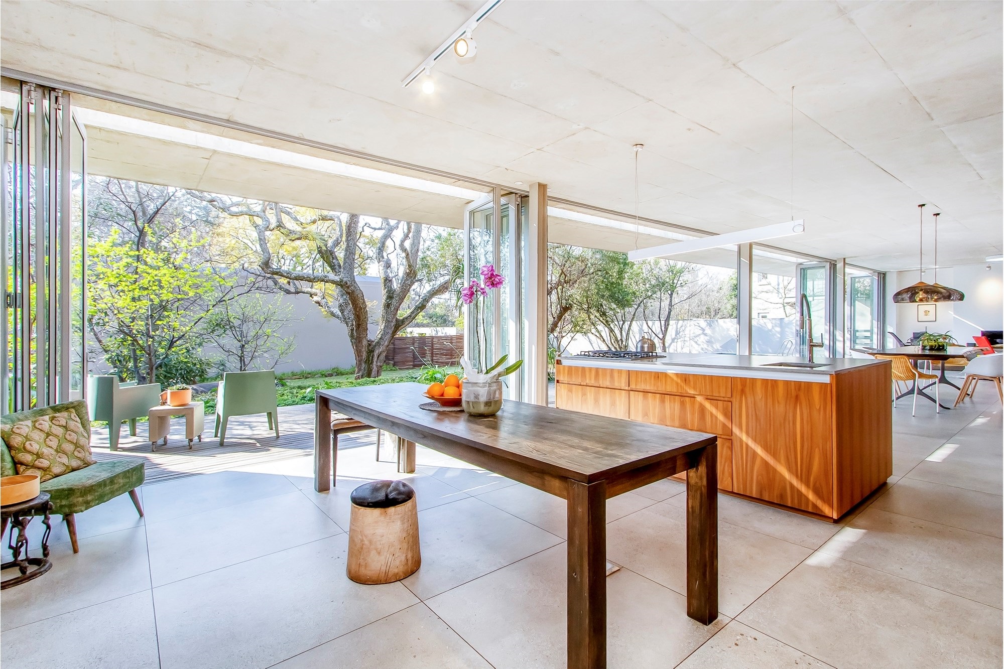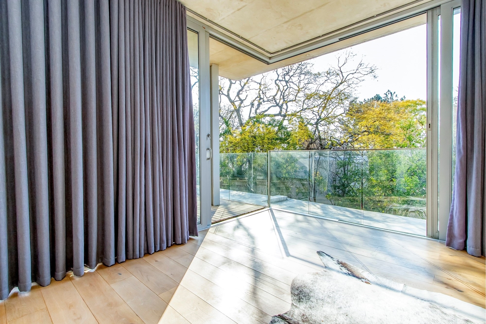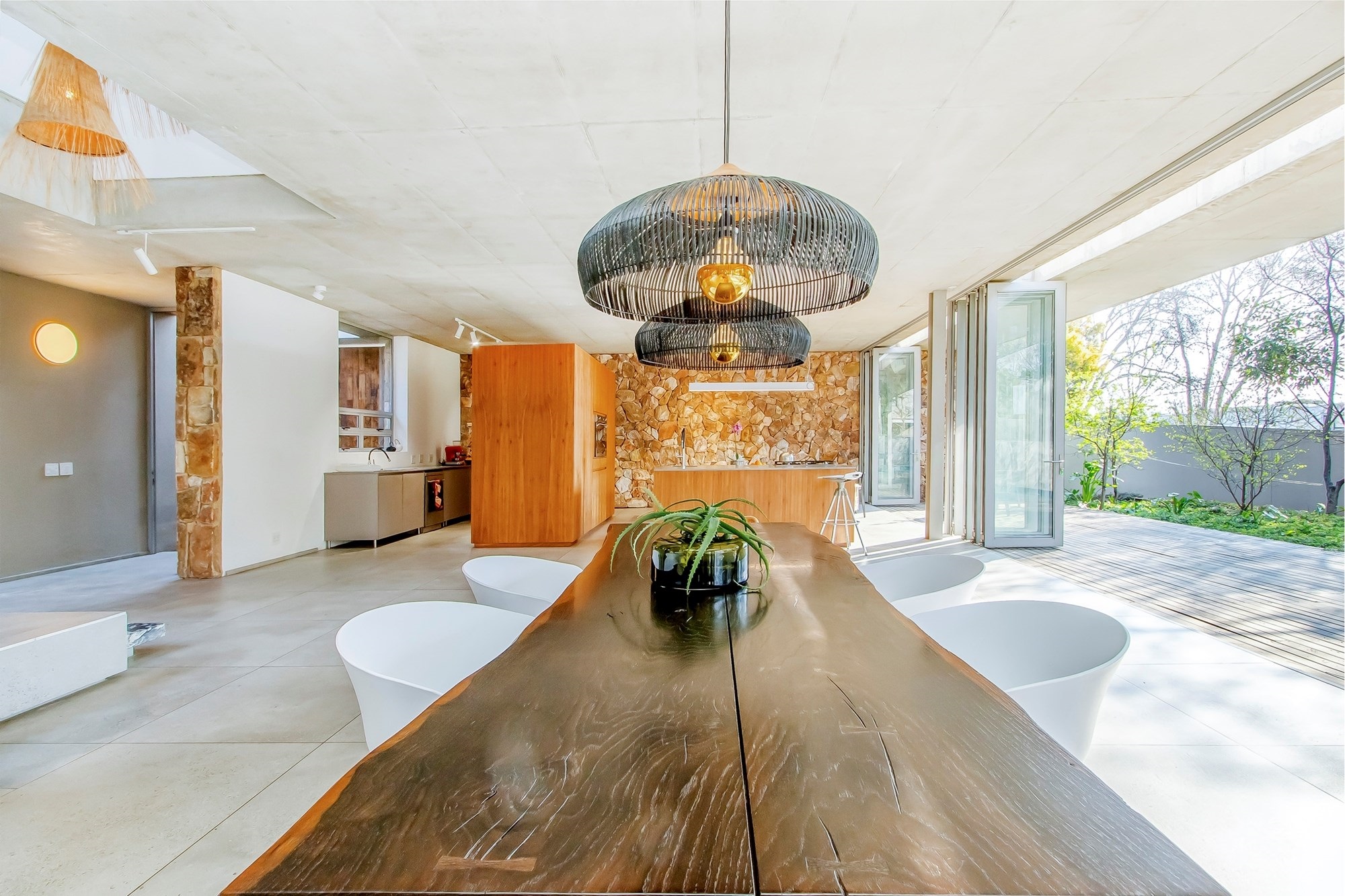 The home is an inspired blend of cutting-edge architecture and natural integration with mature, moss-covered indigenous trees, including Rothmannia Globosa, Mountain Karee, River Bushwillow, Stinkwoods, and a grand Jacaranda, that create a serene canopy that envelops the property. Every space has been designed to honour its natural surroundings, with carefully placed courtyards and expansive, wall-to-wall glazing that flood the interiors with light, frame the lush green views, and blur the line between indoors and out.