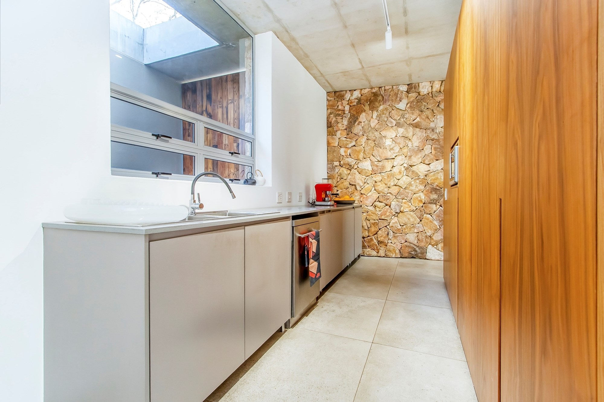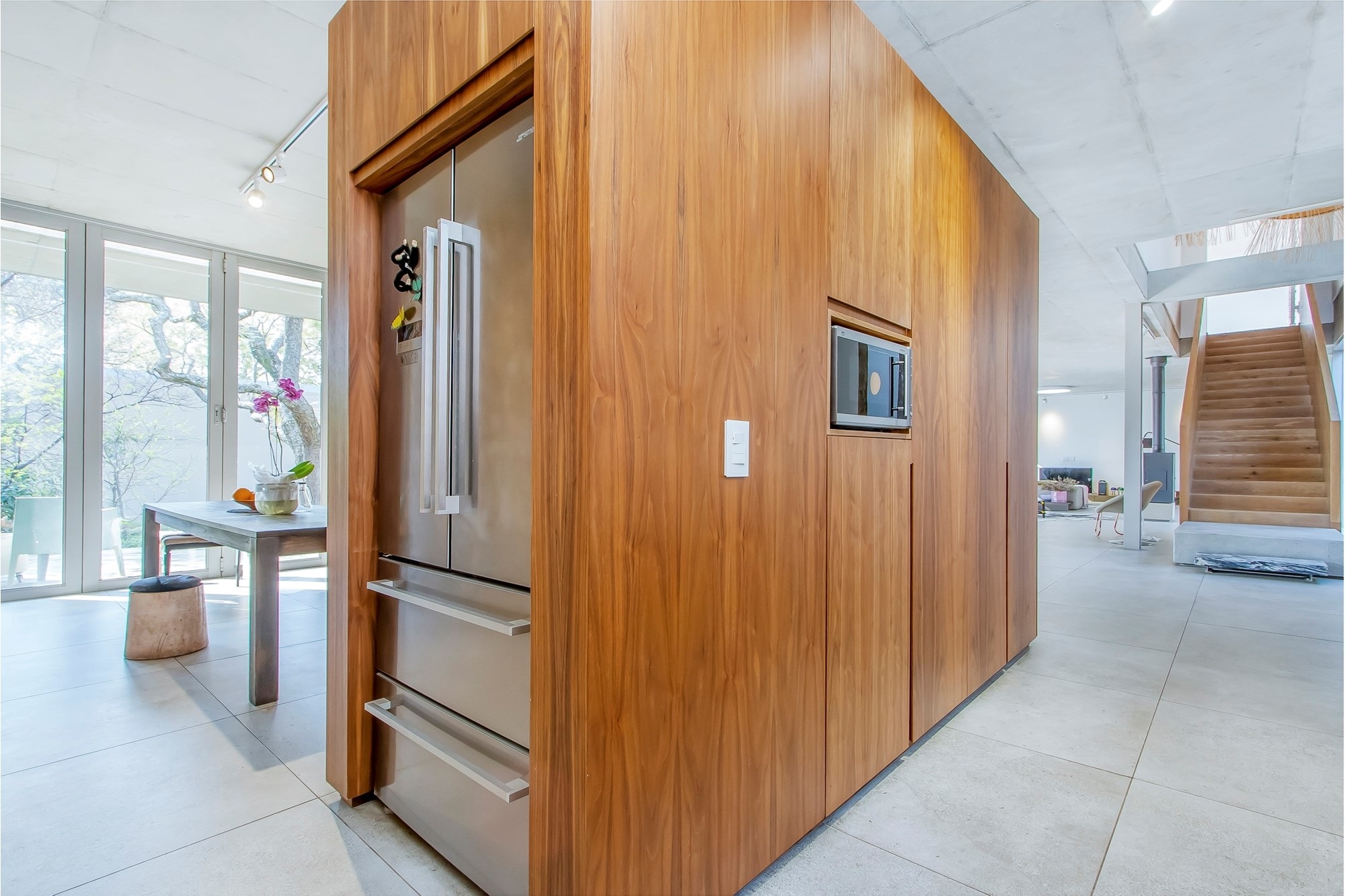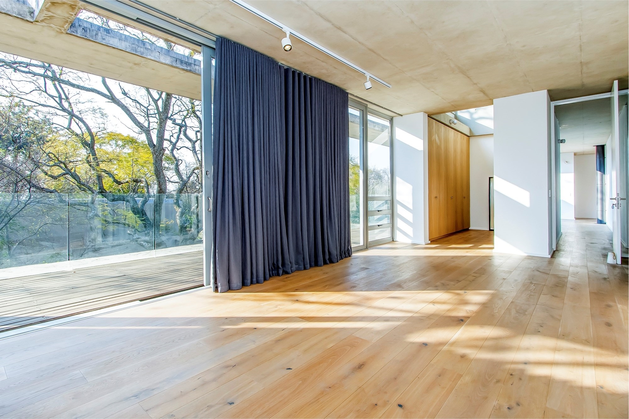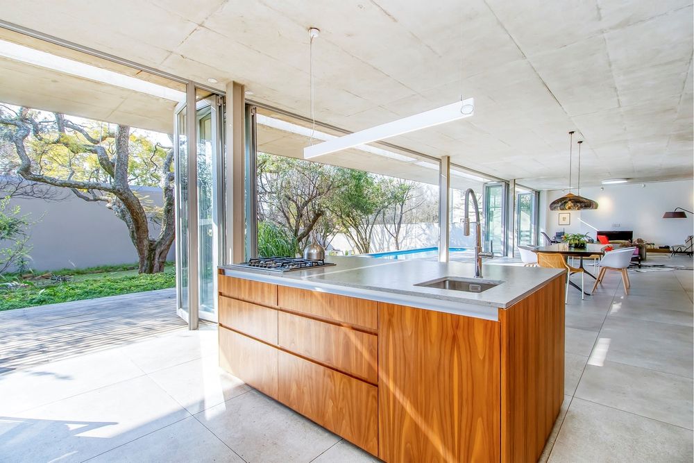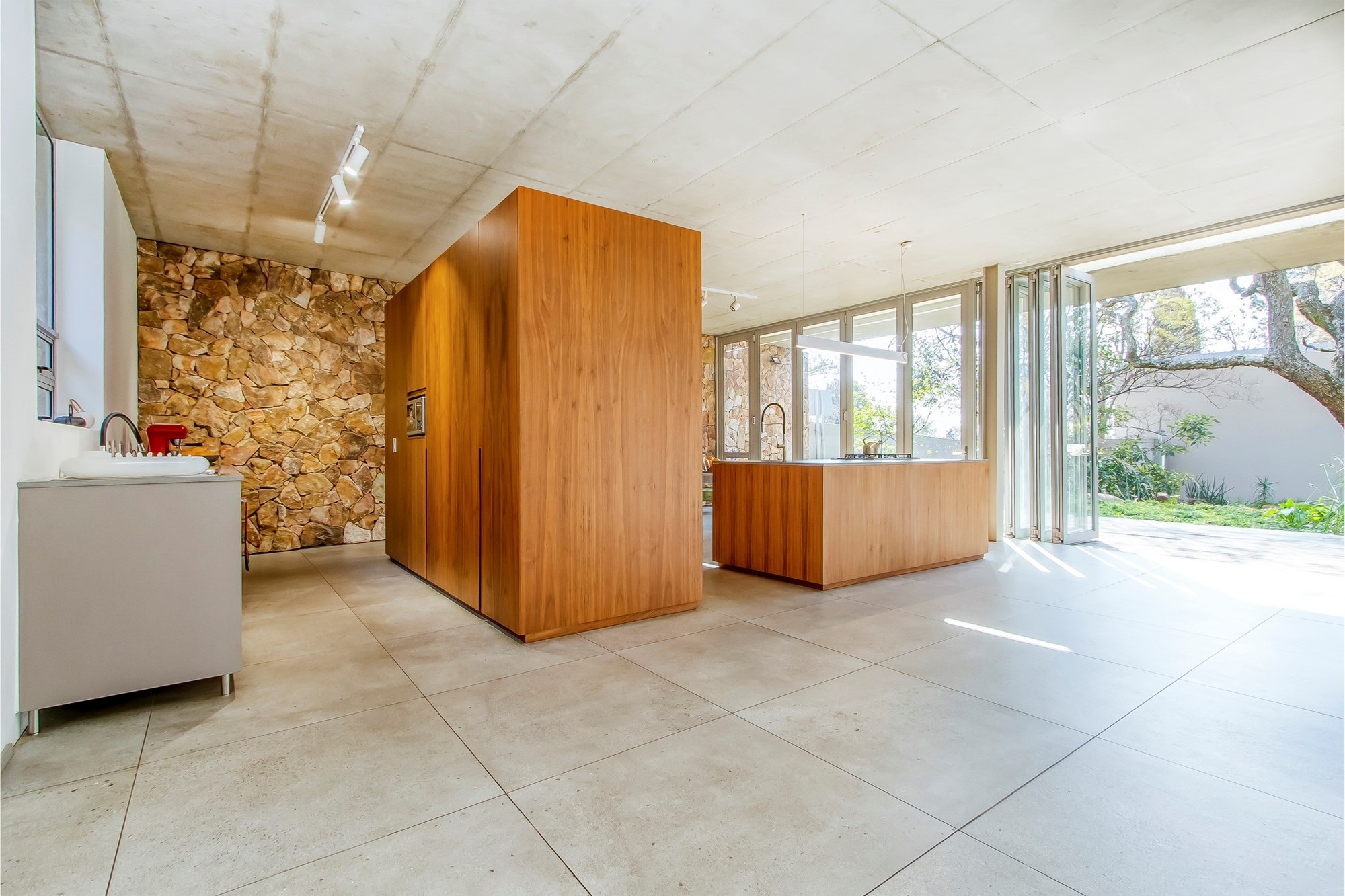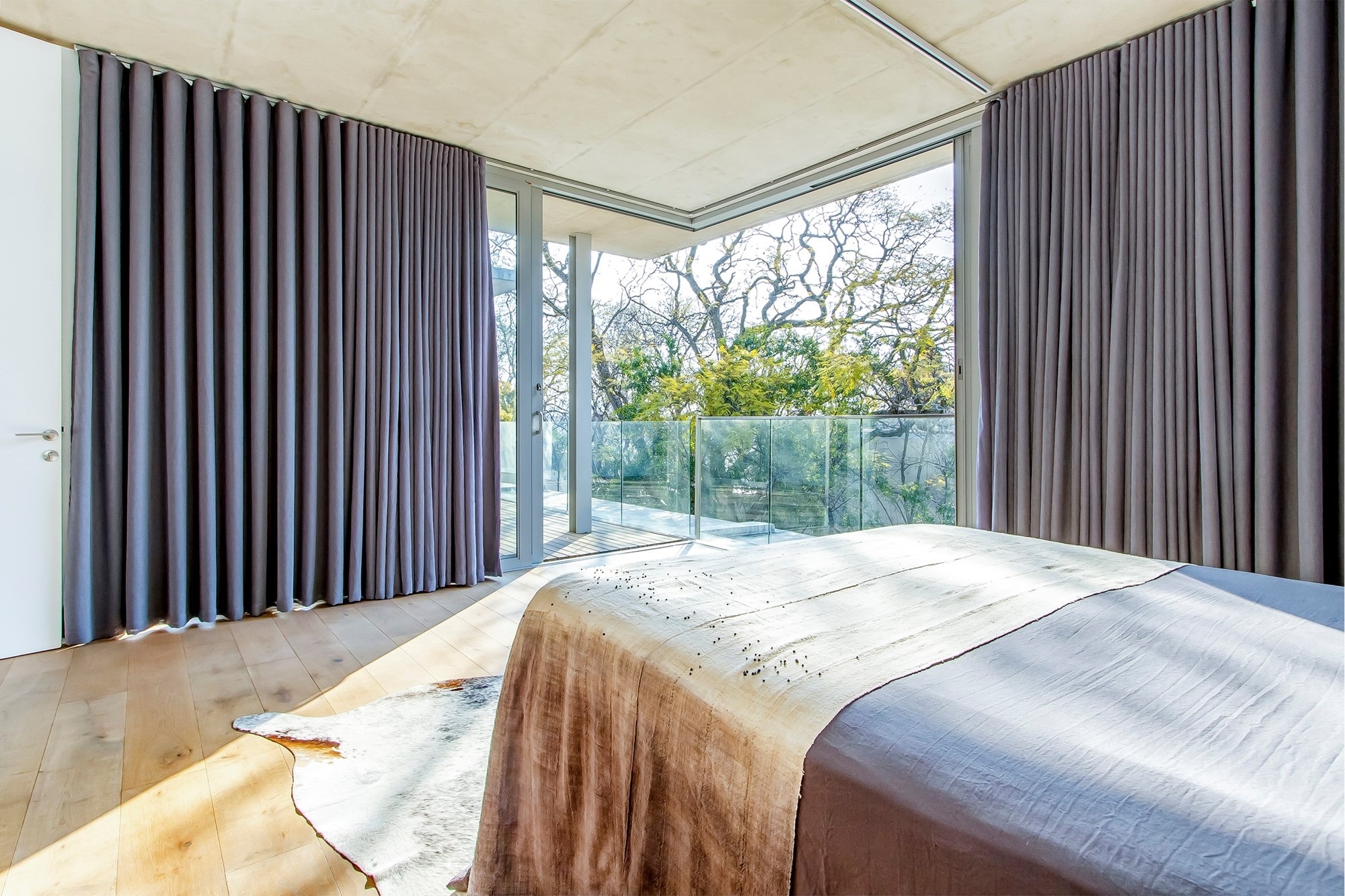 The home is an inspired blend of cutting-edge architecture and natural integration with mature, moss-covered indigenous trees, including Rothmannia Globosa, Mountain Karee, River Bushwillow, Stinkwoods, and a grand Jacaranda, that create a serene canopy that envelops the property. Every space has been designed to honour its natural surroundings, with carefully placed courtyards and expansive, wall-to-wall glazing that flood the interiors with light, frame the lush green views, and blur the line between indoors and out.