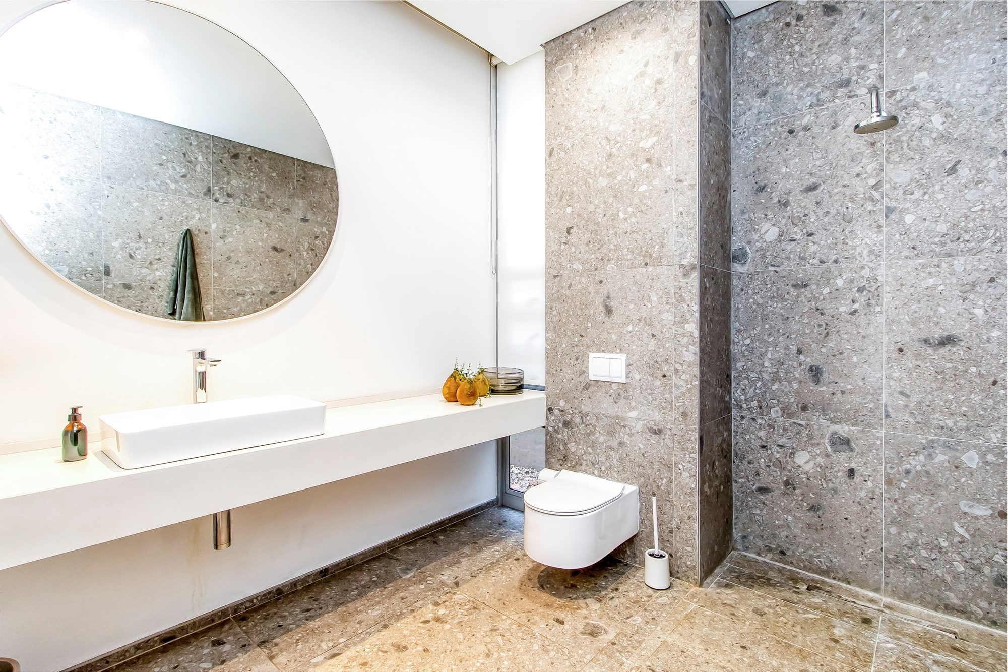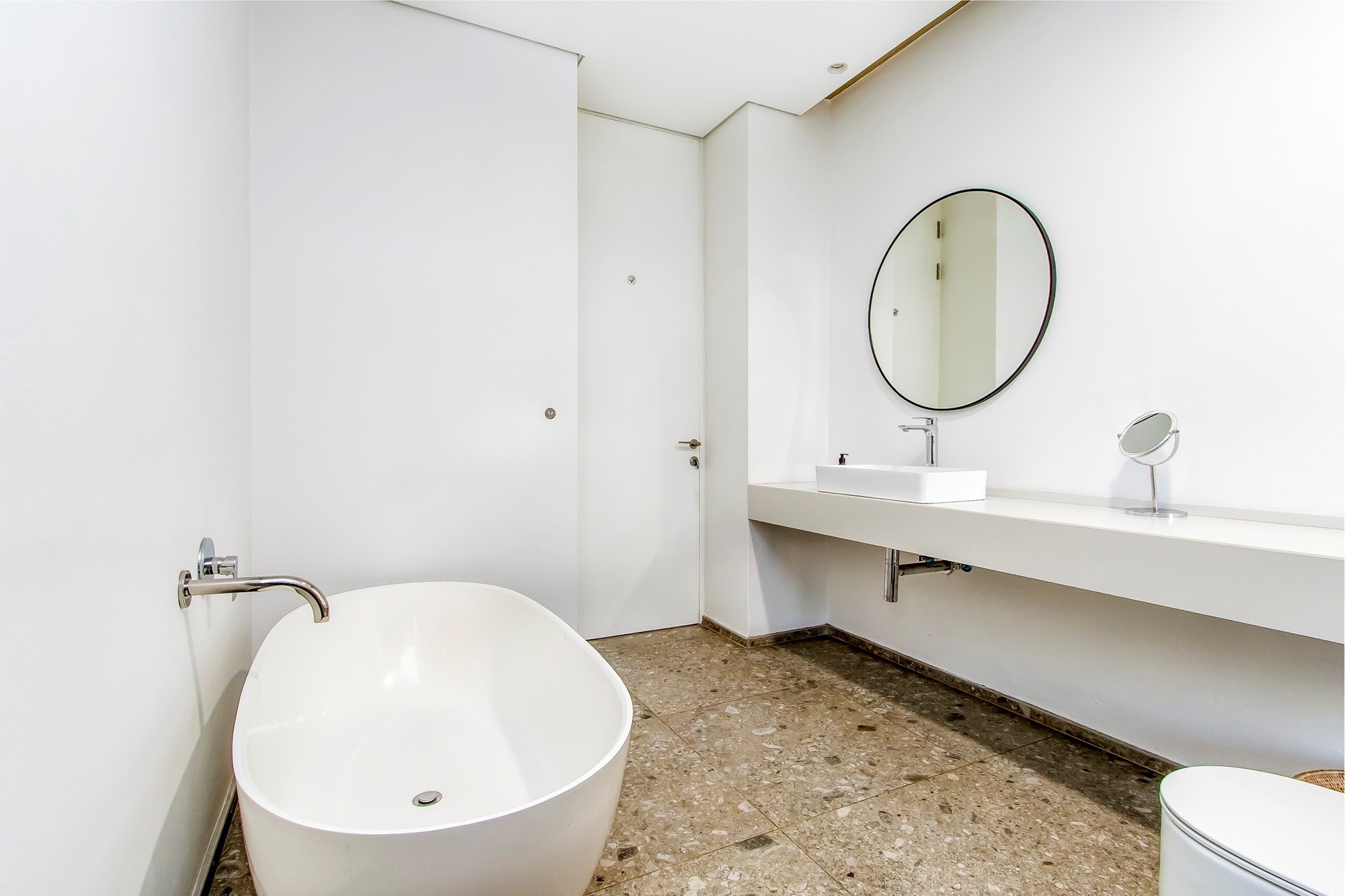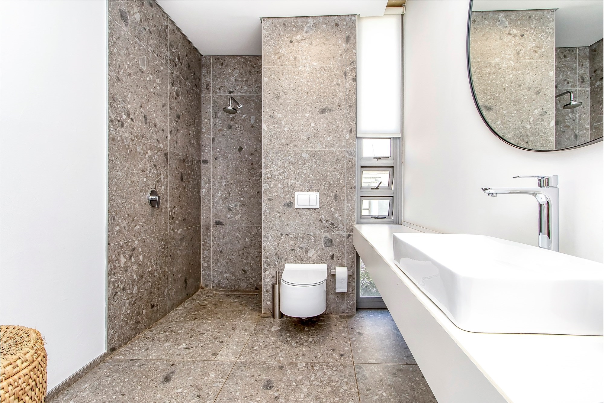 On the ground floor, a well-appointed guest bedroom with an en-suite bathroom enjoys direct access to a serene private courtyard through sliding glass doors.