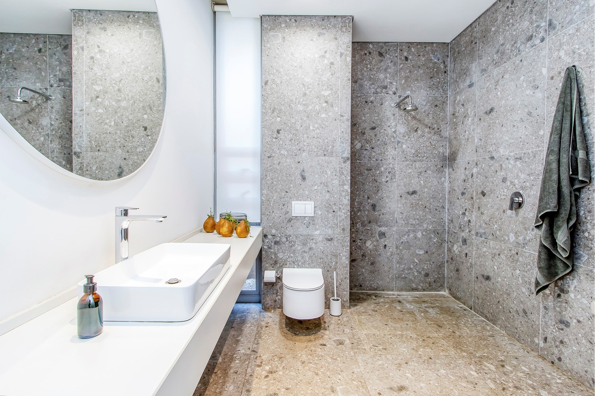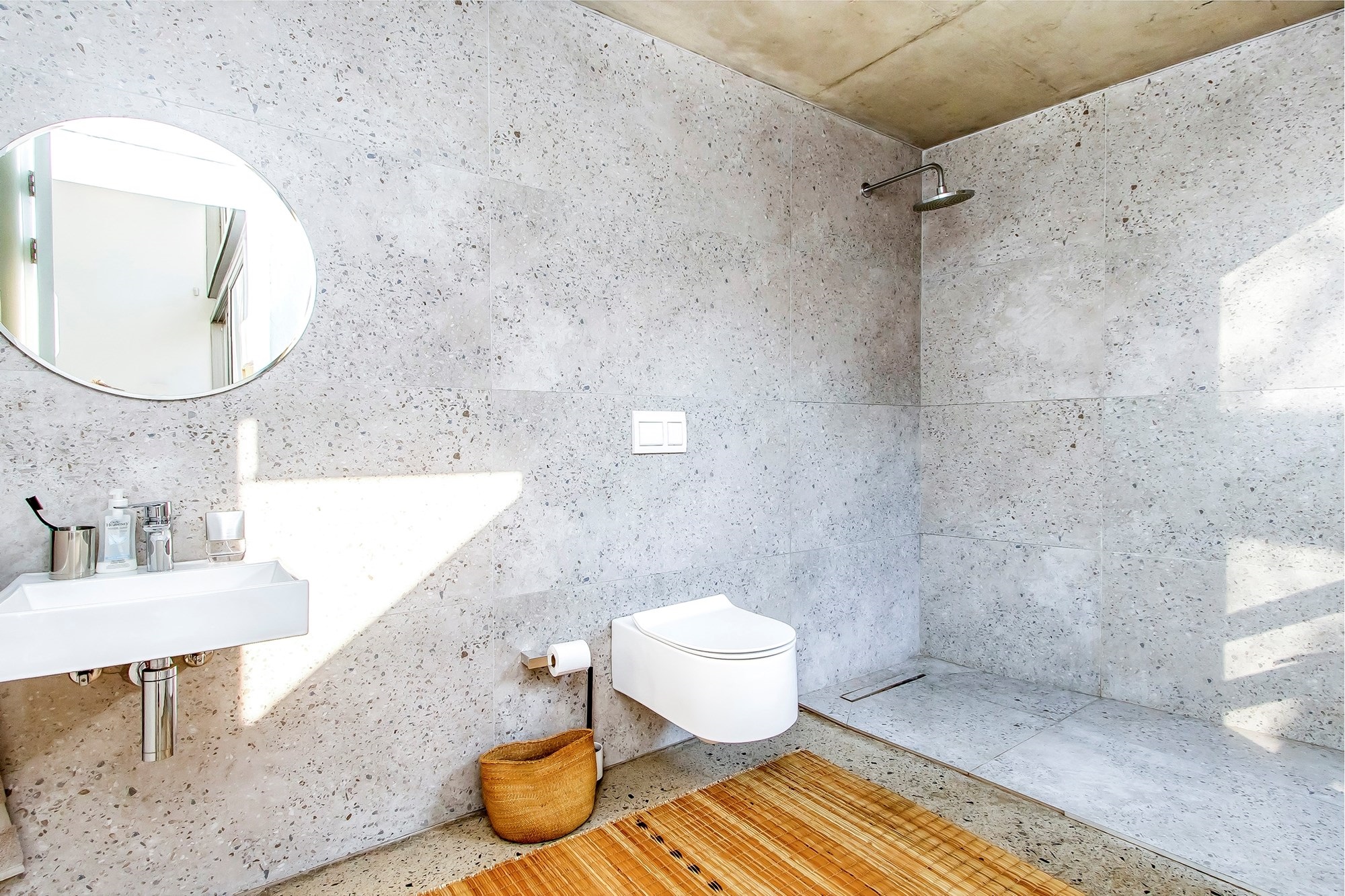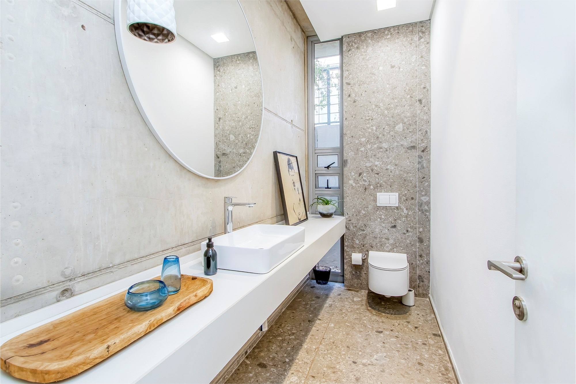 On the ground floor, a well-appointed guest bedroom with an en-suite bathroom enjoys direct access to a serene private courtyard through sliding glass doors.