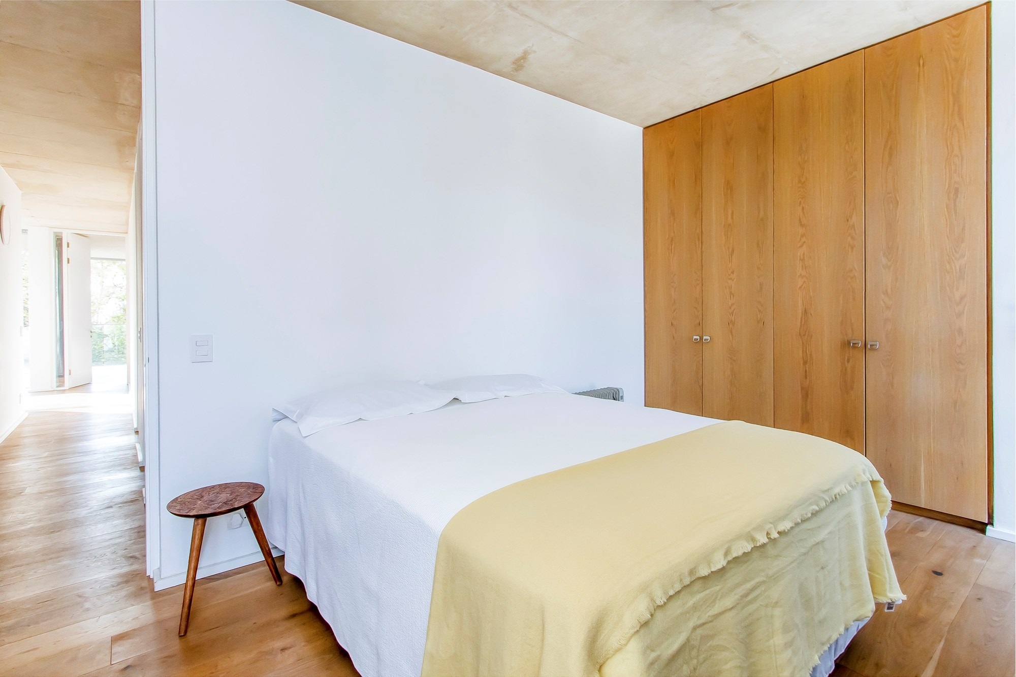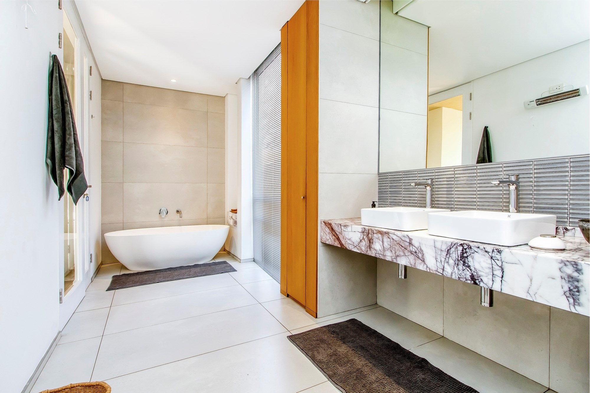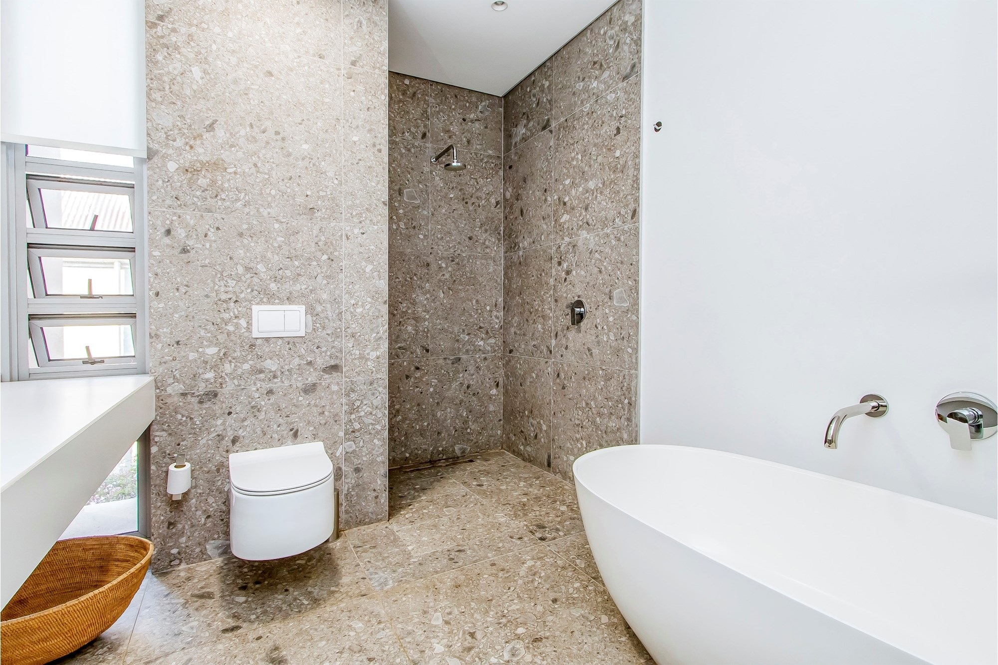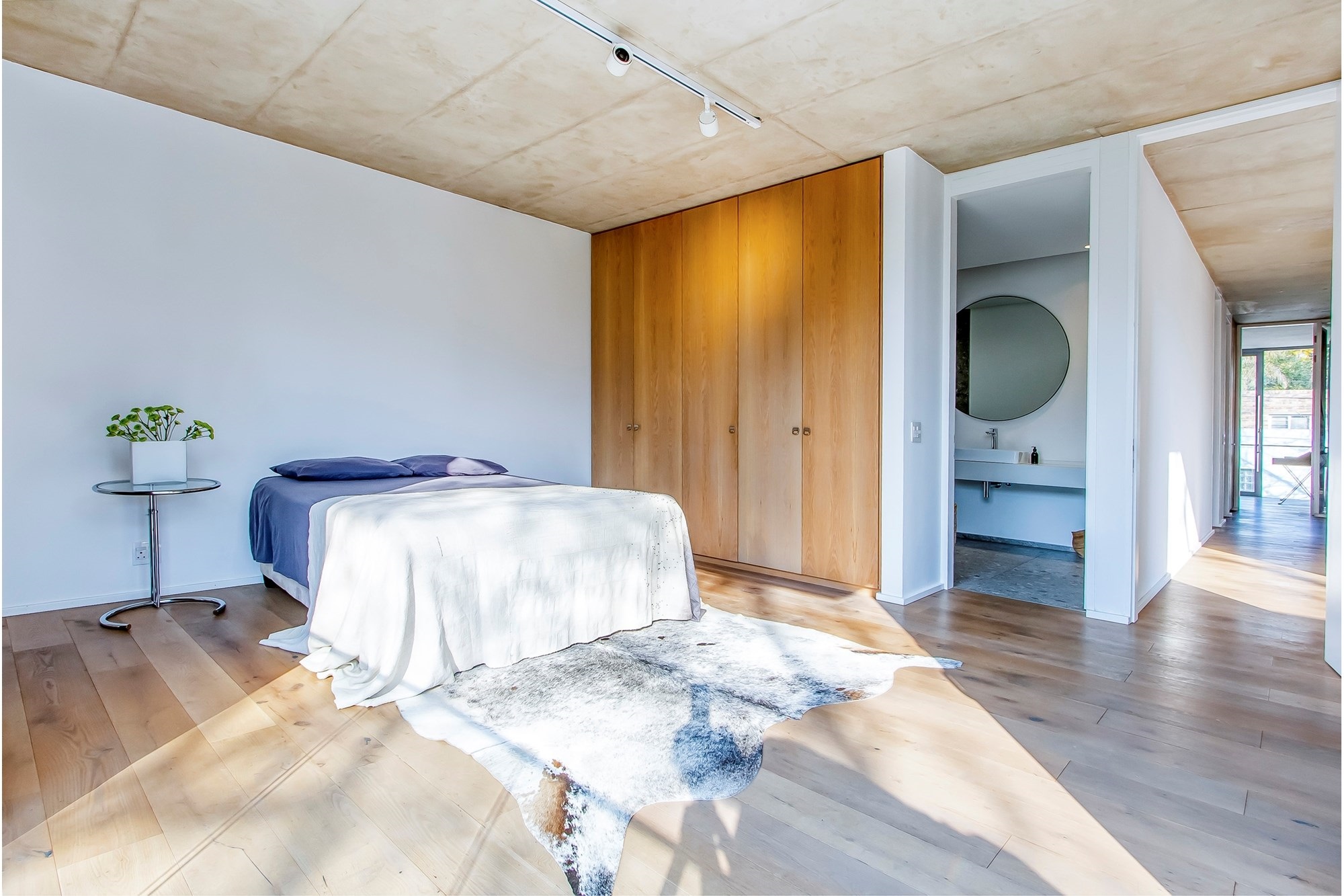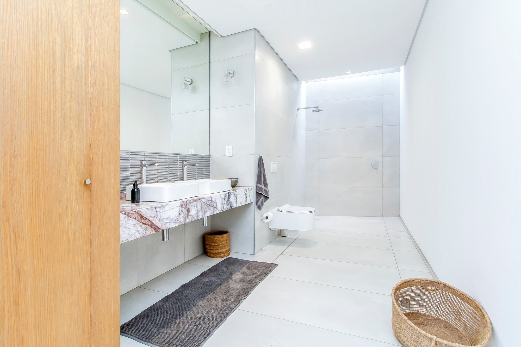 Upstairs, the bedroom wing offers tree-top views and a serene retreat. The sunlit master suite features a private deck, walk-in dressing room, and a spa-style bathroom with a free-standing bath and twin vanities. Three additional bedrooms (one en-suite), two bathrooms, and generous storage complete the family living spaces.