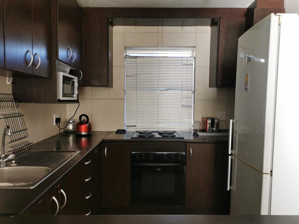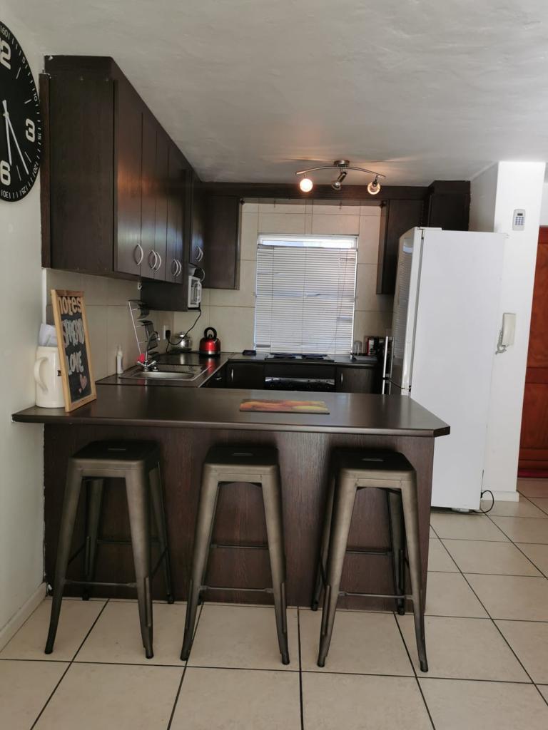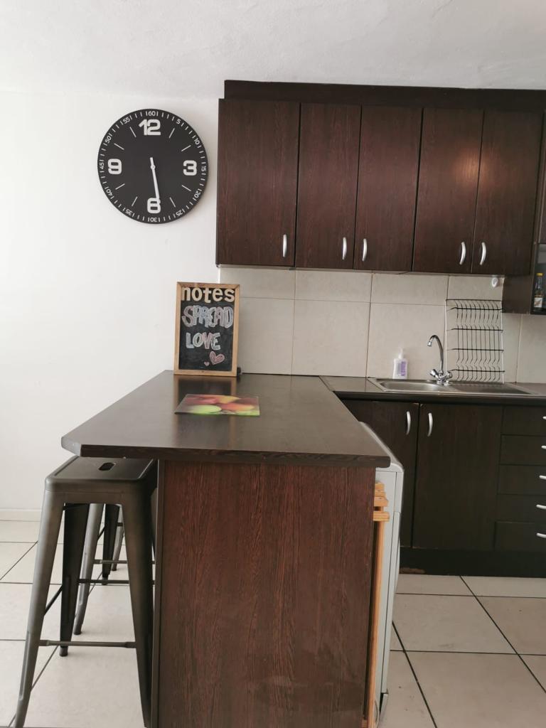 Open-plan fully fitted kitchen with built-in cupboards, stove and oven, centre island and tiled flooring - Downstairs
