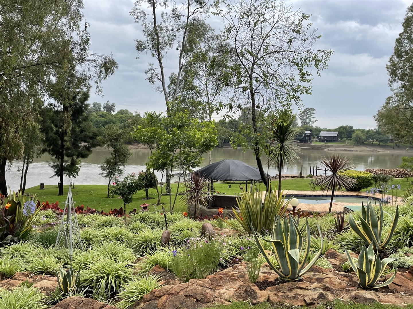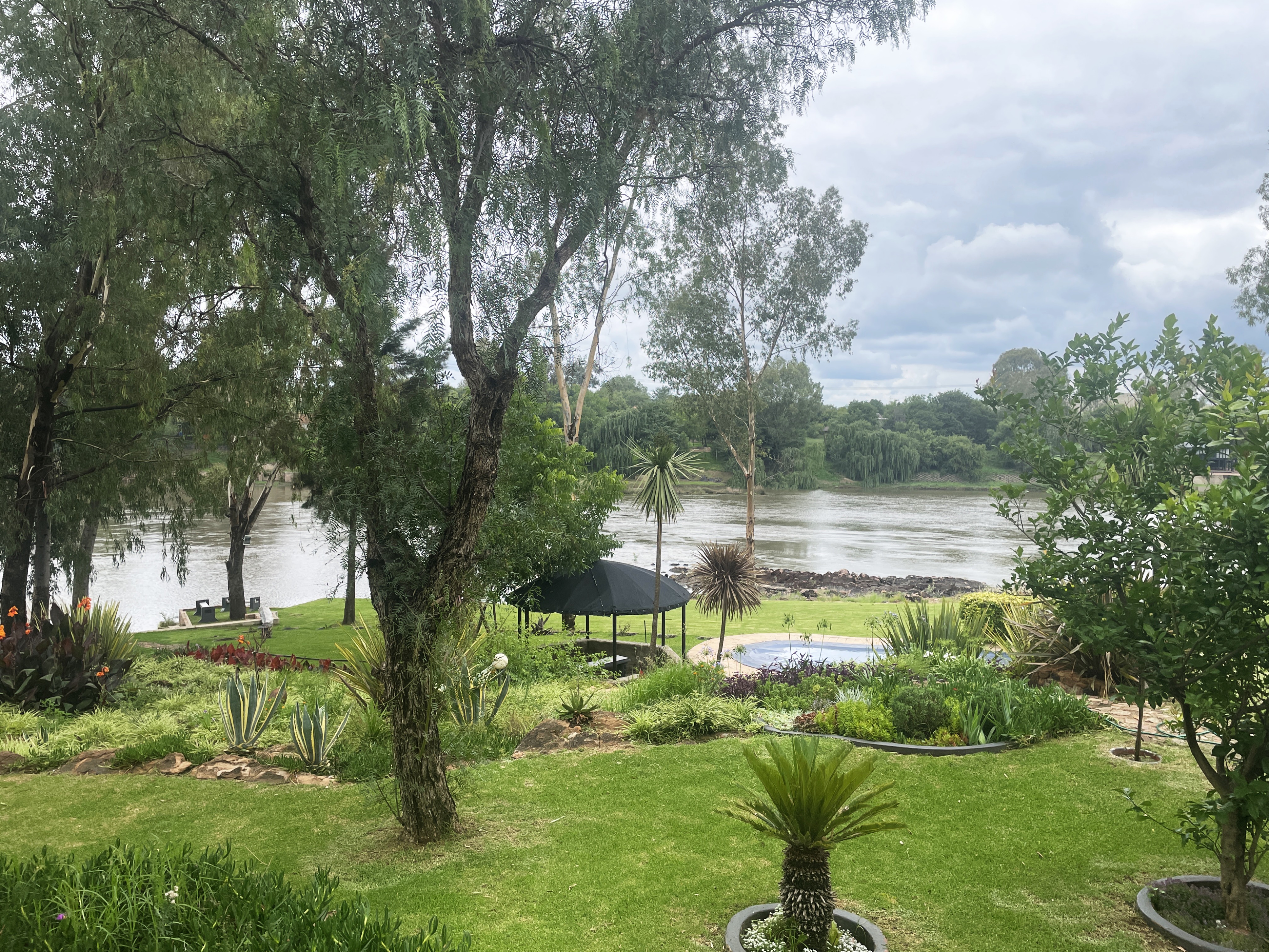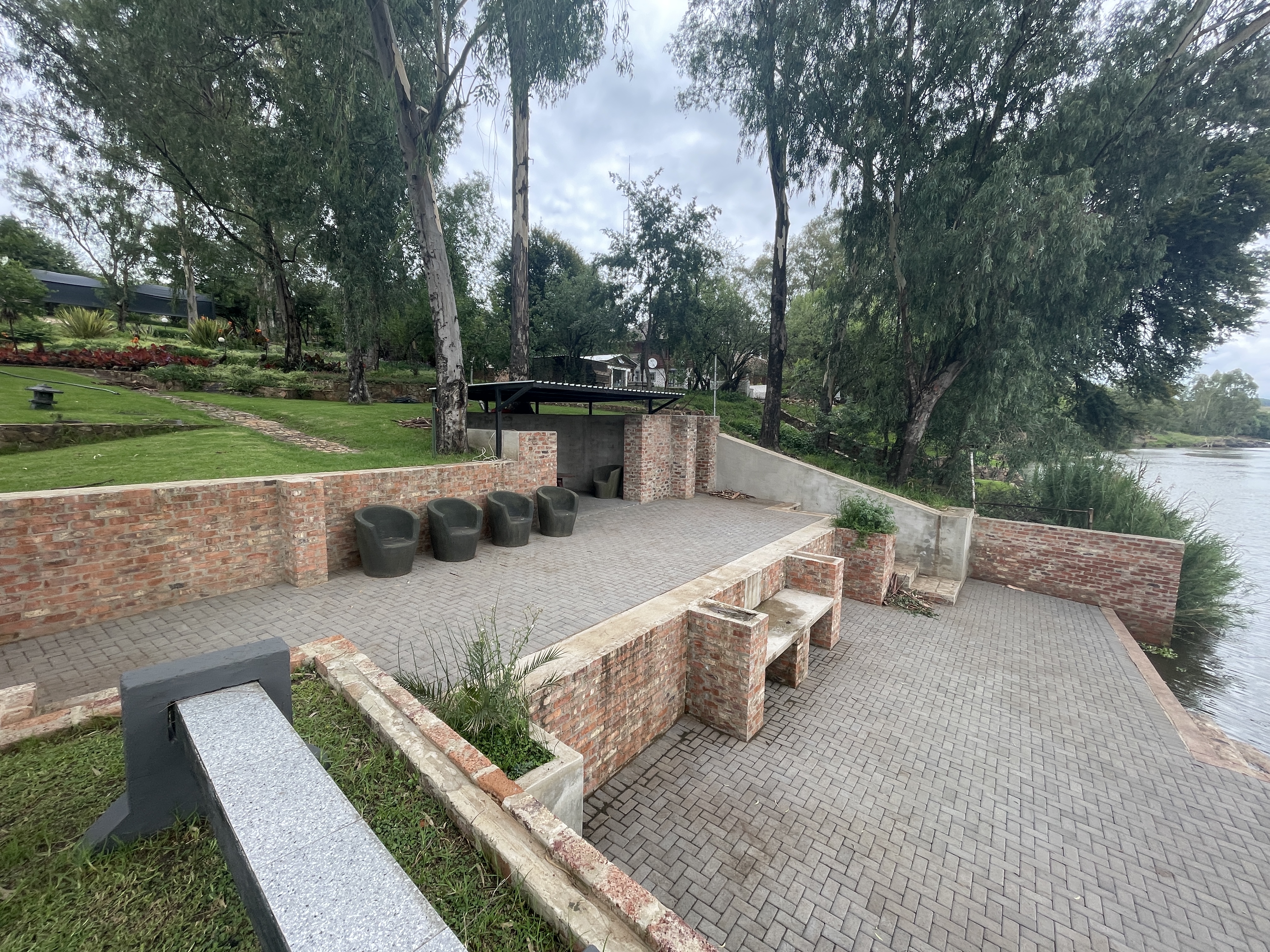 Recreational Spaces: The garden flows into expansive lawns and leads to a developed riverbank with a covered entertainment area, built-in braai, and cement platforms for fishing or water activities. Retaining walls provide added security during river floods.
