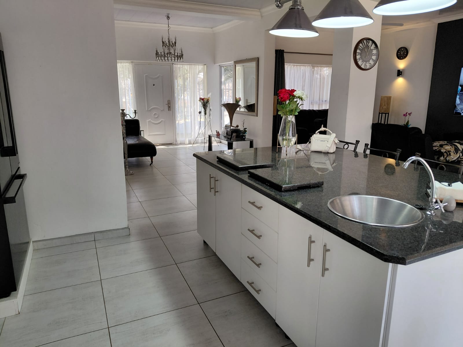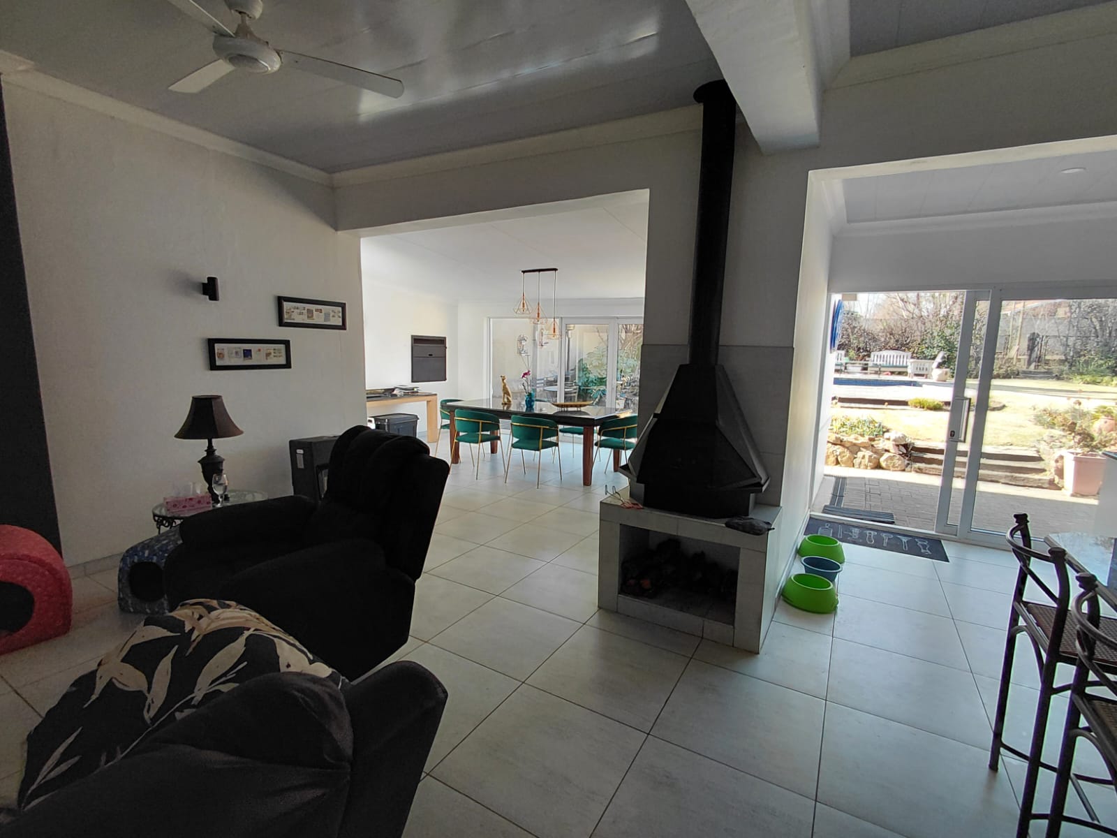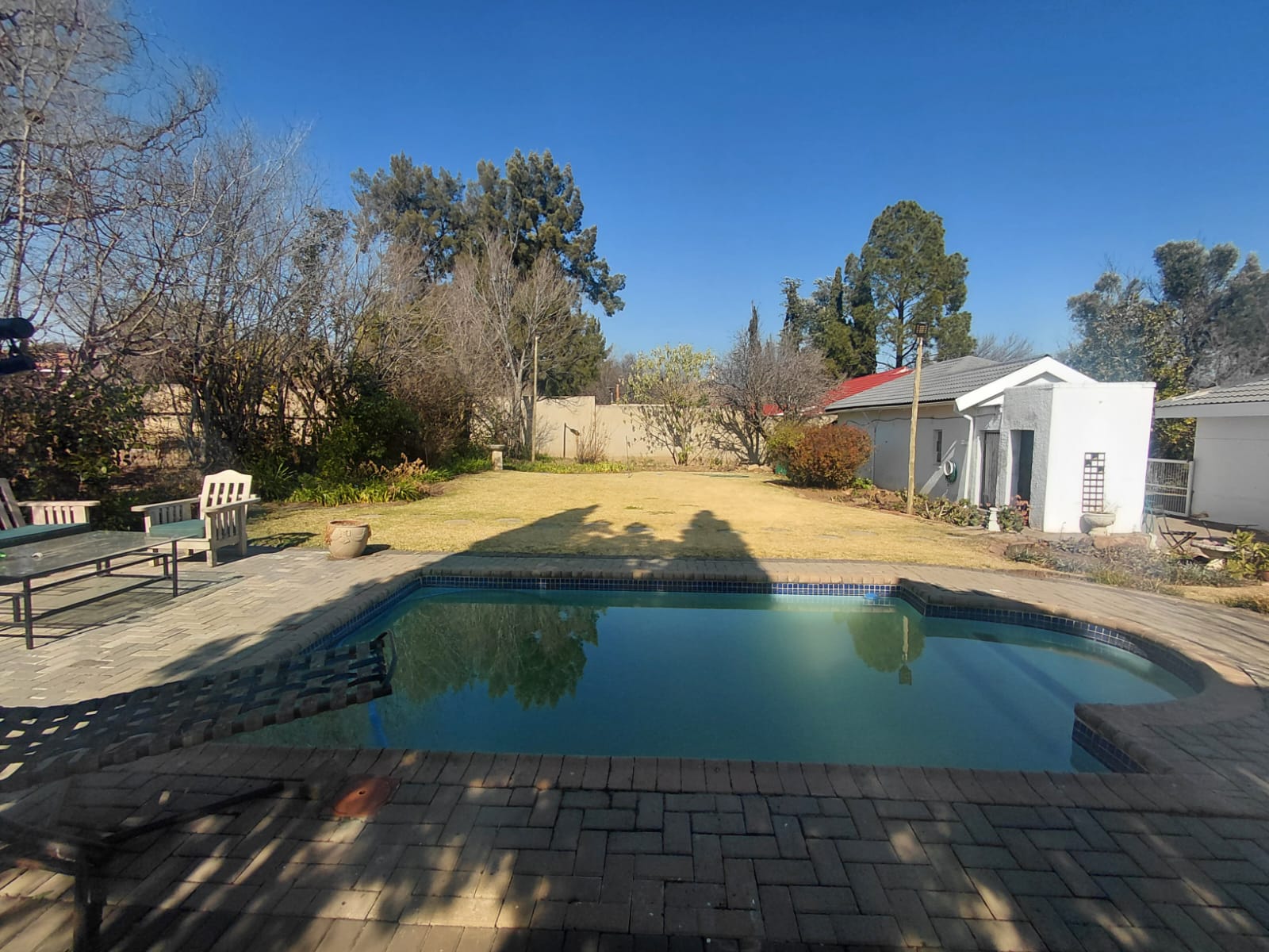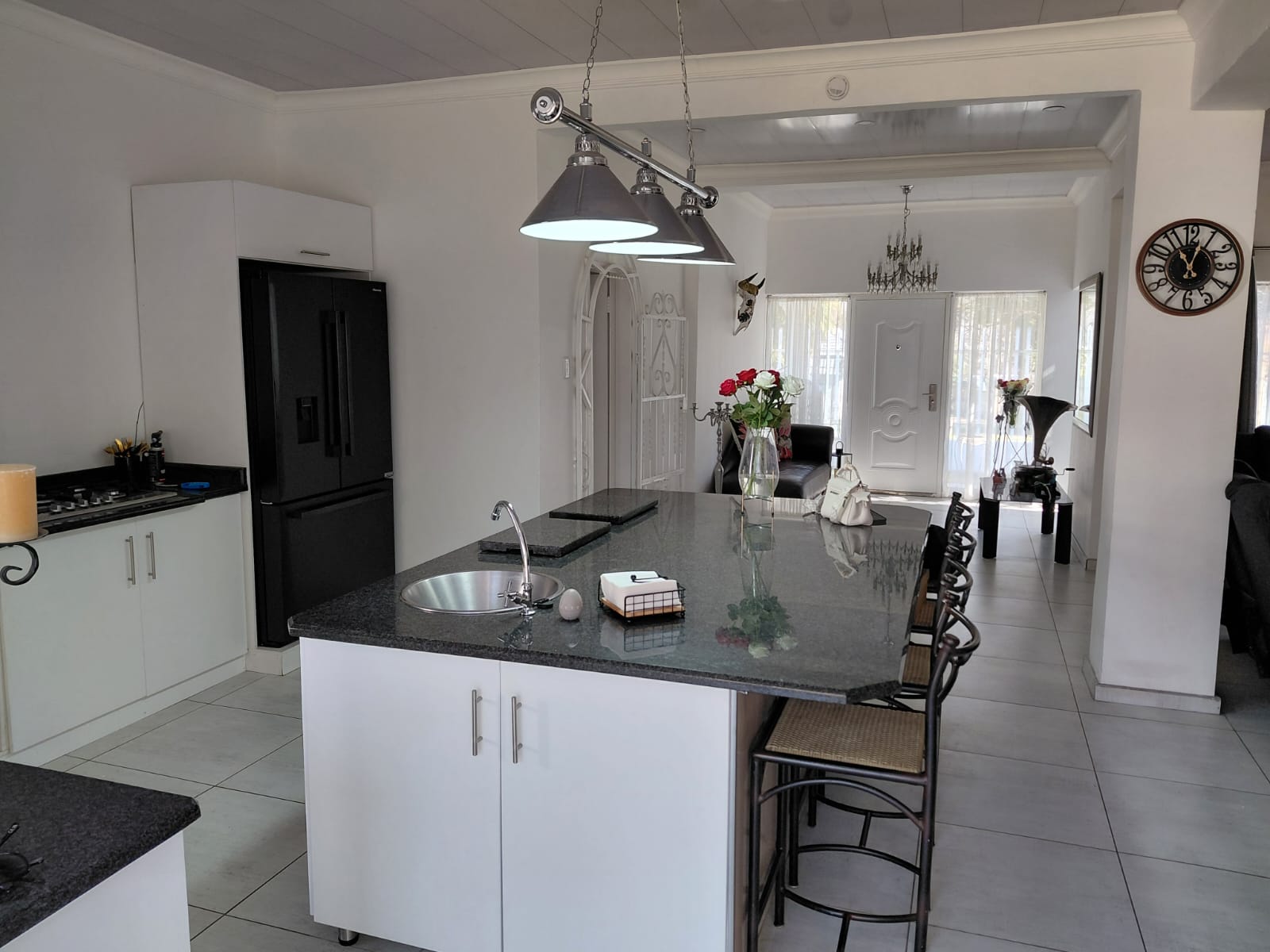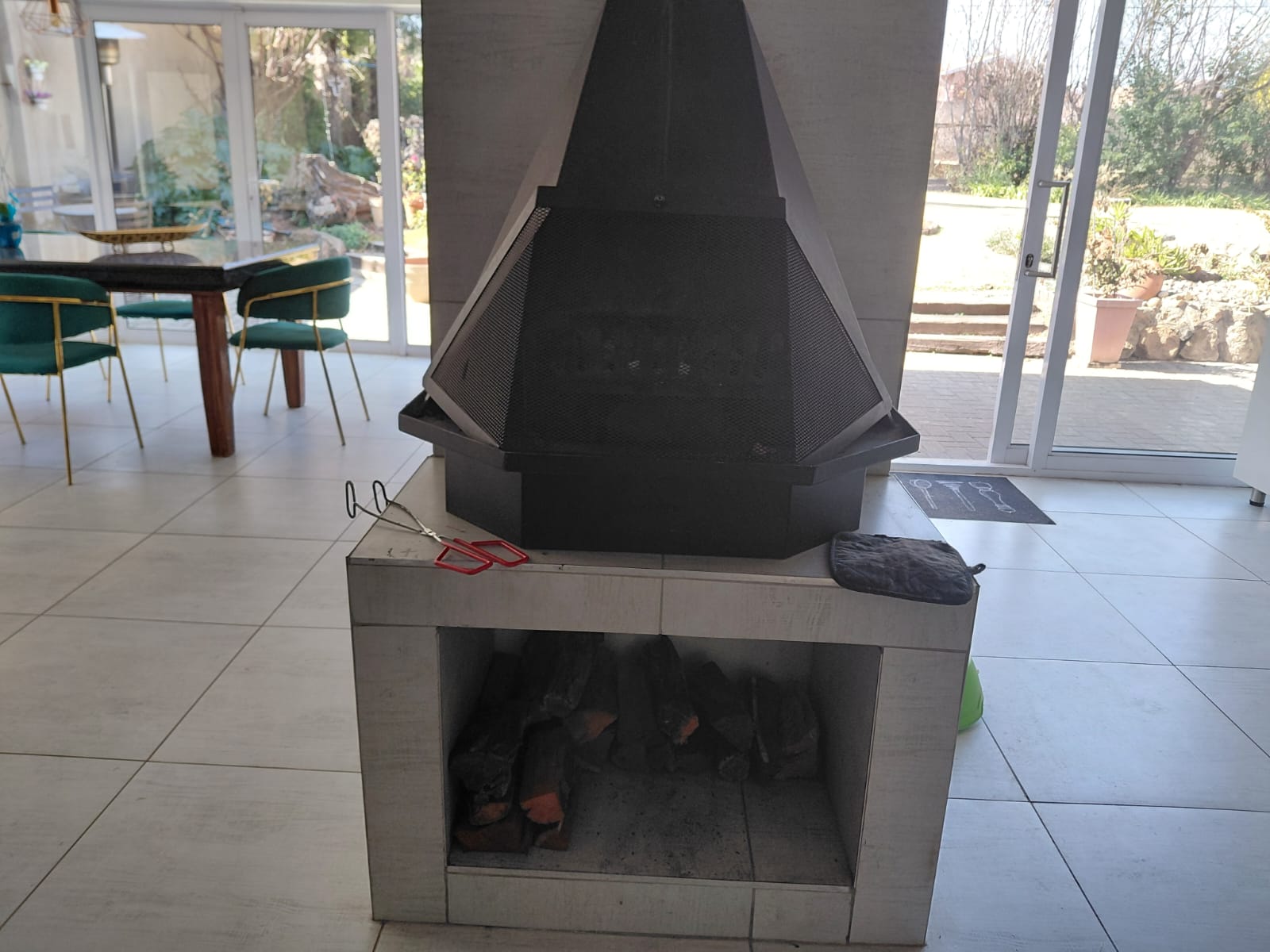 The elegant dining room features a luxurious marble table with stylish chairs (included in the sale), a built-in braai, and a large window overlooking the sparkling swimming pool and lush garden—bringing the outdoors in.