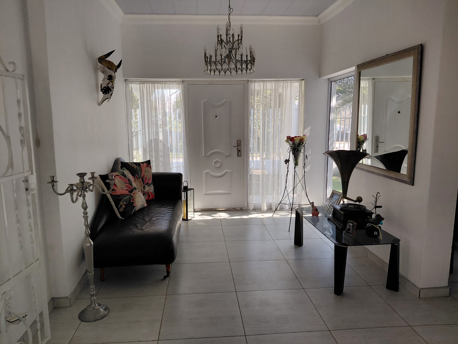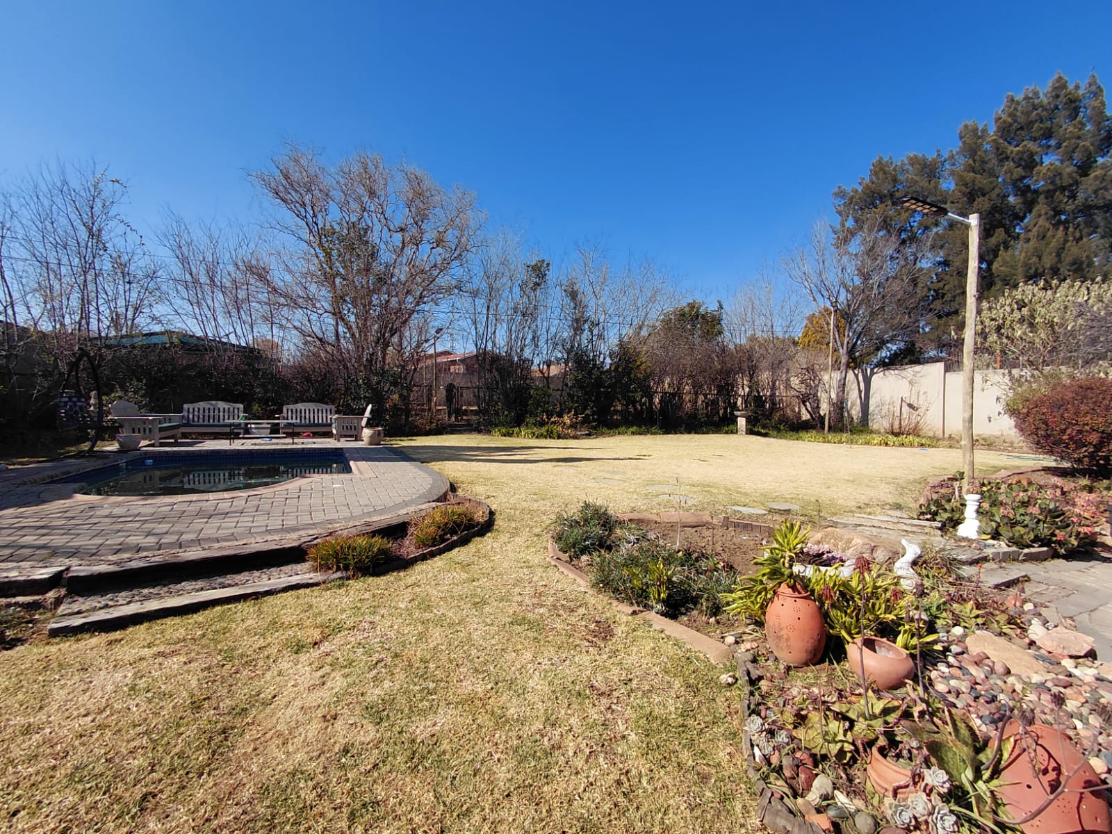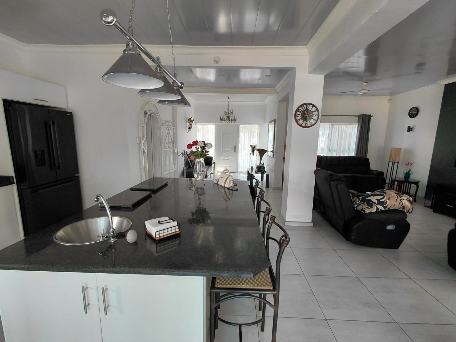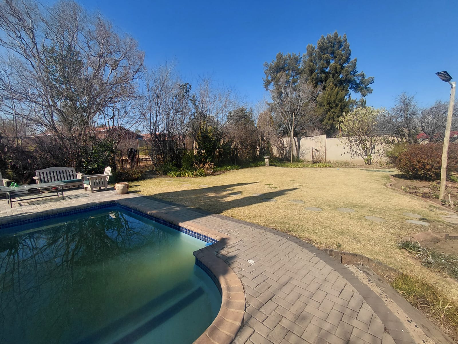 The elegant dining room features a luxurious marble table with stylish chairs (included in the sale), a built-in braai, and a large window overlooking the sparkling swimming pool and lush garden—bringing the outdoors in.