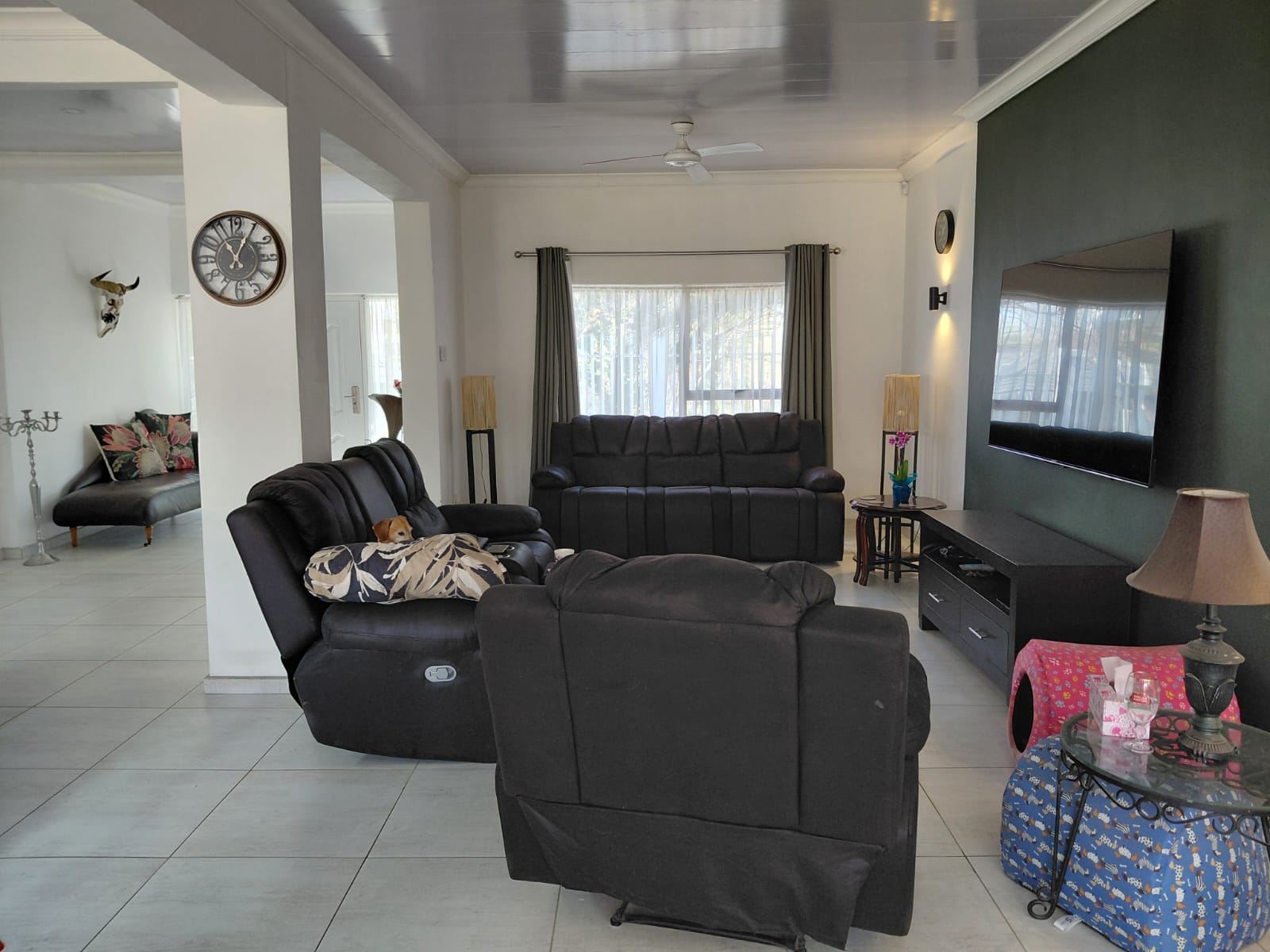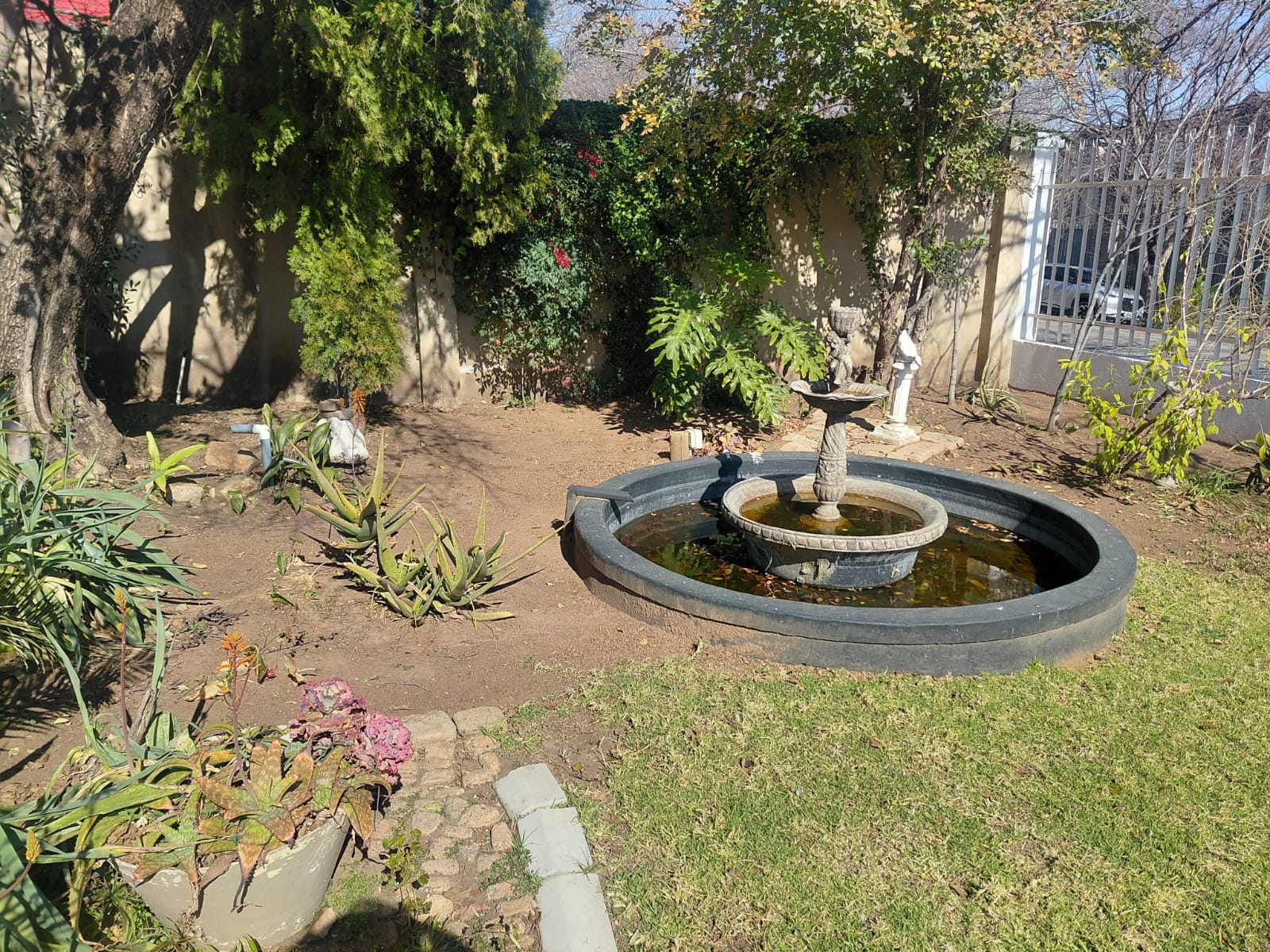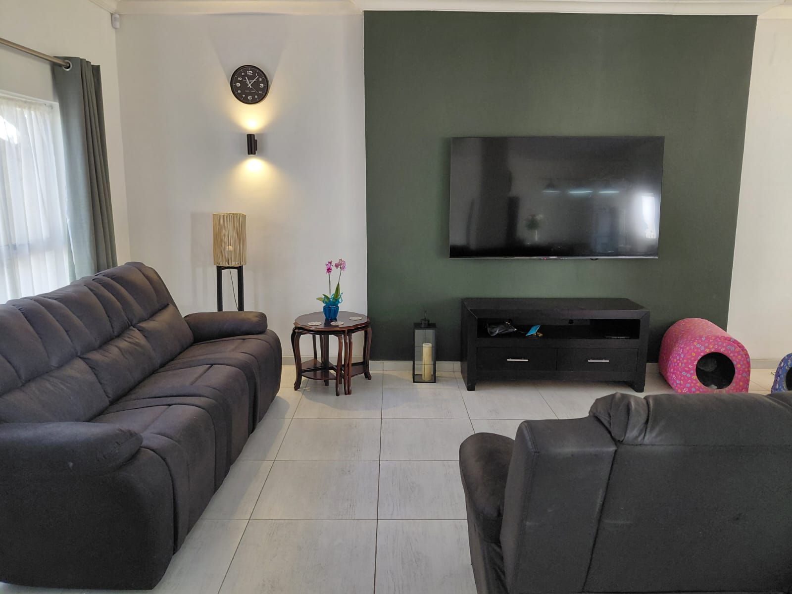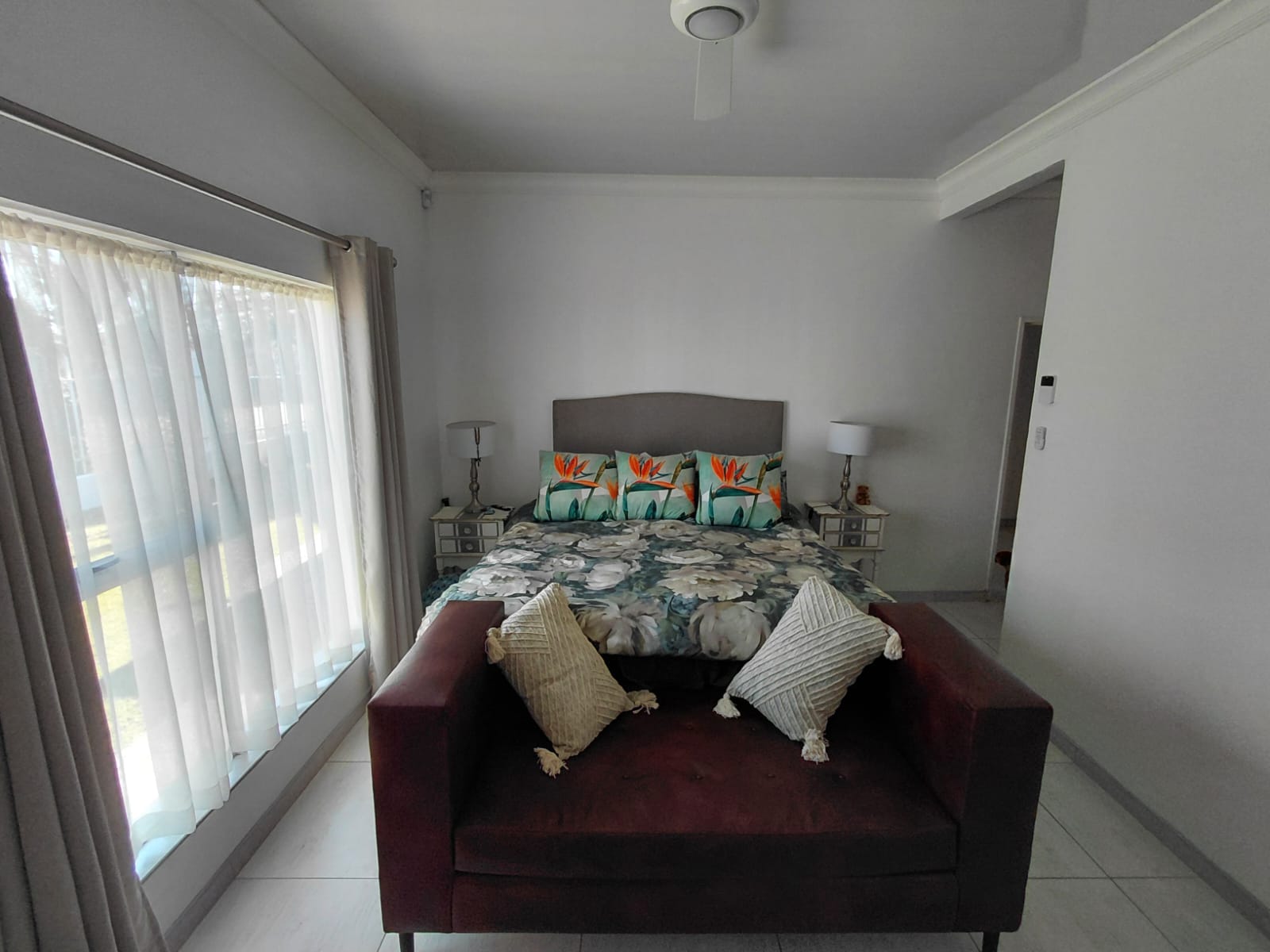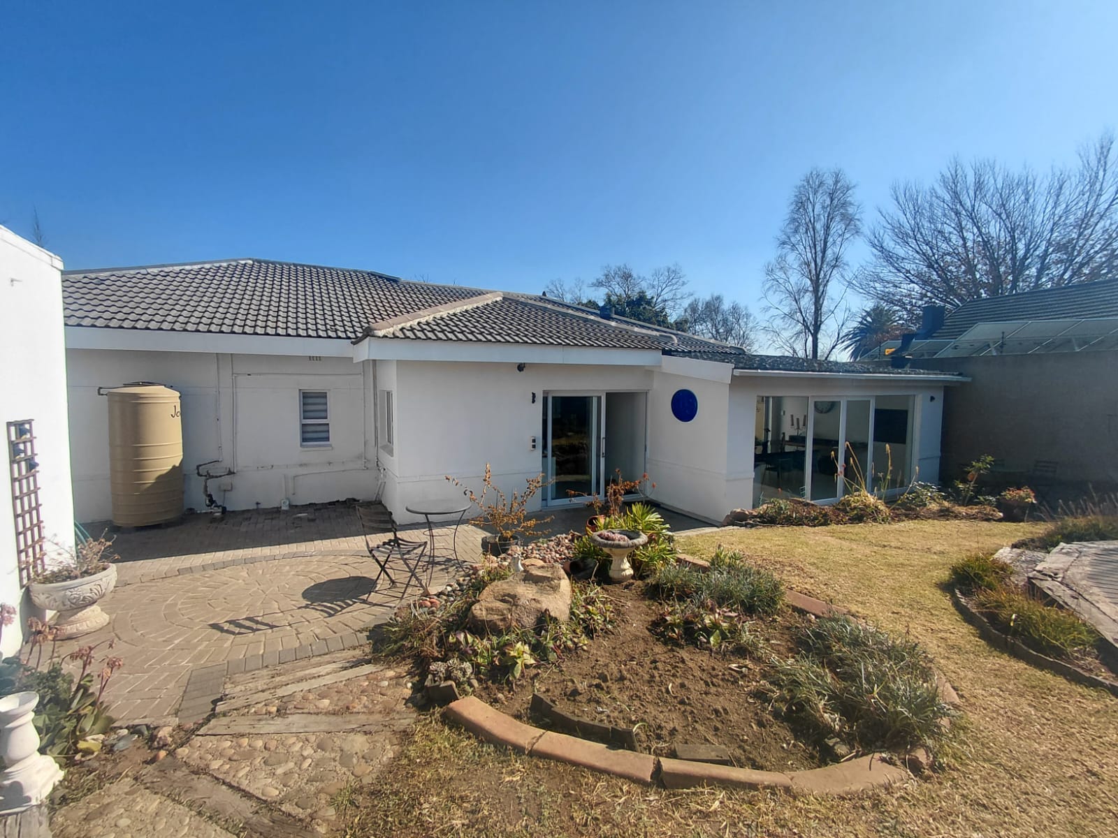 The elegant dining room features a luxurious marble table with stylish chairs (included in the sale), a built-in braai, and a large window overlooking the sparkling swimming pool and lush garden—bringing the outdoors in.