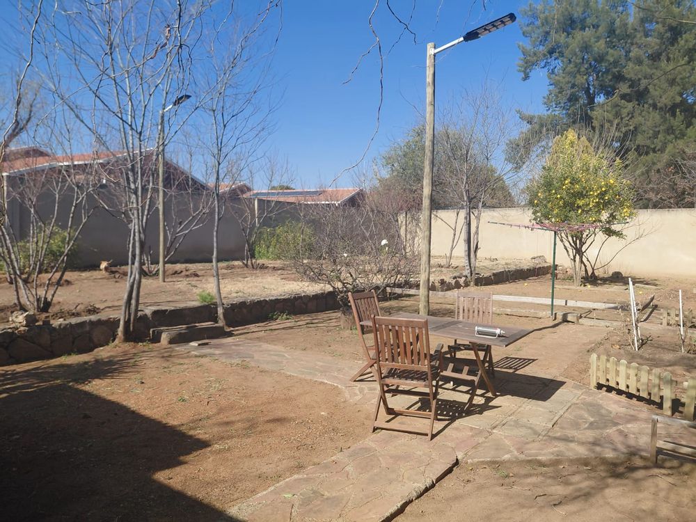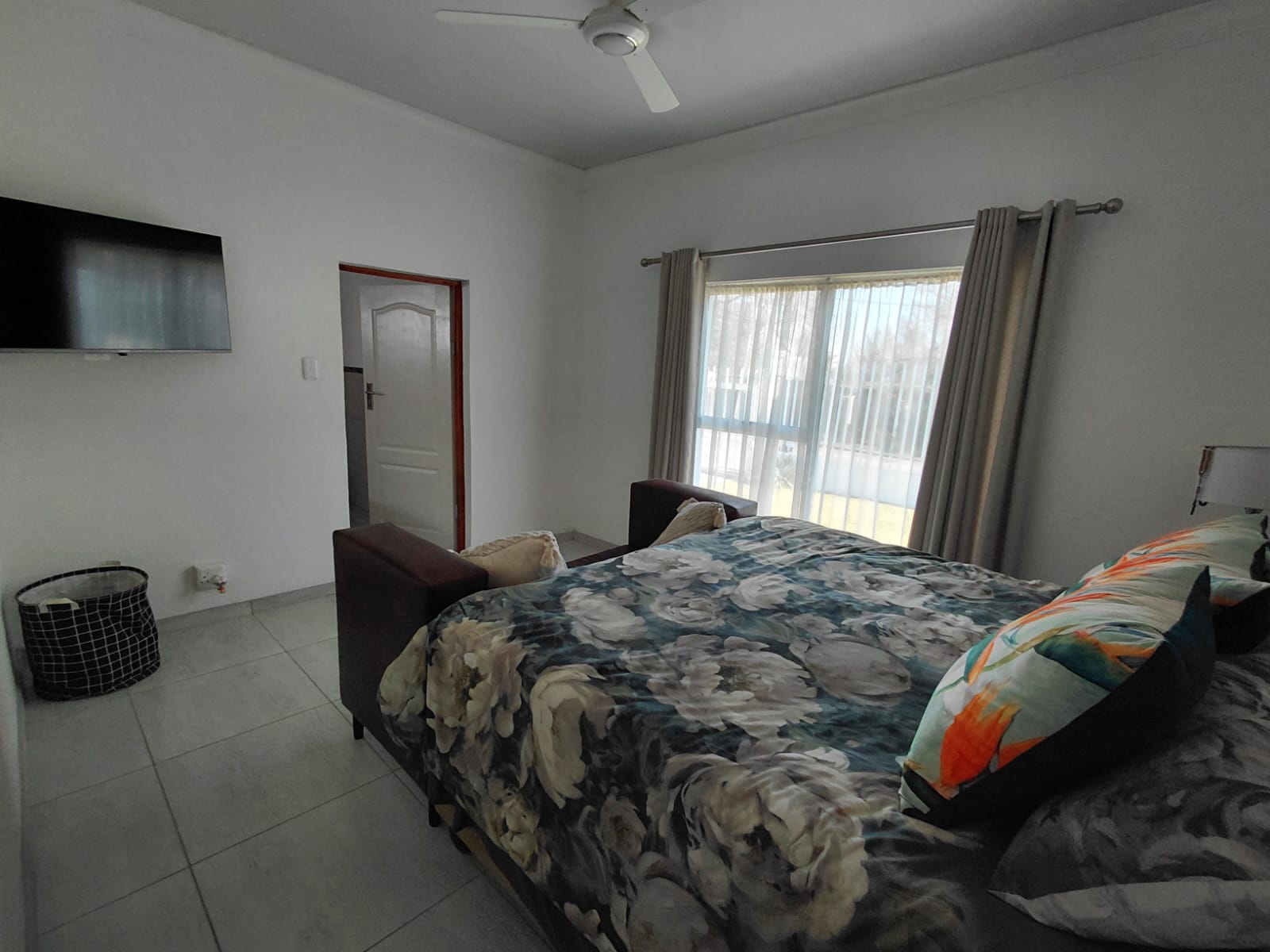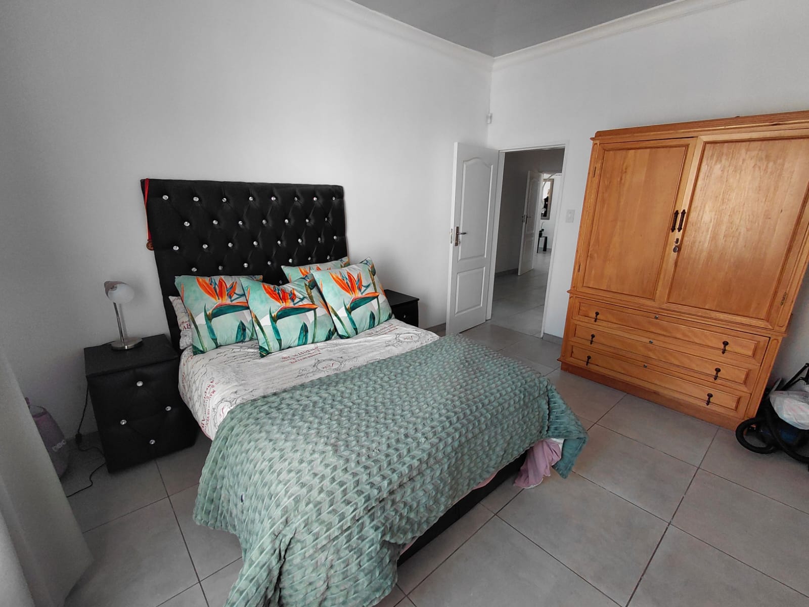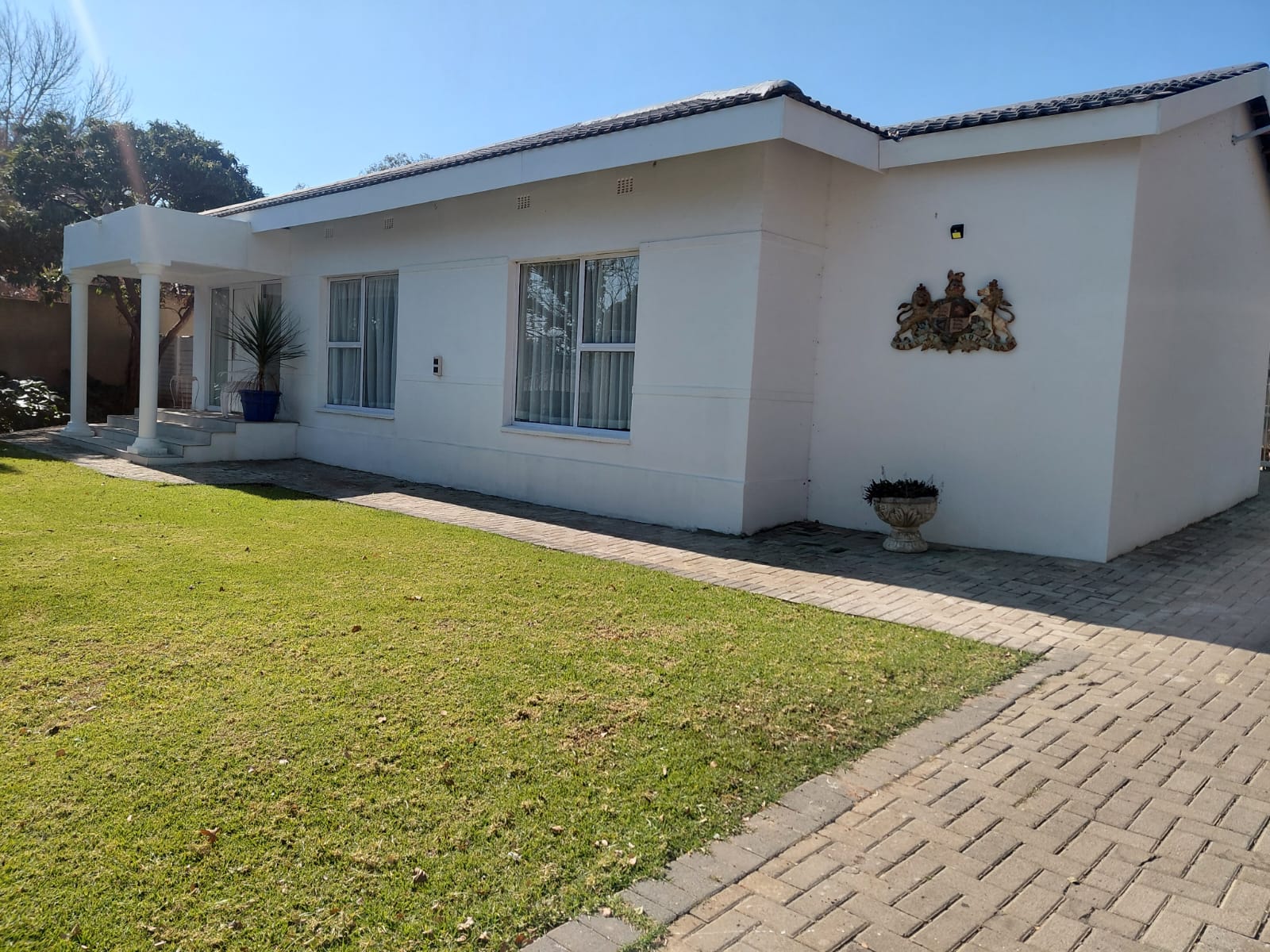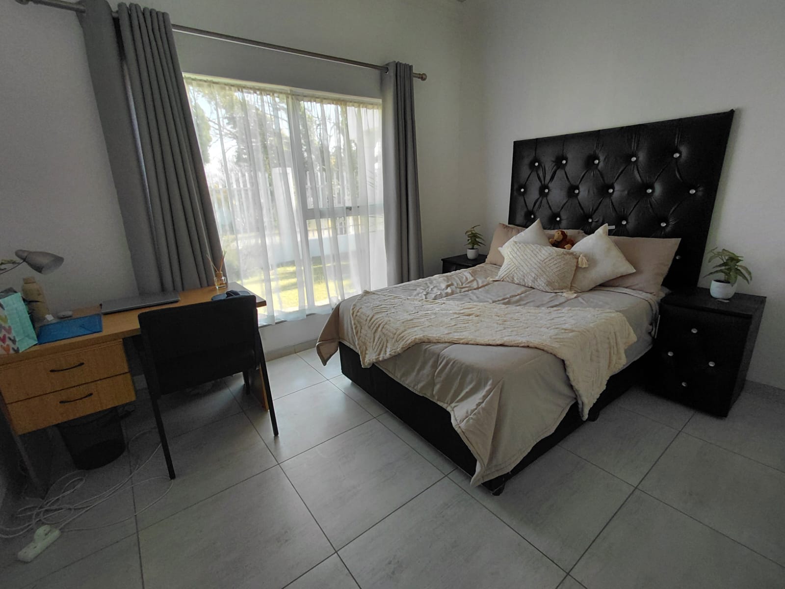 The elegant dining room features a luxurious marble table with stylish chairs (included in the sale), a built-in braai, and a large window overlooking the sparkling swimming pool and lush garden—bringing the outdoors in.