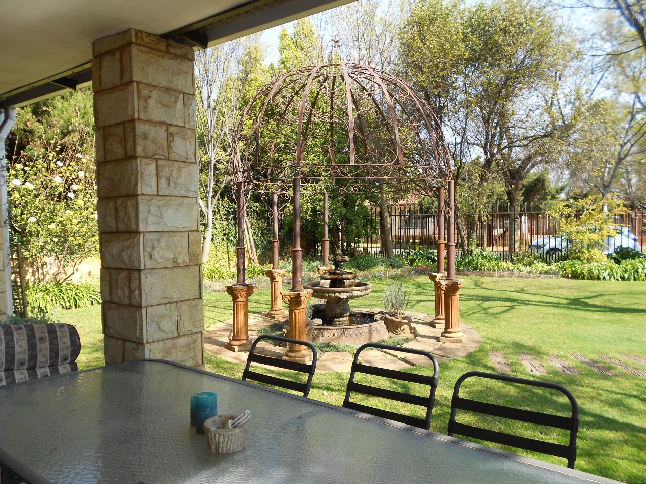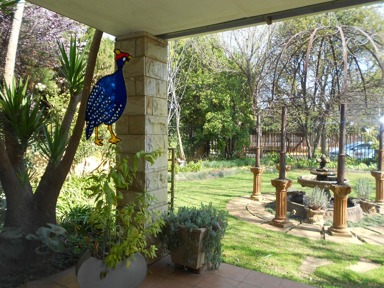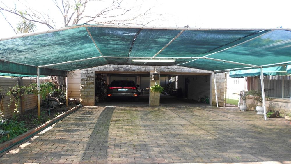 Additional highlights include a borehole, a water tank equipped with a pressure pump, a generator switch, and an alarm system with outdoor beams, double garage, and a double carport all set within a beautifully landscaped garden.