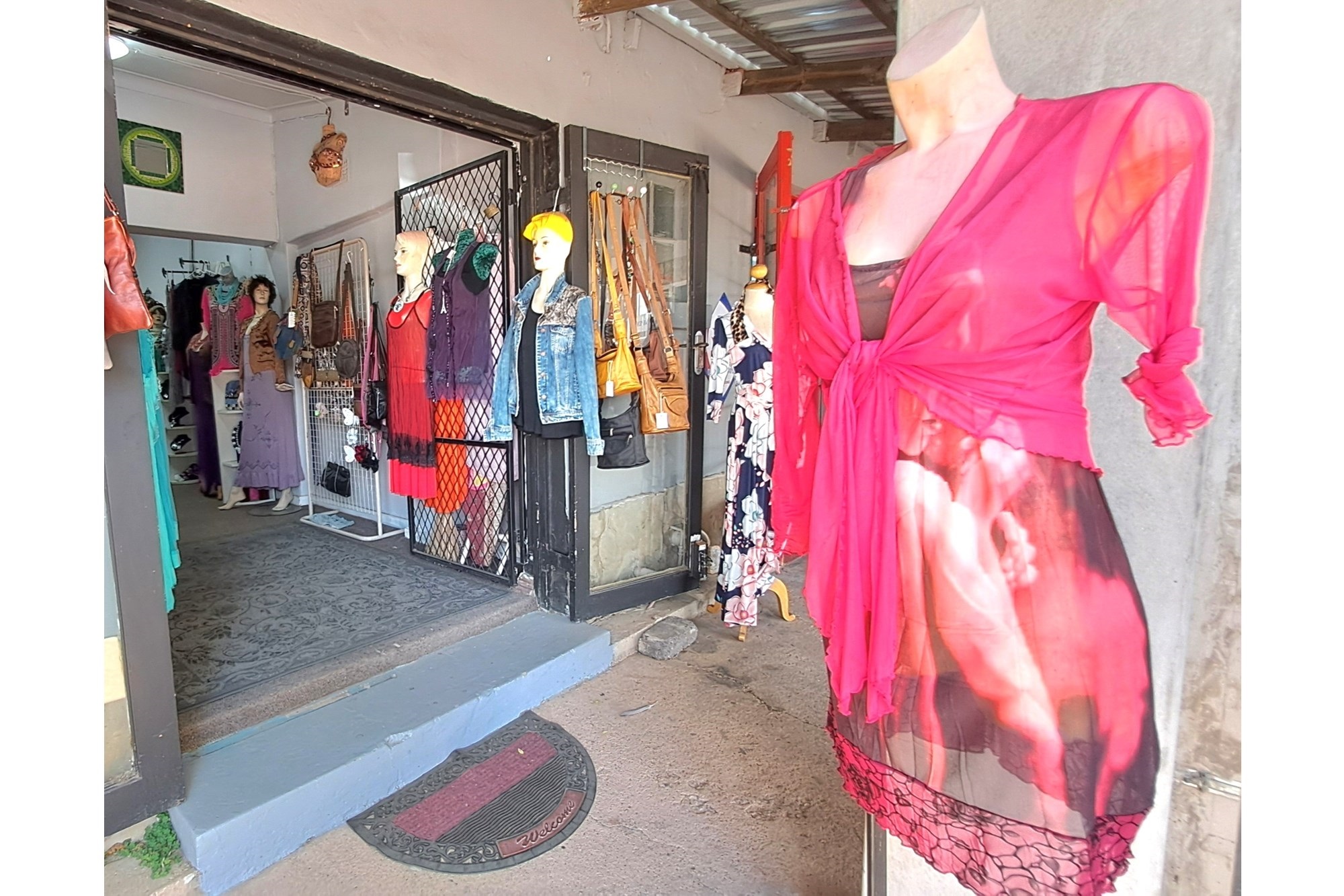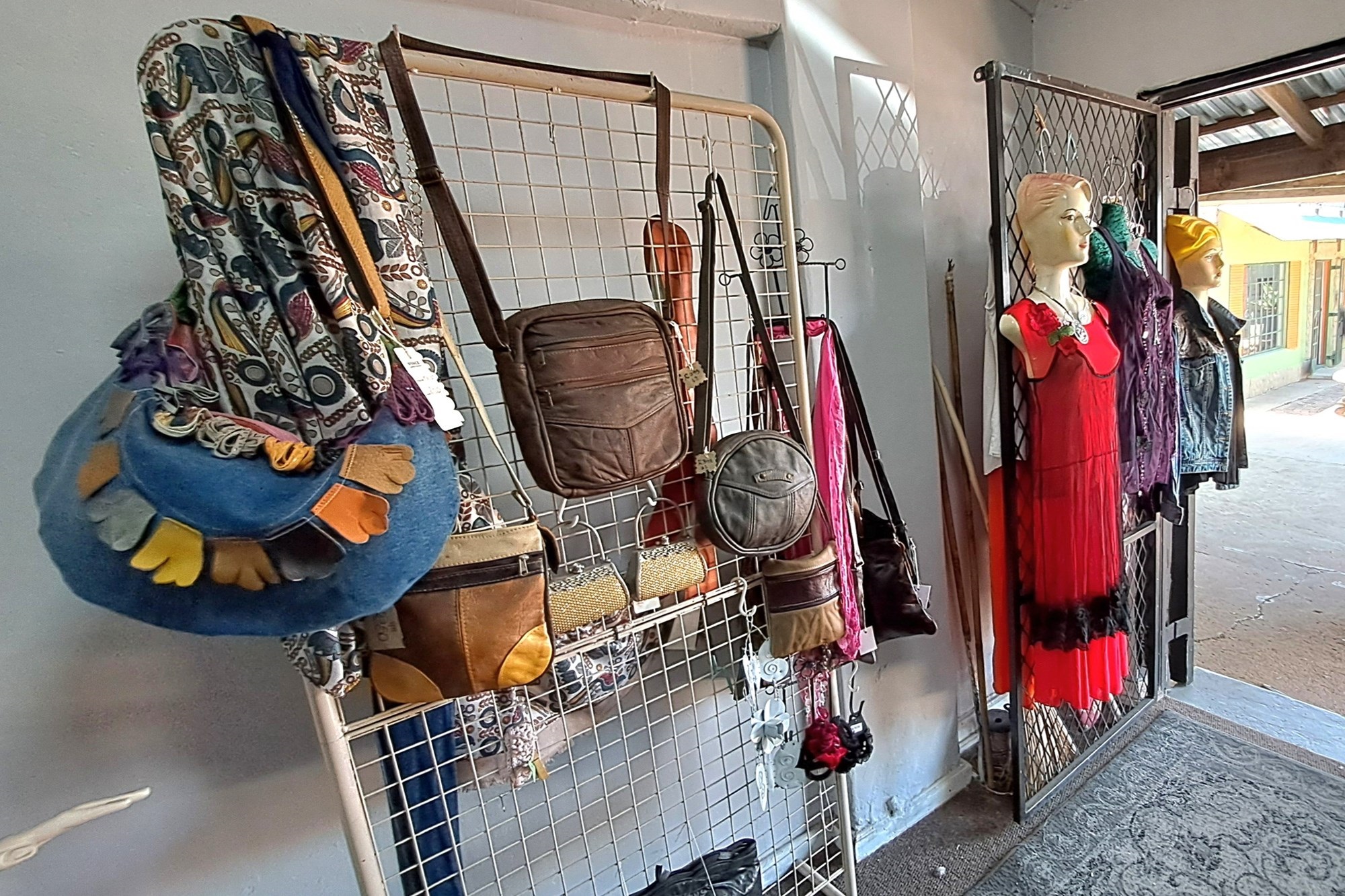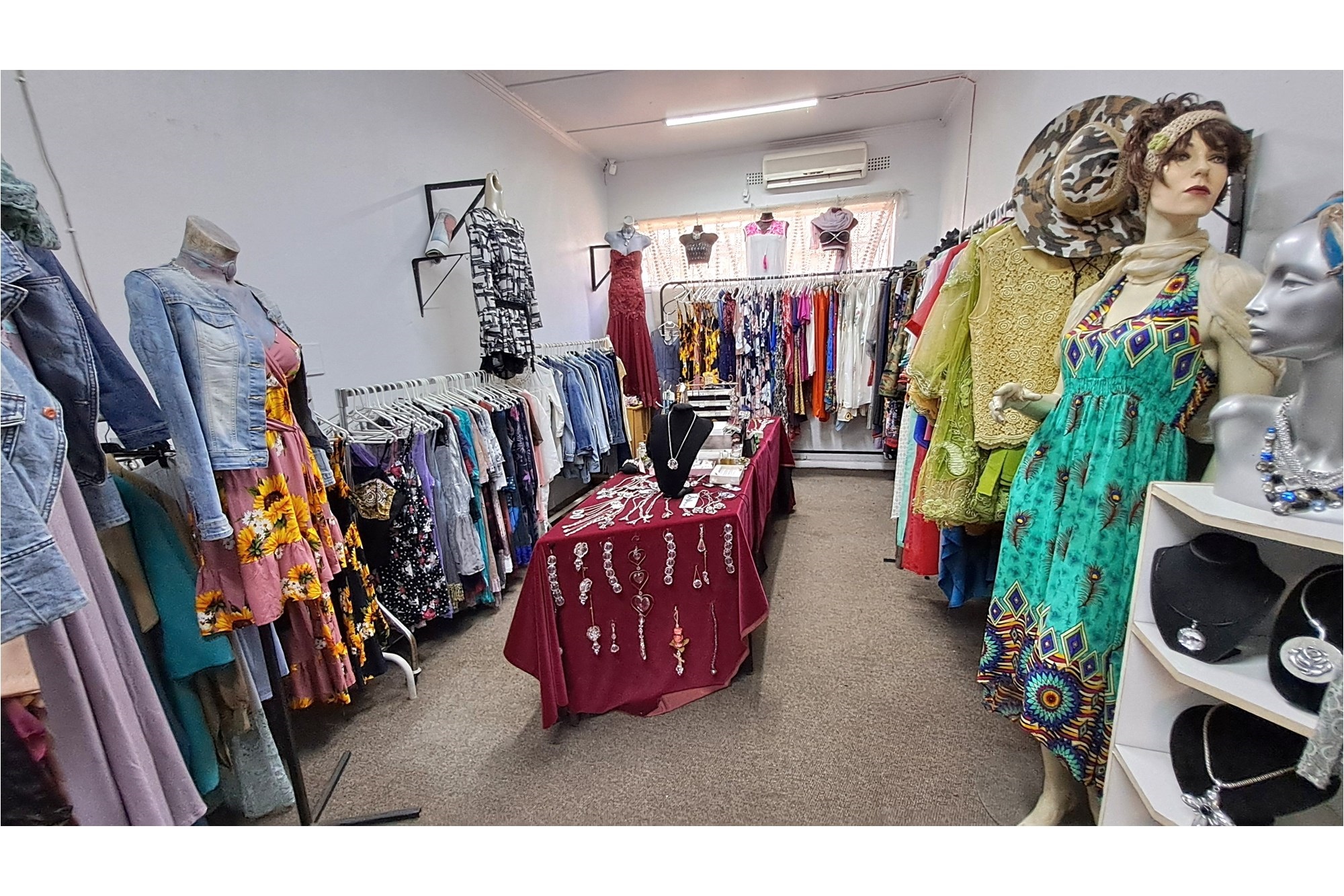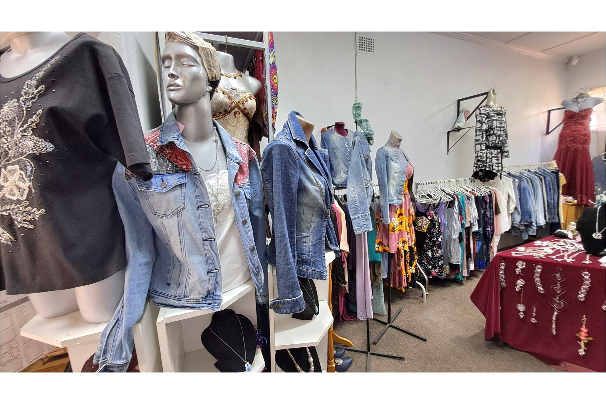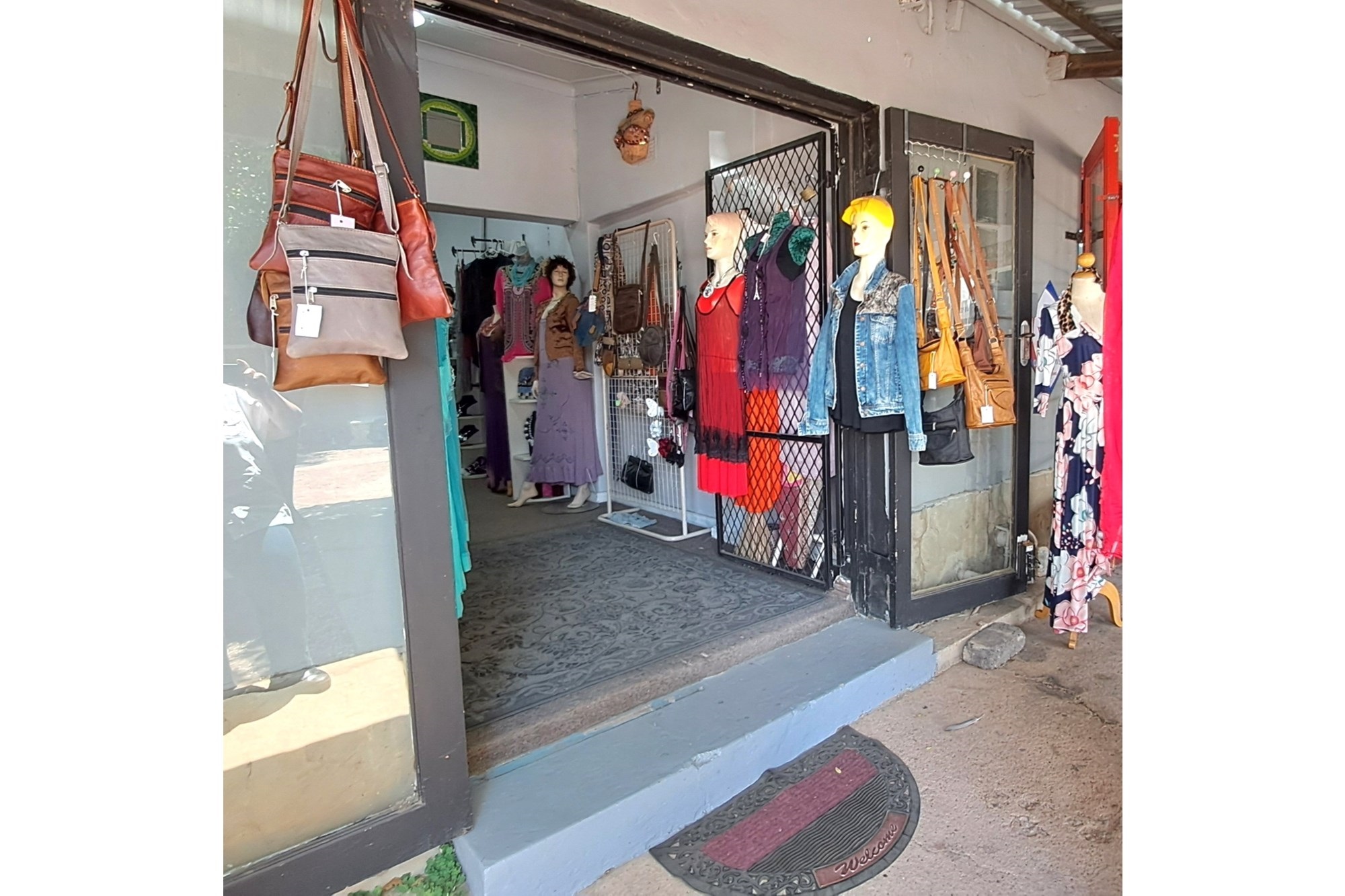 Small boutique shop for sale, offering clothing, jewelry, leather handbags, and other leather items.