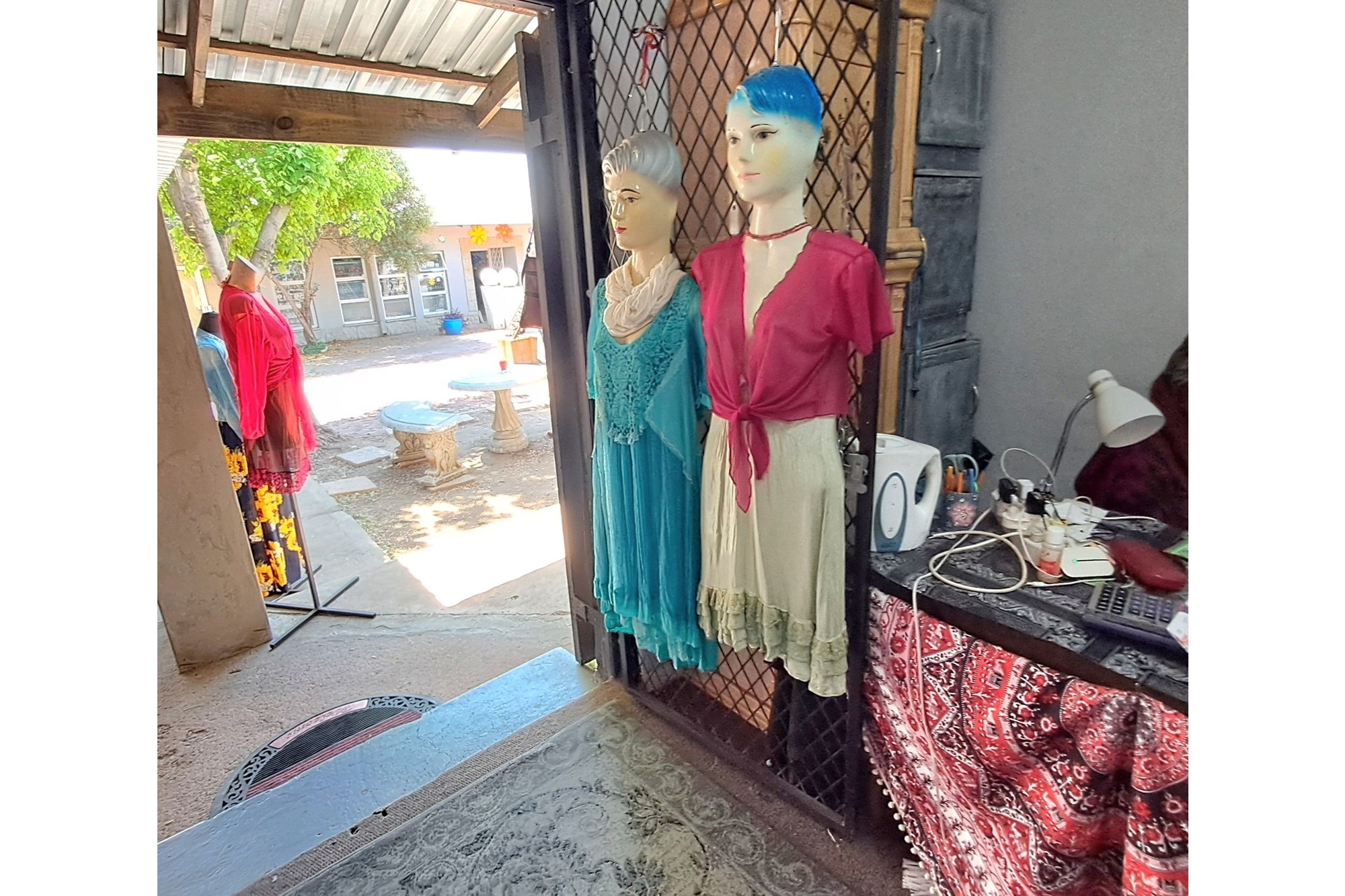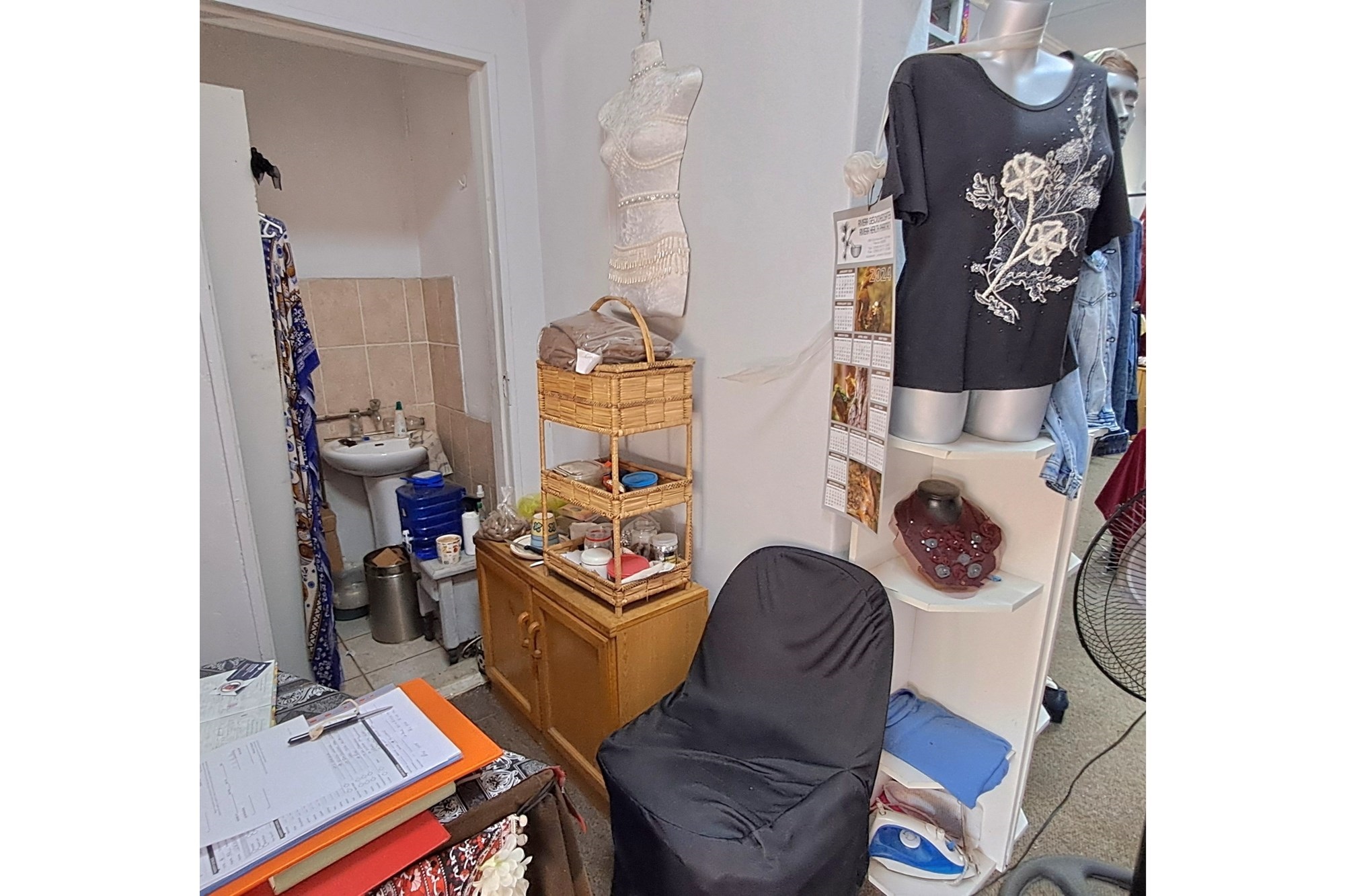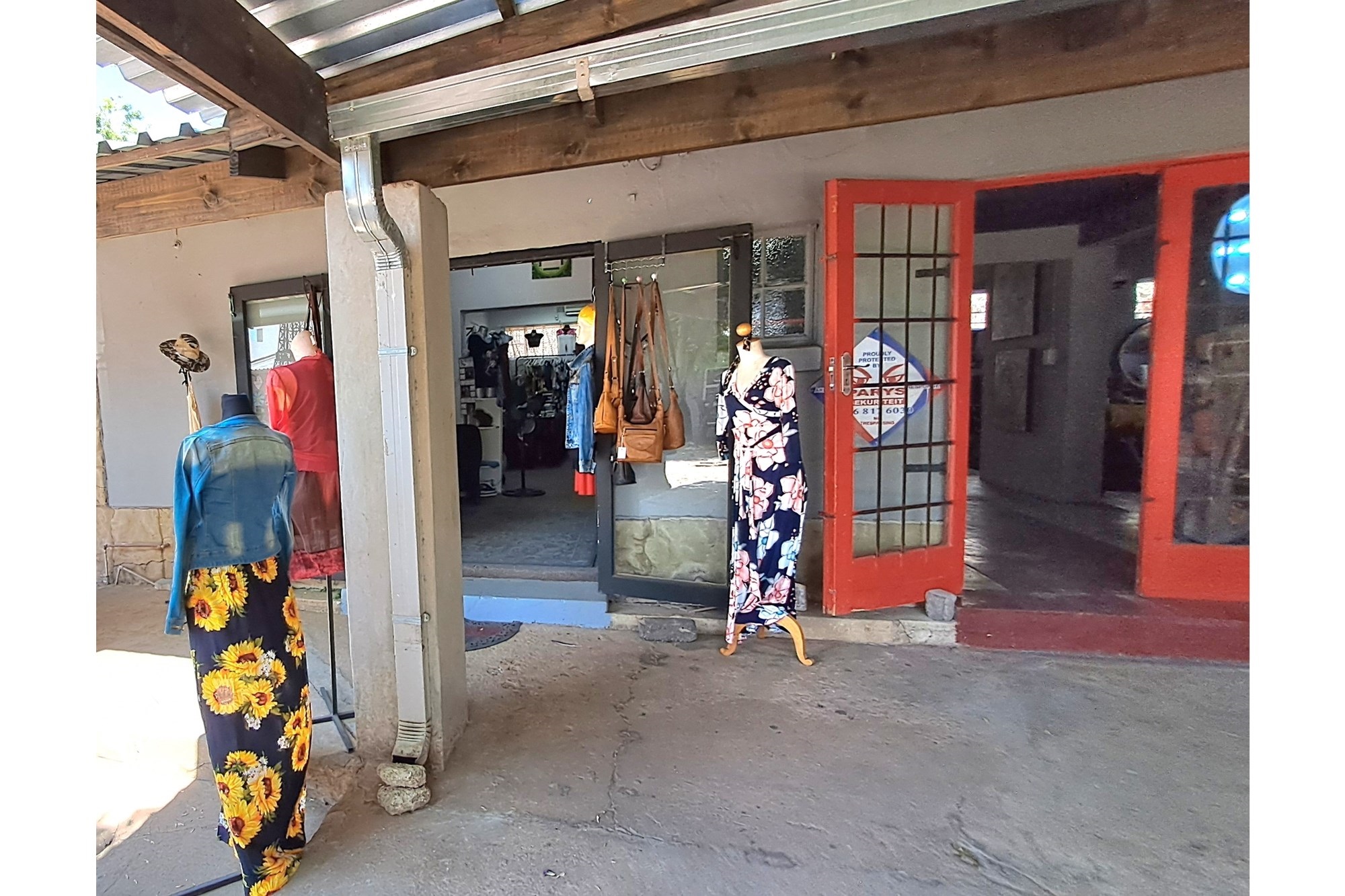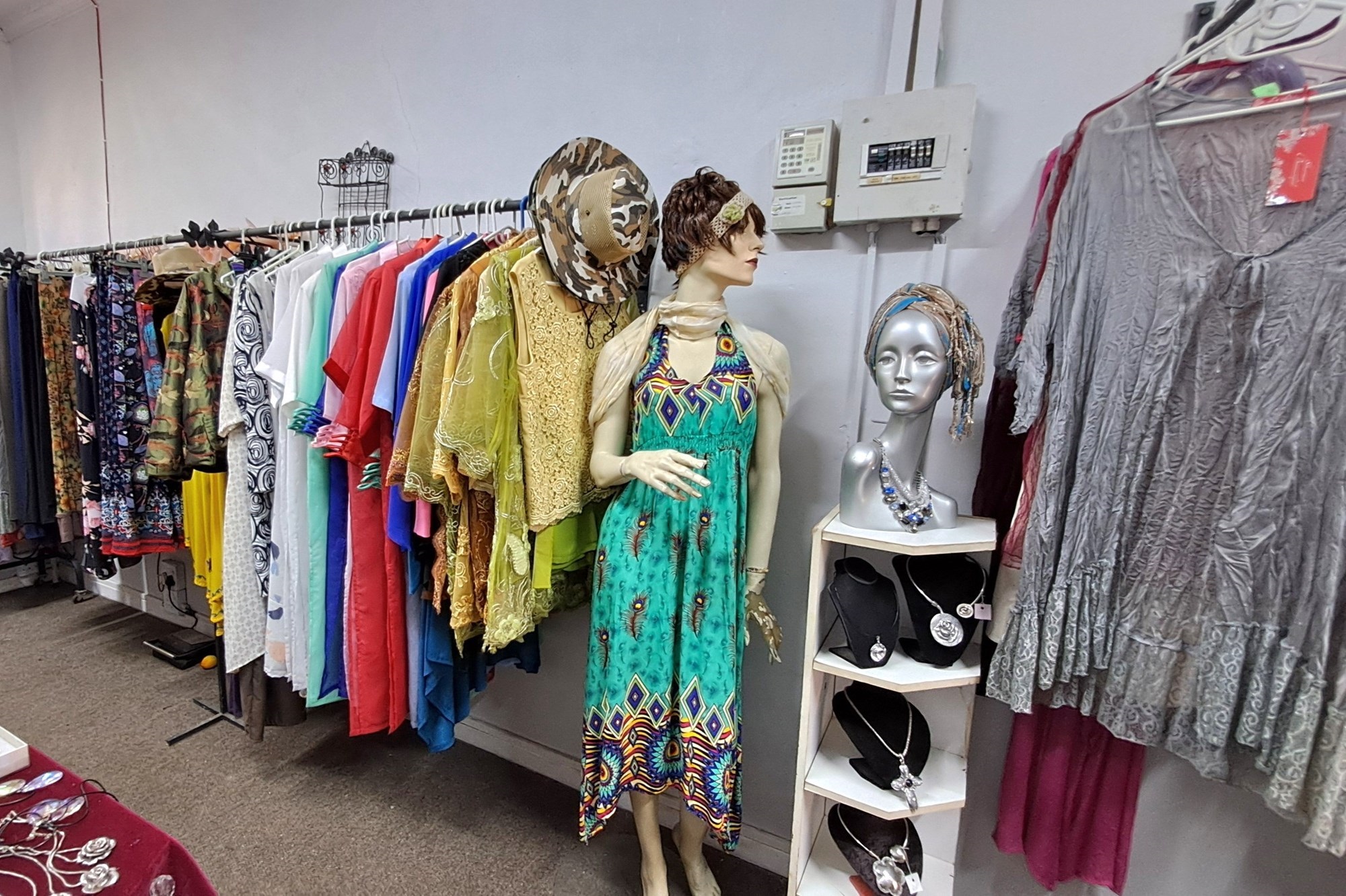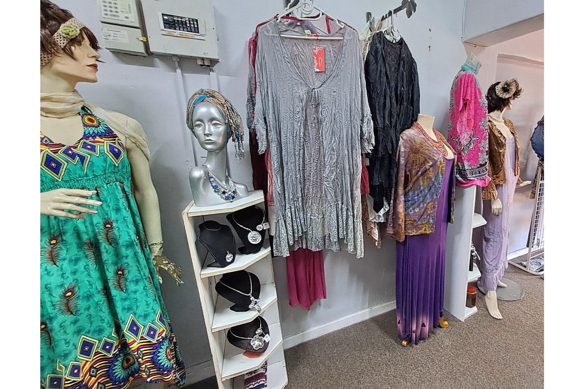 Small boutique shop for sale, offering clothing, jewelry, leather handbags, and other leather items.